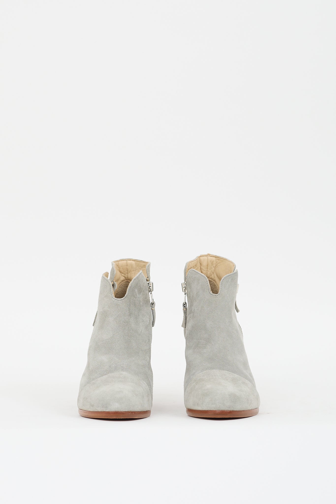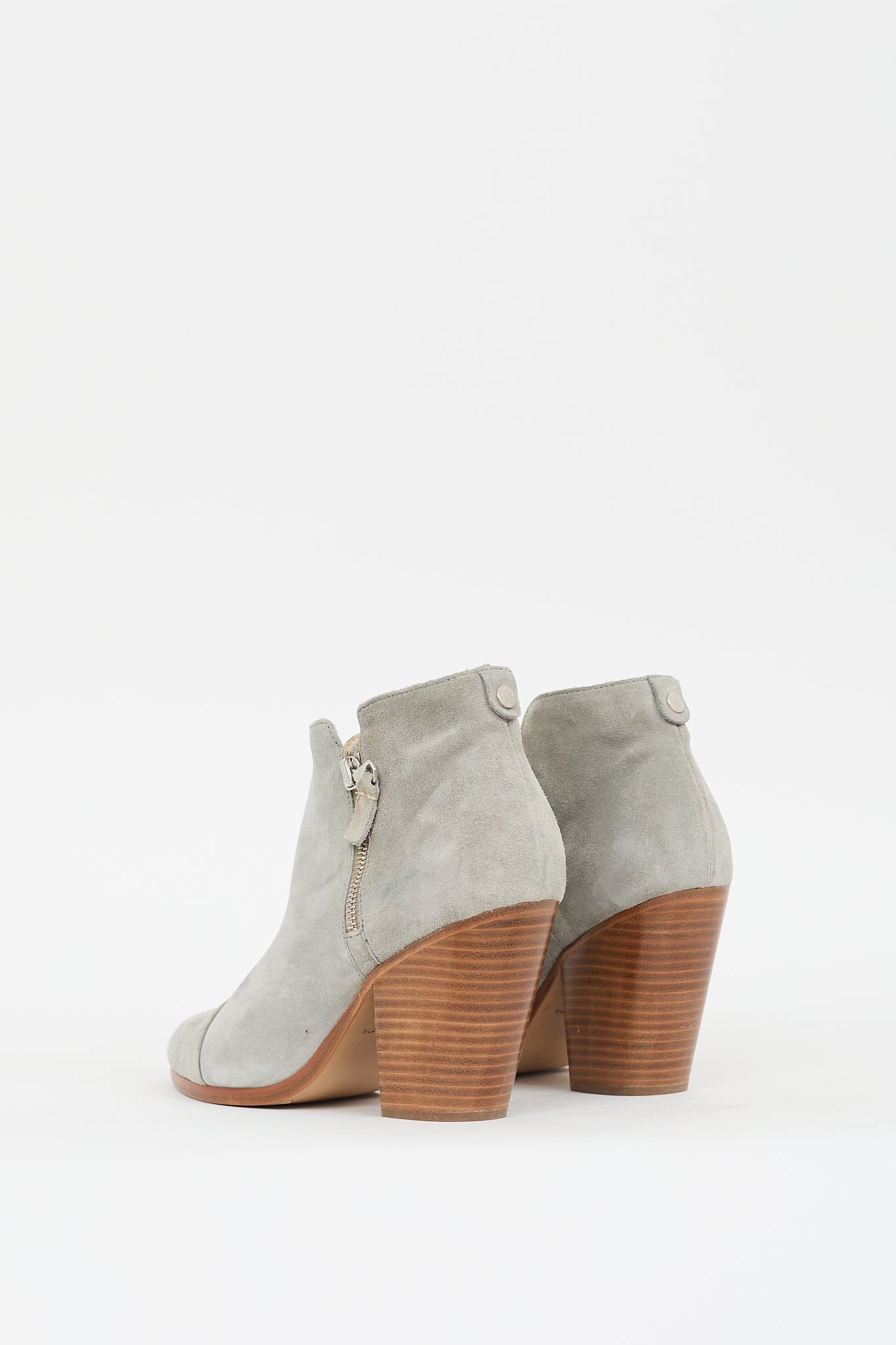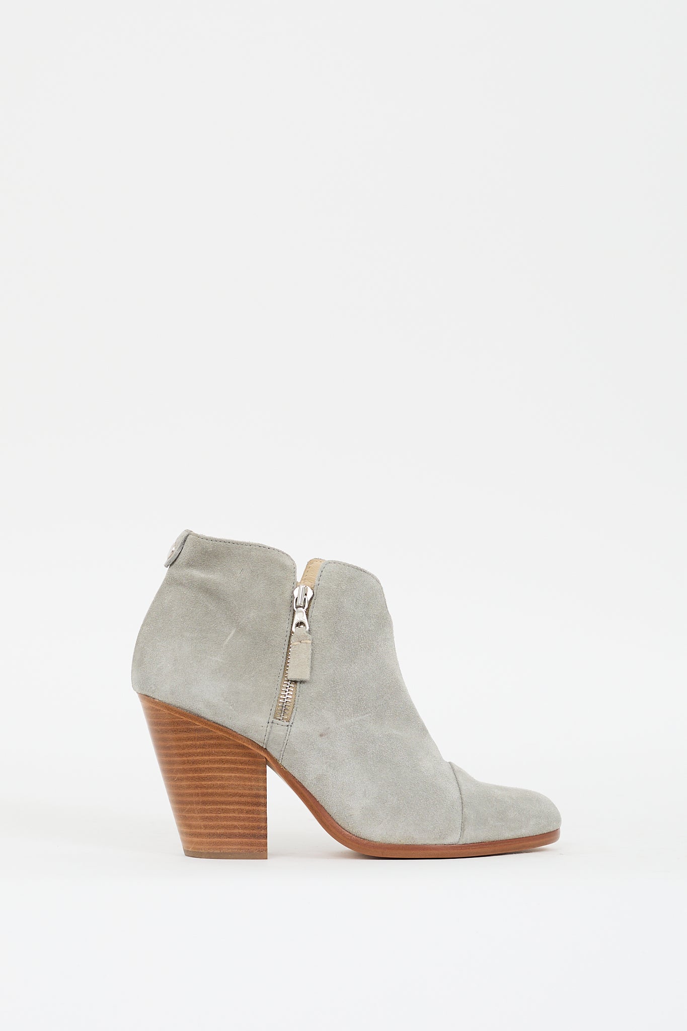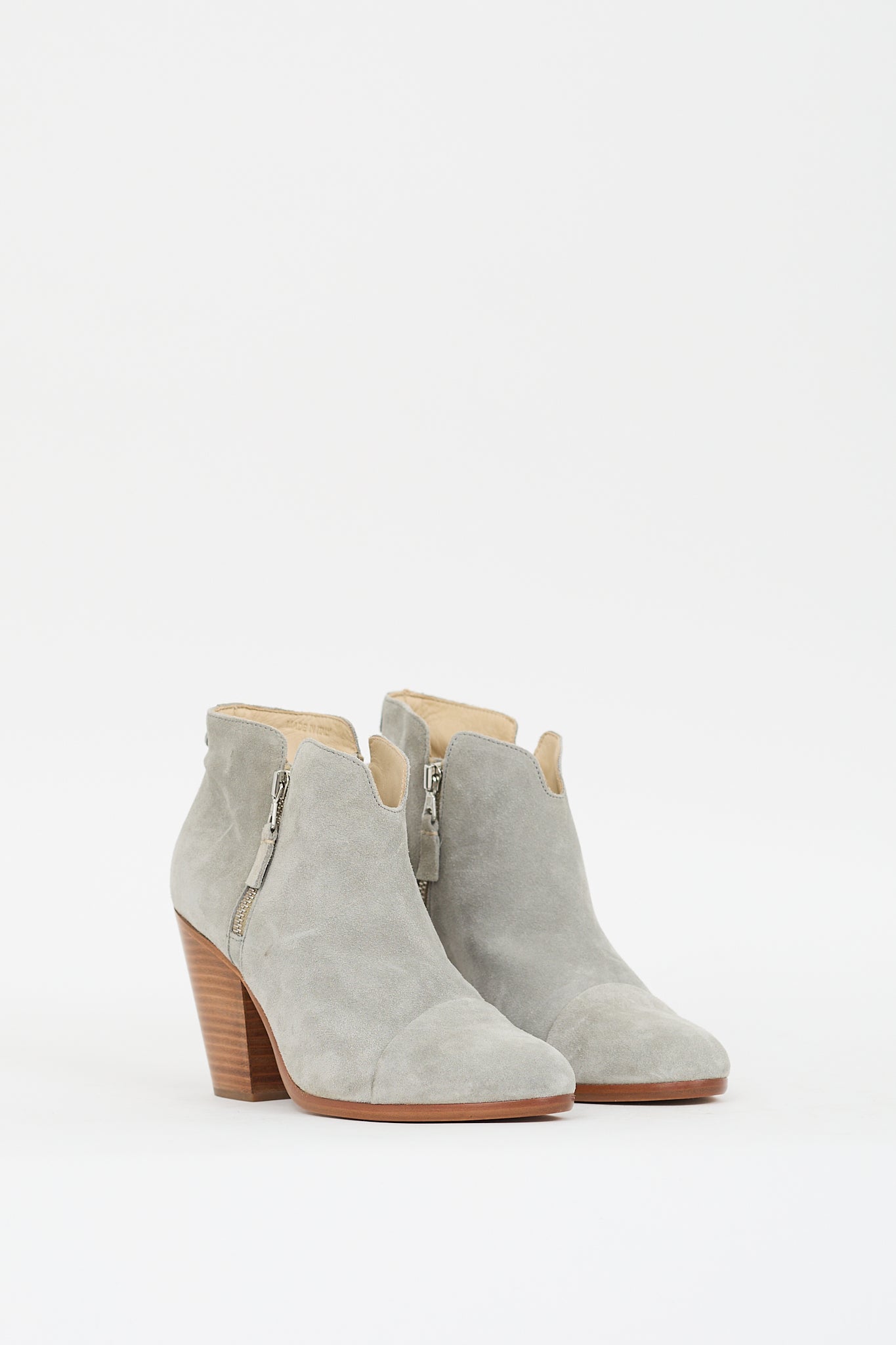 Pre-owned Rag & Bone grey suede ankle boots featuring almond toe cap, dual side zip closures, silver tone metal logo hardware at counter, stacked cuban heel, and pull on entry.