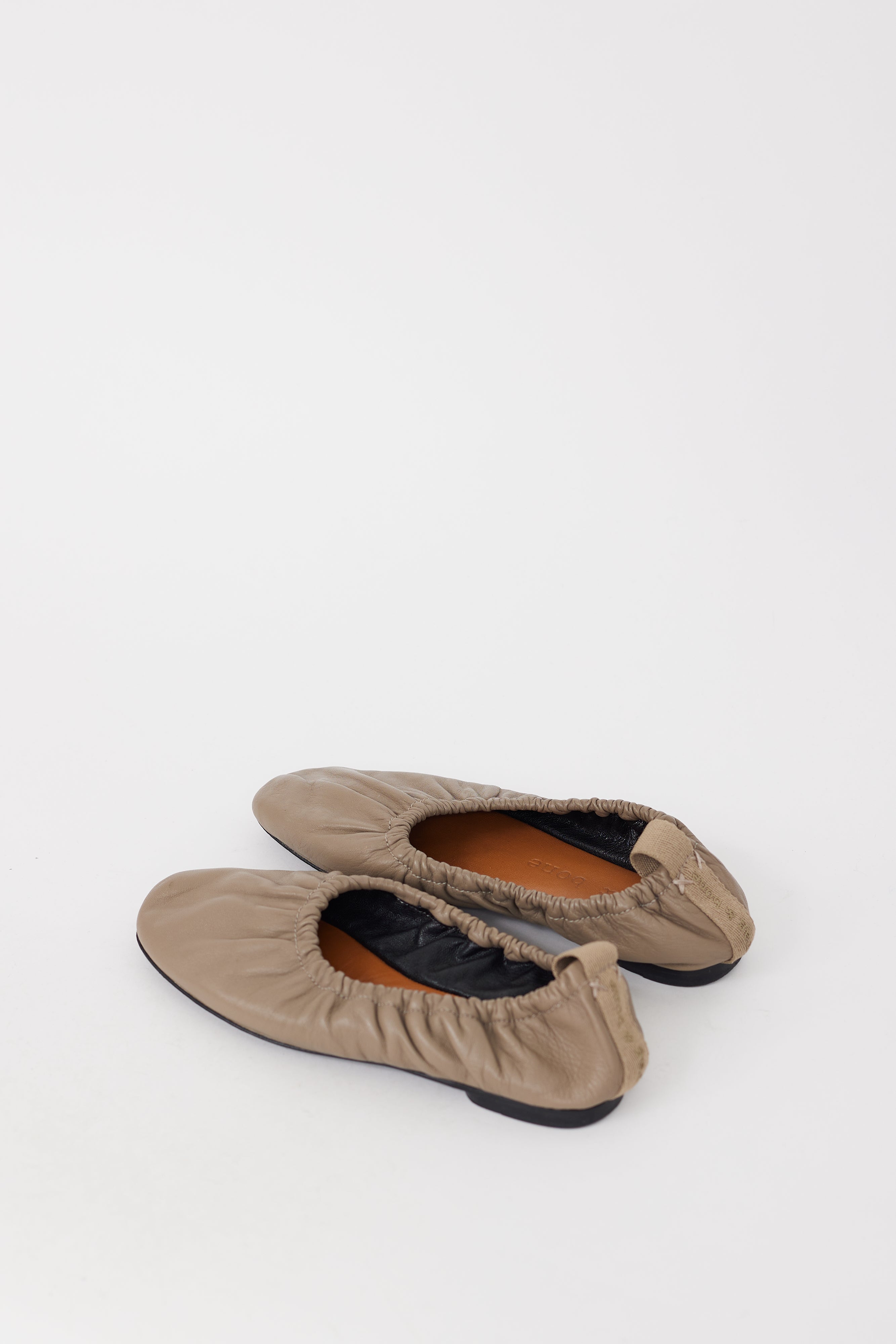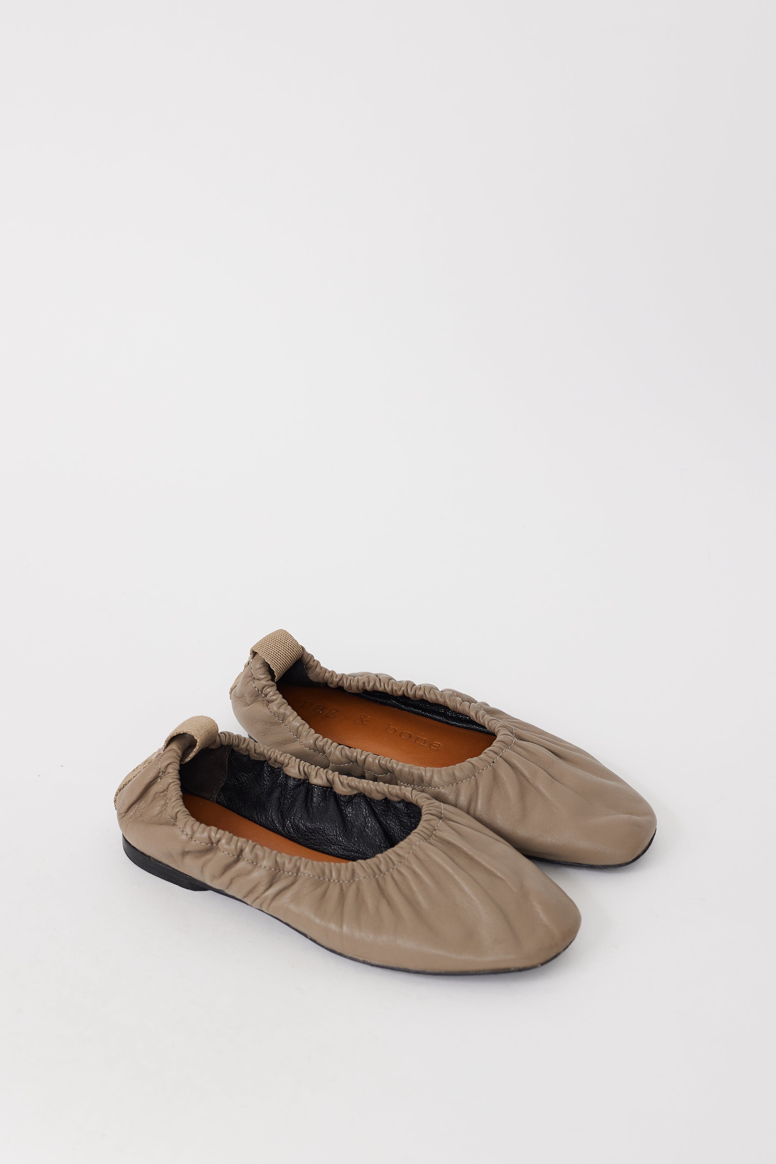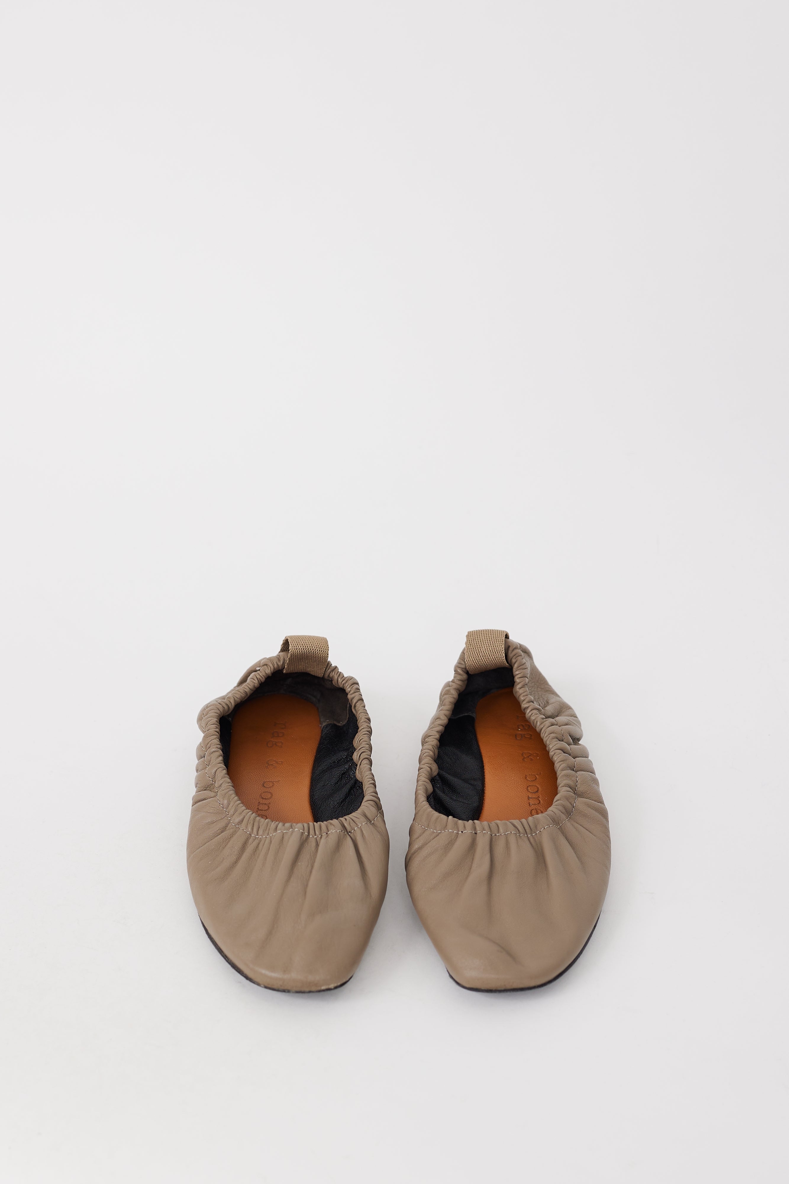 Pre-owned Rag & Bone taupe leather Elly ballet flats featuring a tapered square toe, elasticized collar, and pull tab at counter with rubberized logo.