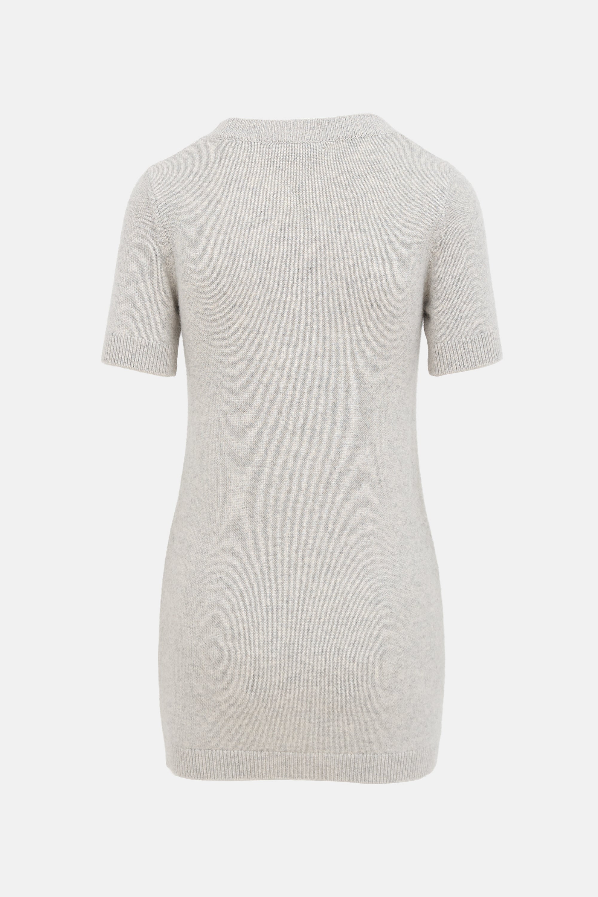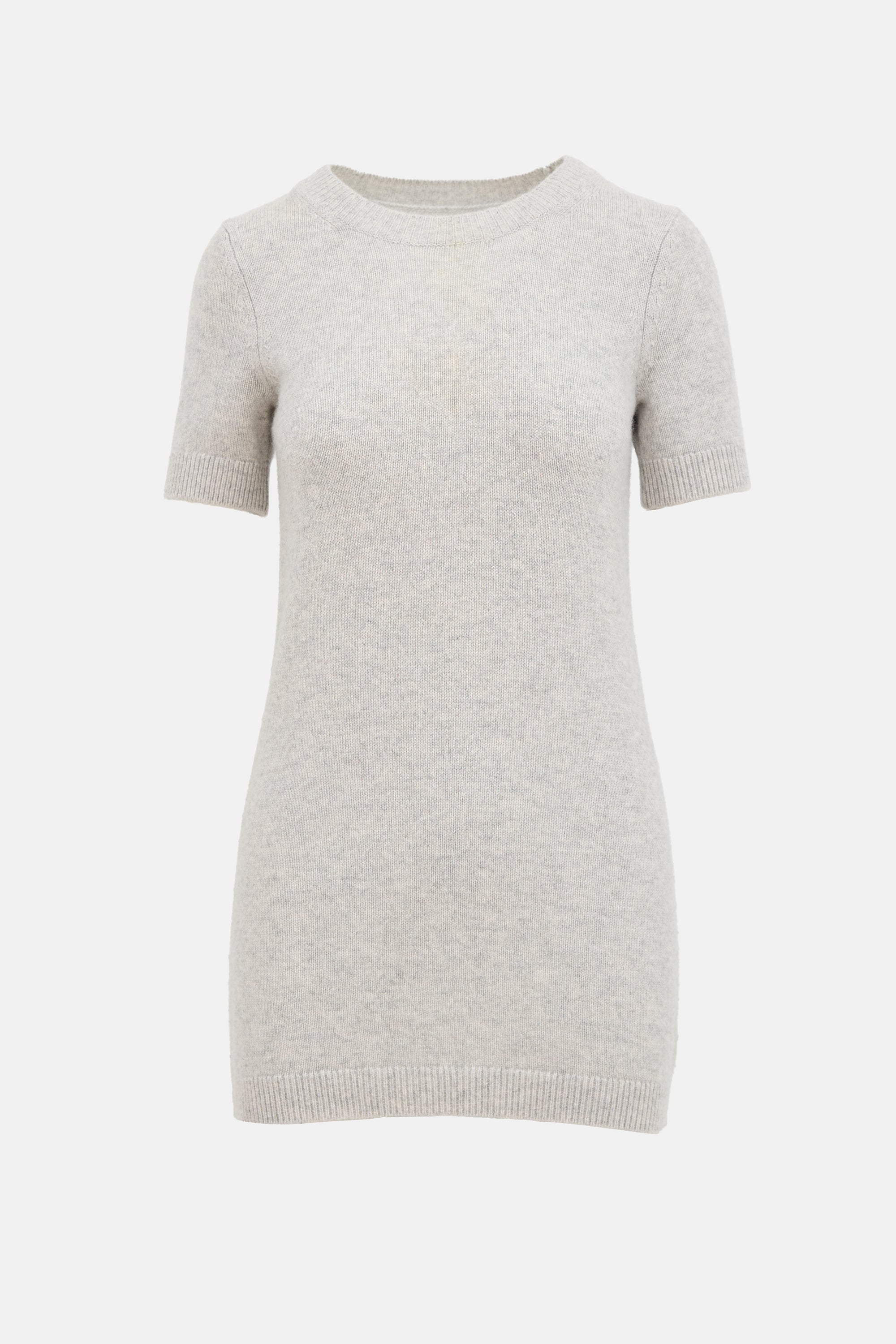 Pre-owned Reformation grey cashmere Bell mini sweater dress featuring a ribbed crew neckline, short sleeves with ribbed cuffs, straight fit, and a ribbed hemline.