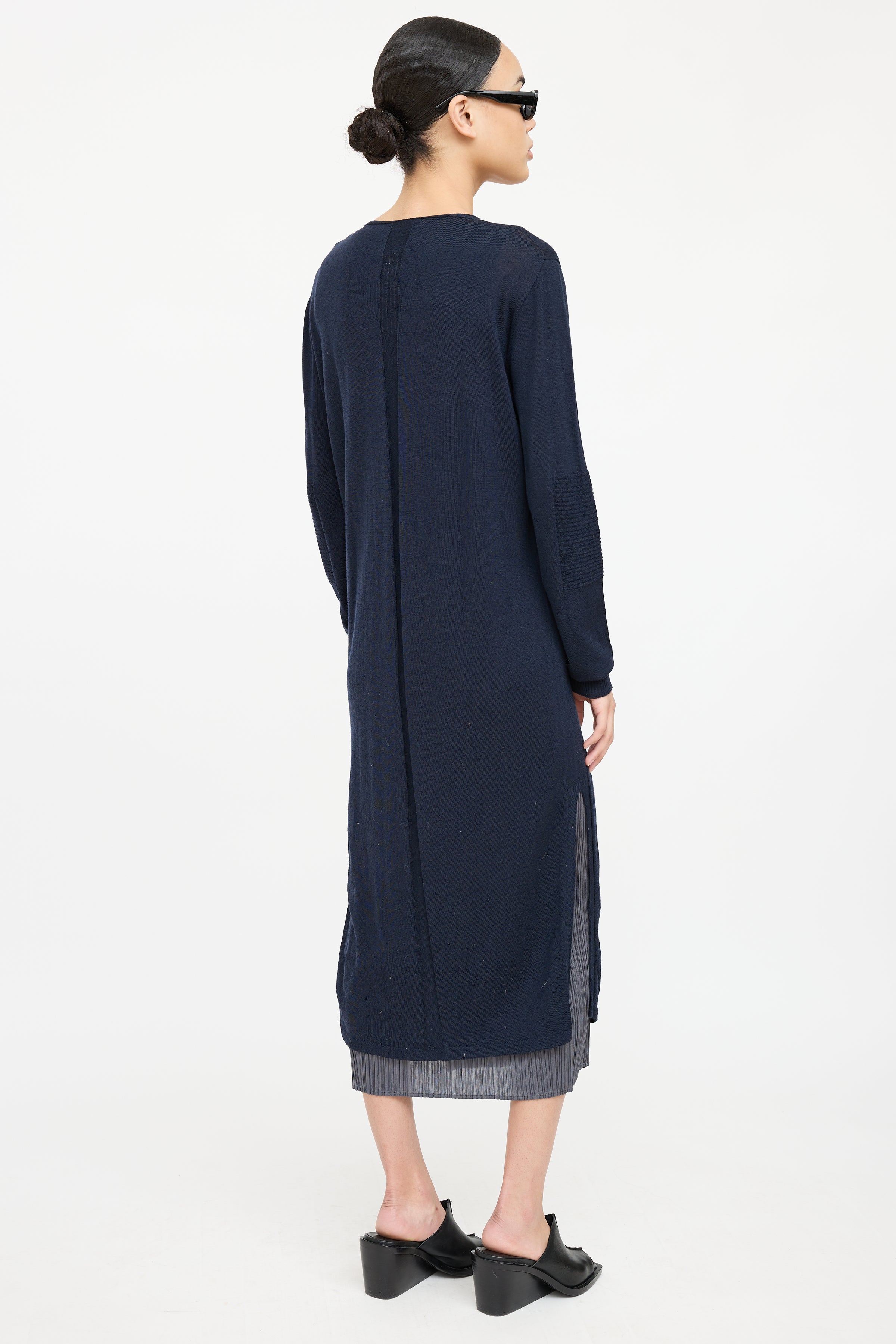 Pre-owned Rick Owens navy Fall/Winter 2020 long sleeve cardigan featuring ribbed detail on sleeves, snap button closure and dual slits on sides.