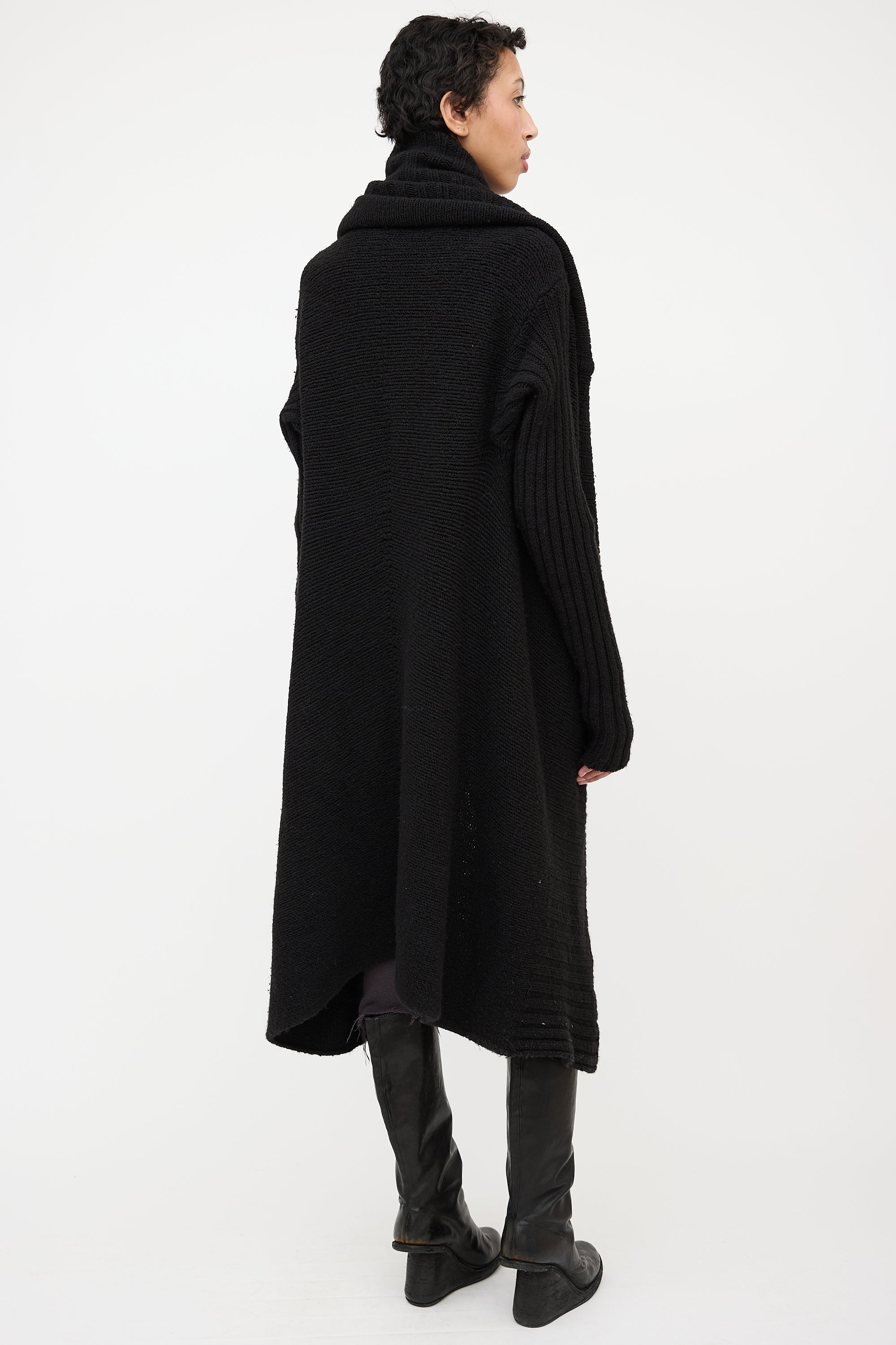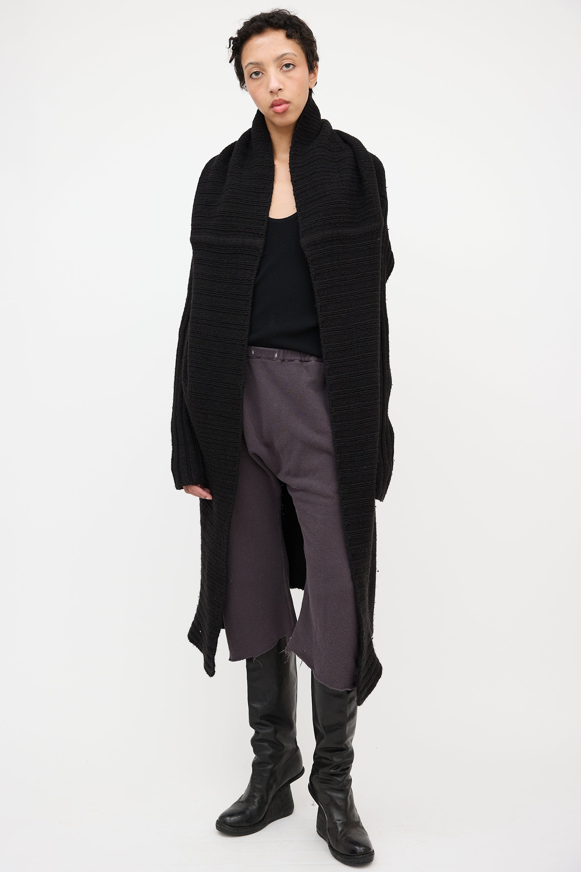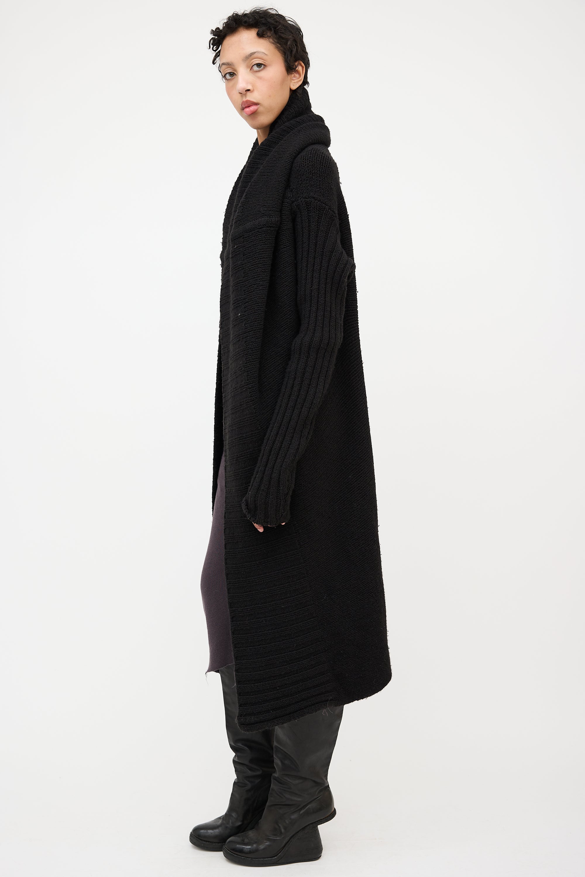 Pre-owned Rick Owens Fall/Winter 2006 "Dustulator" black merino wool blend cardigan featuring a hood, open front, and ribbed hood, placket, and sleeves.