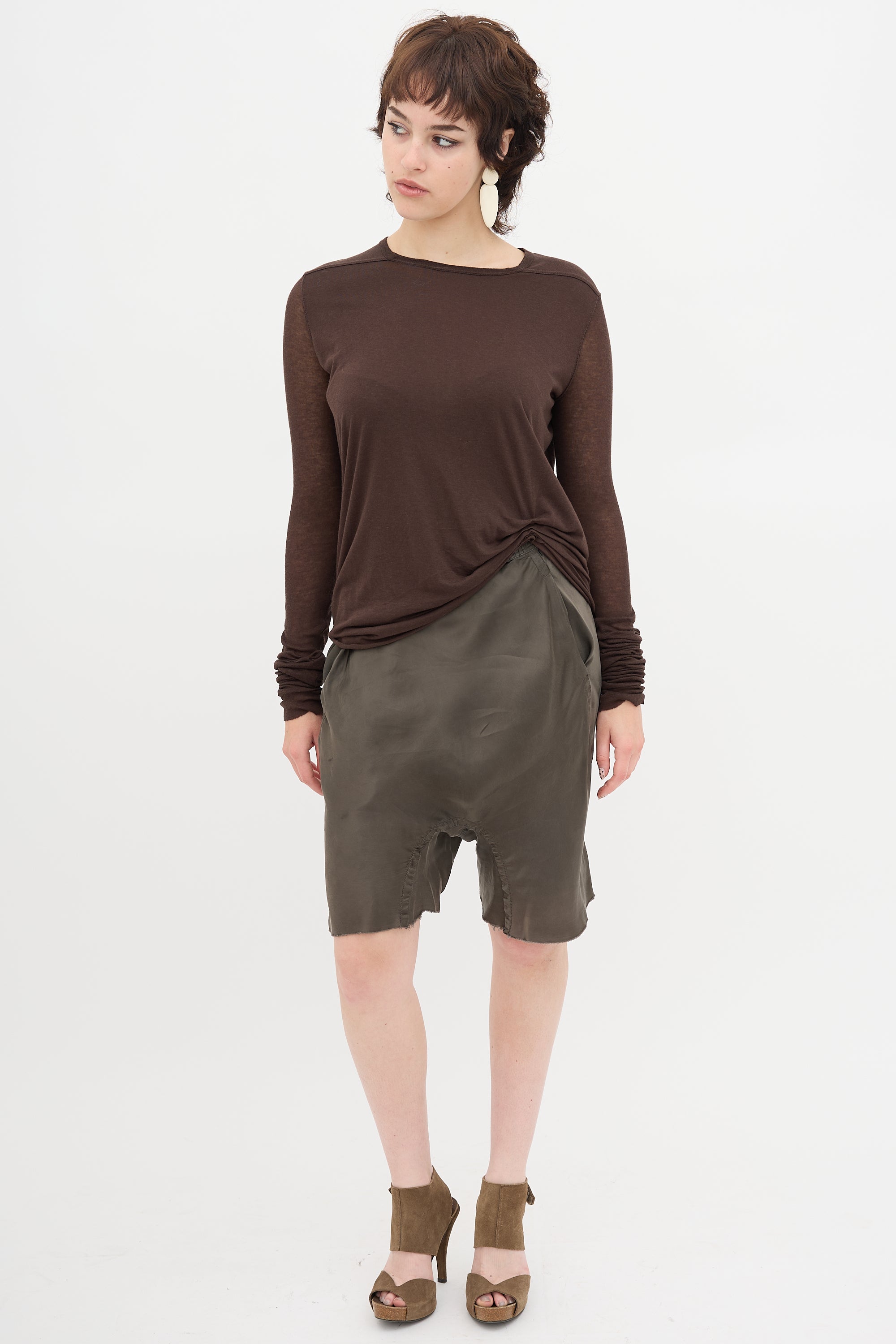 Pre-owned Rick Owens Lilies brown knit top featuring crew neckline, ruched front, and raw hem.