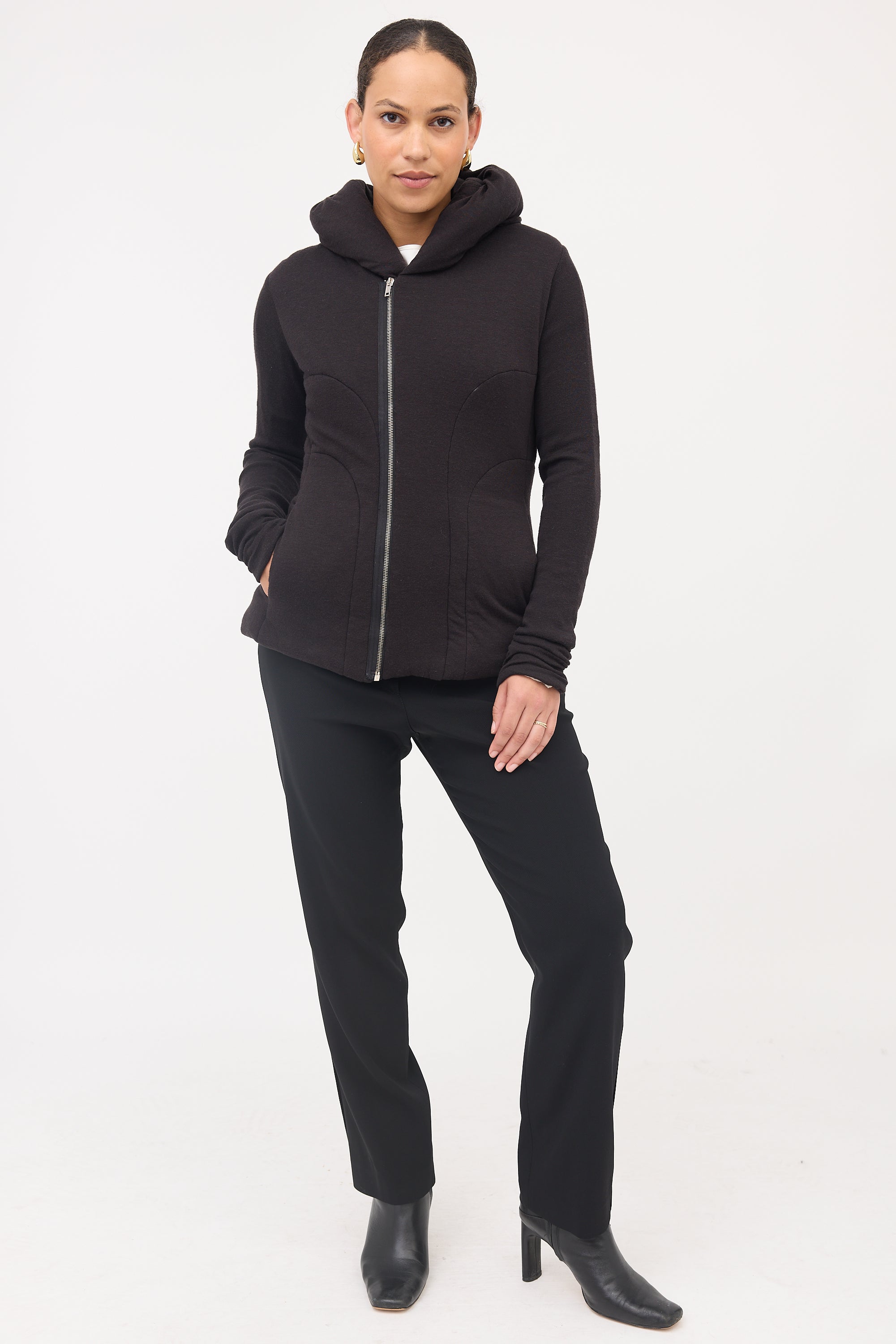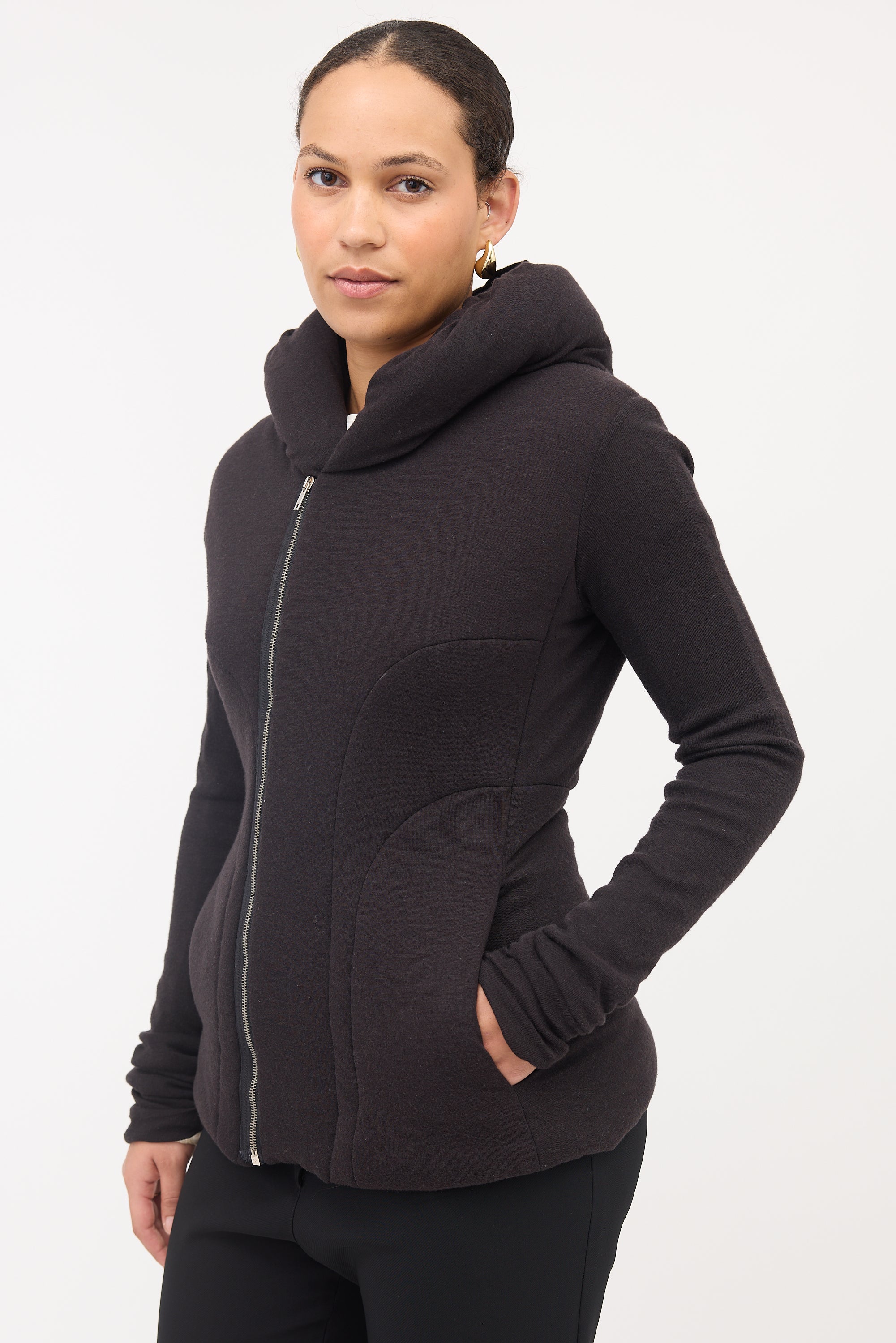 Pre-owned Rick Owens Lilies black padded sweater featuring an attached hood, zip front, and two slip pockets at hip.