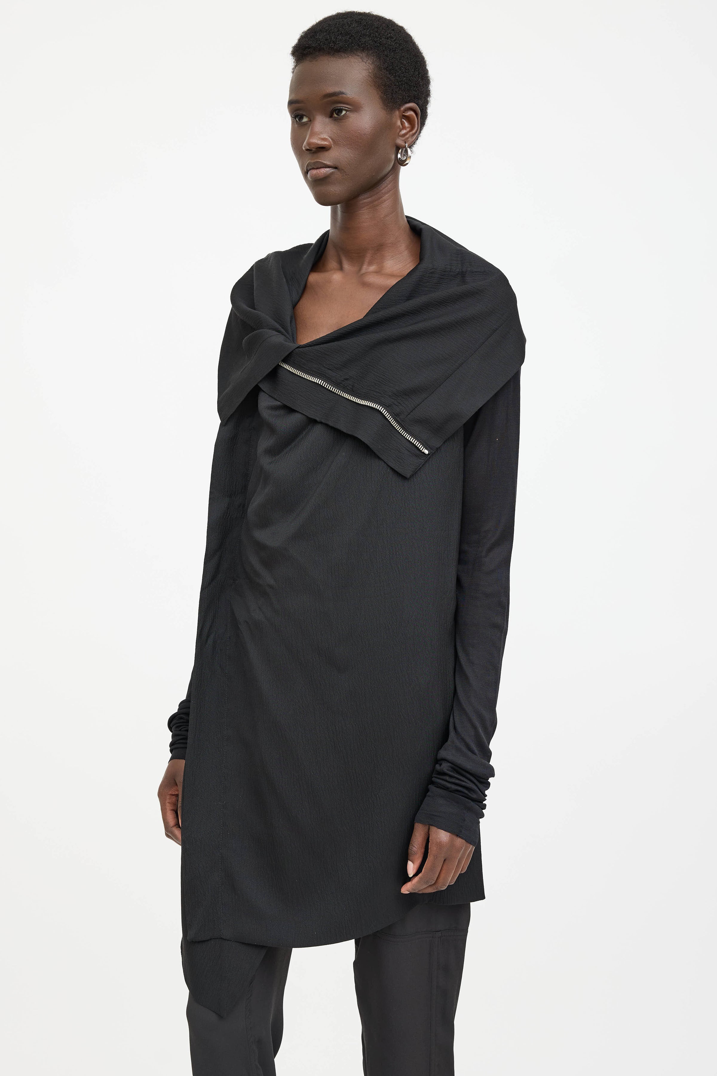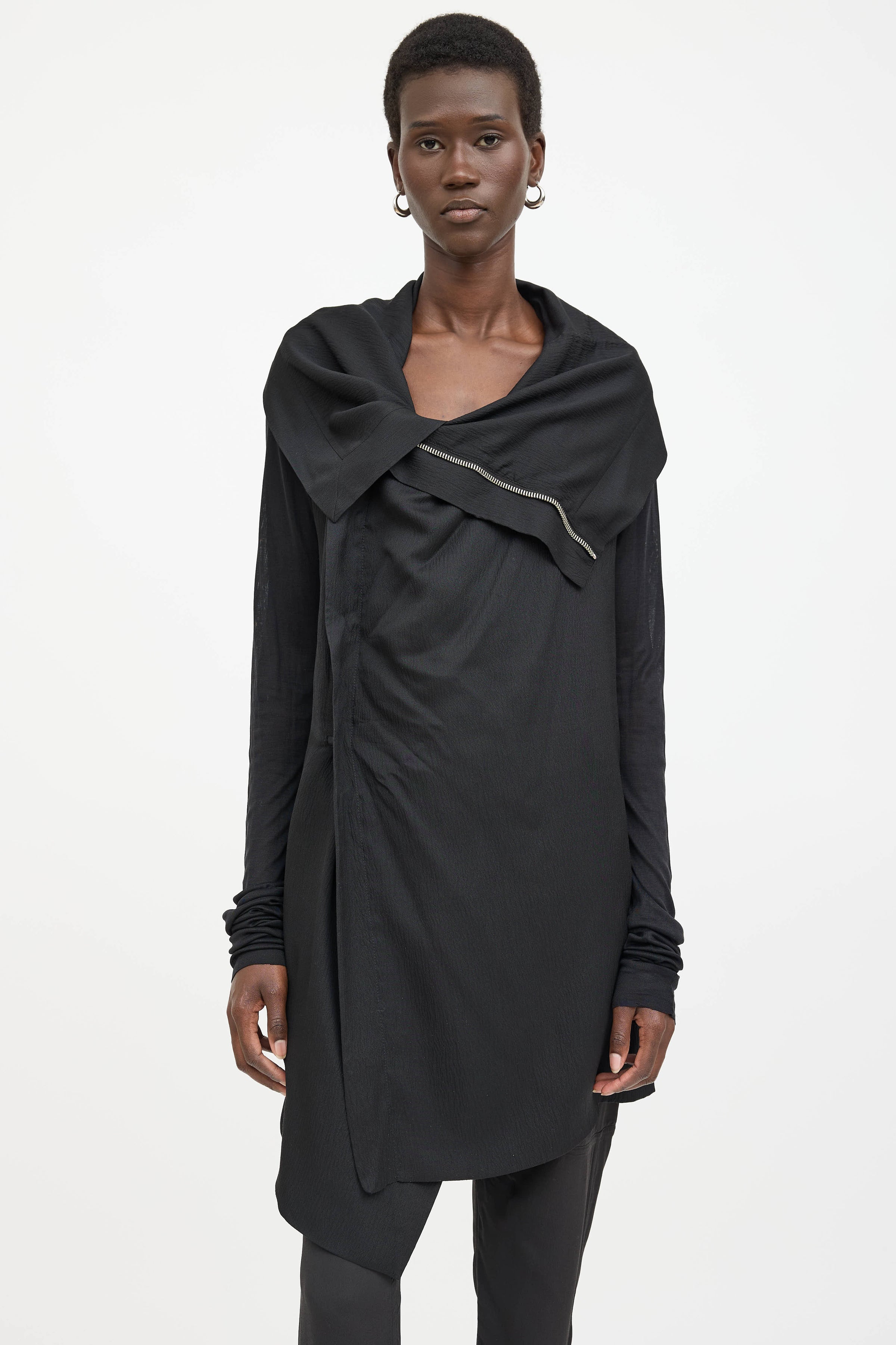 Pre-owned Rick Owens black silk jacket featuring a funnel neck jacket, long sheer sleeves, and asymmetrical zip closure.