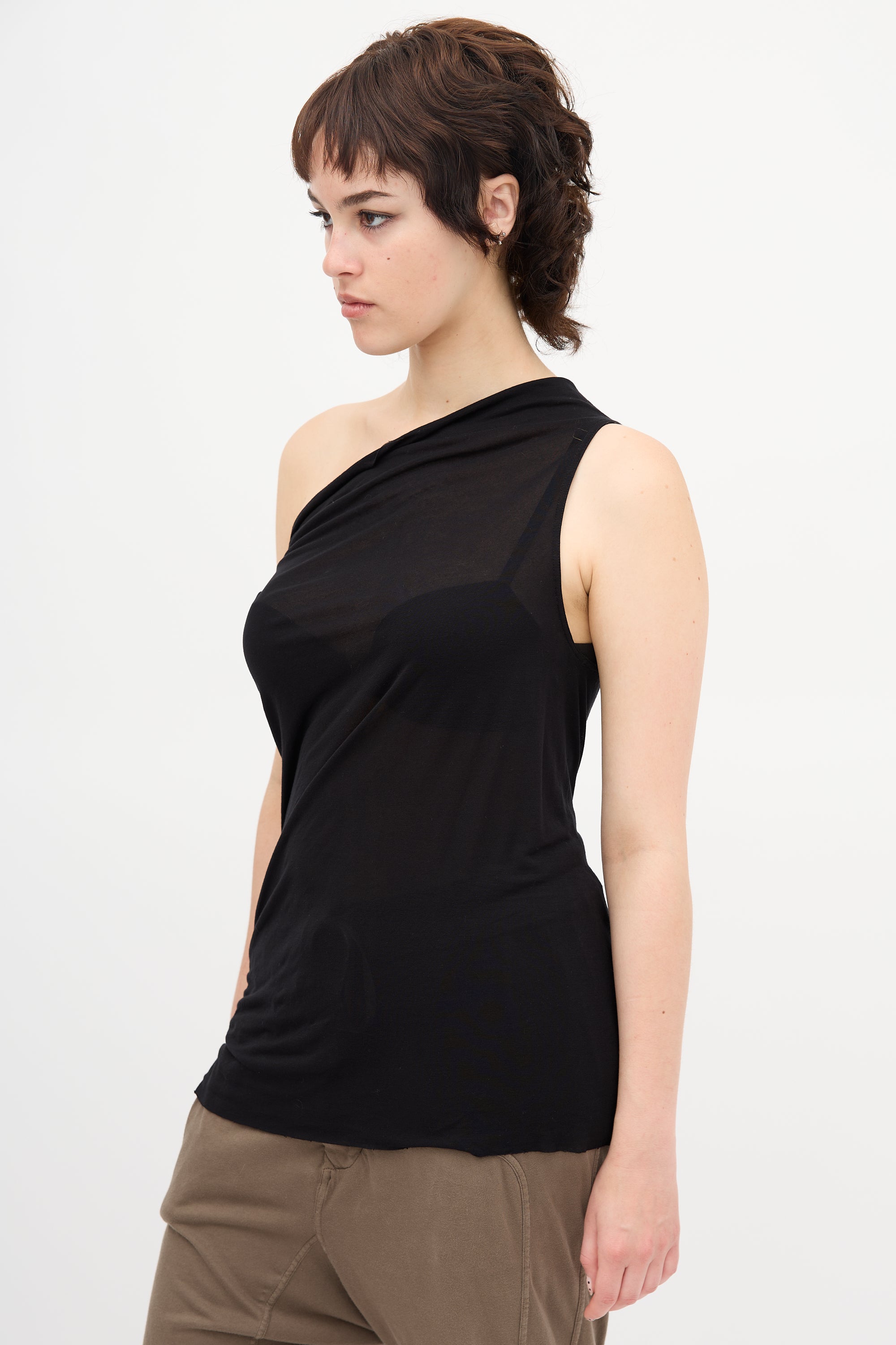 Pre-owned Rick Owens Spring 2023 black knit one shoulder top featuring draped bodice and raw edges.