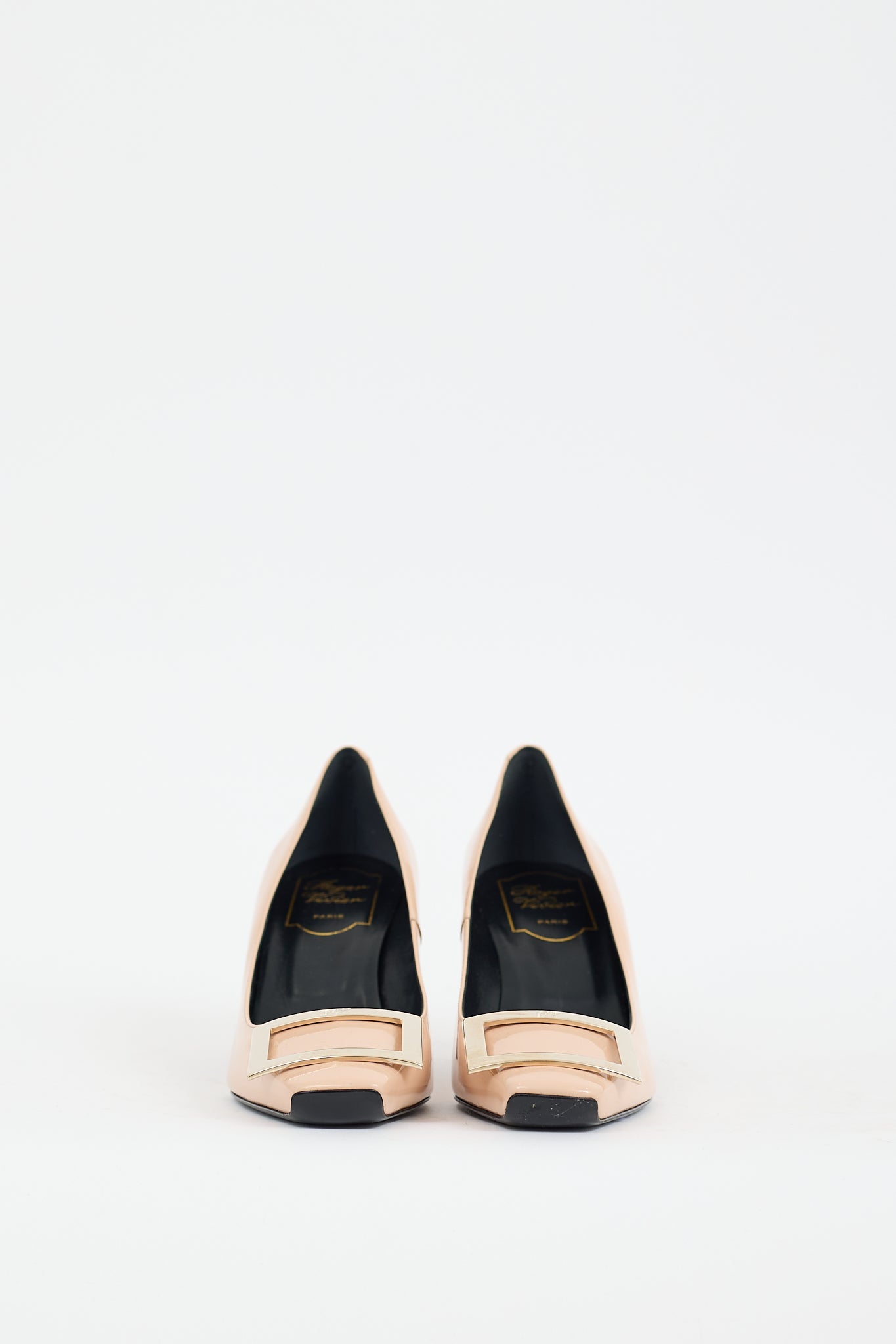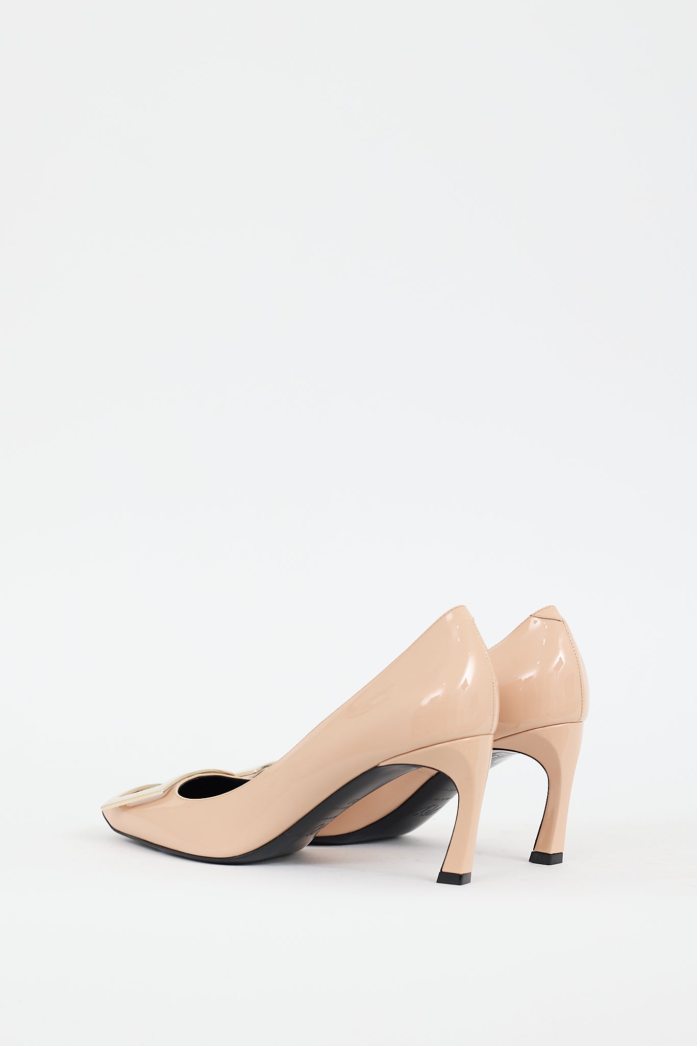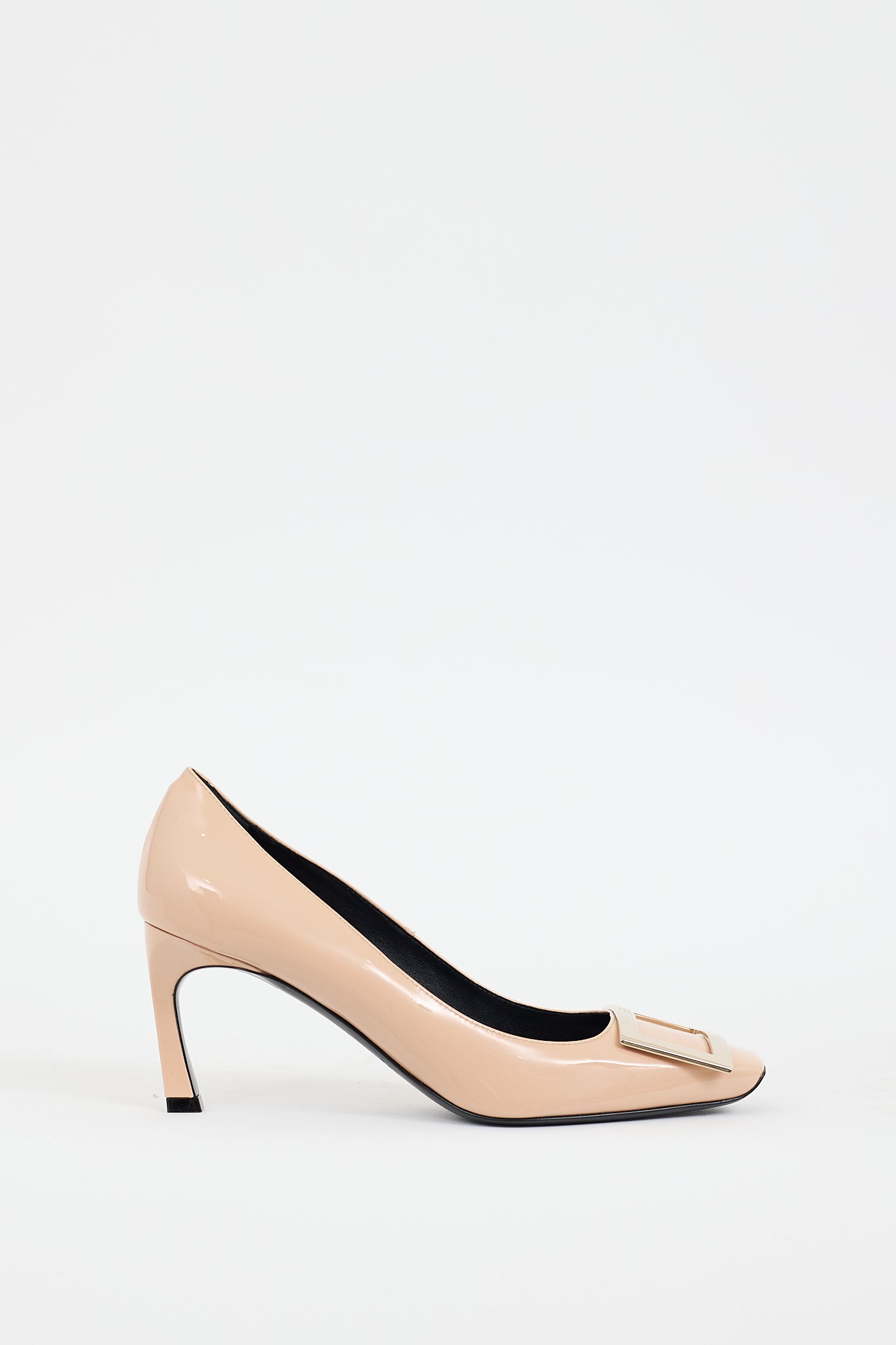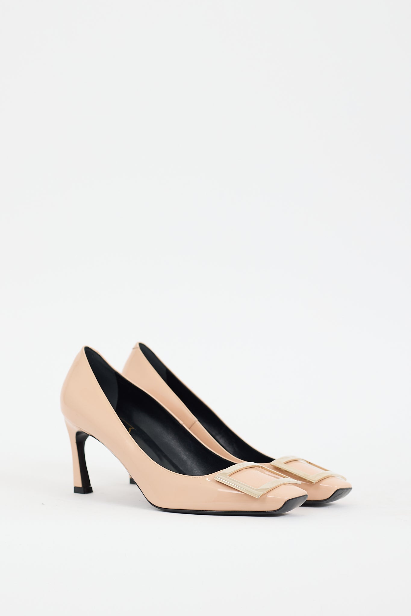 Pre-owned Roger Vivier beige Belle Vivier Trompette patent leather pumps featuring a square toe, gold tone buckle hardware at vamp, horn heel, and slip on entry.