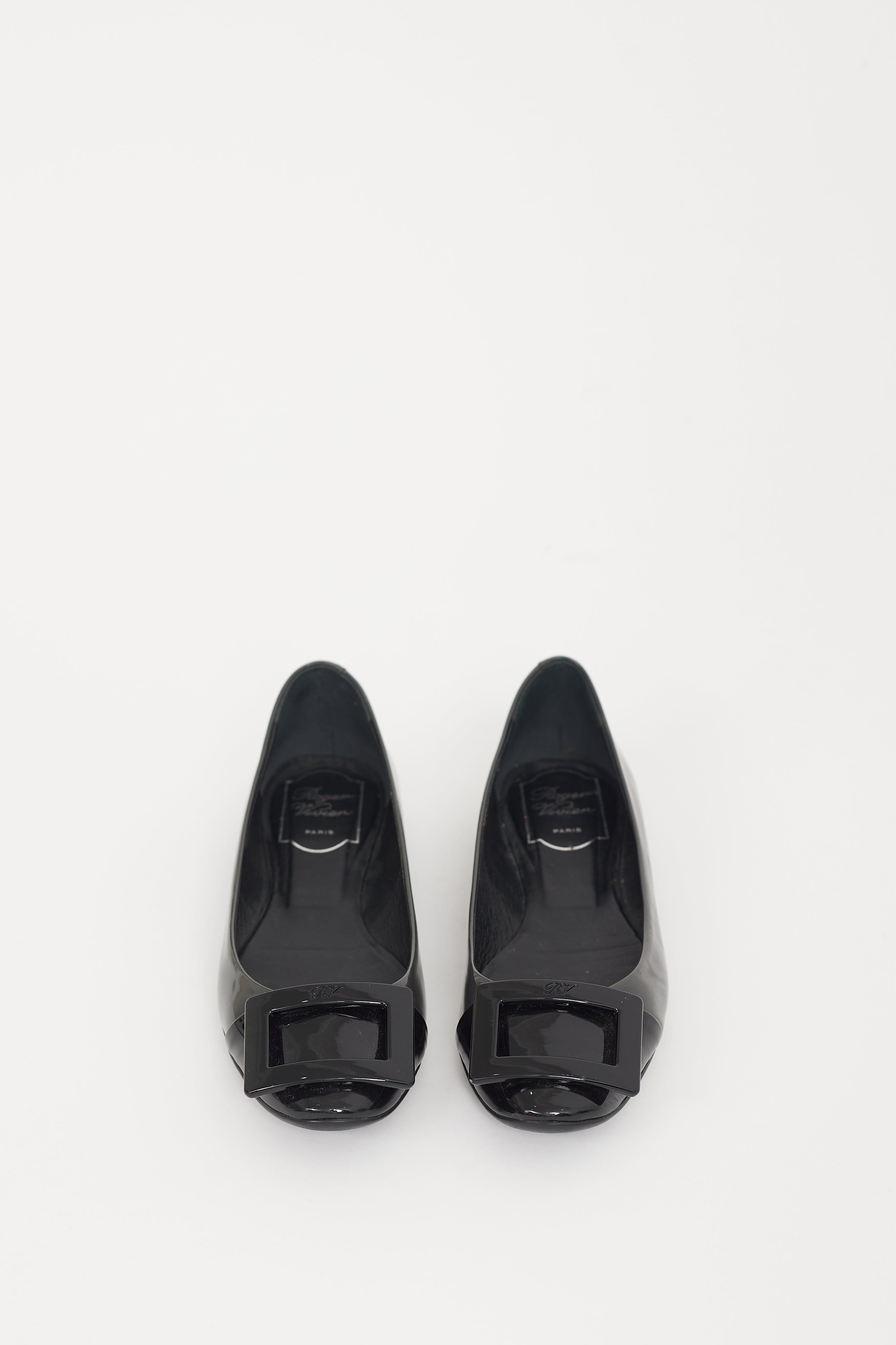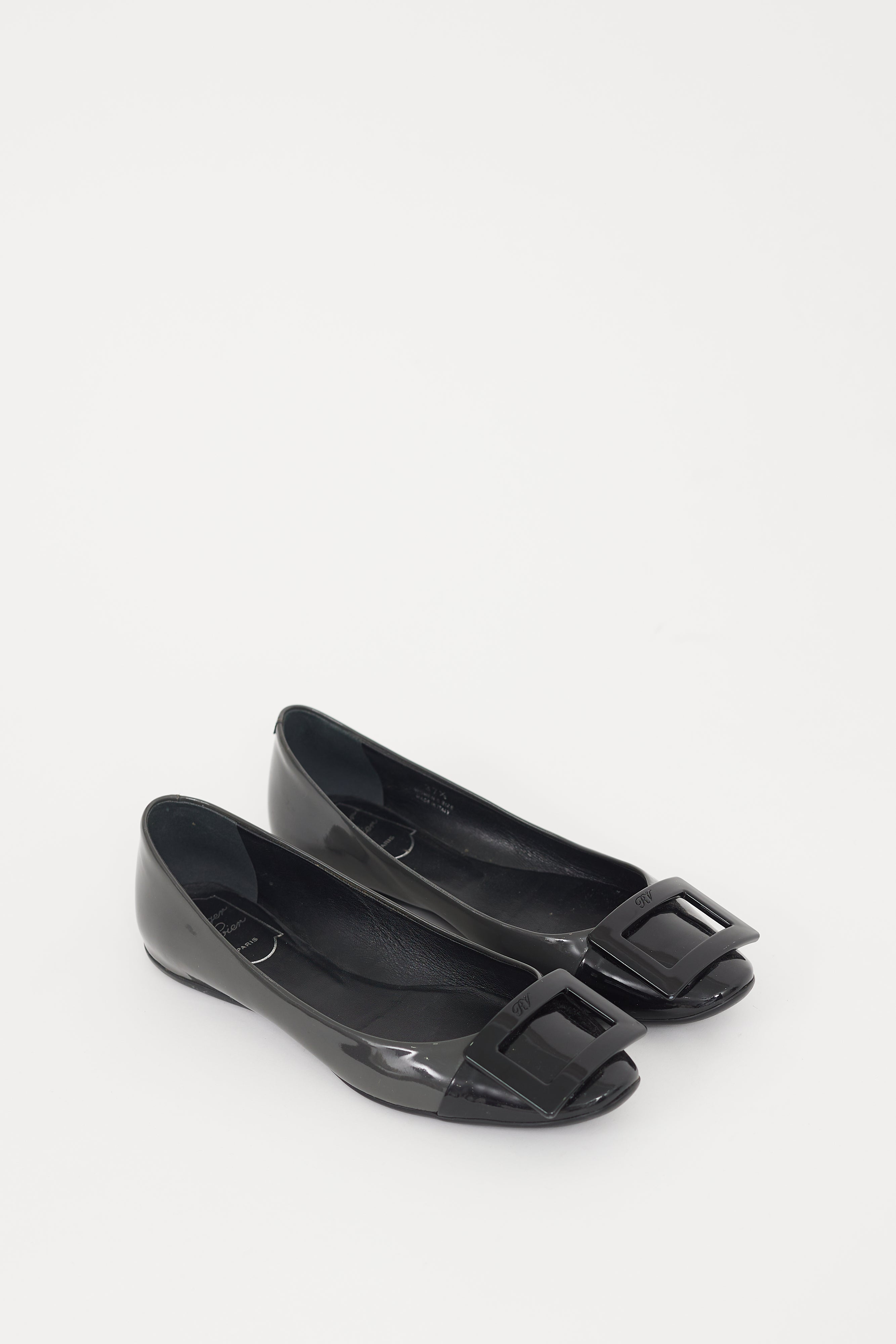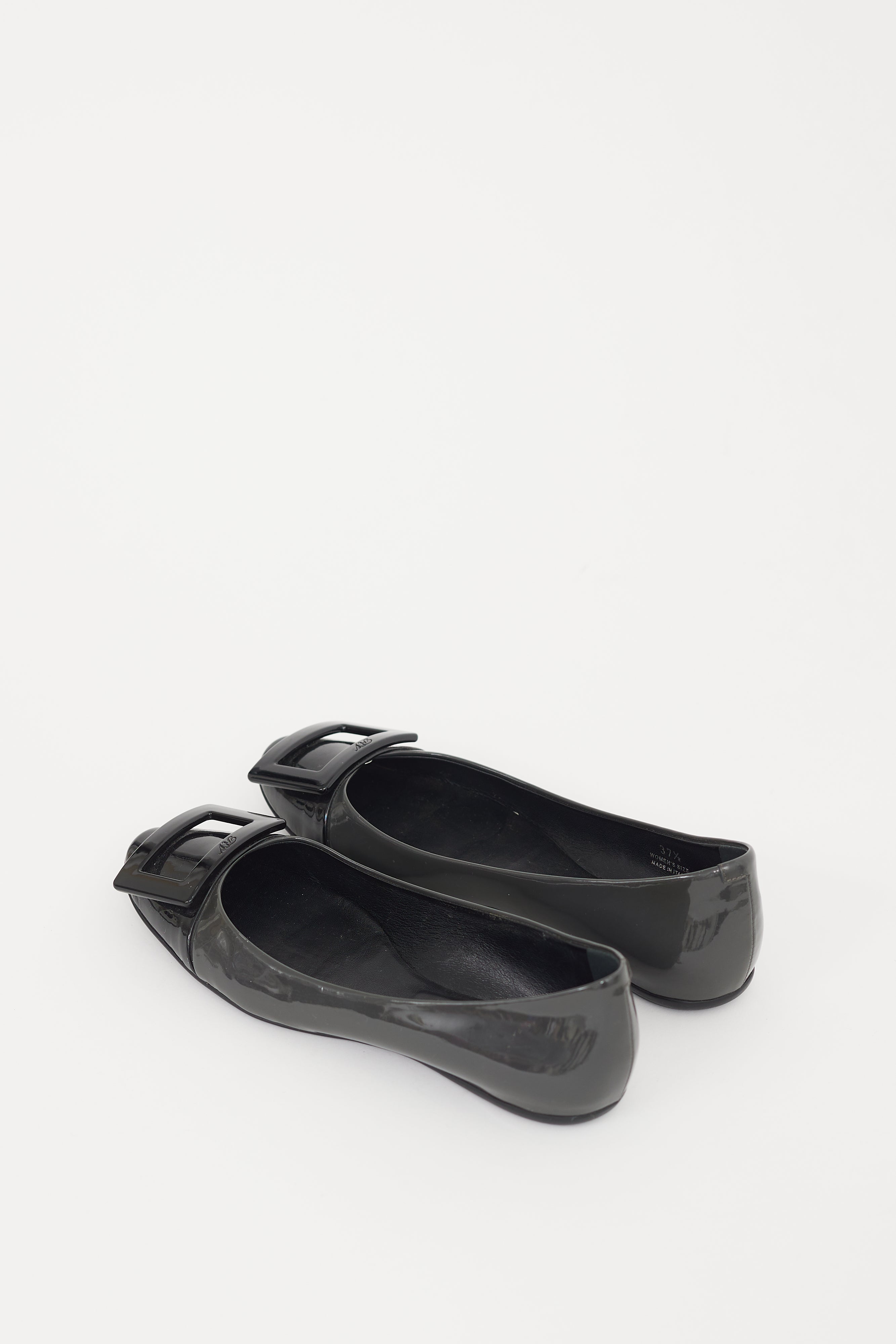 Pre-owned Roger Vivier grey Gommettine patent leather flats featuring a black round cap toe, tonal buckle at vamp, and slip on entry. Comes with original dust bag.