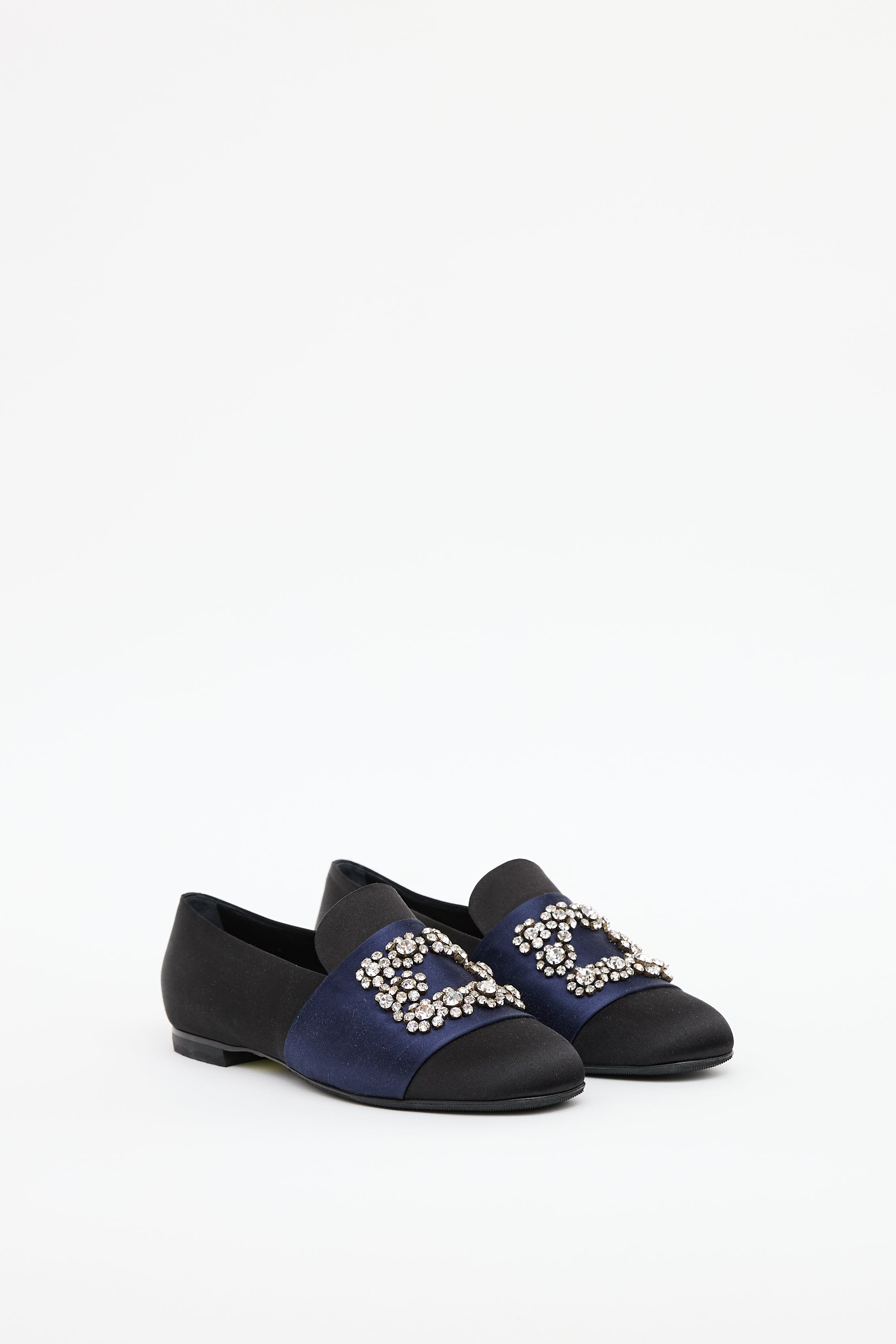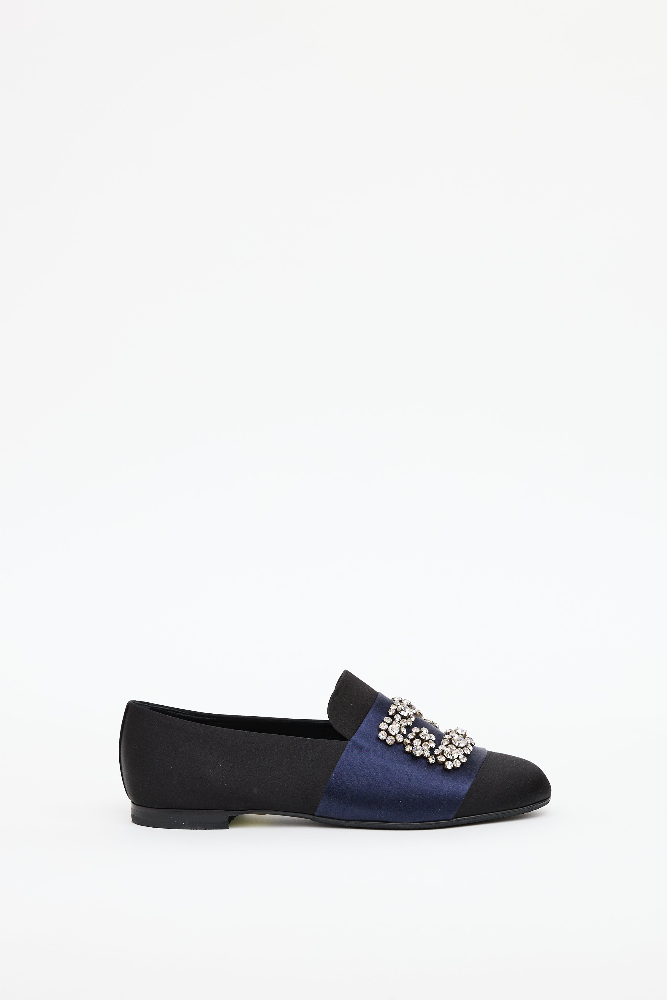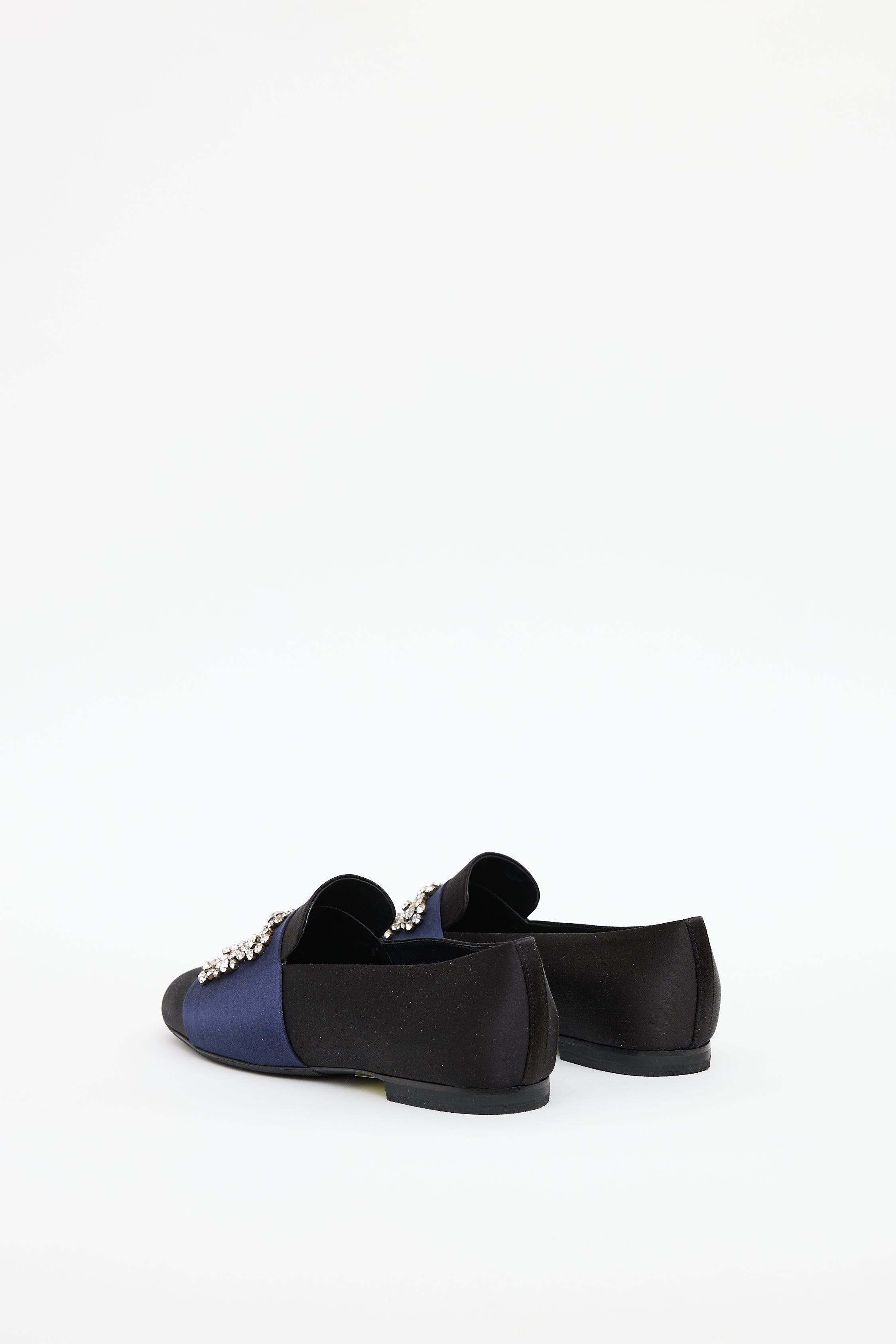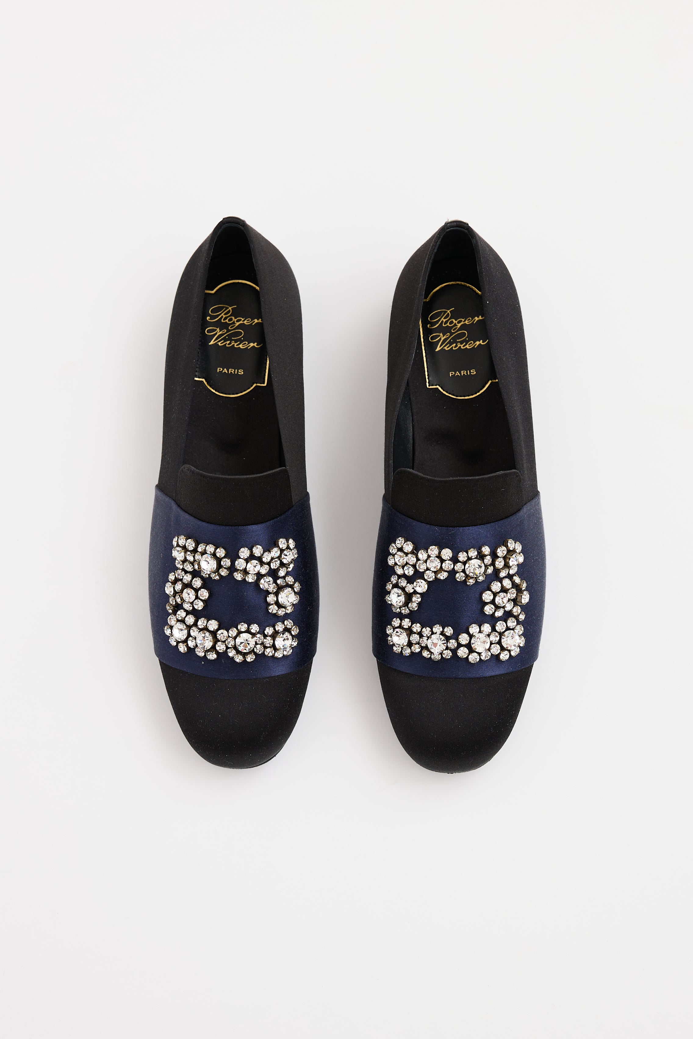 Pre-owned Roger Vivier black and navy satin loafers featuring round toe, silver tone crystal detail on upper, loafer styling with tongue and covered block heel.