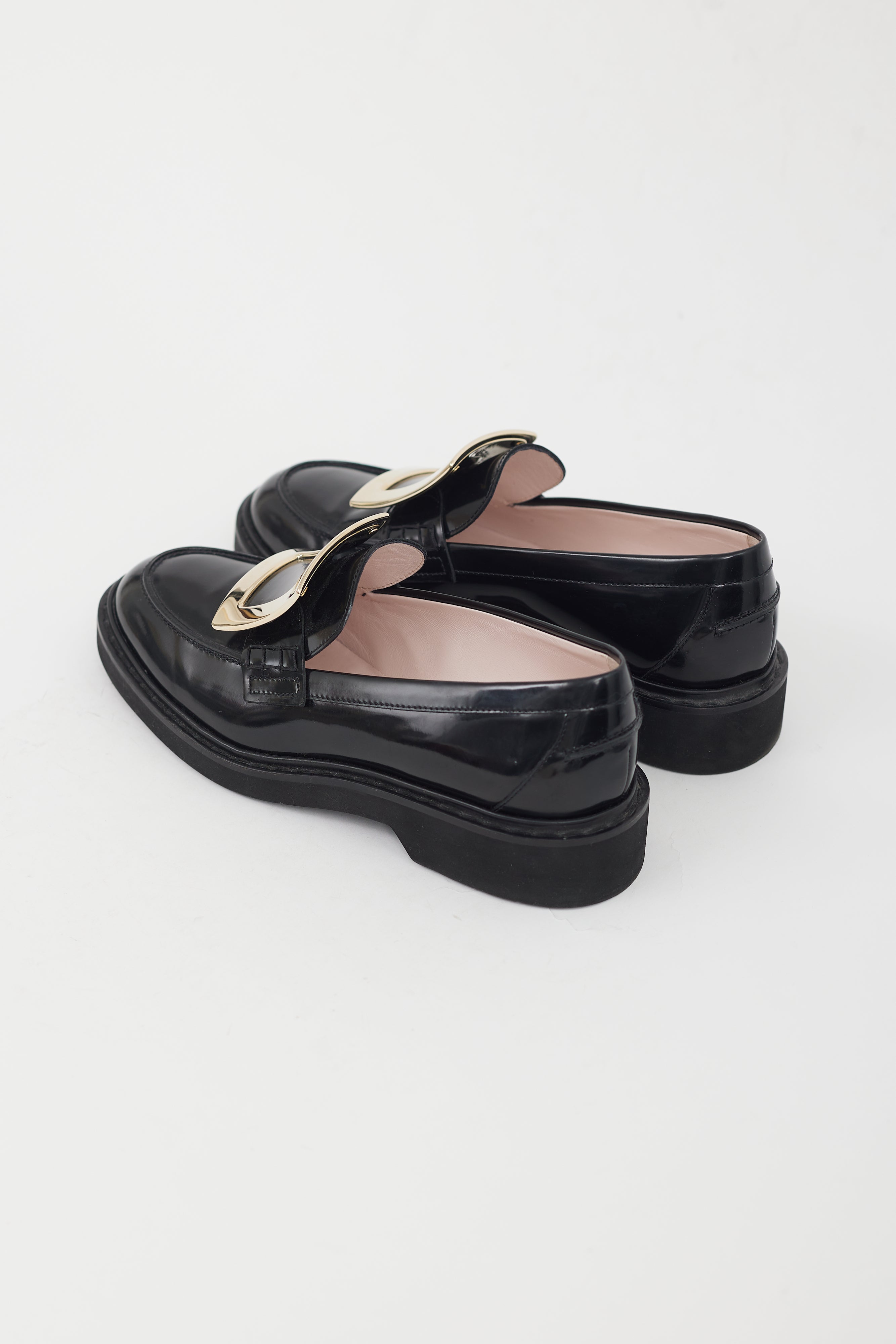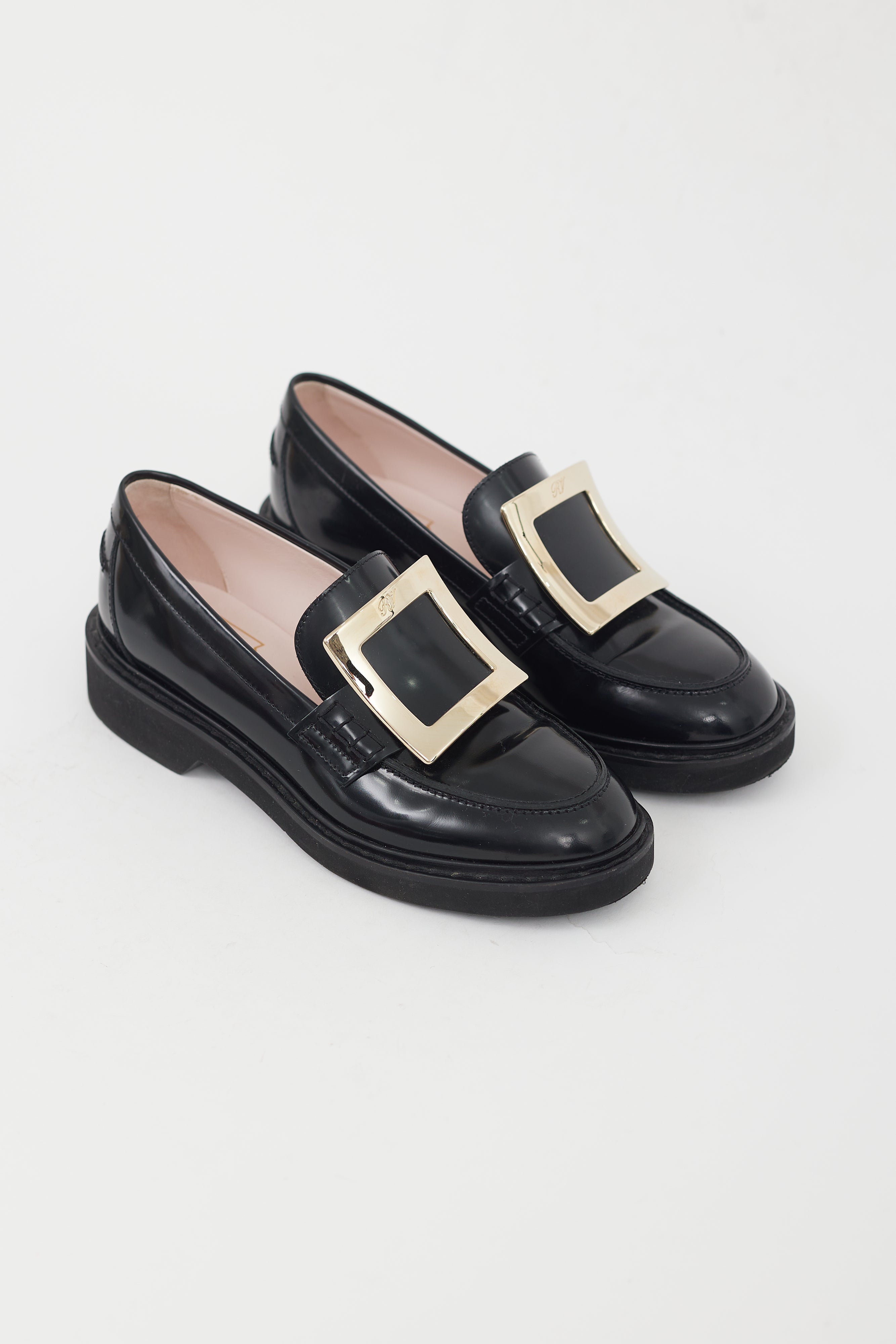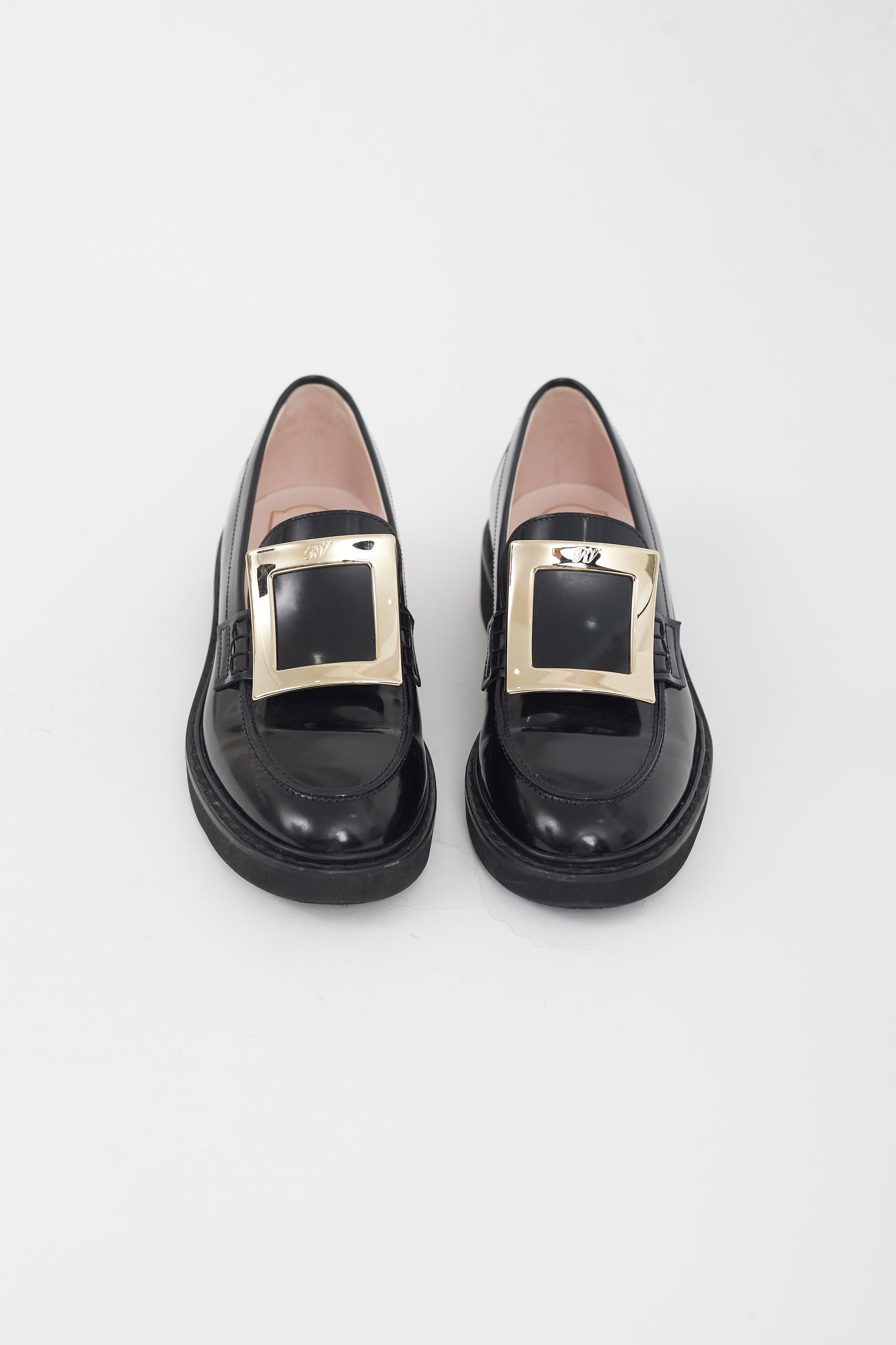Pre-owned Roger Vivier black patent leather loafers featuring large gold tone square buckle at vamp, platformed midsole, and leather insoles.
