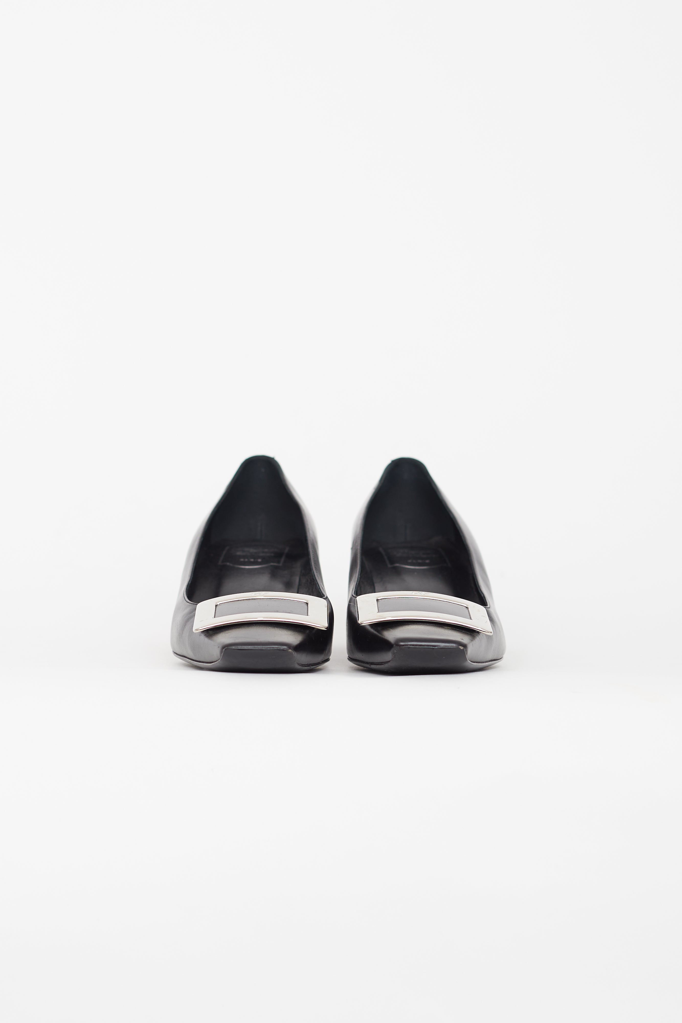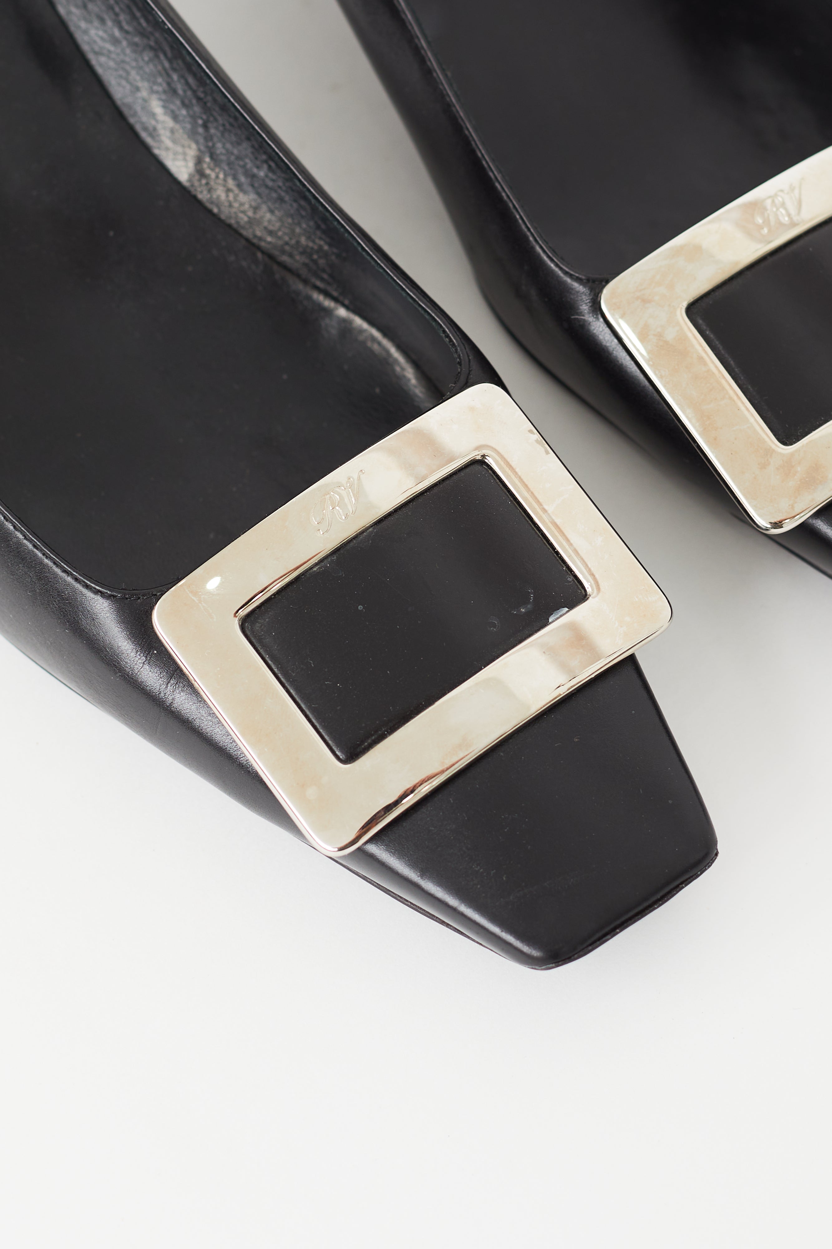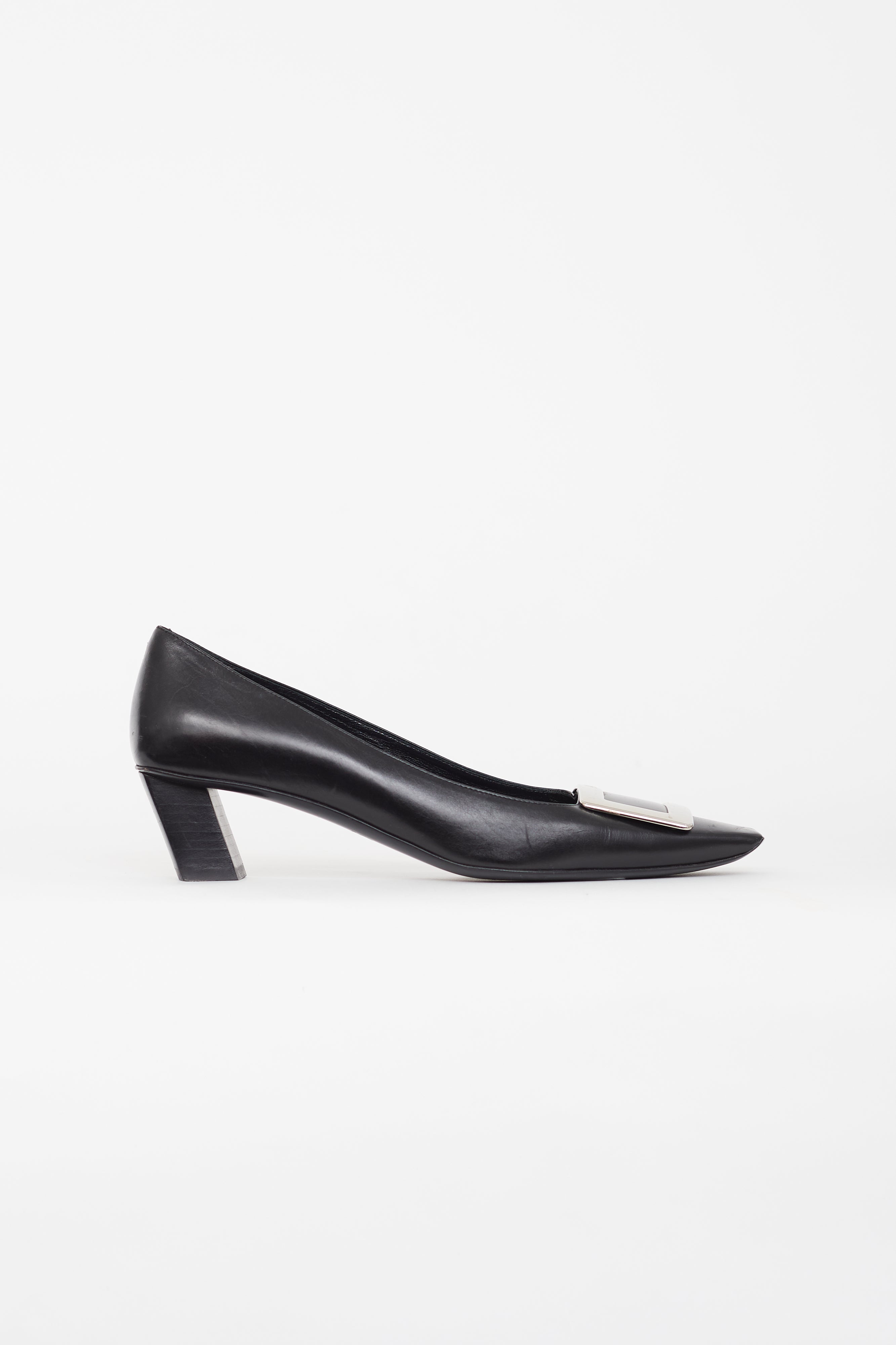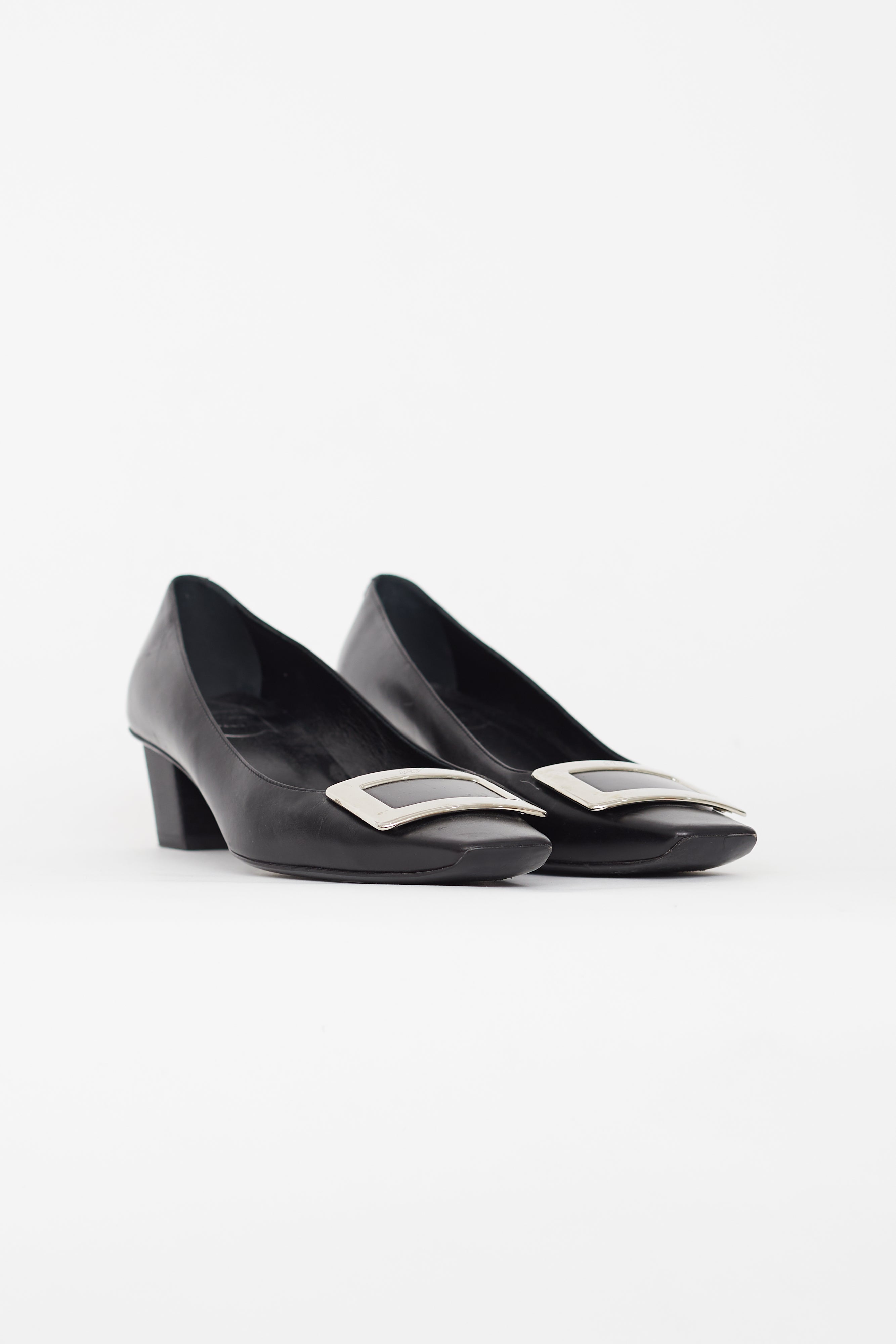 Pre-owned Roger Vivier black Belle Vivier heels featuring a square toe, silver tone logo square buckle, and stacked heel.