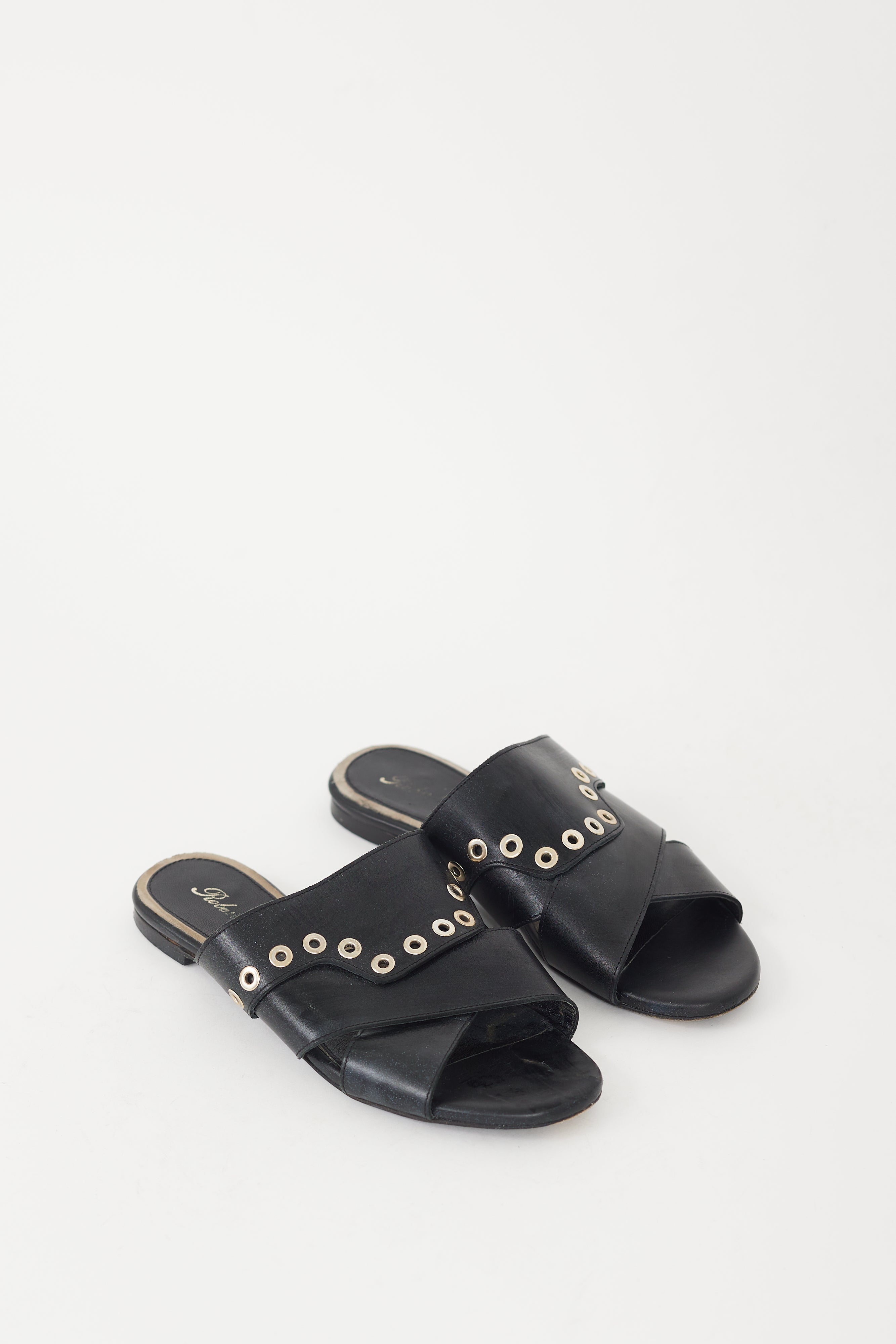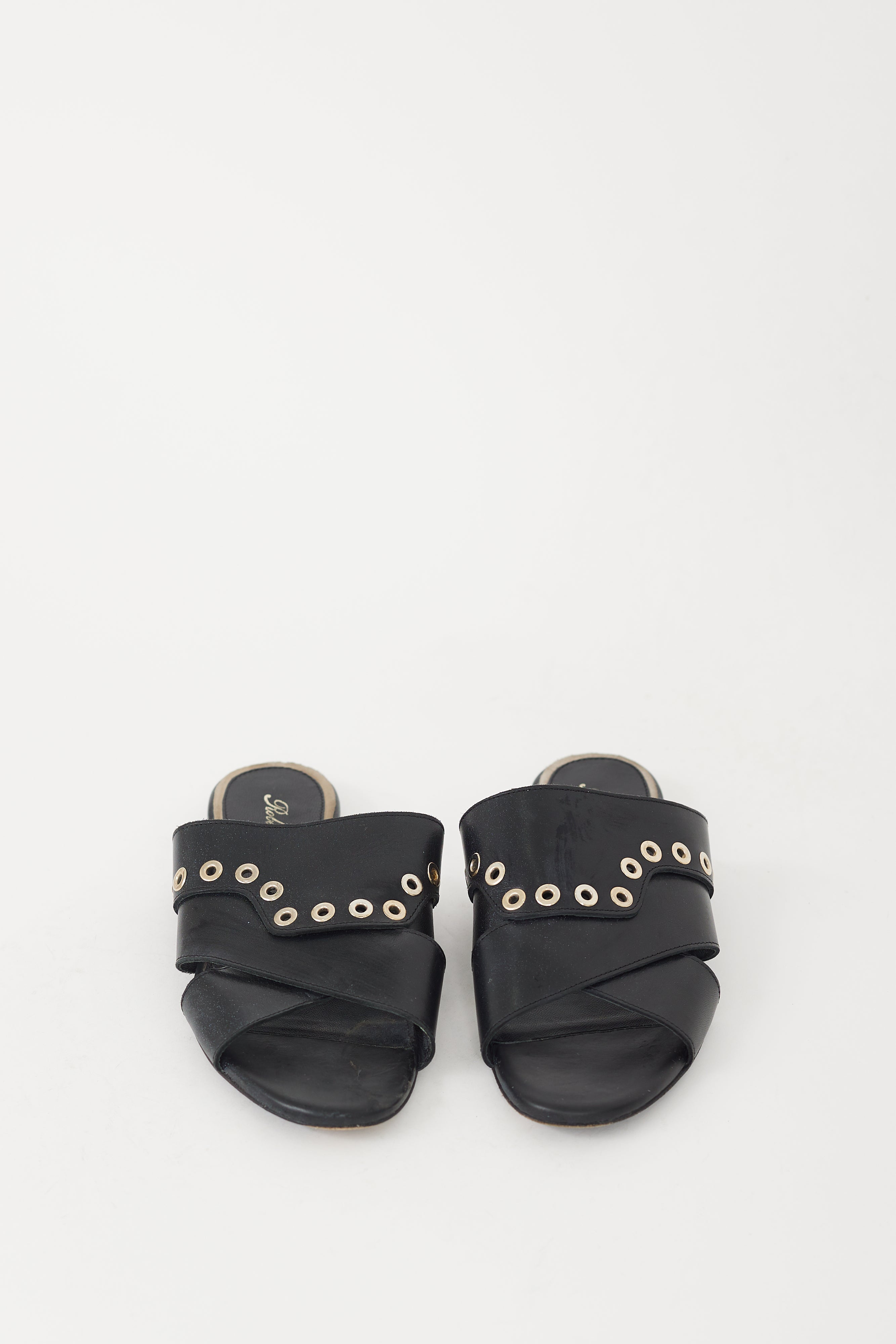 Pre-owned Roger Vivier black leather sandals featuring a rounded toe, crossed straps across vamp, panel across instep with silver tone grommet embellishment, and wooden outsole.