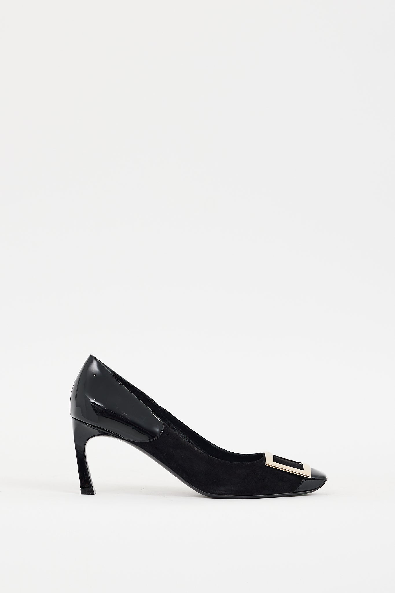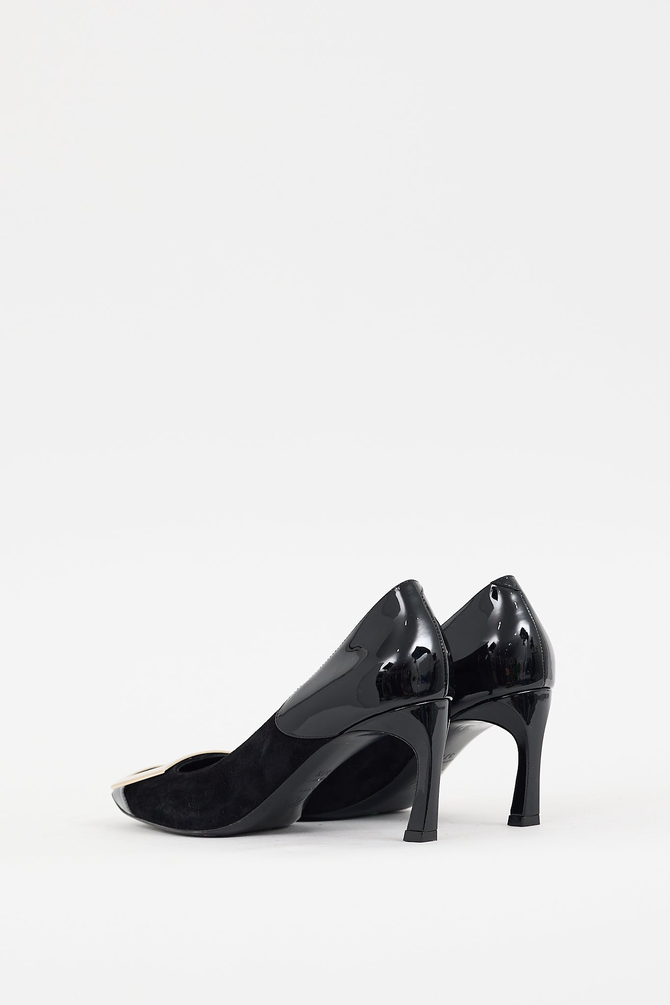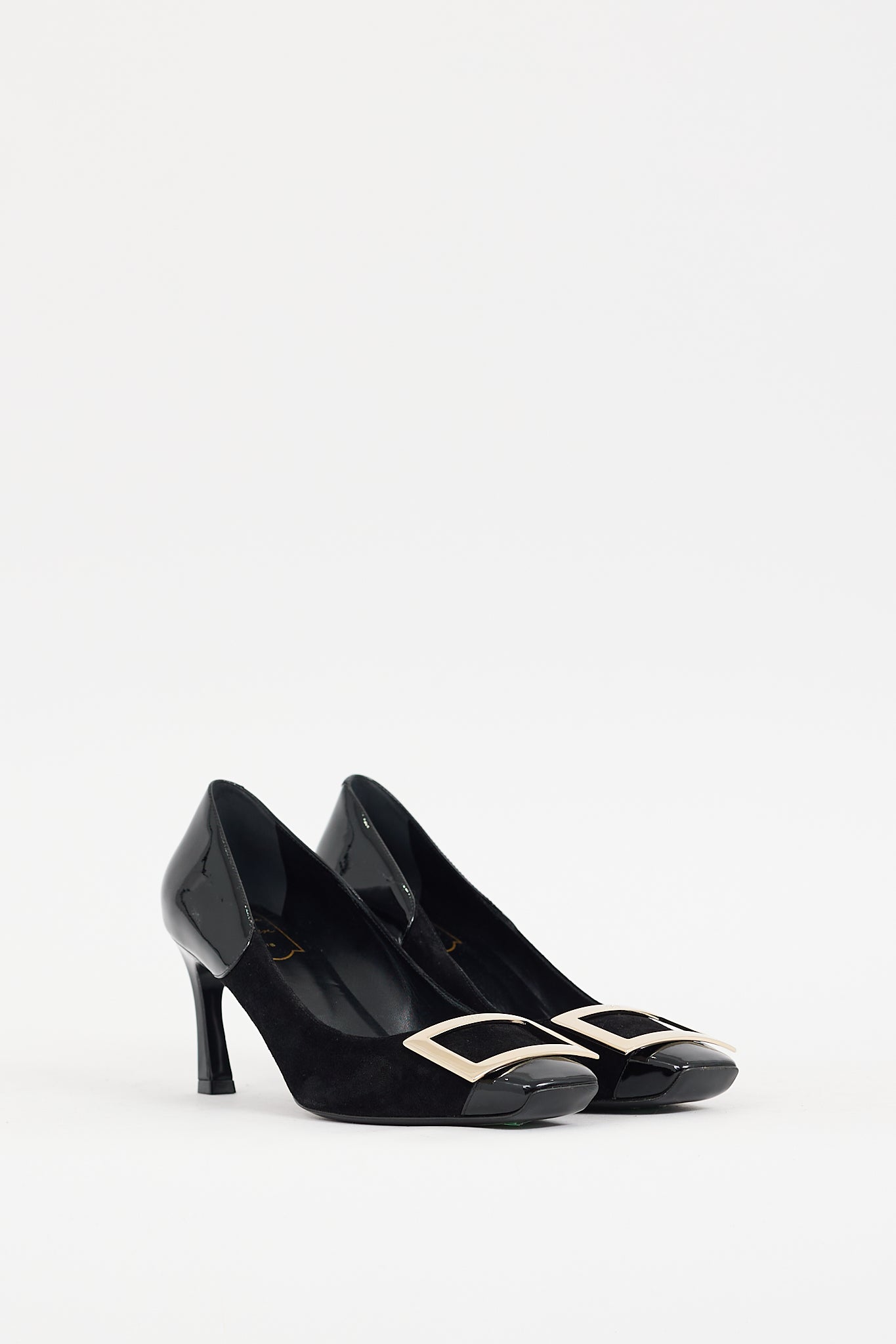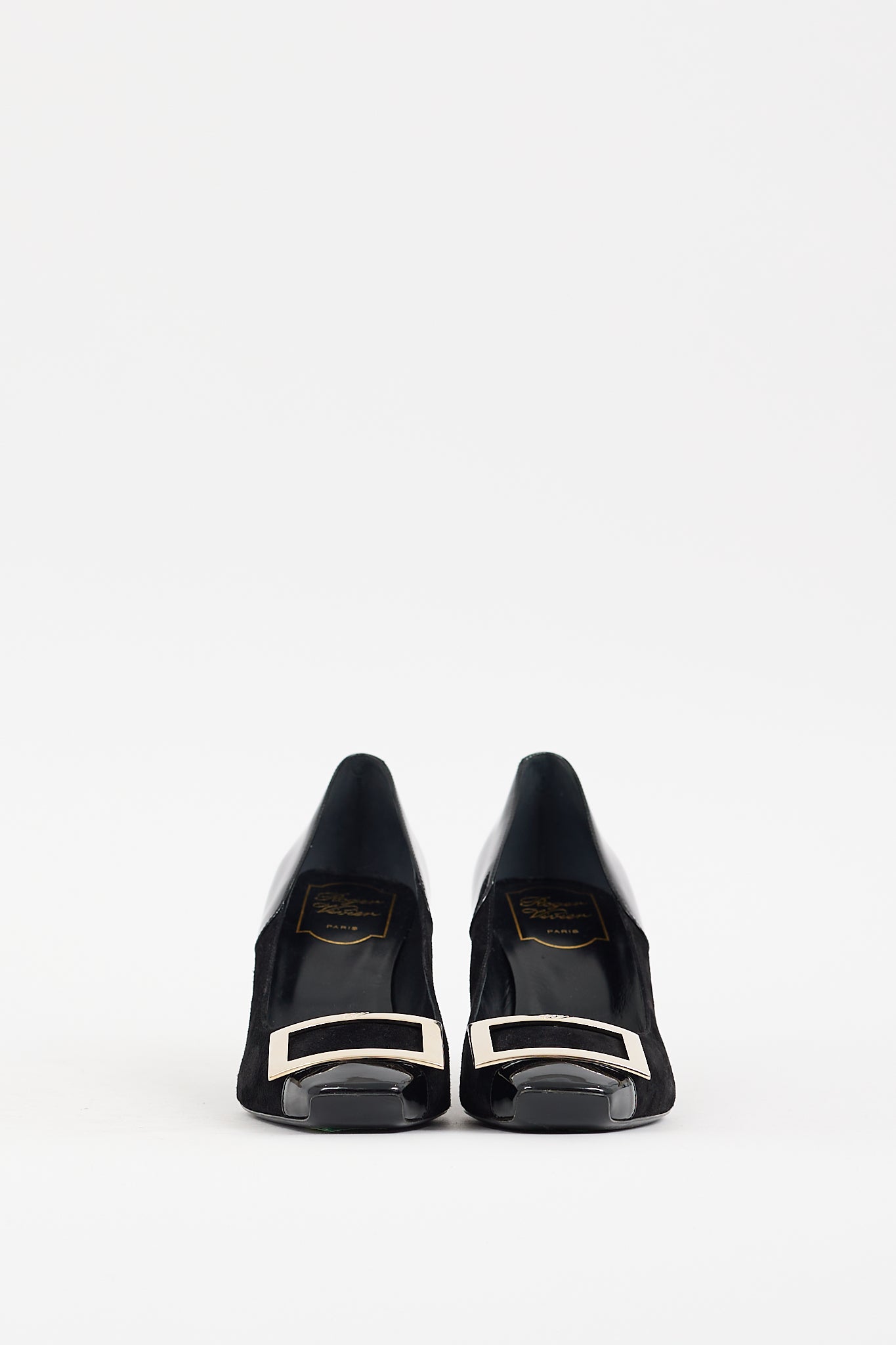 Pre-owned Roger Vivier black suede and leather Belle Vivier Trompette pumps featuring tapered square toe, gold tone buckle at toe, slip on entry, and signature Trompette heel.