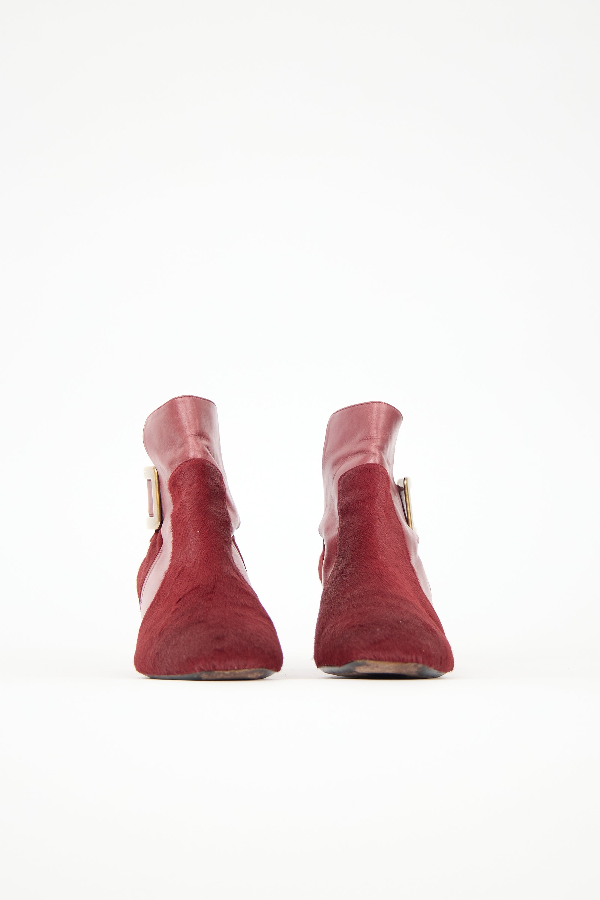 Pre-owned Roger Vivier burgundy leather and pony hair ankle boots featuring square toe, gold tone rectangular buckle with etched logo, and covered block heel.