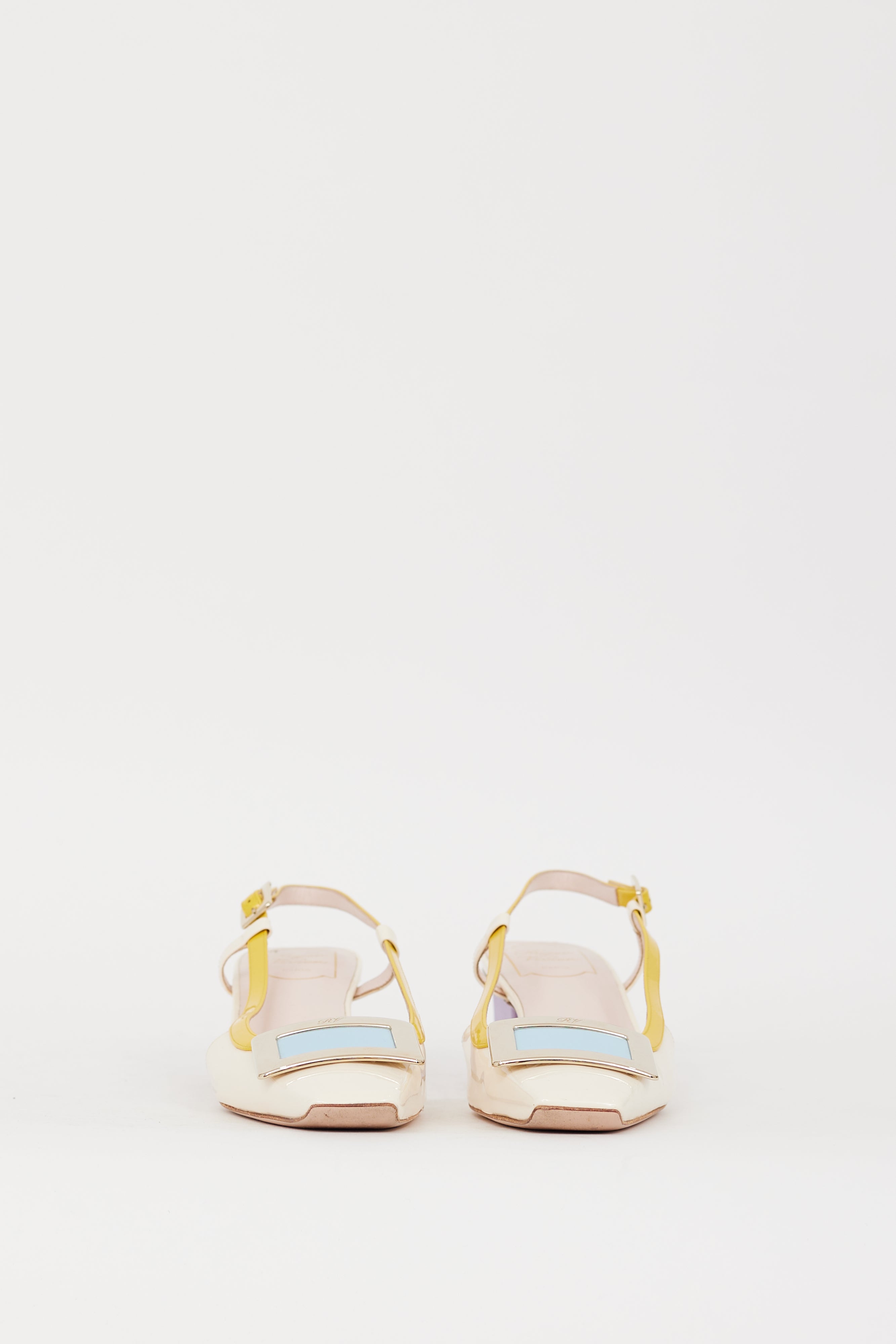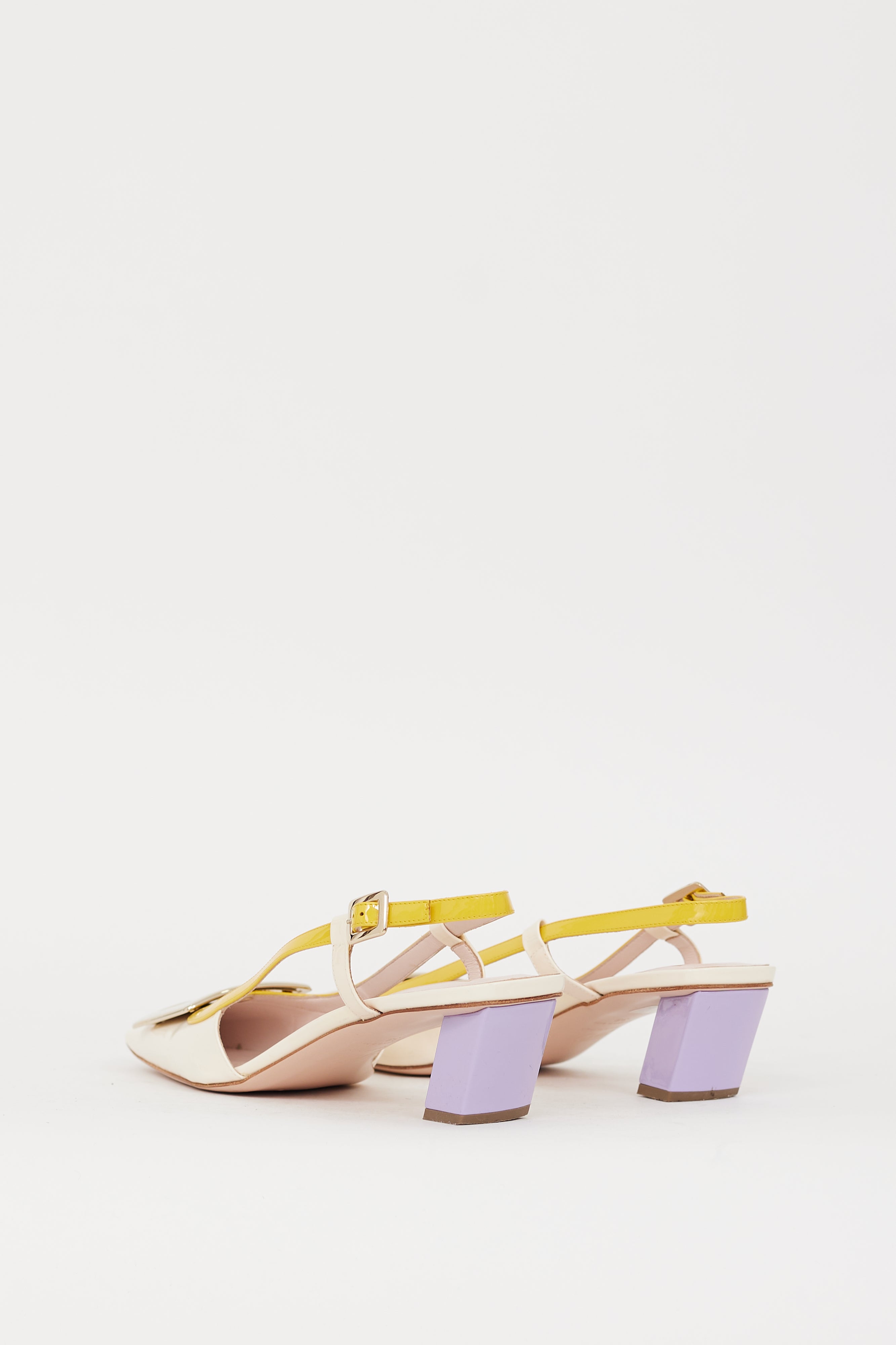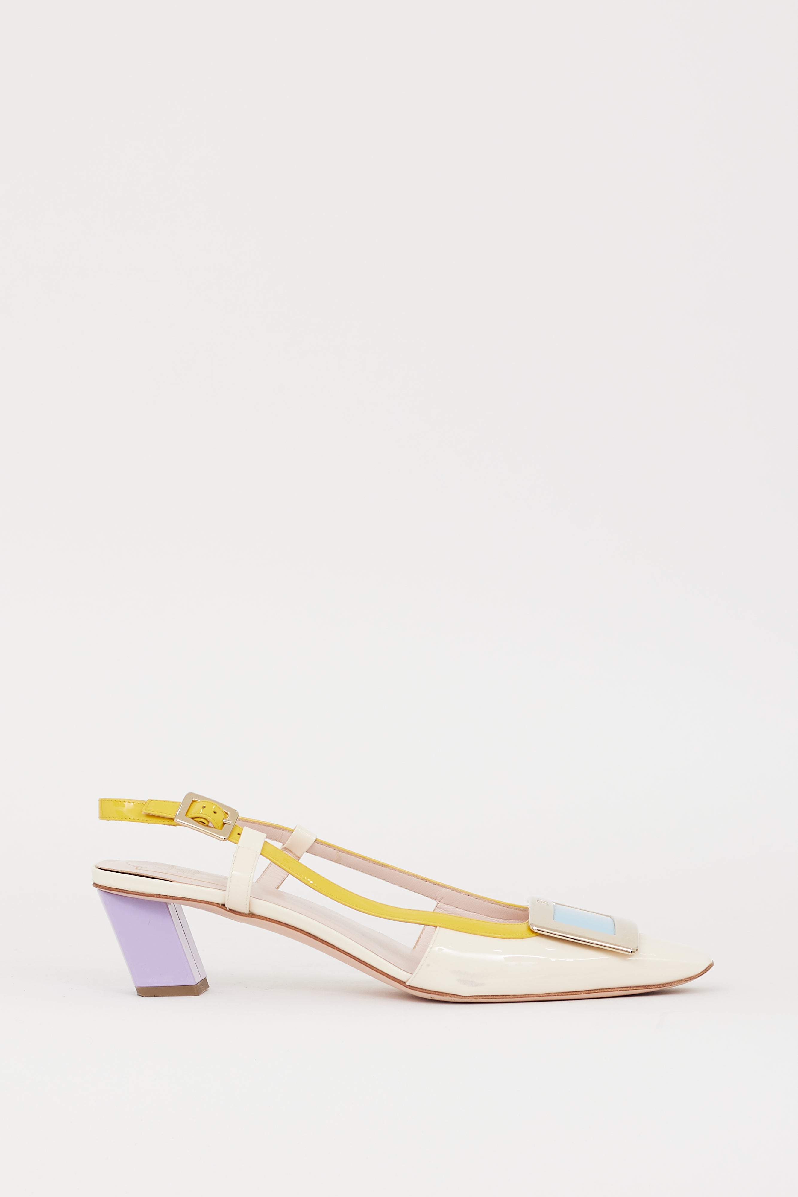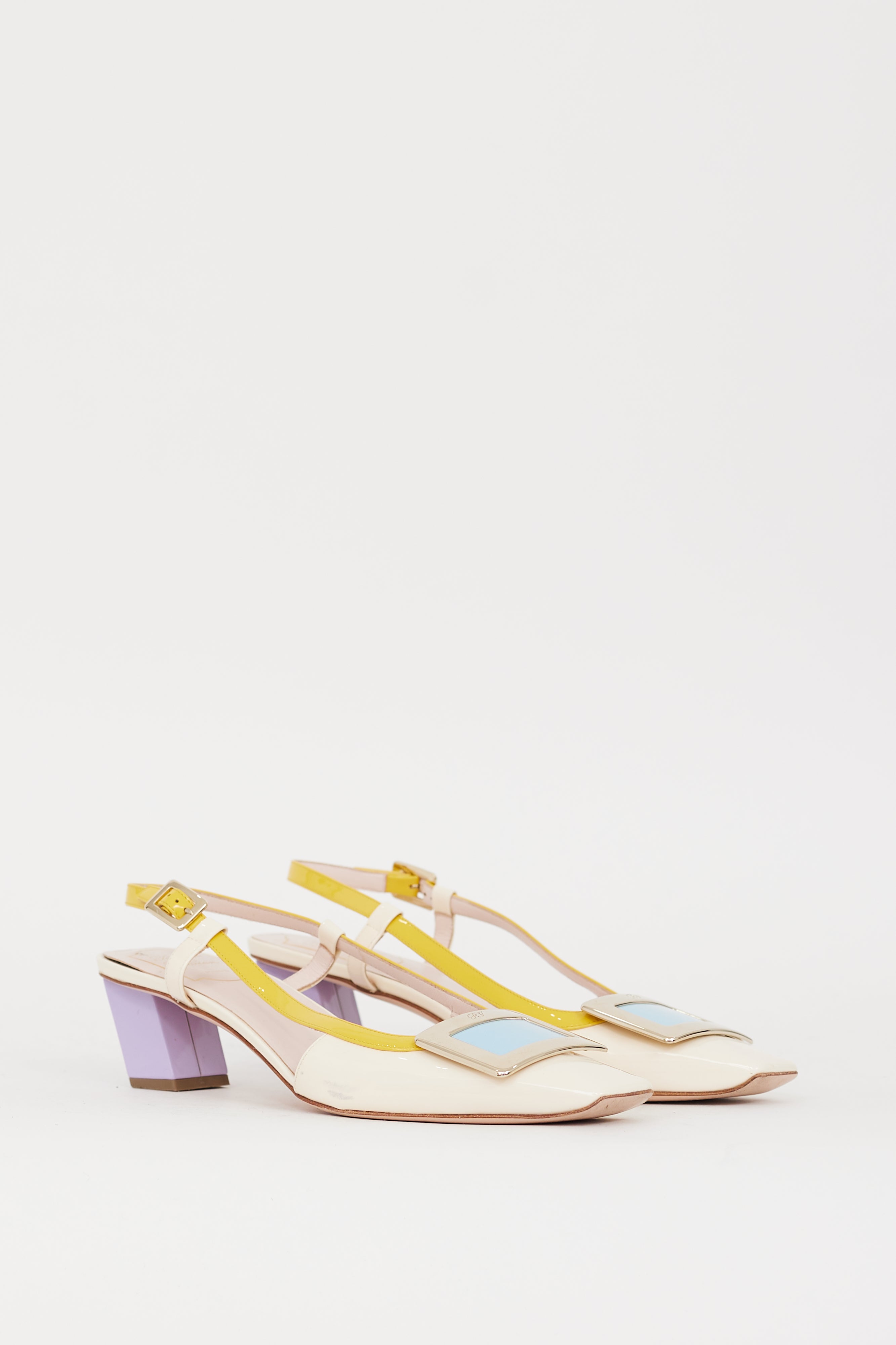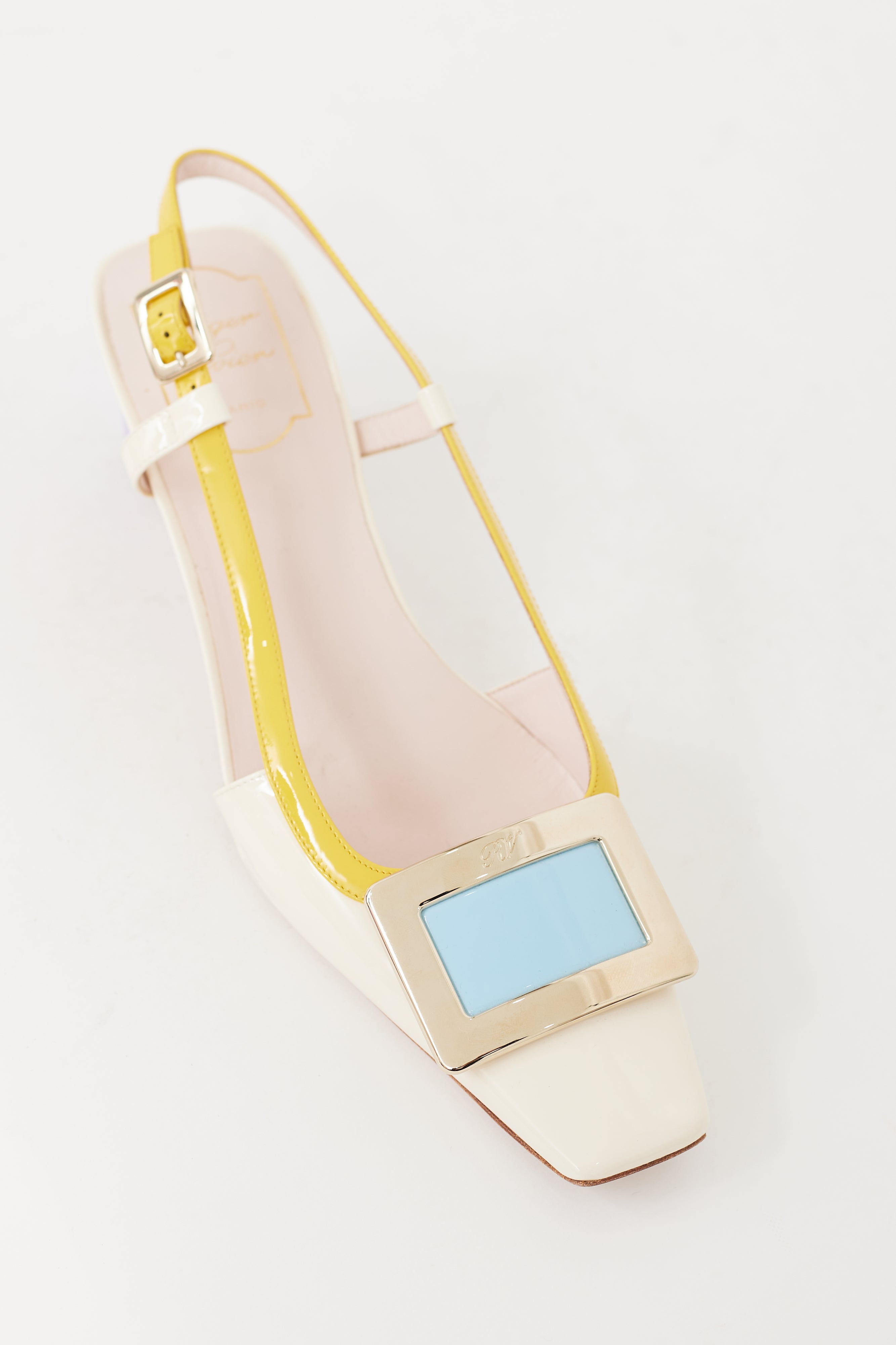 Pre-owned Roger Vivier multicolour patent leather Belle Vivier pumps featuring elongated square toe, gold tone and blue buckle at toe, slip on entry, yellow ankle strap, and purple slanted block heel. Comes with original dust bag.