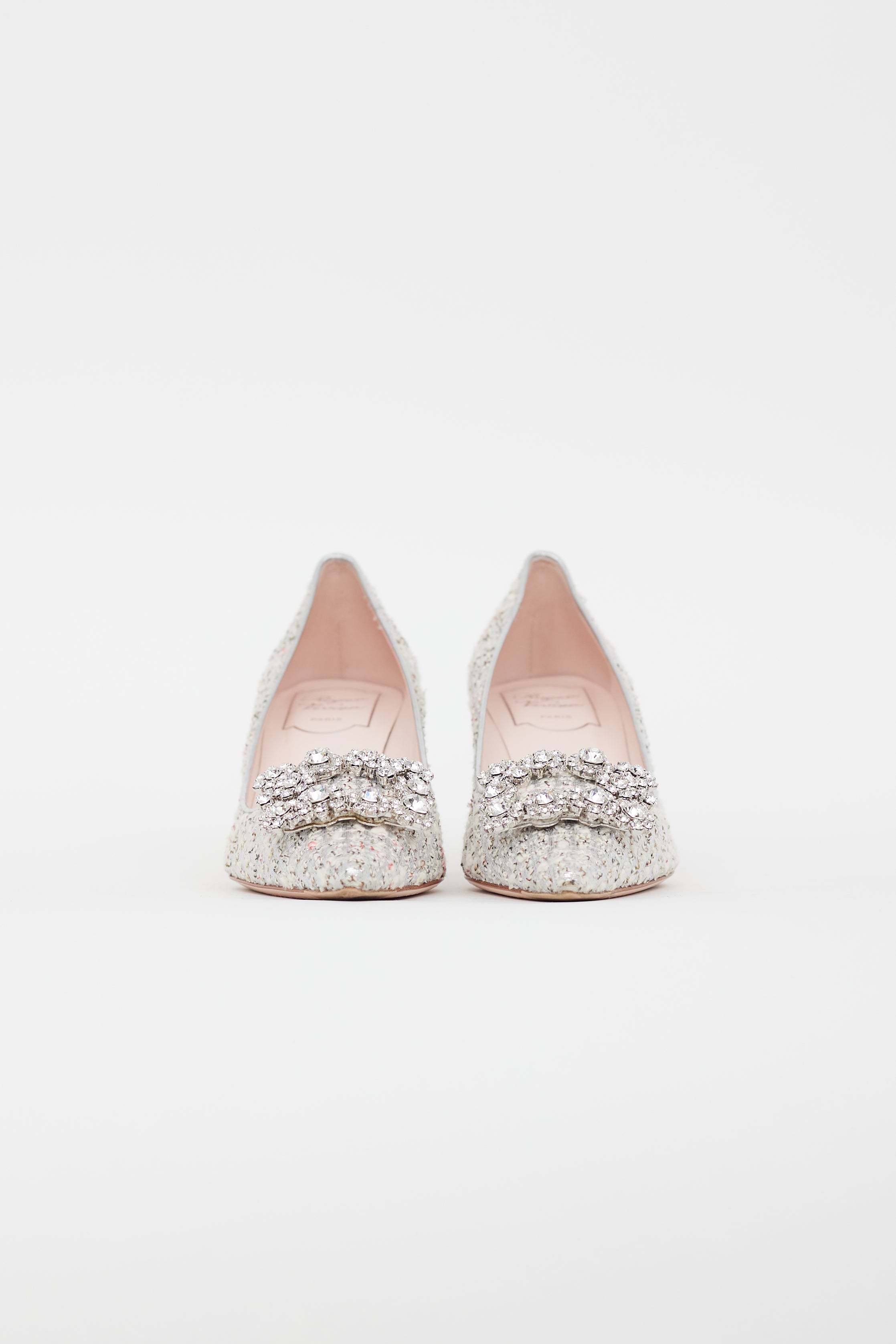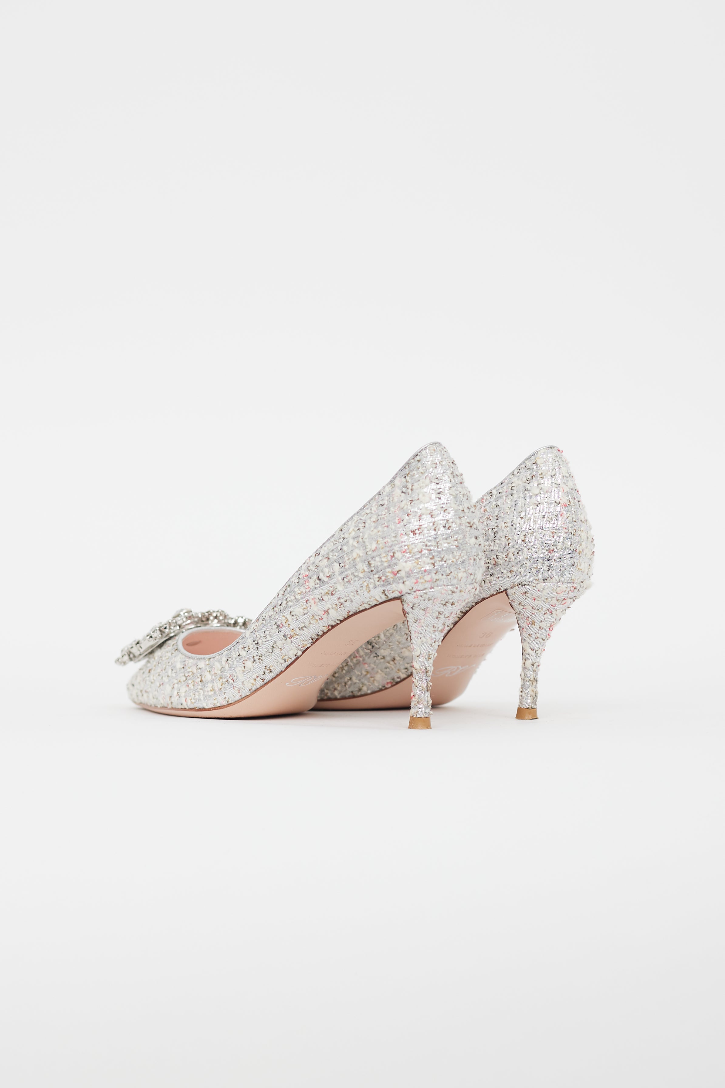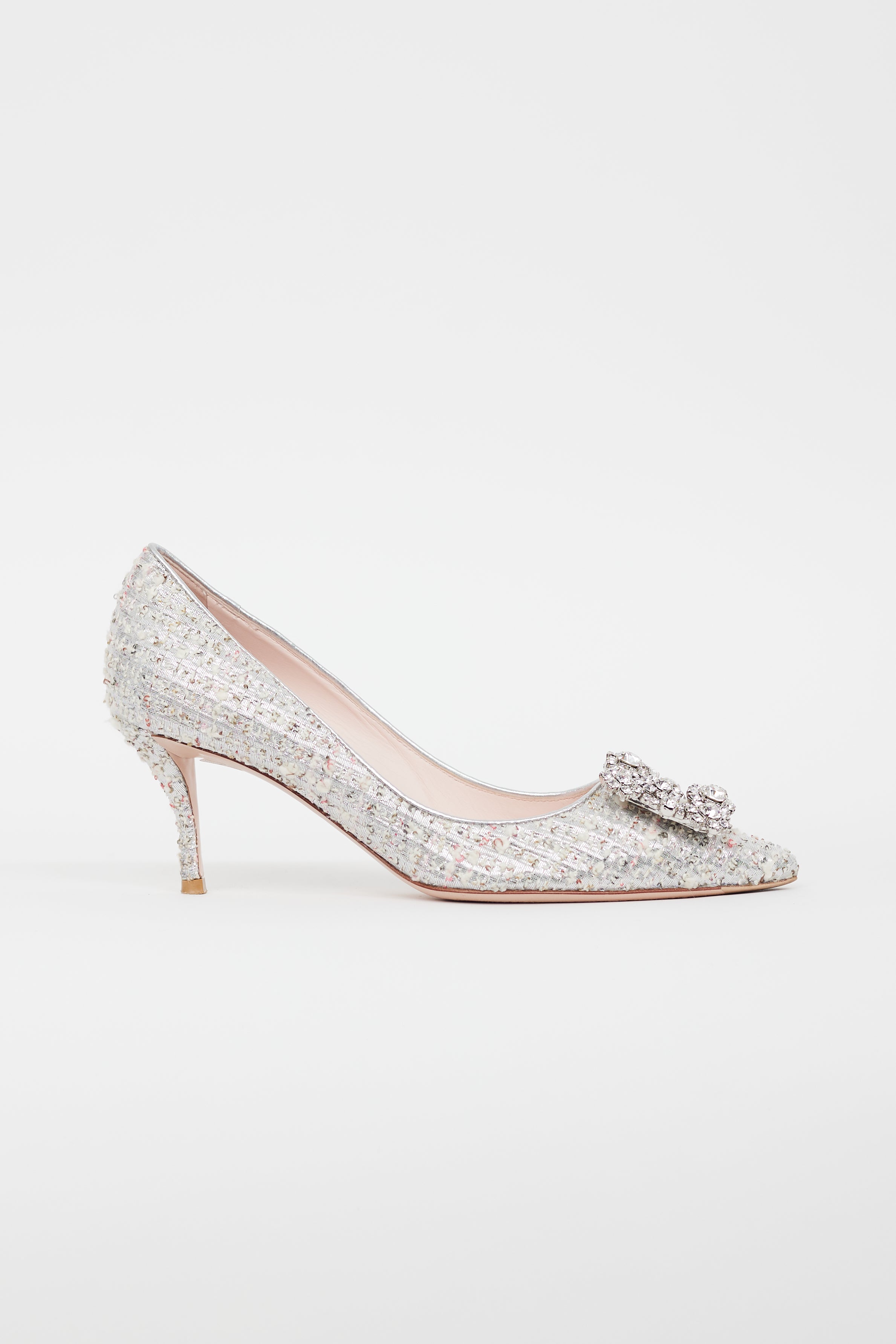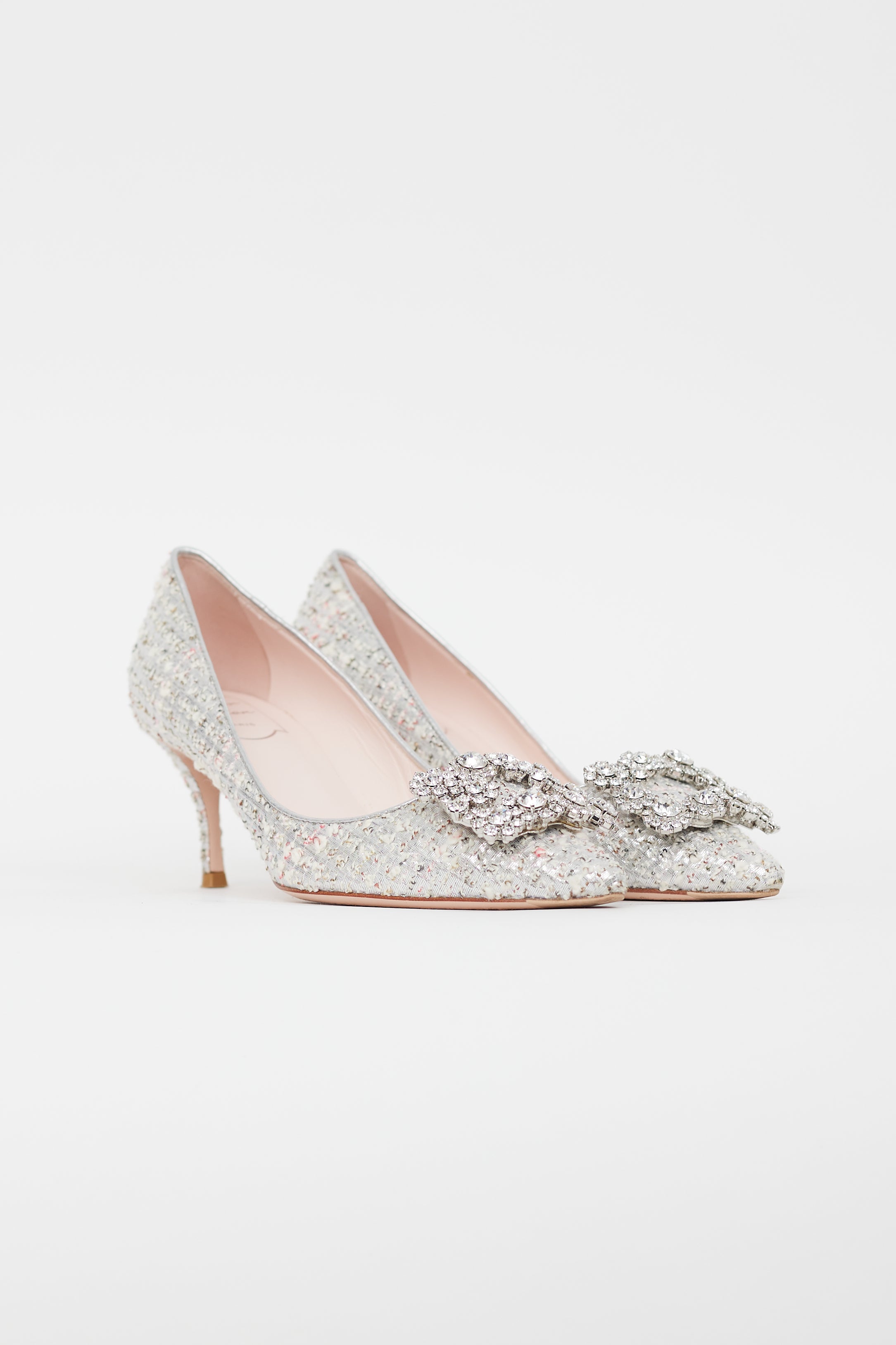 Pre-owned Roger Vivier silver tweed pumps featuring pointed toe, covered kitten heel, rectangular crystal embellishment at toe box, and leather insoles. Comes with original dust bag.