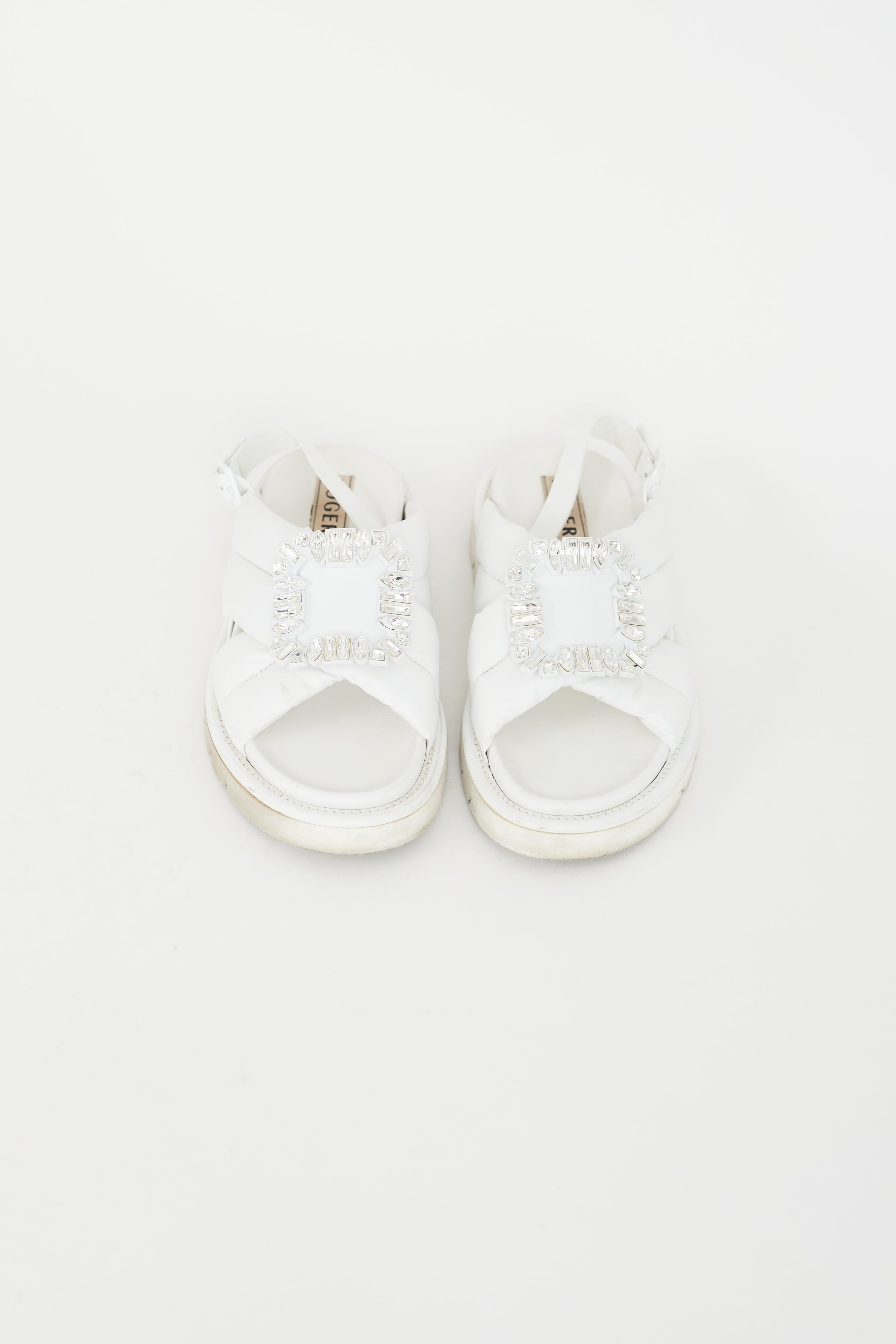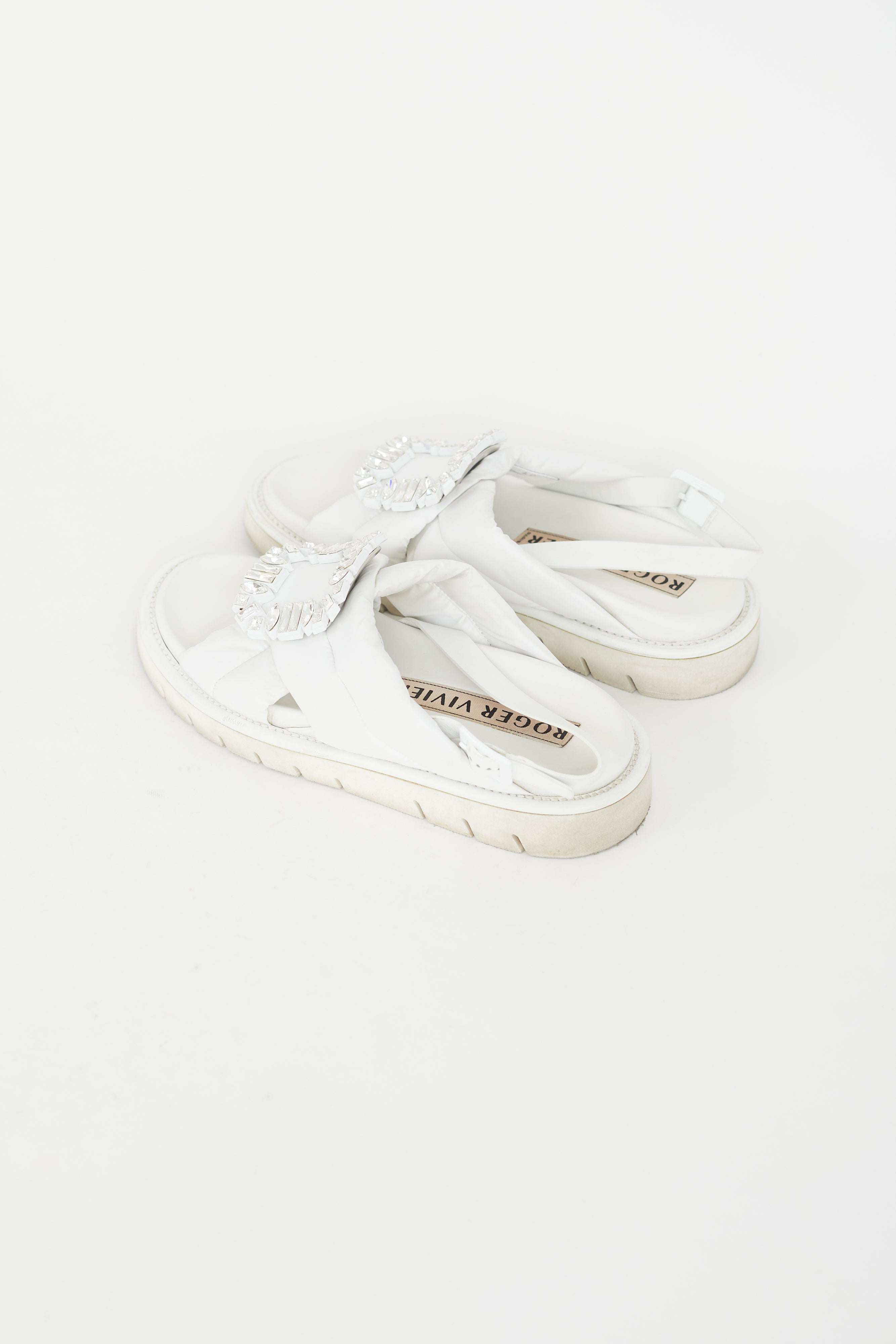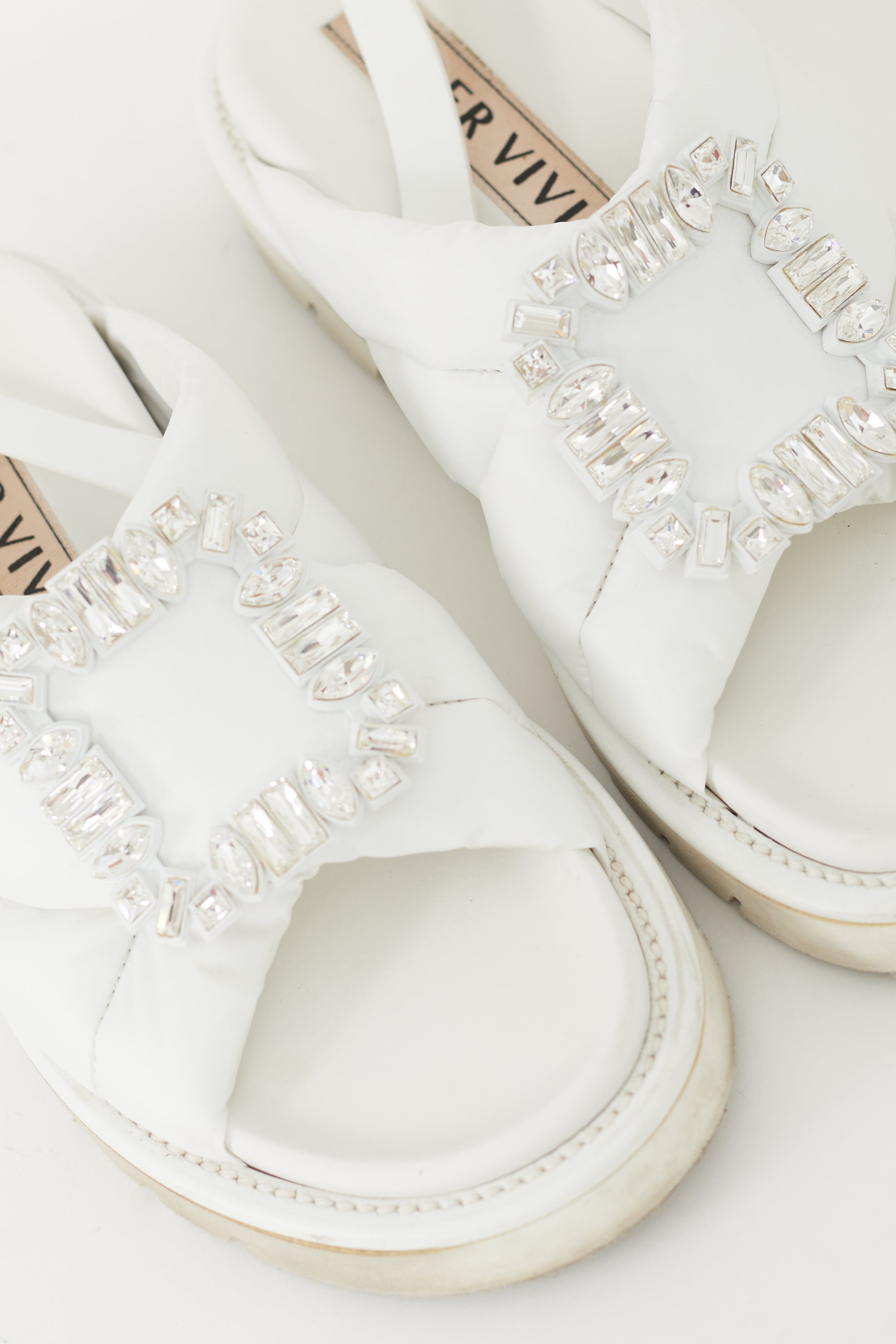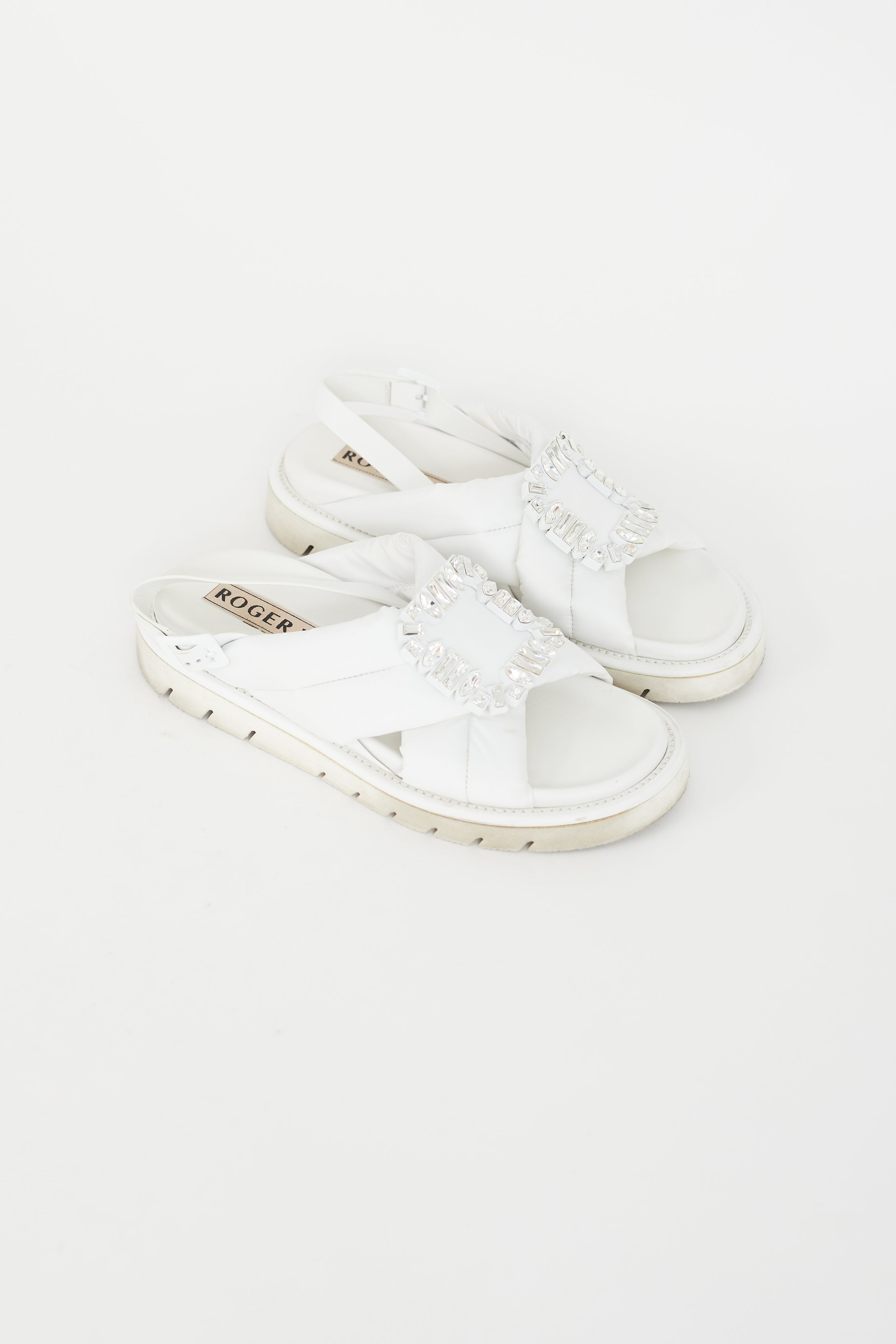 Pre-owned Roger Vivier white Viv' Winter Strass sandals featuring open rounded toe, criss cross padded strap, oversized buckle at vamp with crystal embellishment, ankle strap with buckle fastening, and rubber outsole.