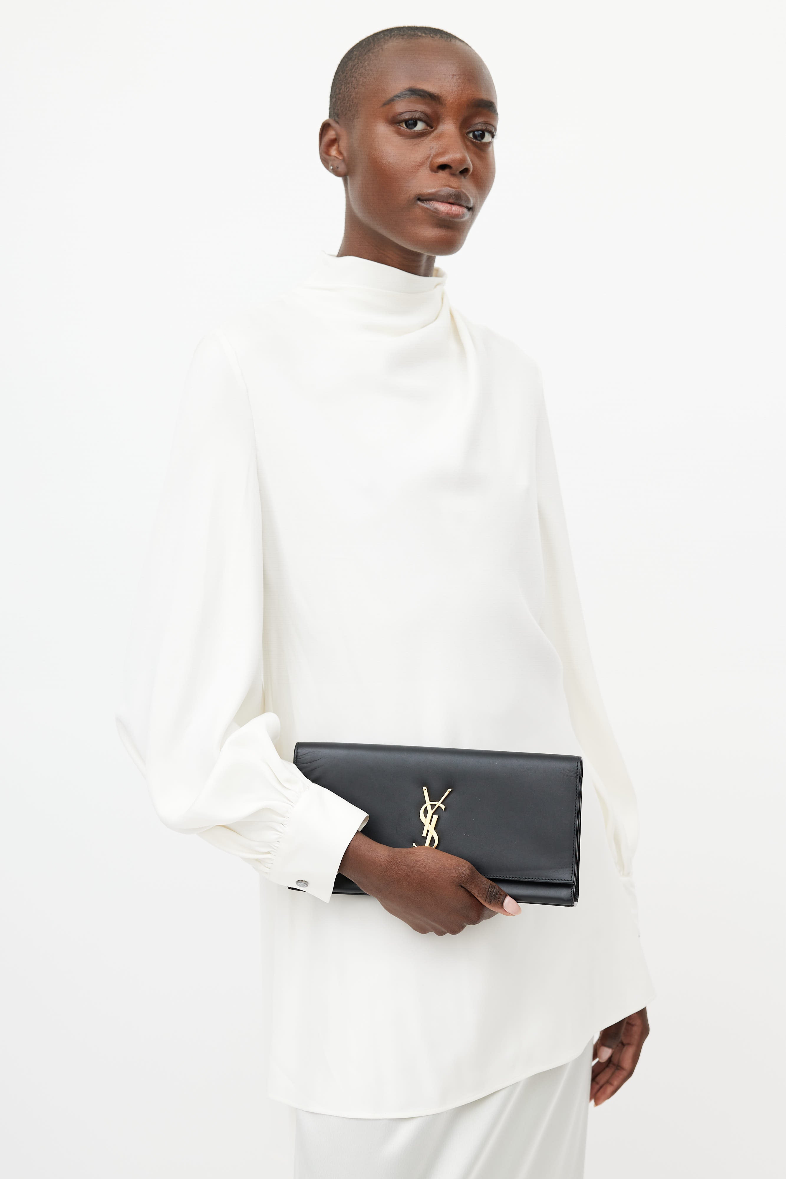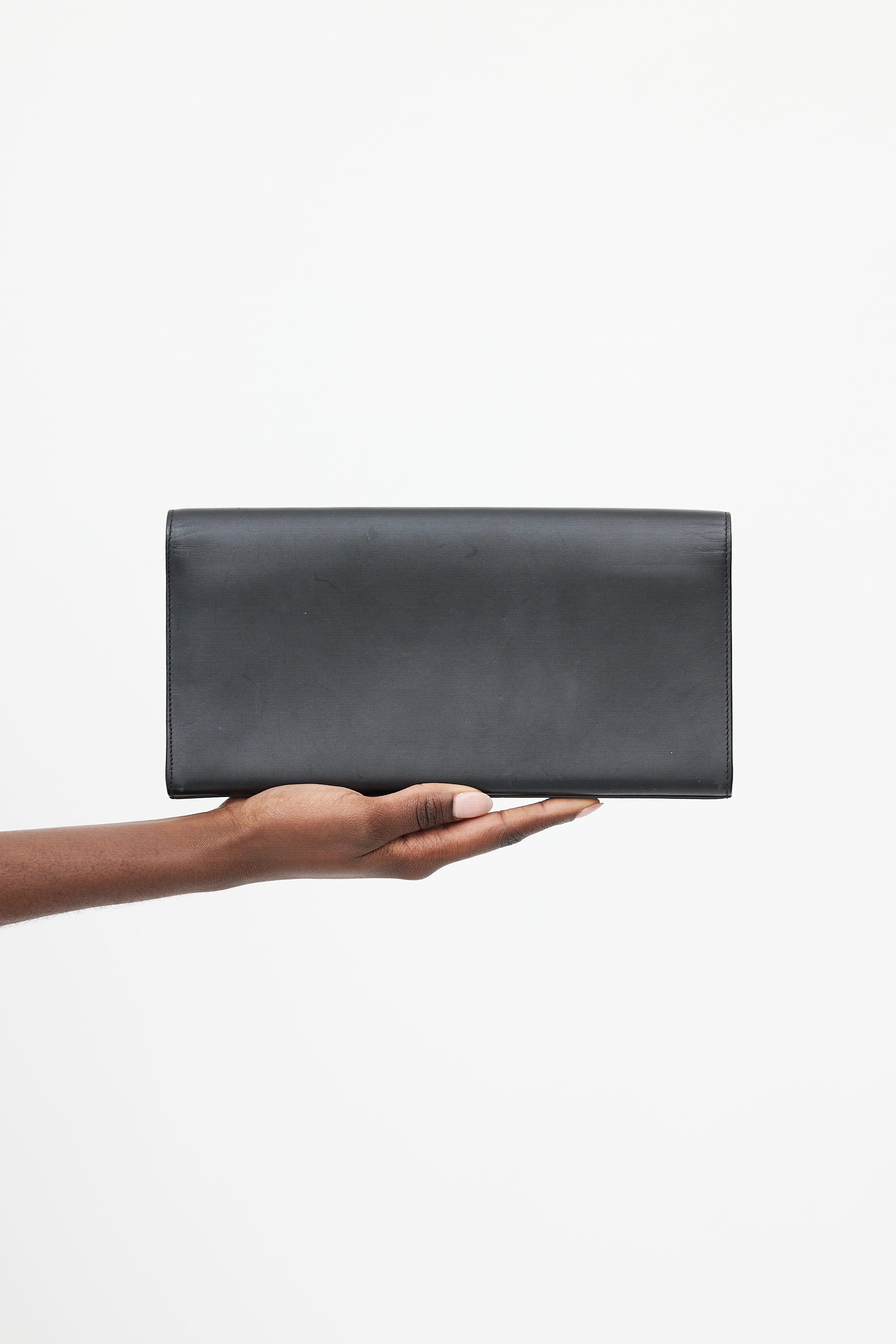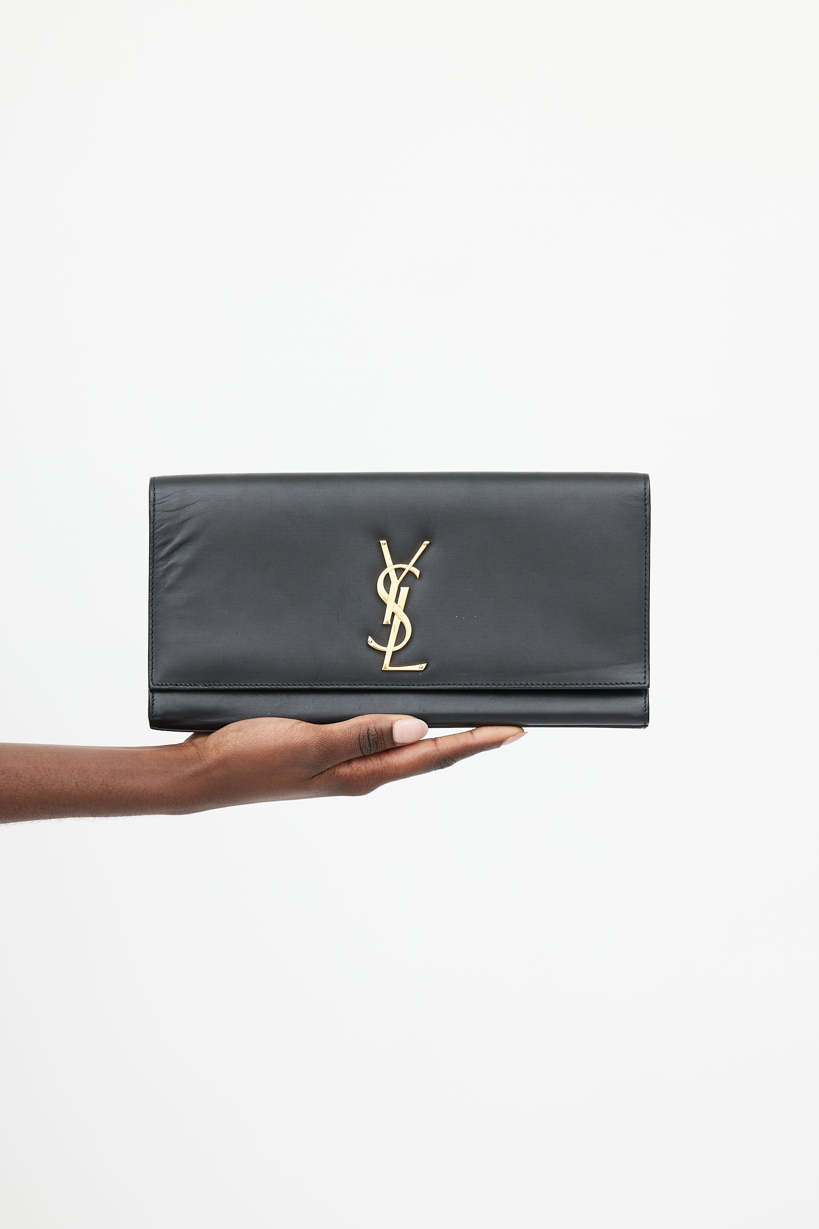 Pre-owned Saint Laurent black leather Kate clutch featuring a top flap with gold tone logo hardware at front, one main compartment with one slip pocket, and a gold tone embossed logo at interior.