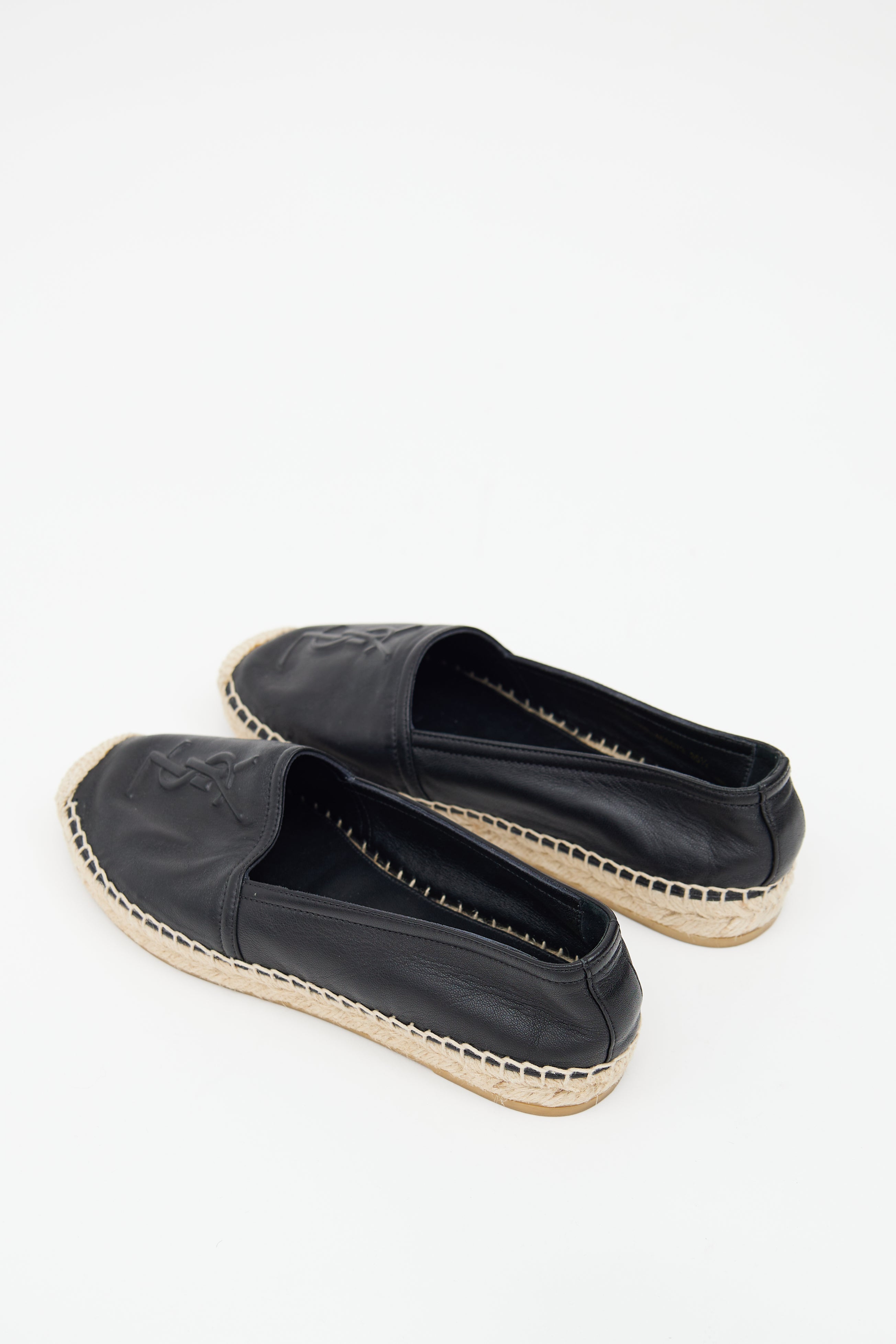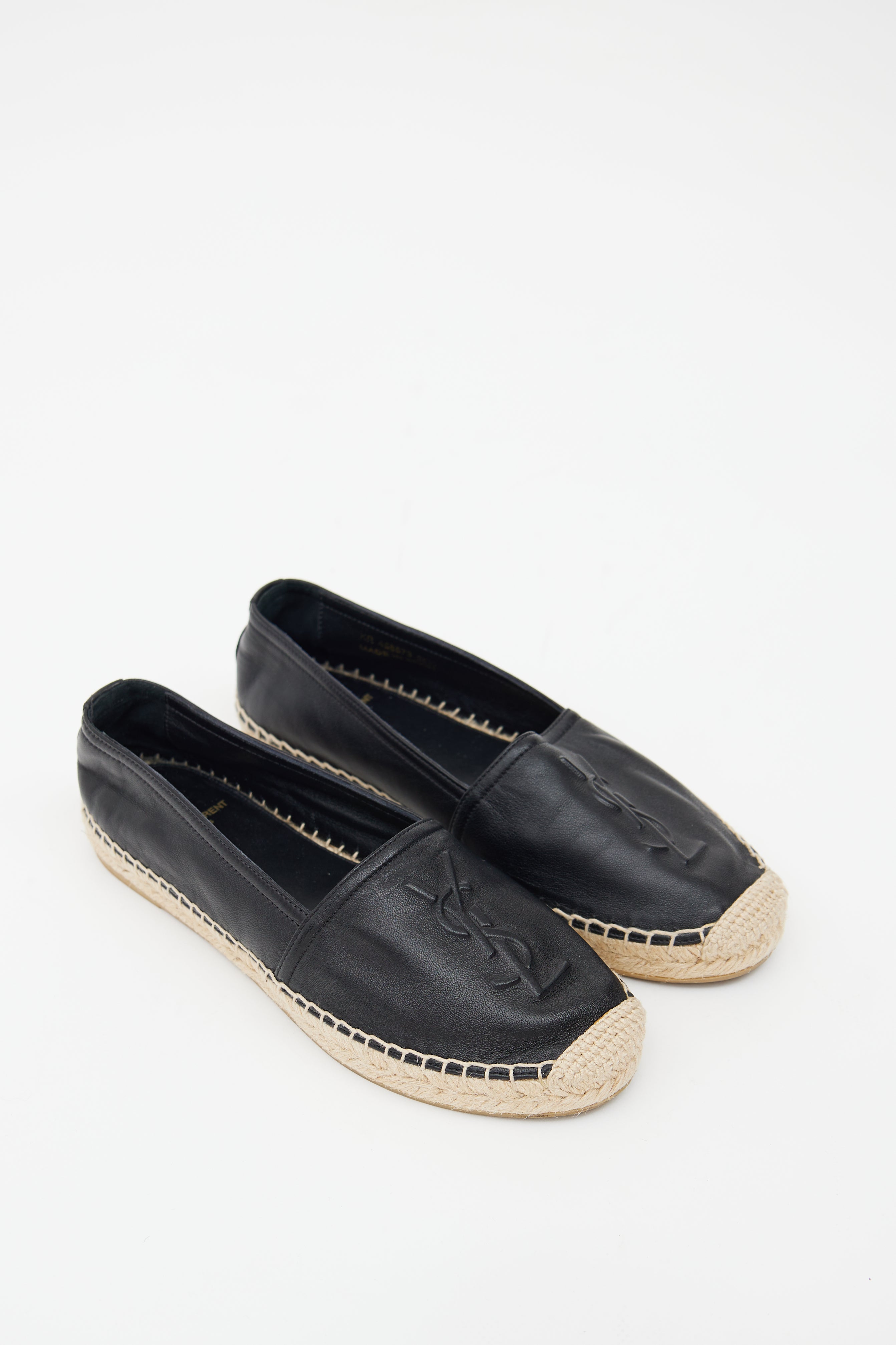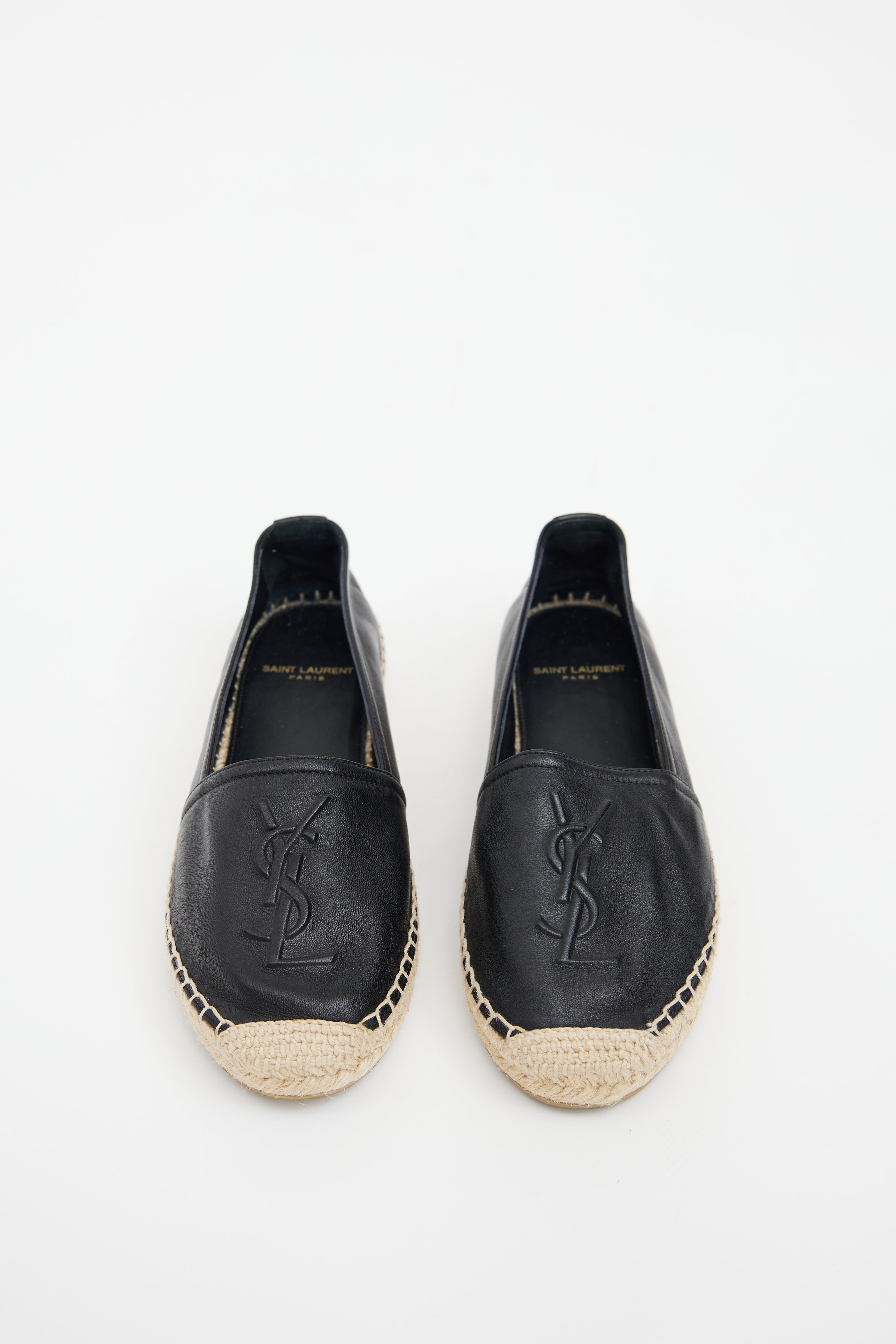 Pre-owned Saint Laurent black leather flats featuring a rounded toe, embossed Cassandre logo at vamp, woven espadrille midsole, and slip on entry.