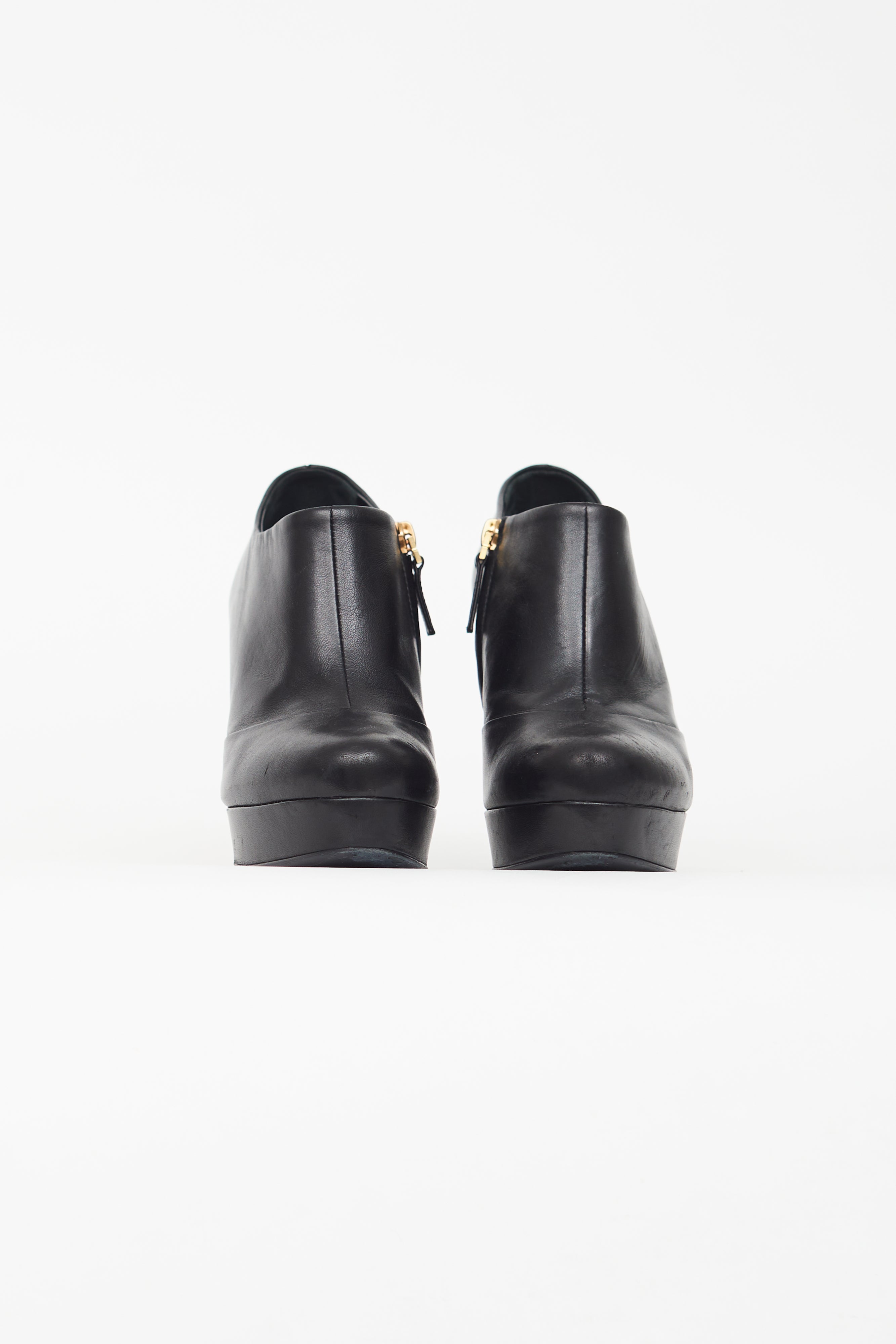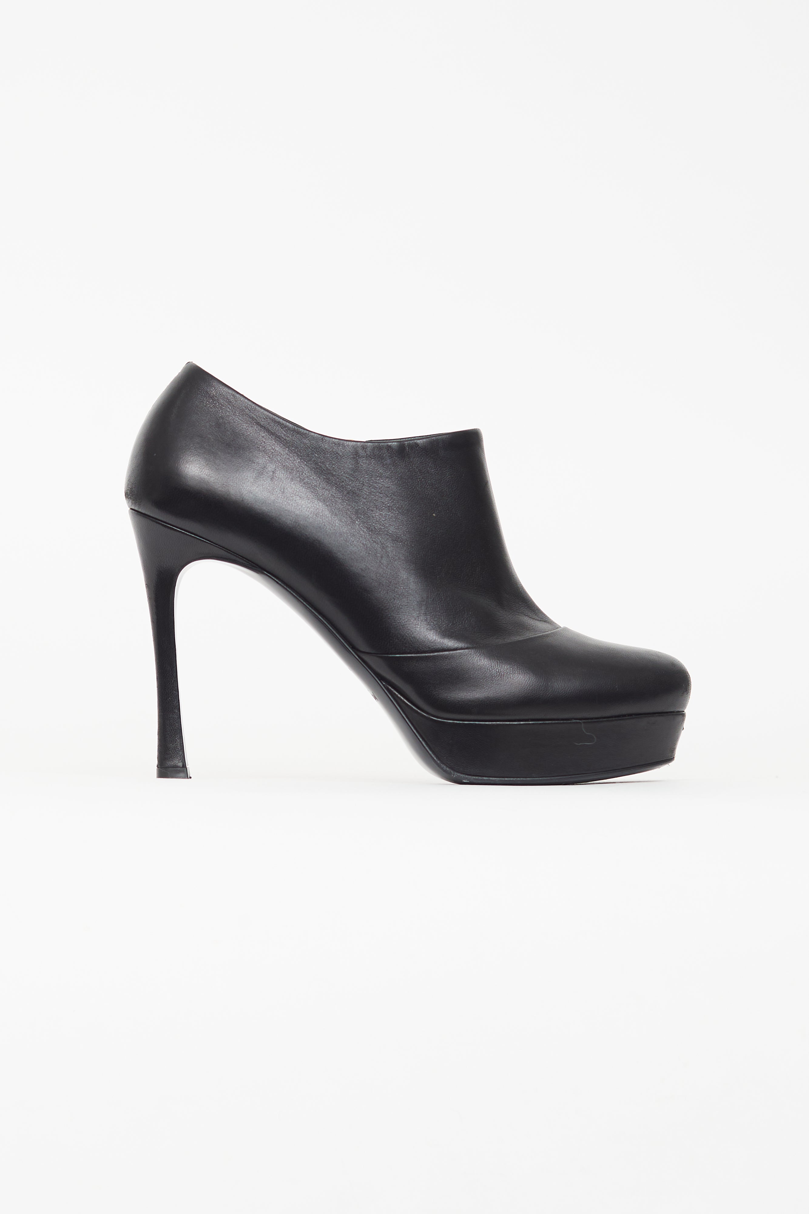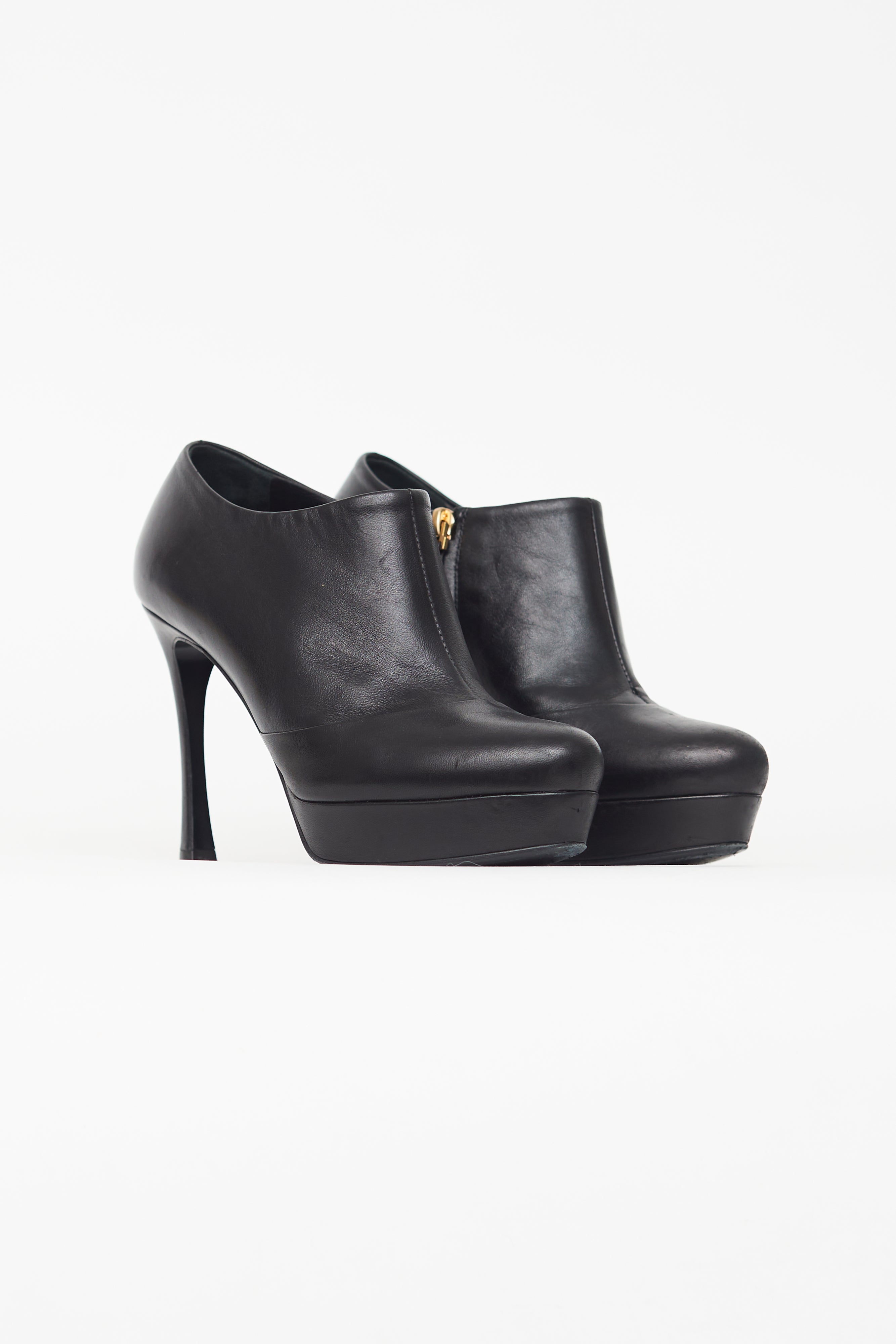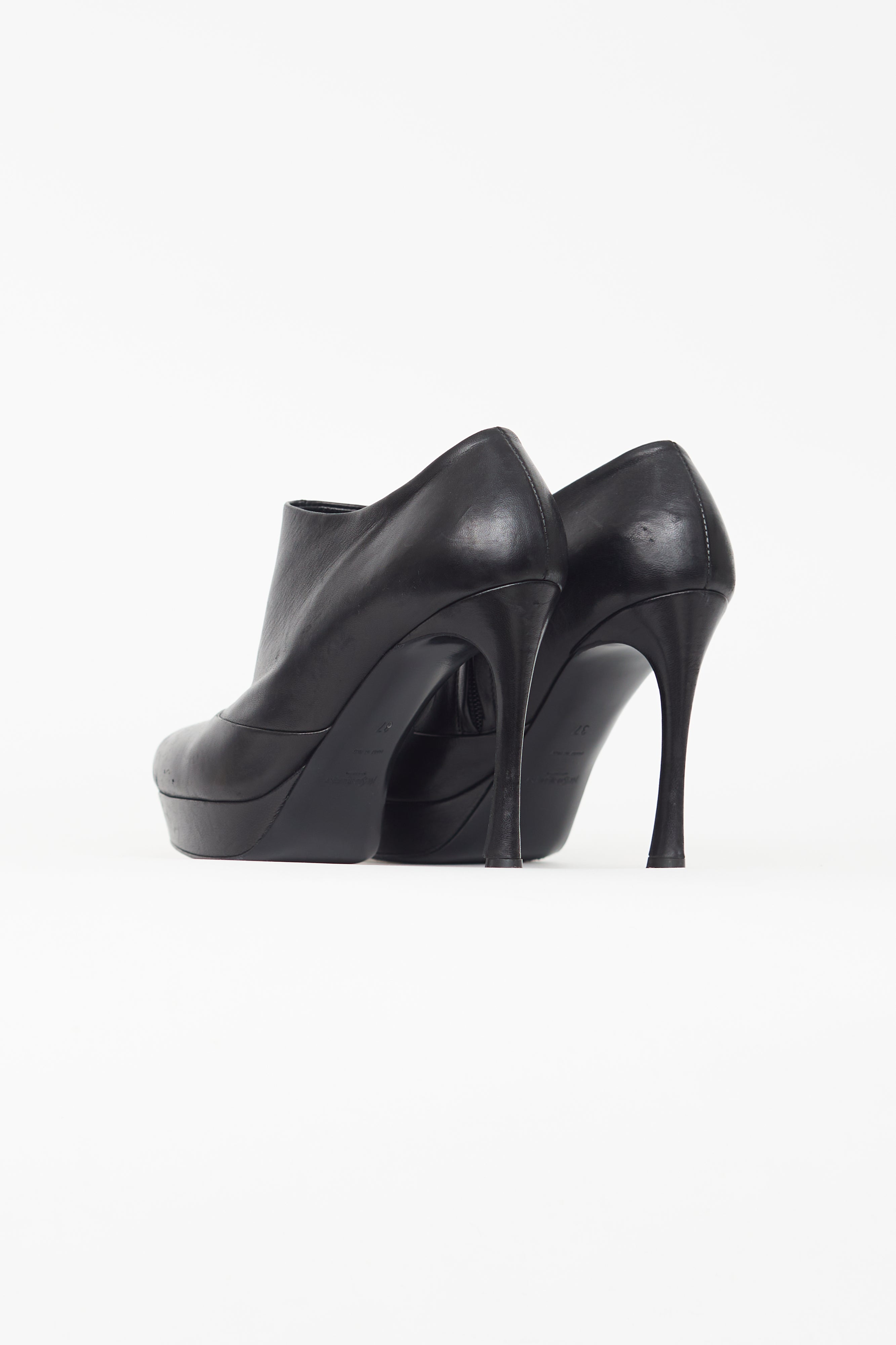 Pre-owned Saint Laurent black leather bootie featuring a pointed toe, wrapped stiletto heel, and zip closure at side.