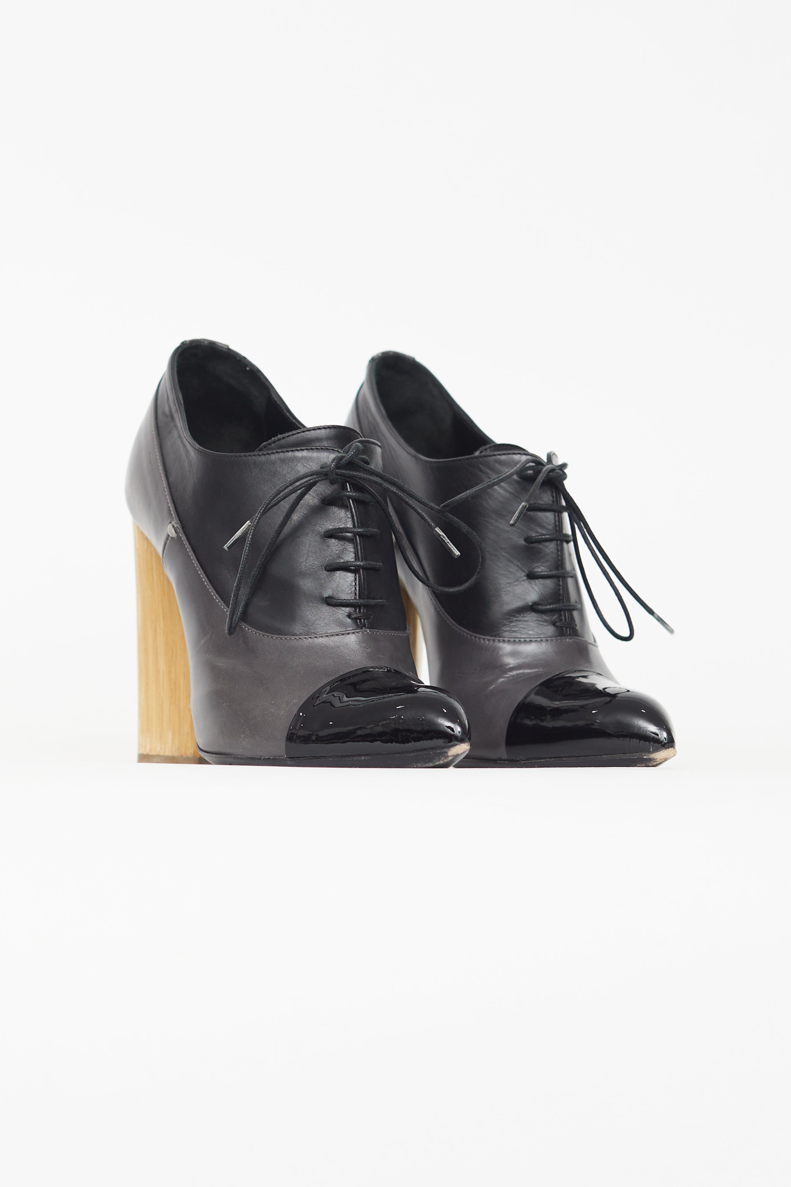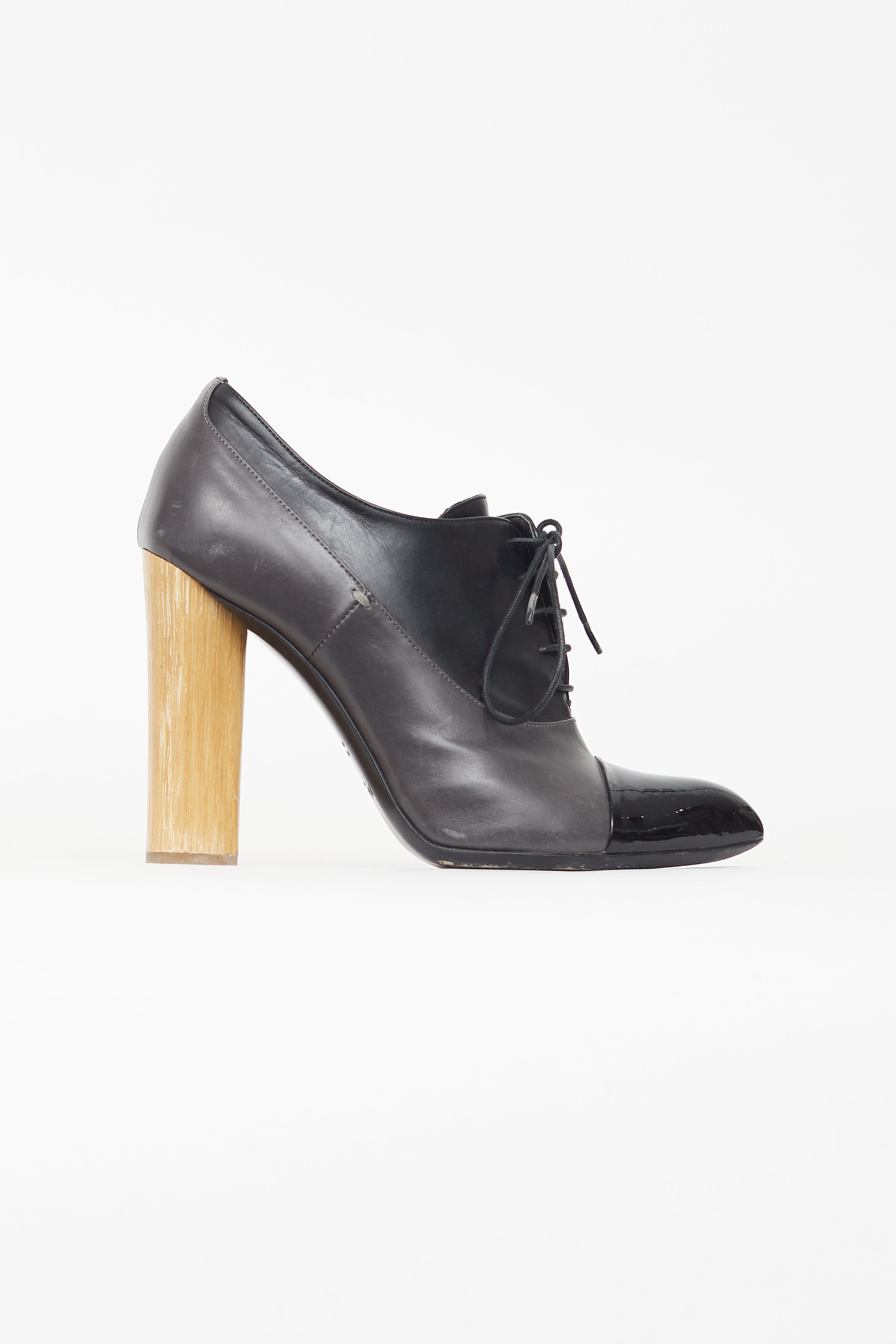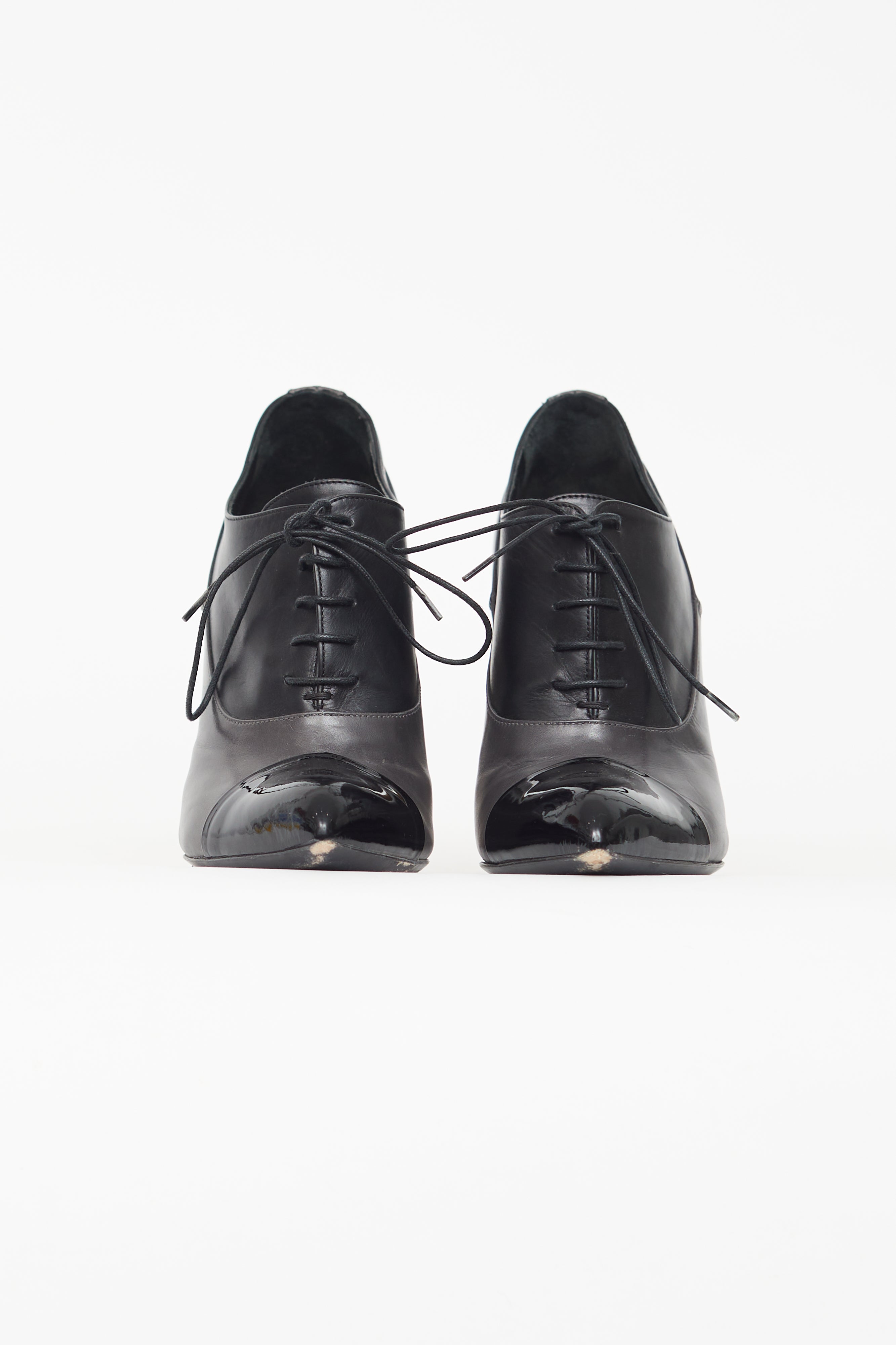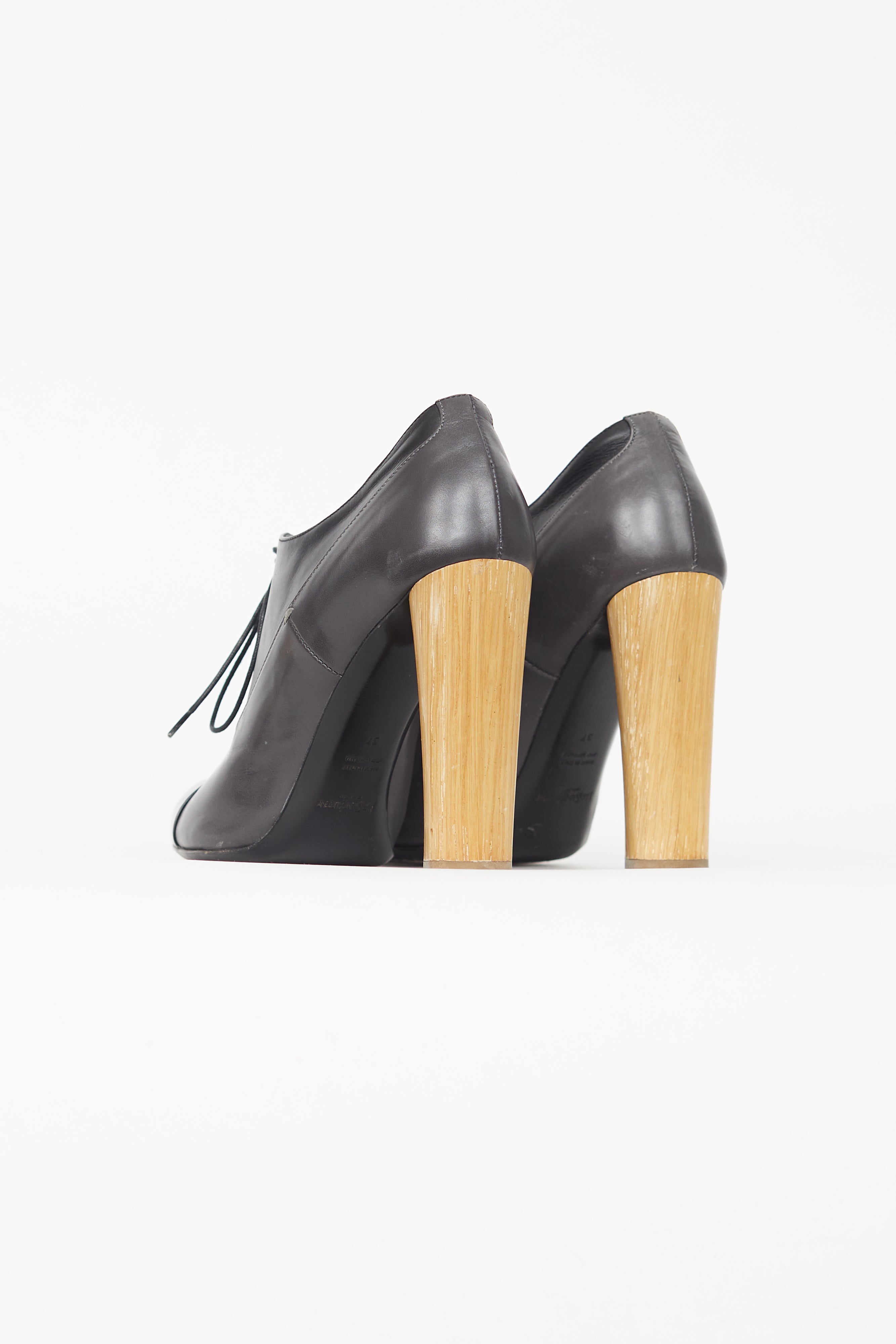 Pre-owned Saint Laurent black booties featuring a pointed cap toe, wooden block heel, and lace up closure.