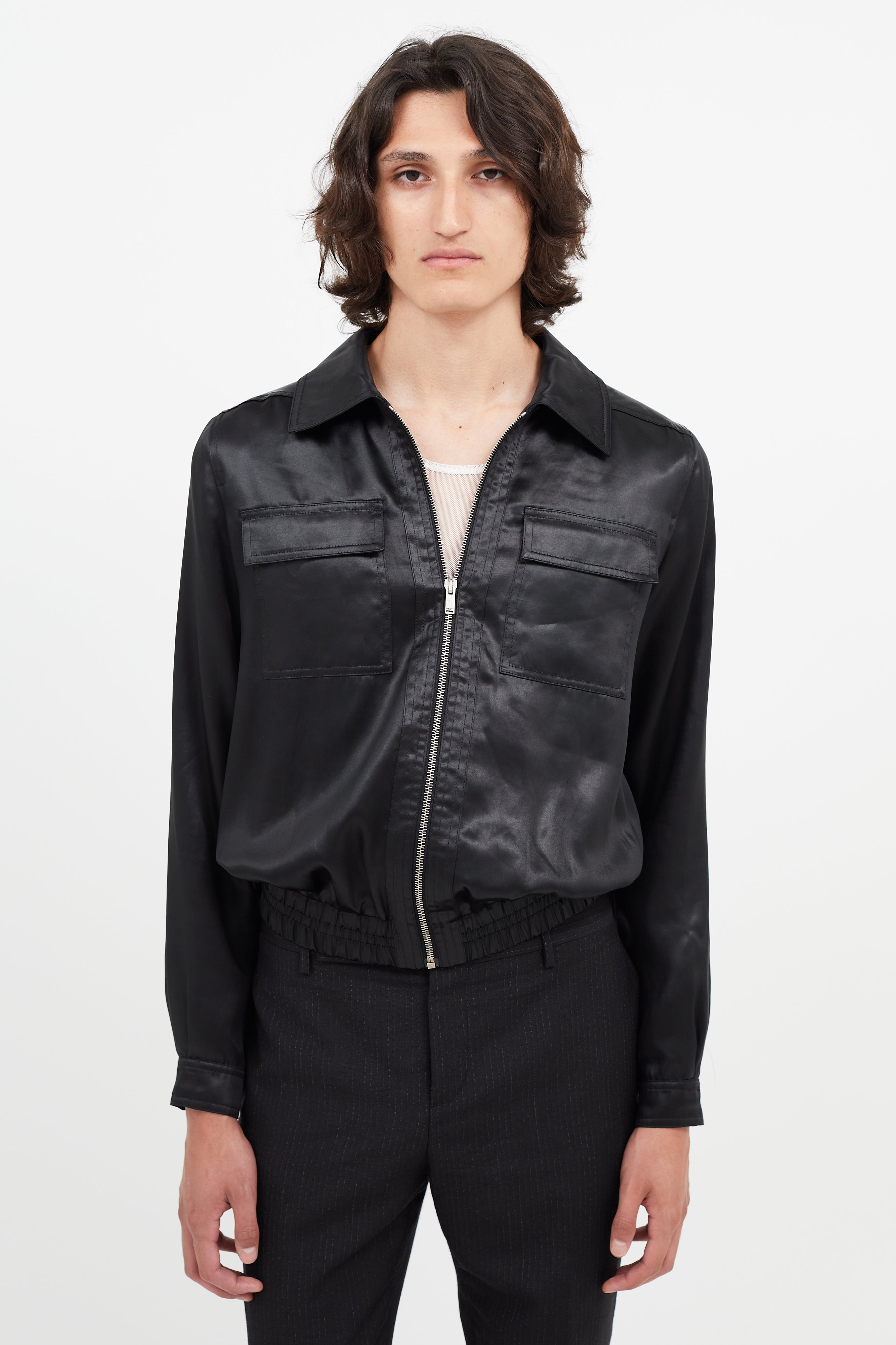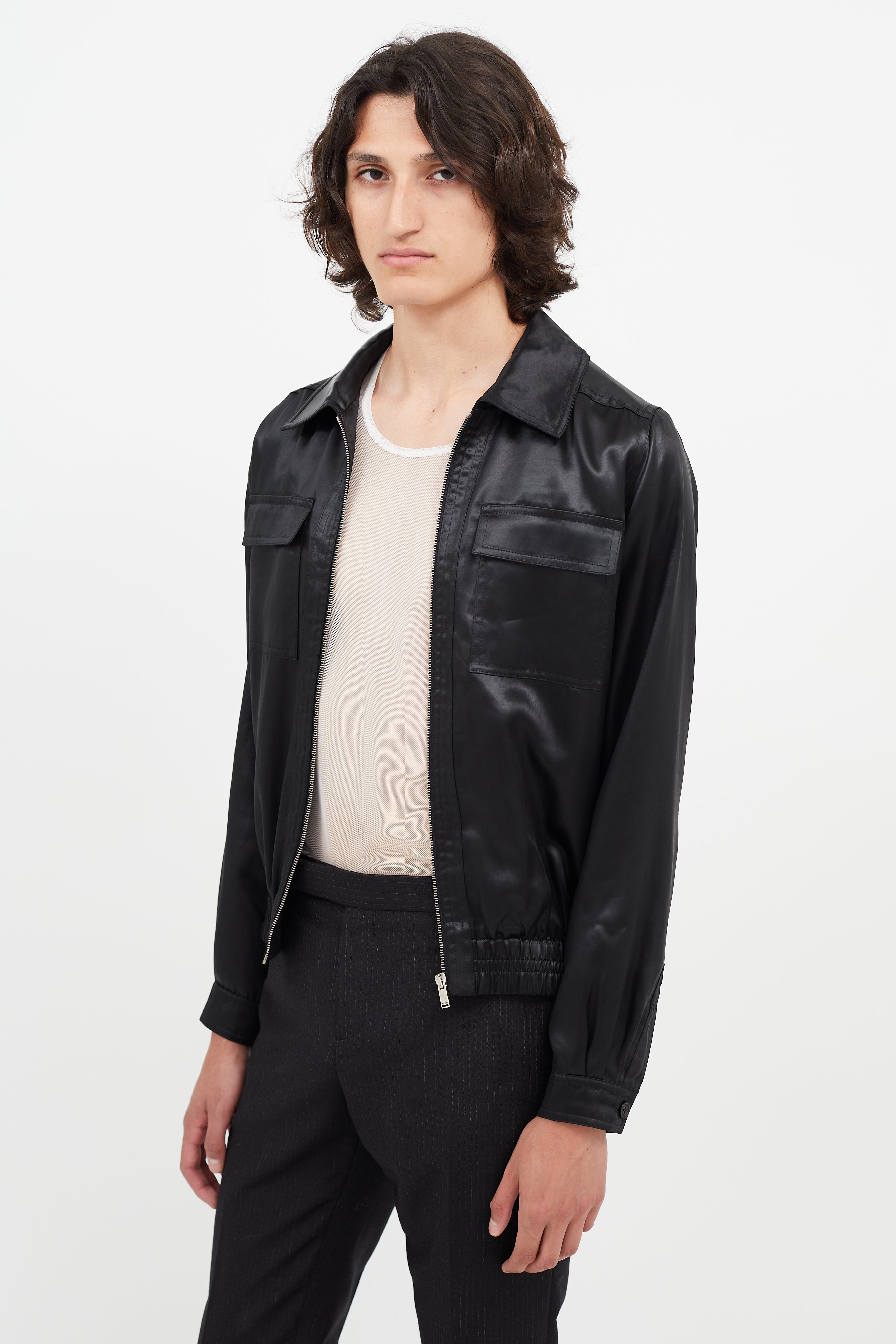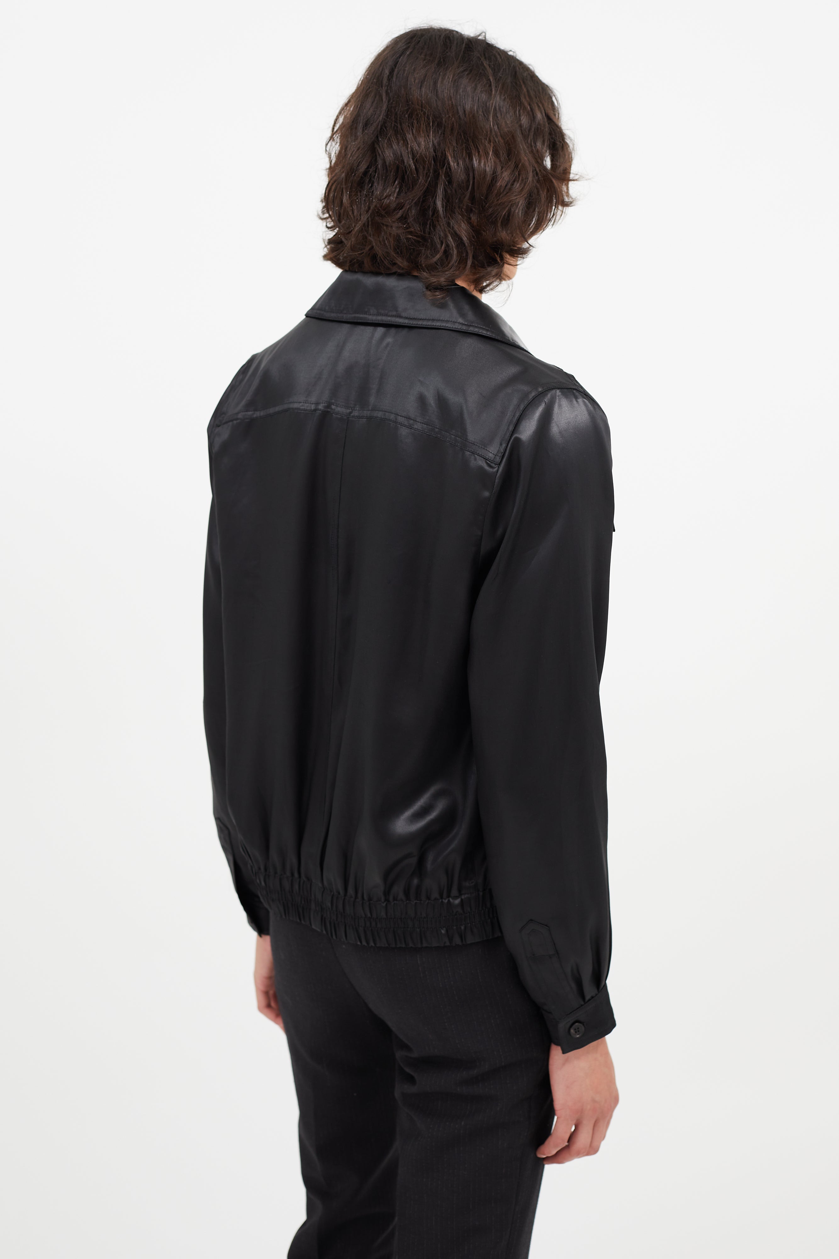 Pre-owned Saint Laurent black satin jacket featuring classic collar, zip front, elasticized hem, two flap pockets at chest, and buttoned cuffs.