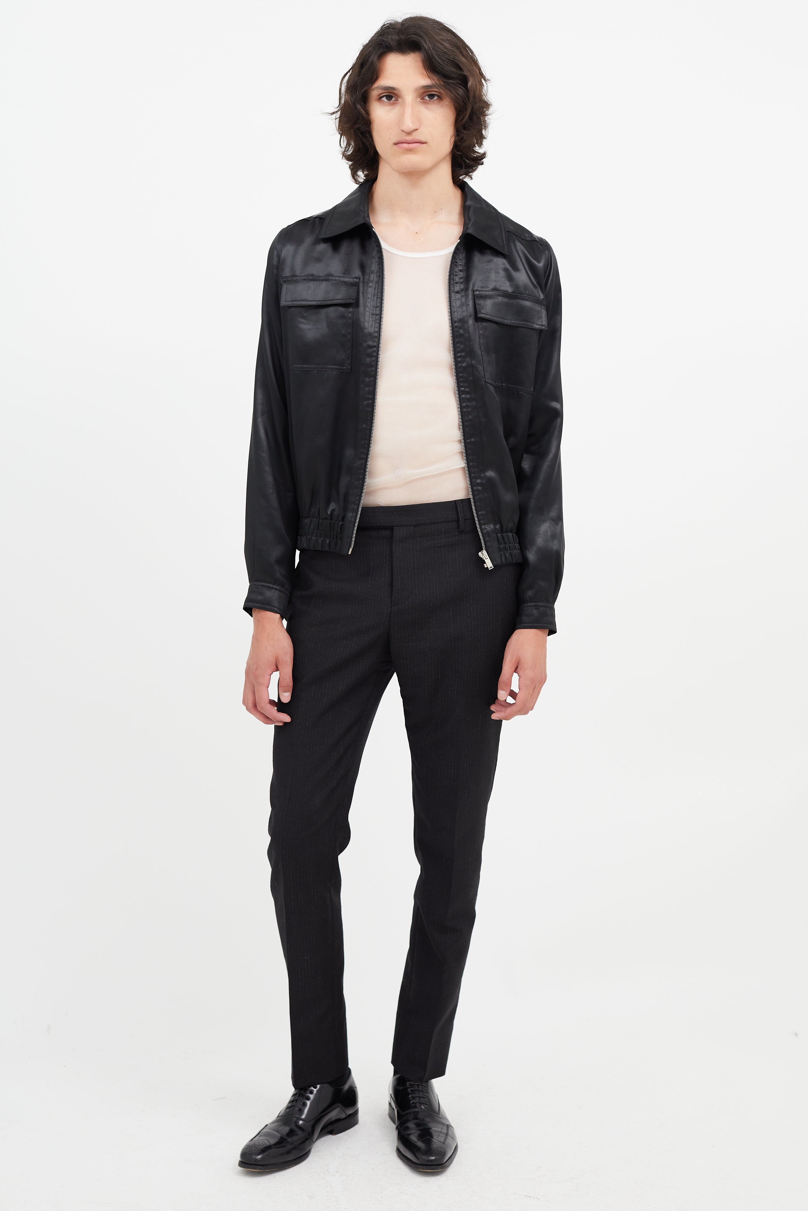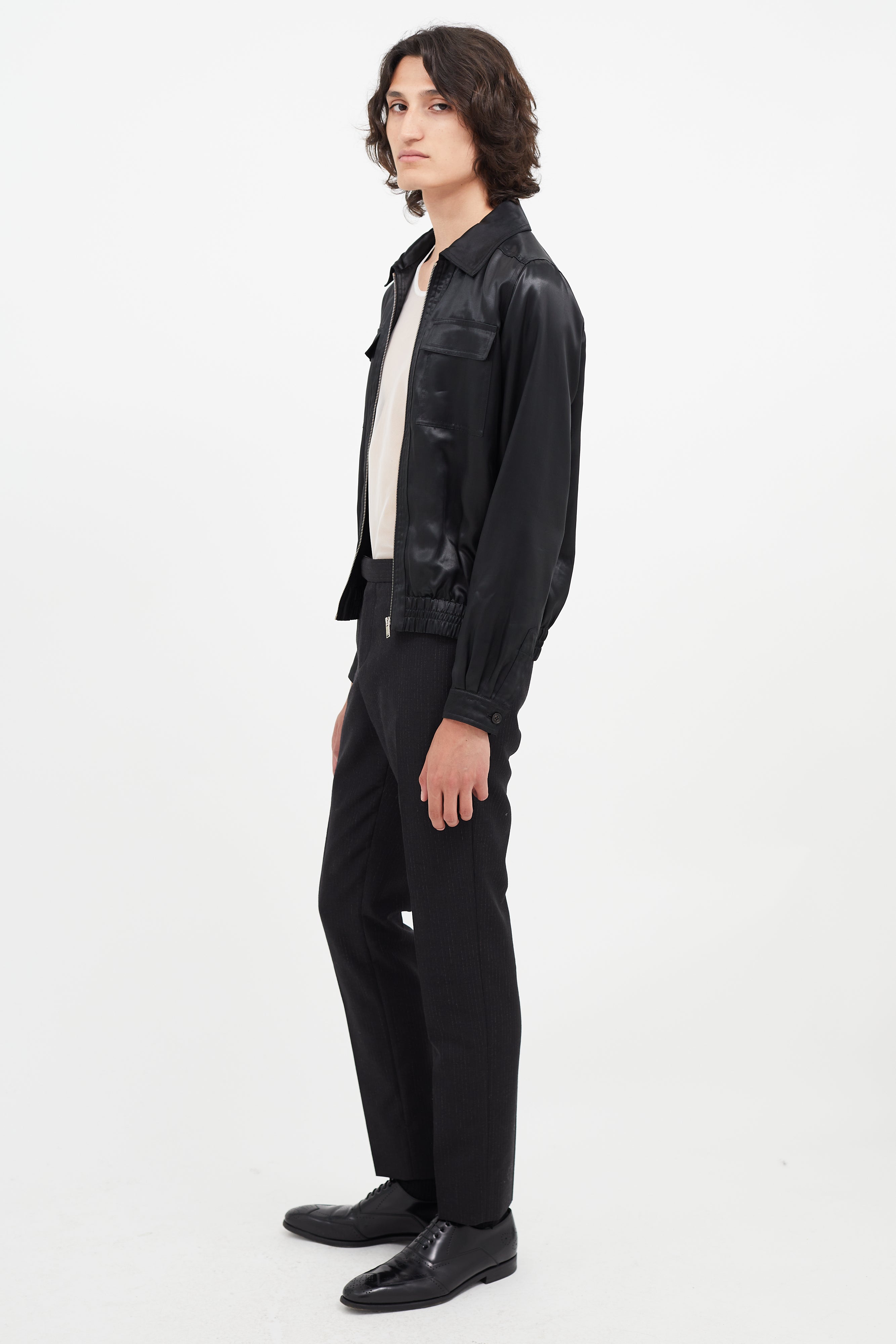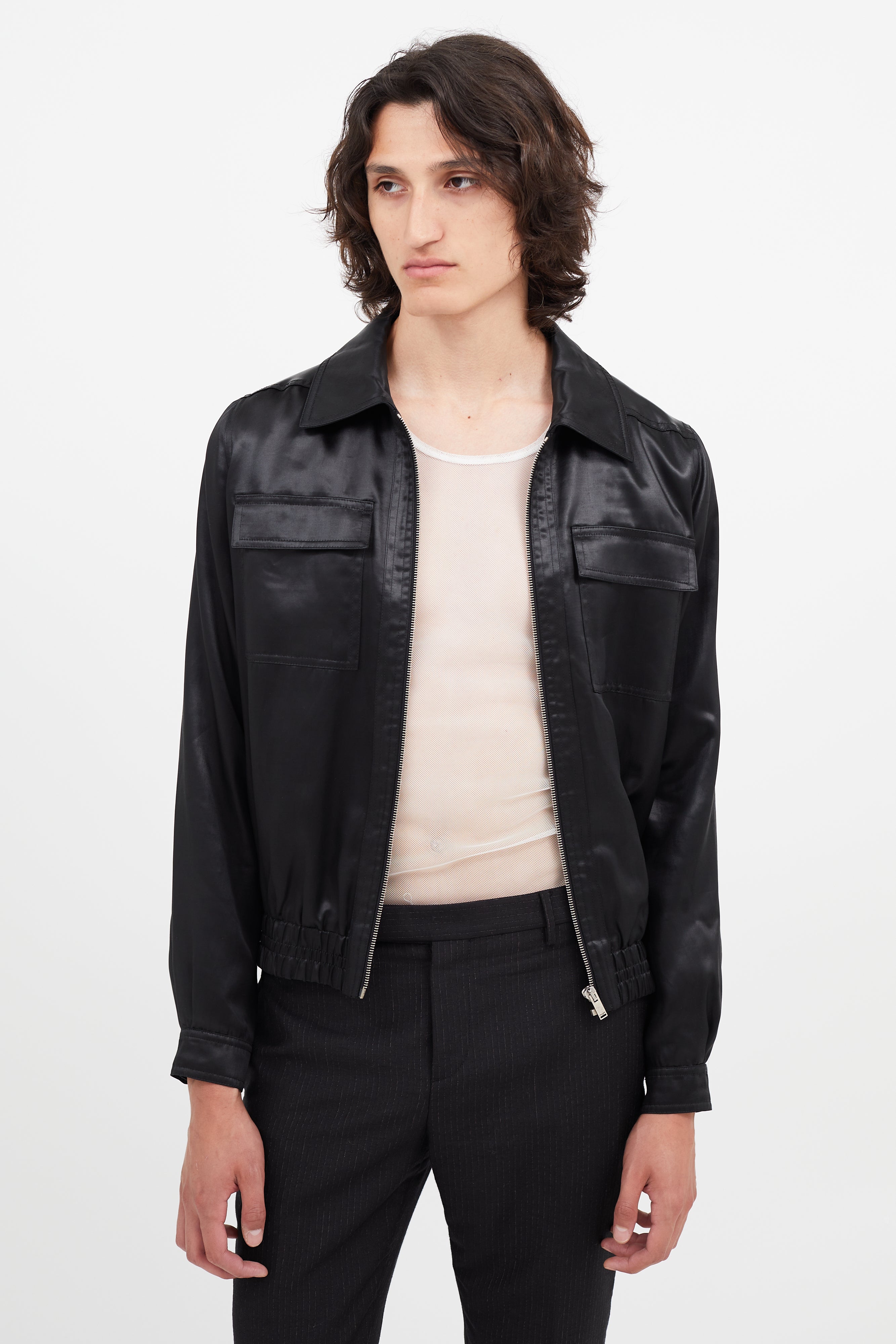 Pre-owned Saint Laurent black satin jacket featuring classic collar, zip front, elasticized hem, two flap pockets at chest, and buttoned cuffs.