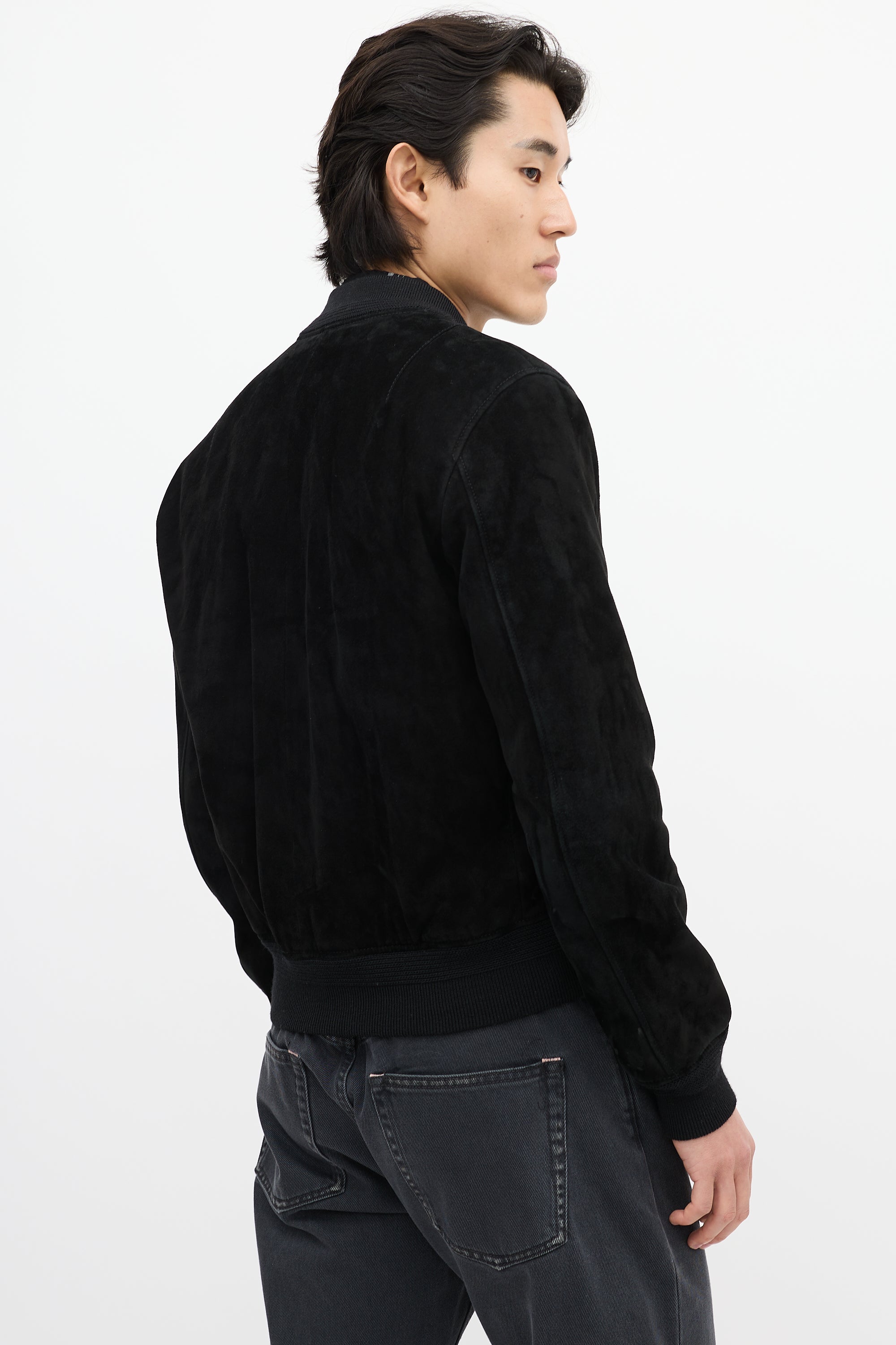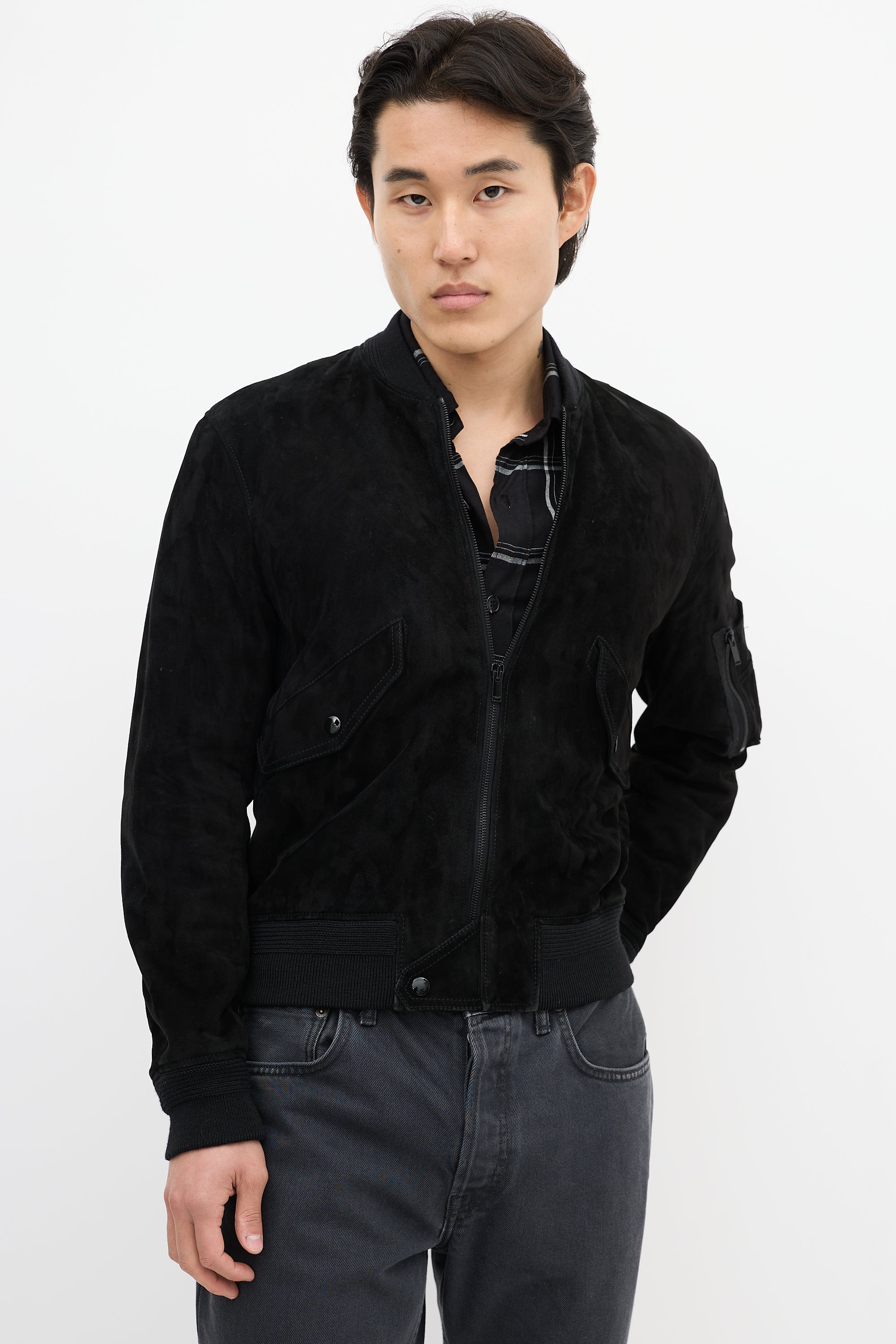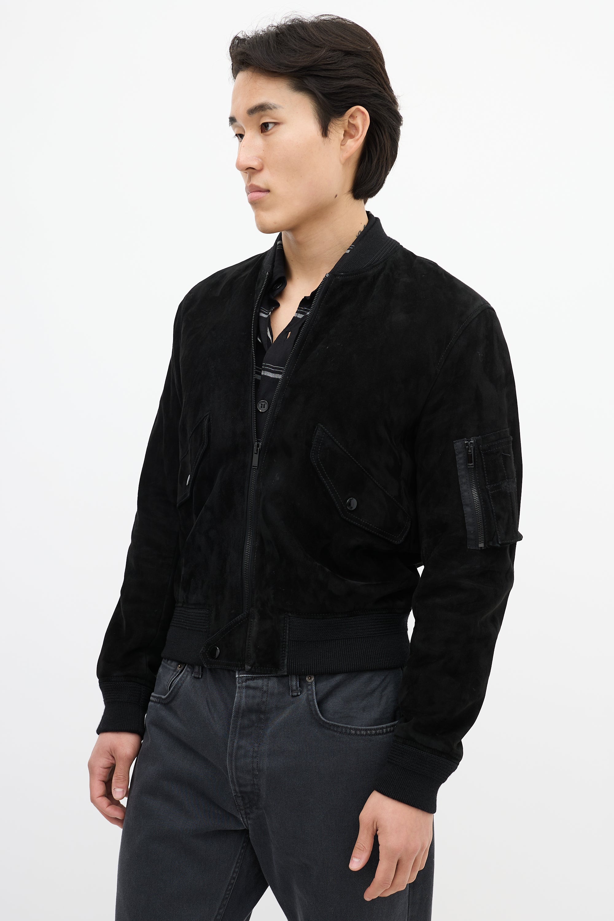 Pre-owned Saint Laurent black suede bomber jacket featuring stand collar, two flap pockets at waist, cargo zip pocket at arm, zip up front, and ribbed collar, cuffs and hem. Lined.