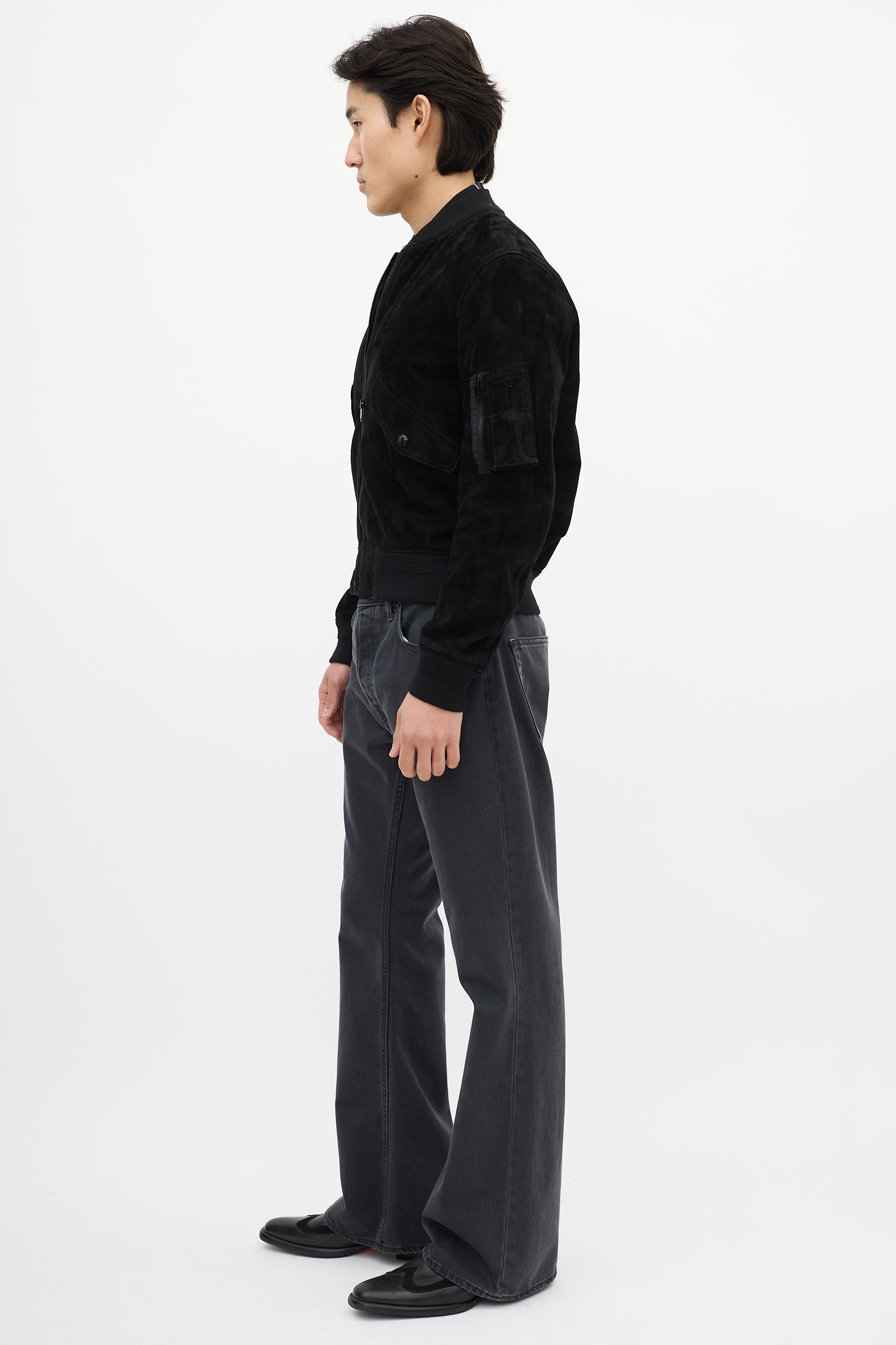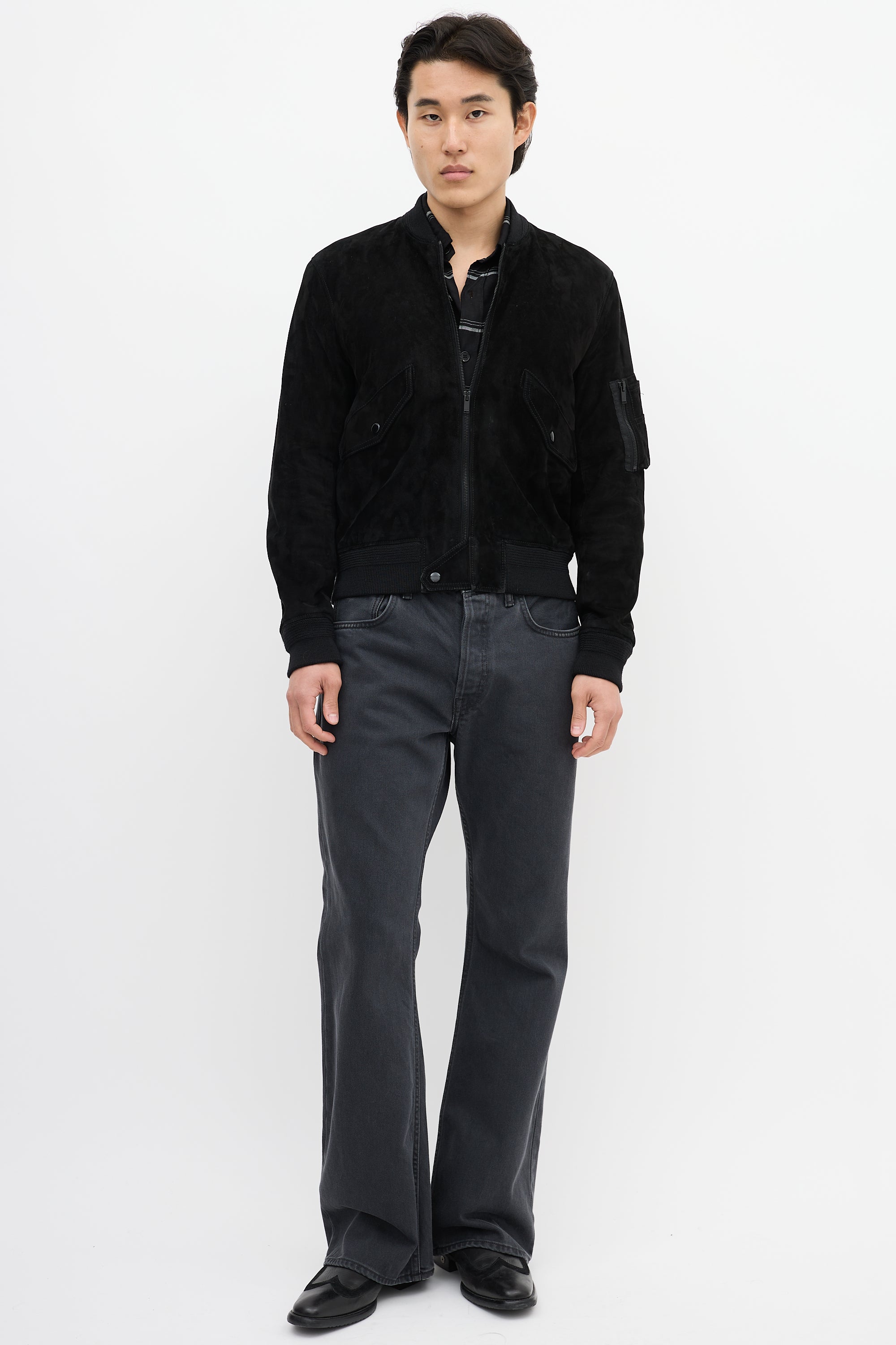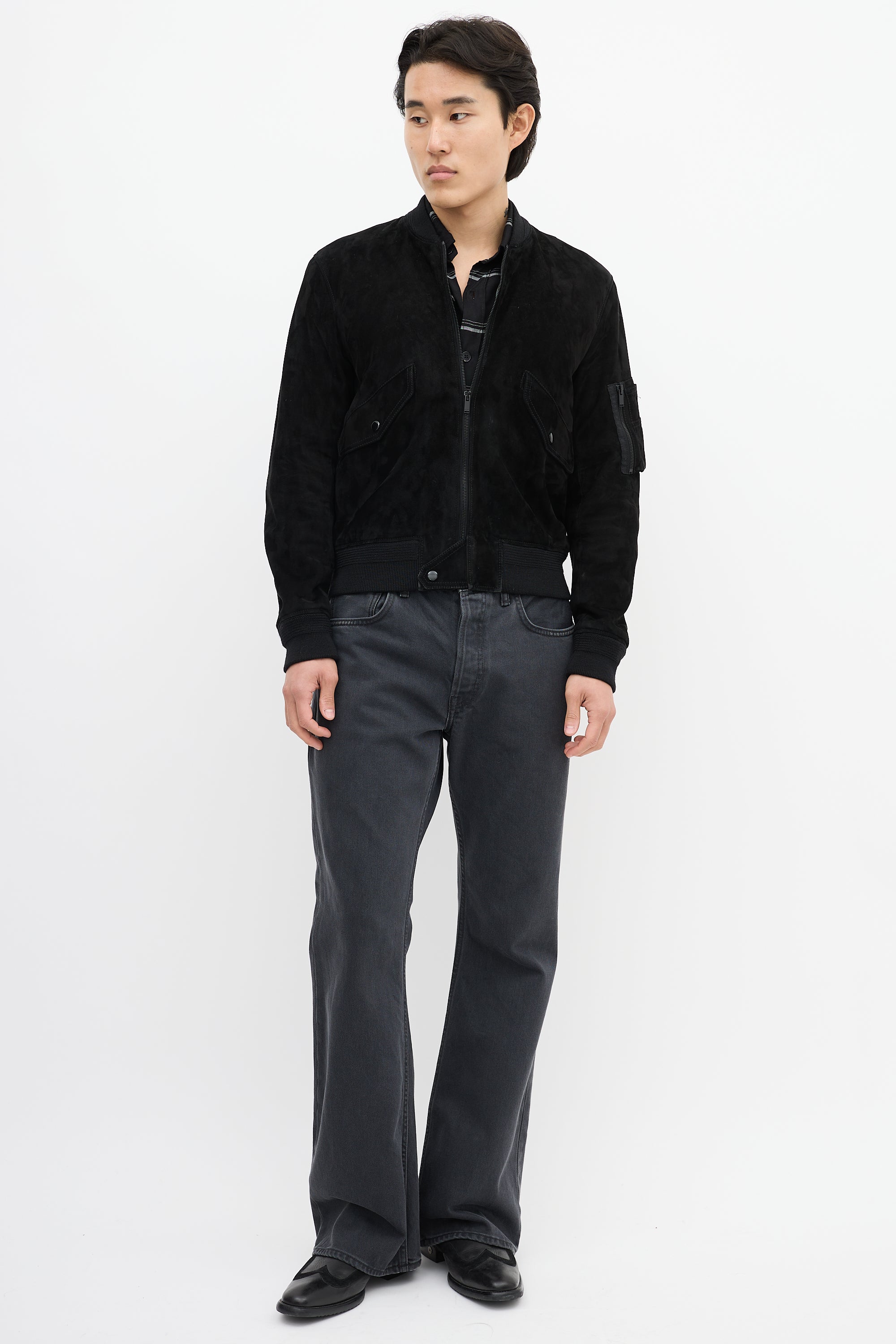 Pre-owned Saint Laurent black suede bomber jacket featuring stand collar, two flap pockets at waist, cargo zip pocket at arm, zip up front, and ribbed collar, cuffs and hem. Lined.