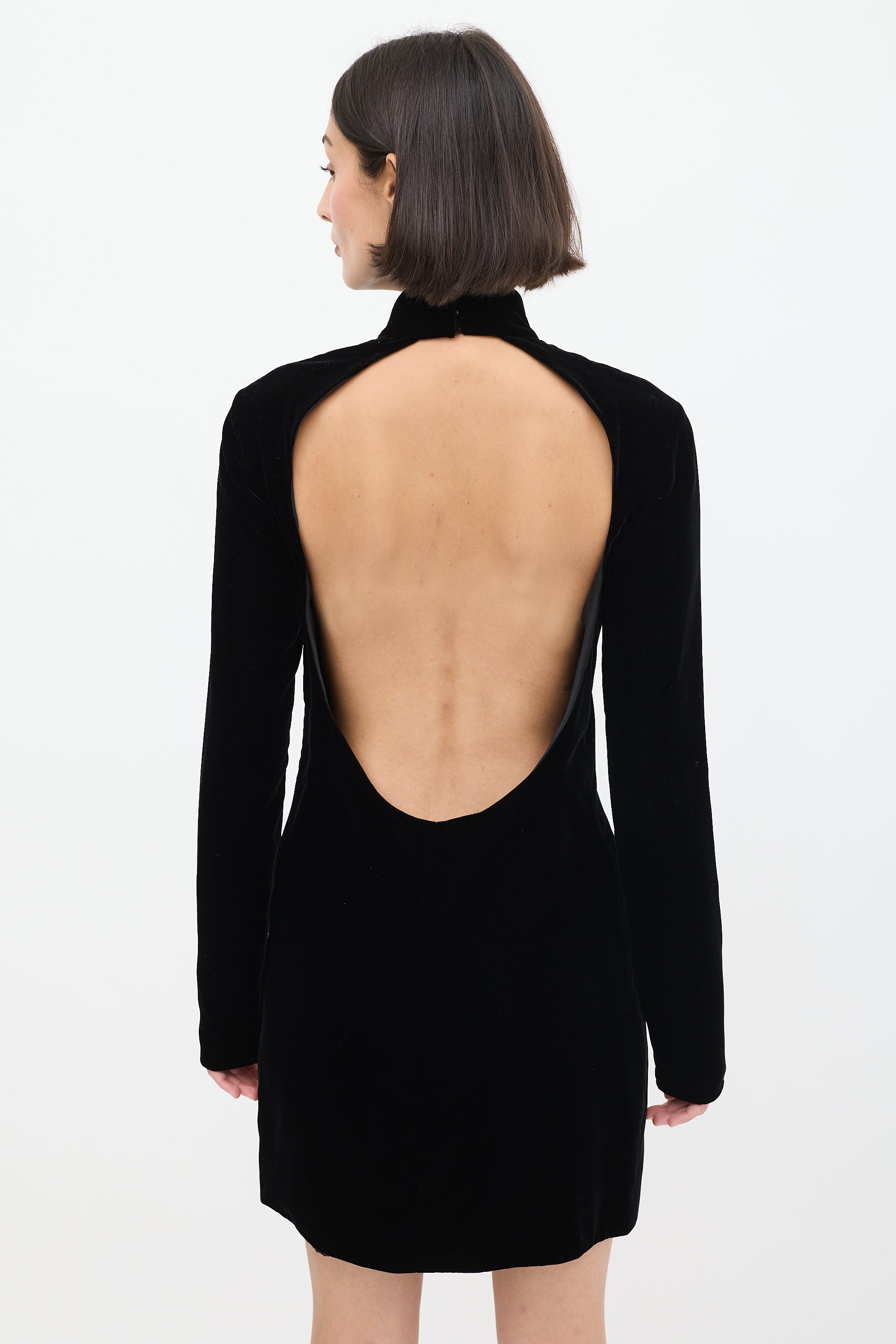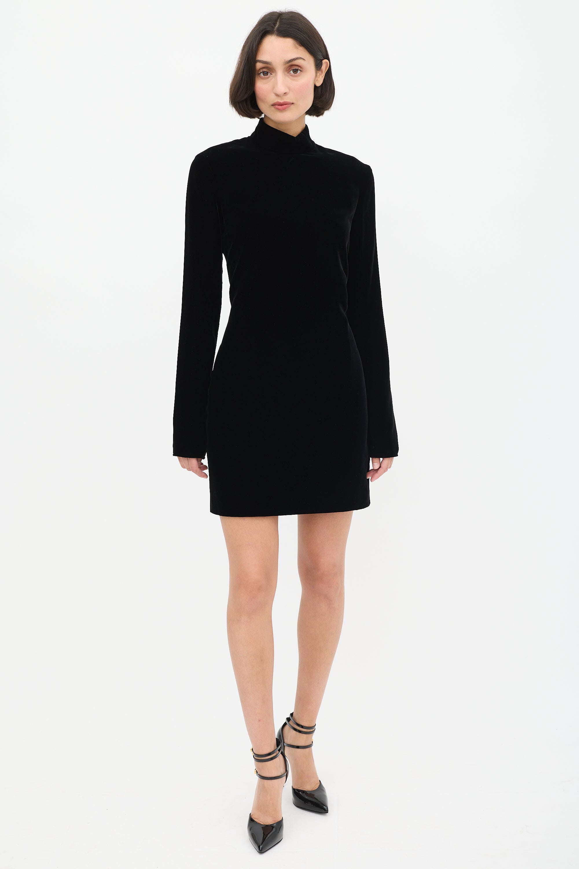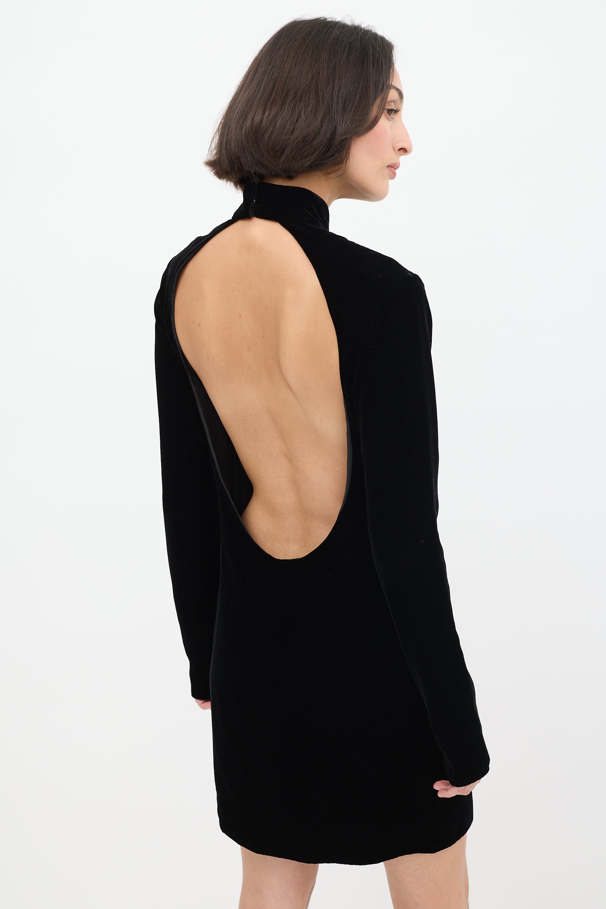Pre-owned Saint Laurent black velvet midi dress featuring a stand collar with back button fastenings, open back, long sleeves, and concealed side zip. Lined.