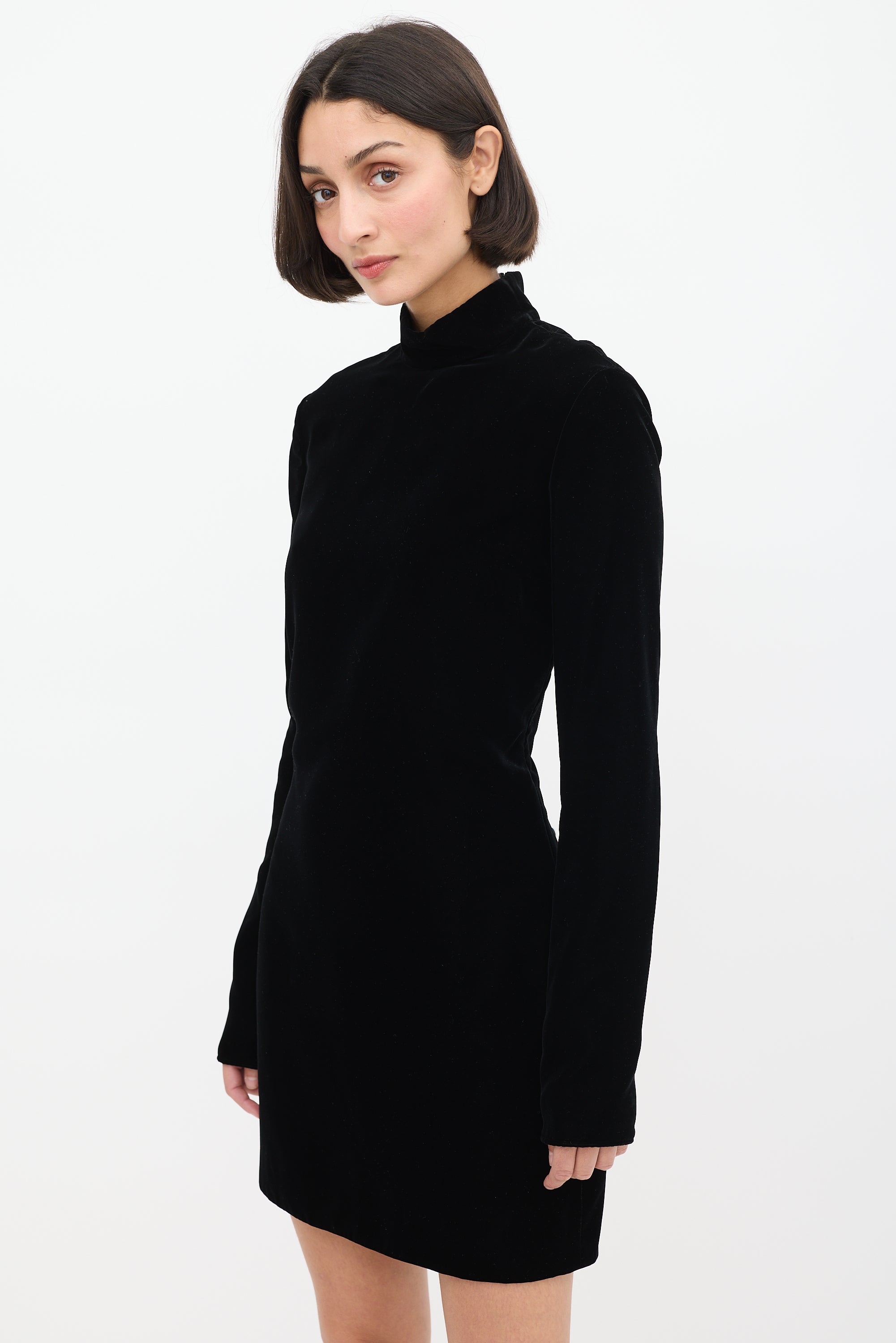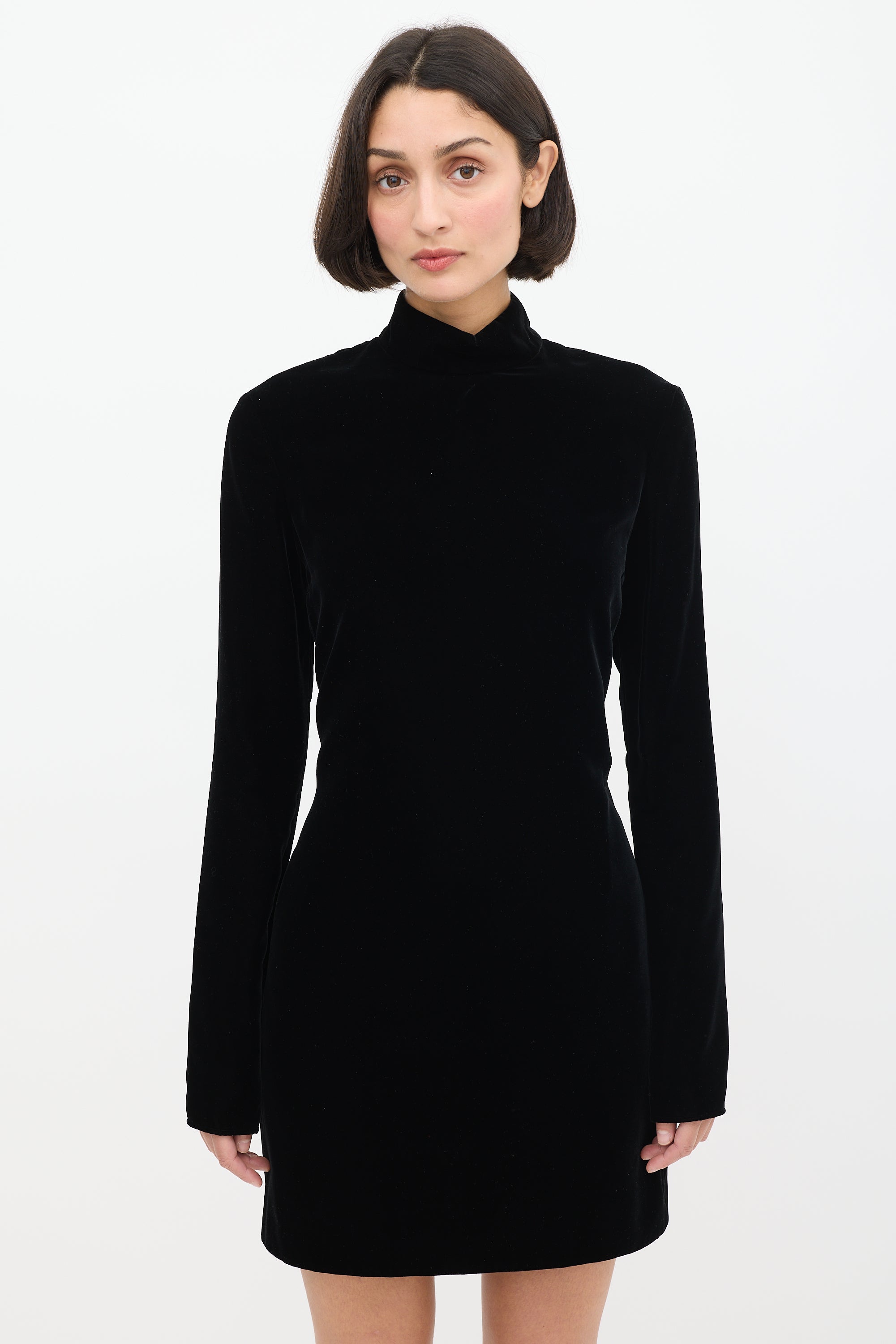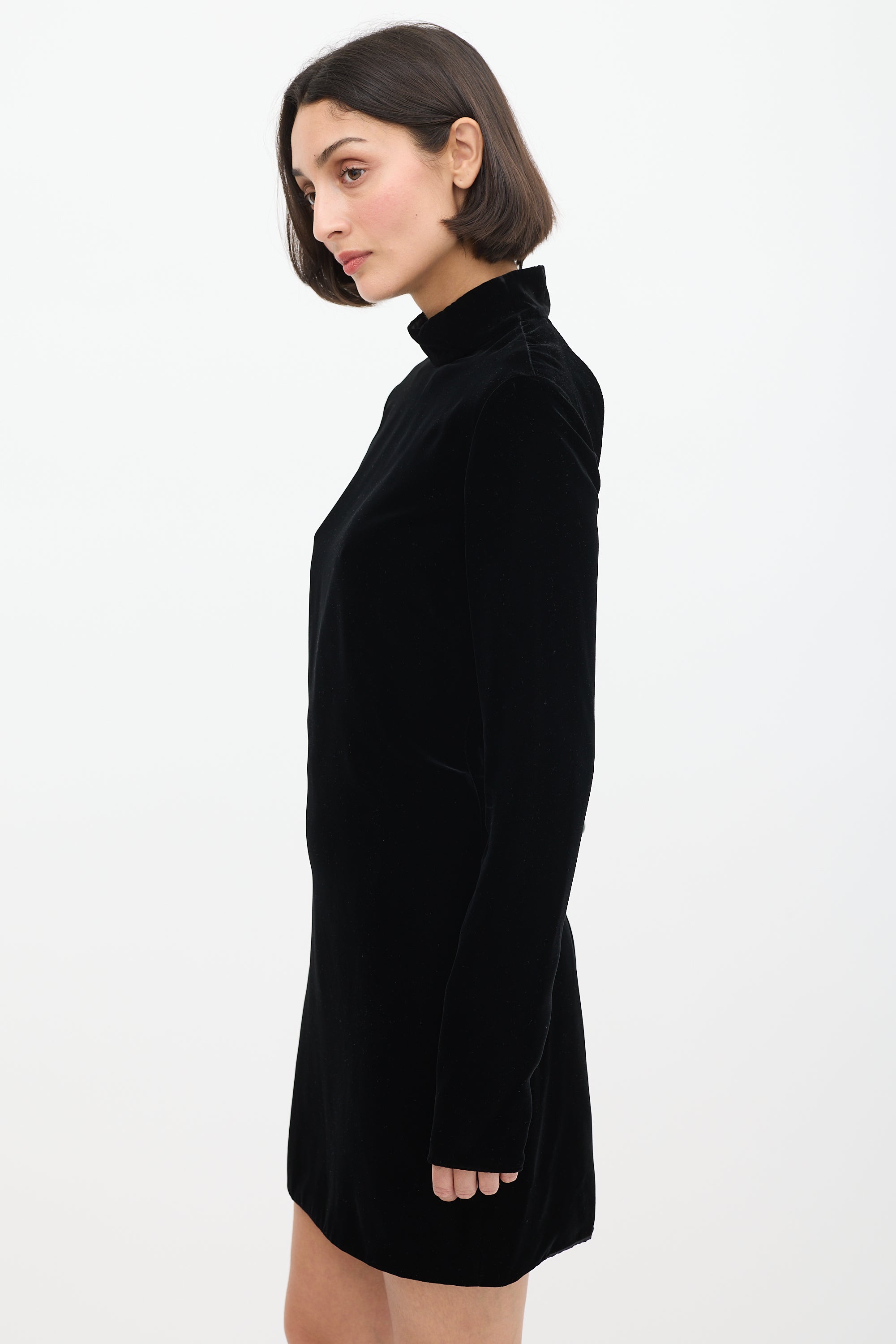 Pre-owned Saint Laurent black velvet midi dress featuring a stand collar with back button fastenings, open back, long sleeves, and concealed side zip. Lined.
