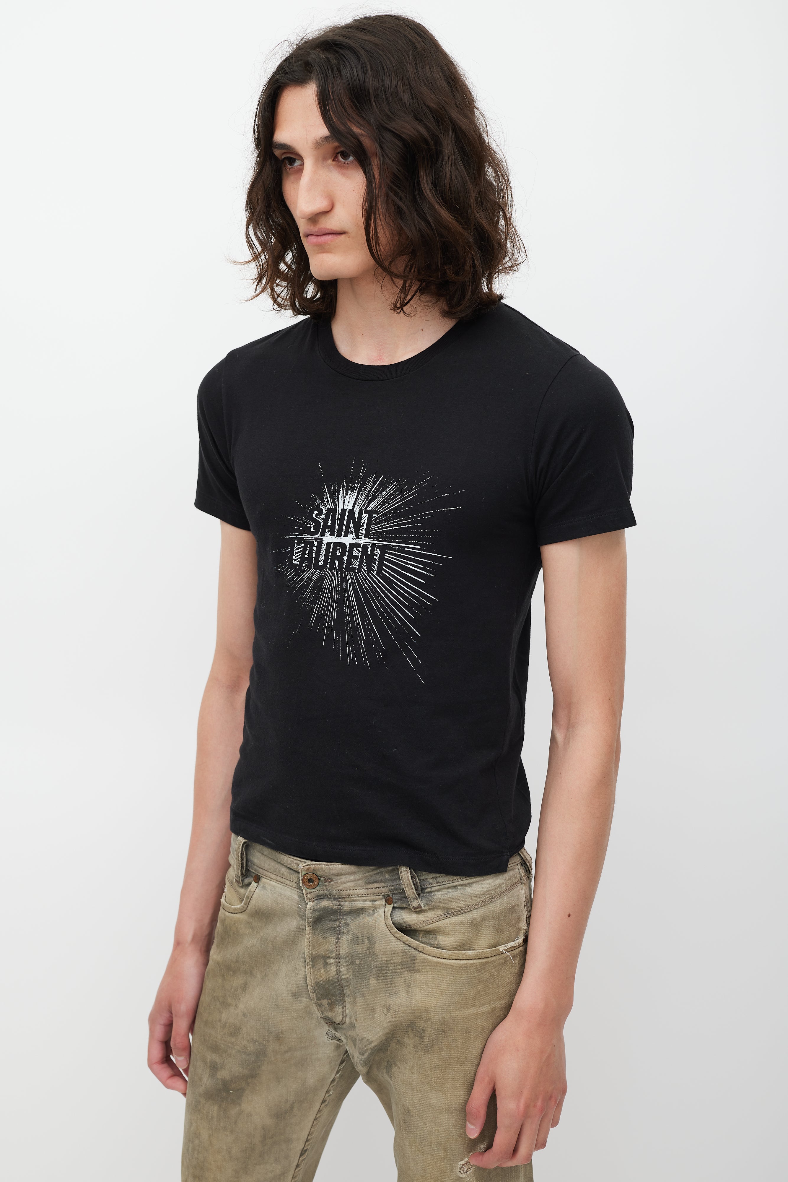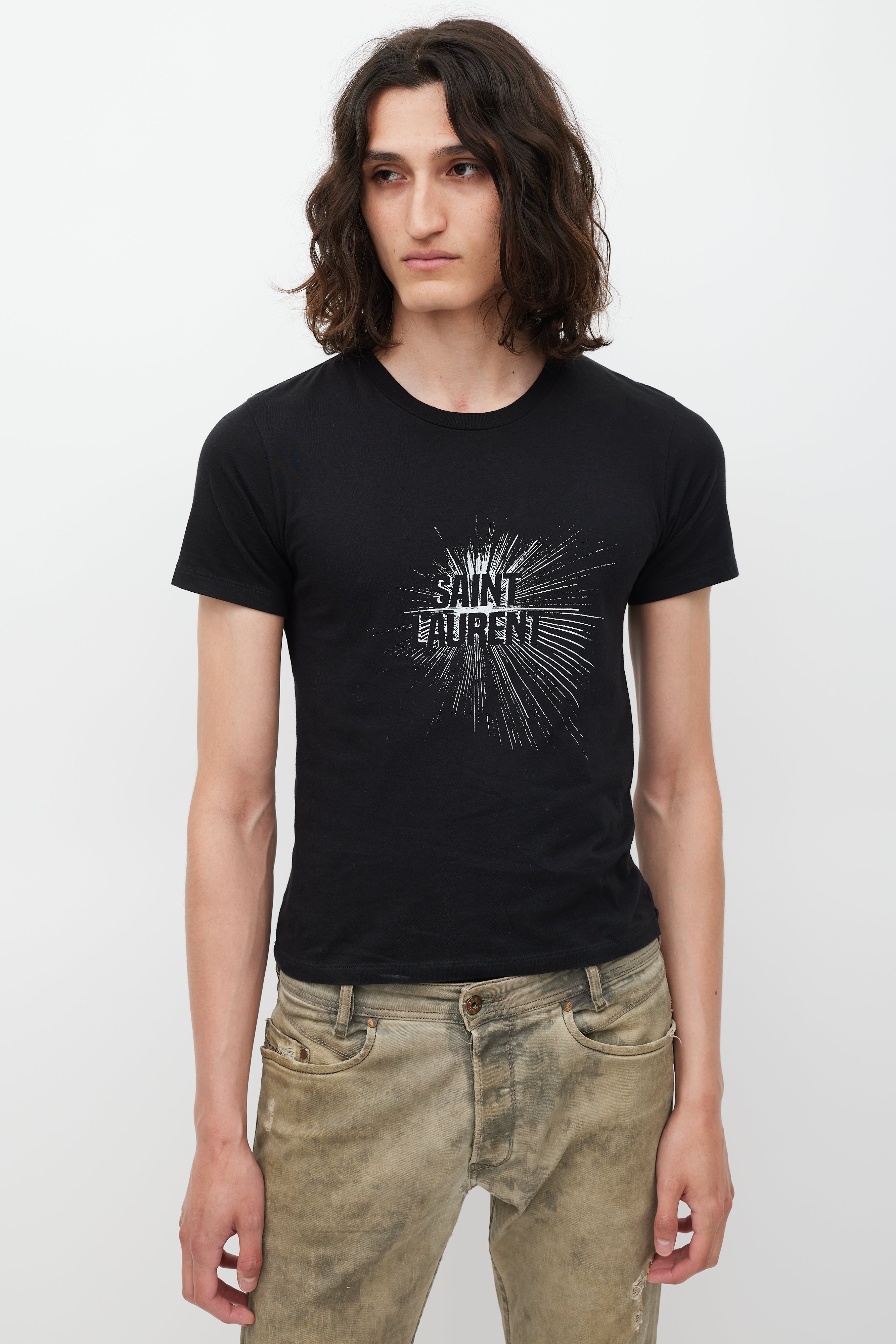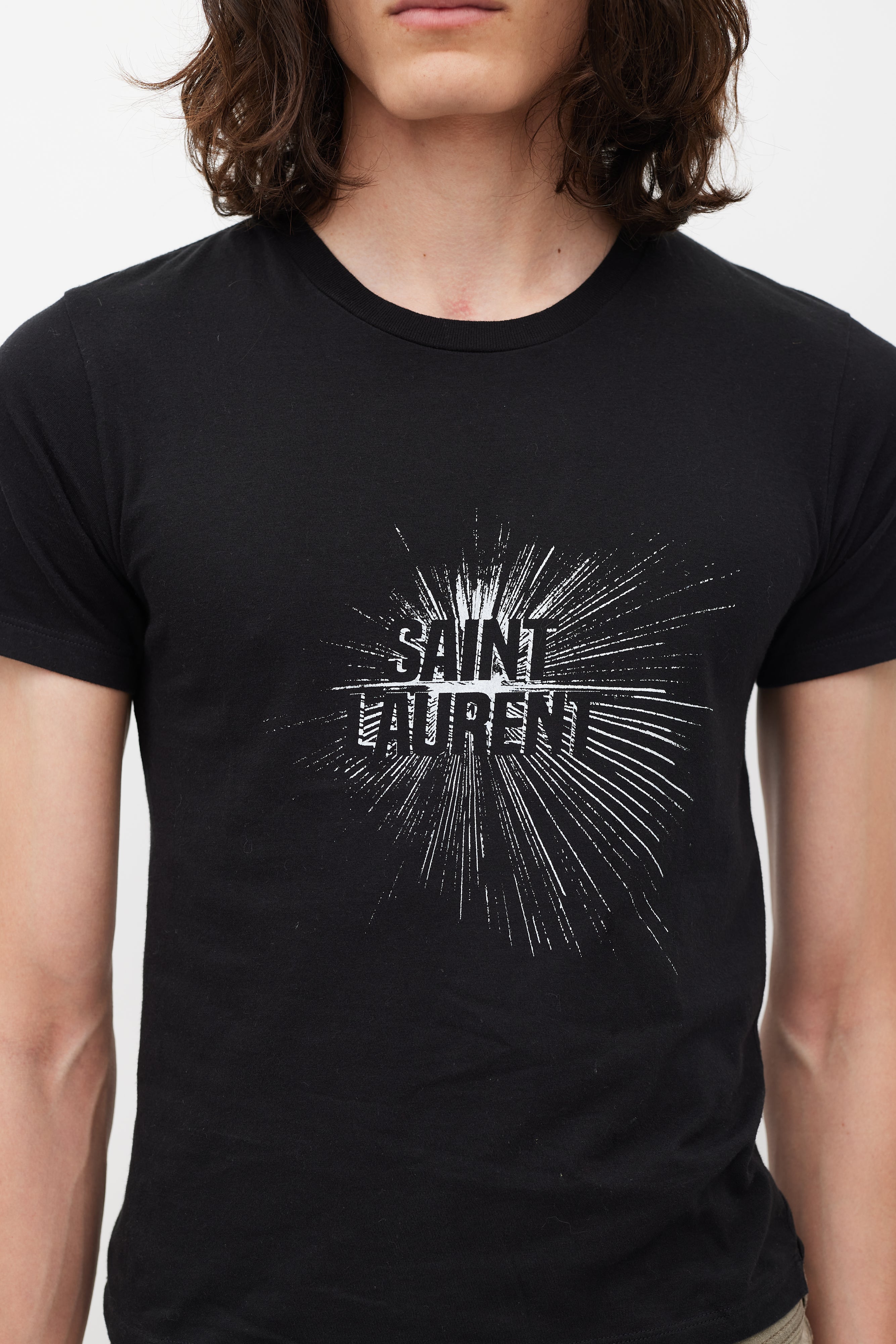 Pre-owned Saint Laurent black T-shirt featuring a white logo print at chest, round neckline, and short sleeves.