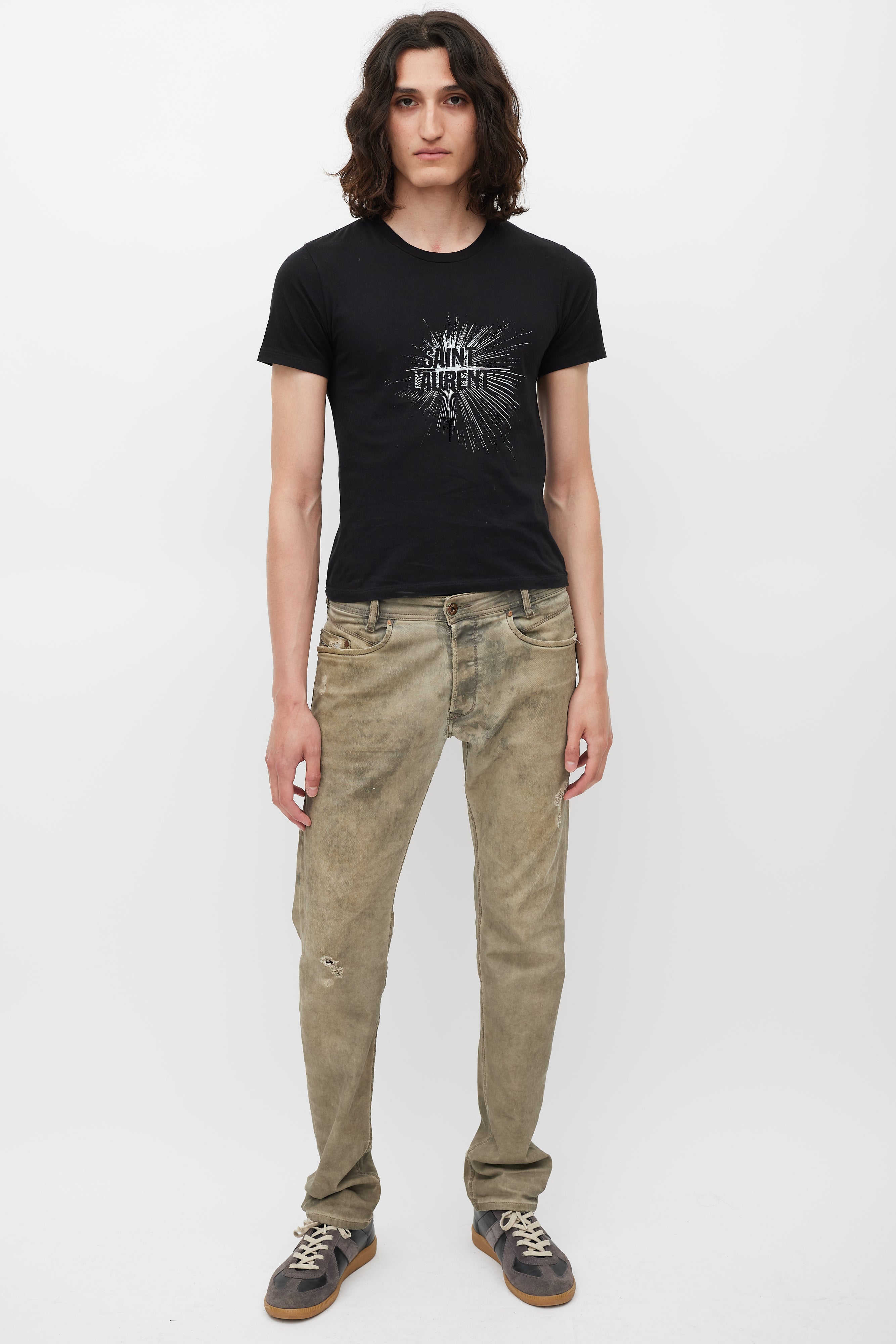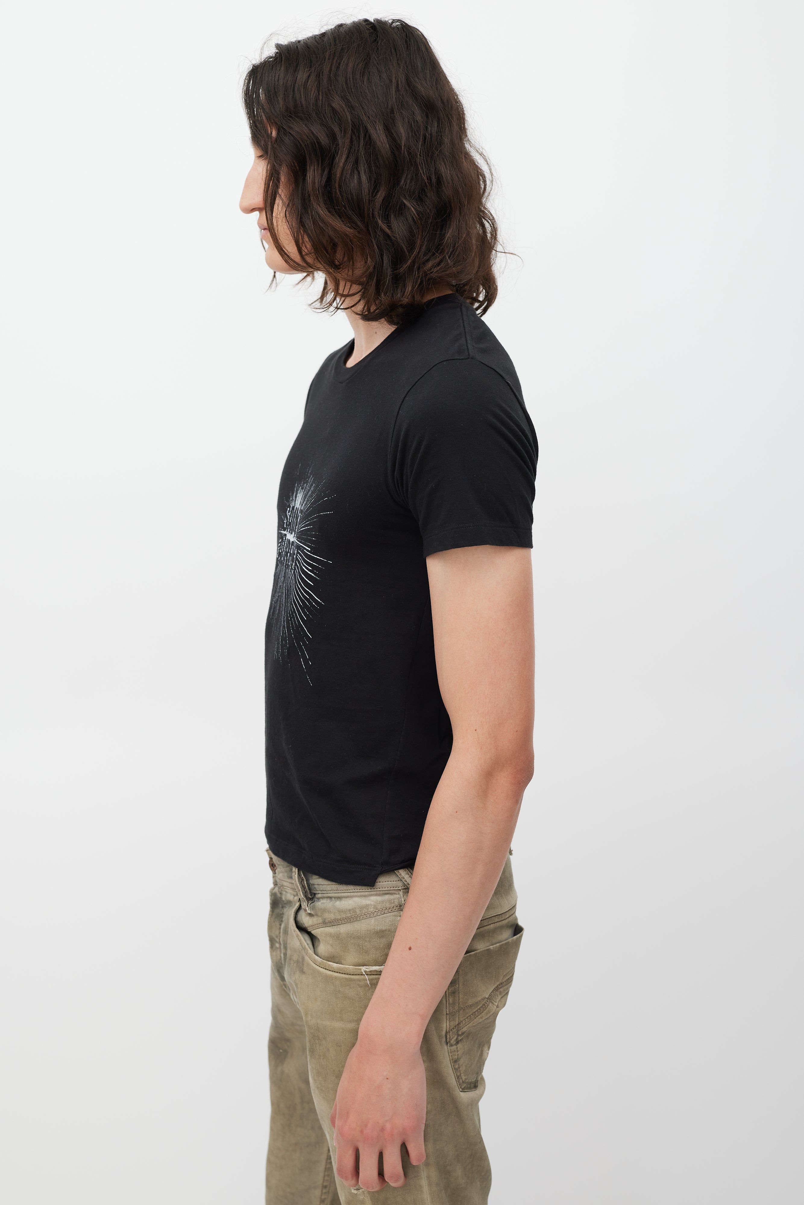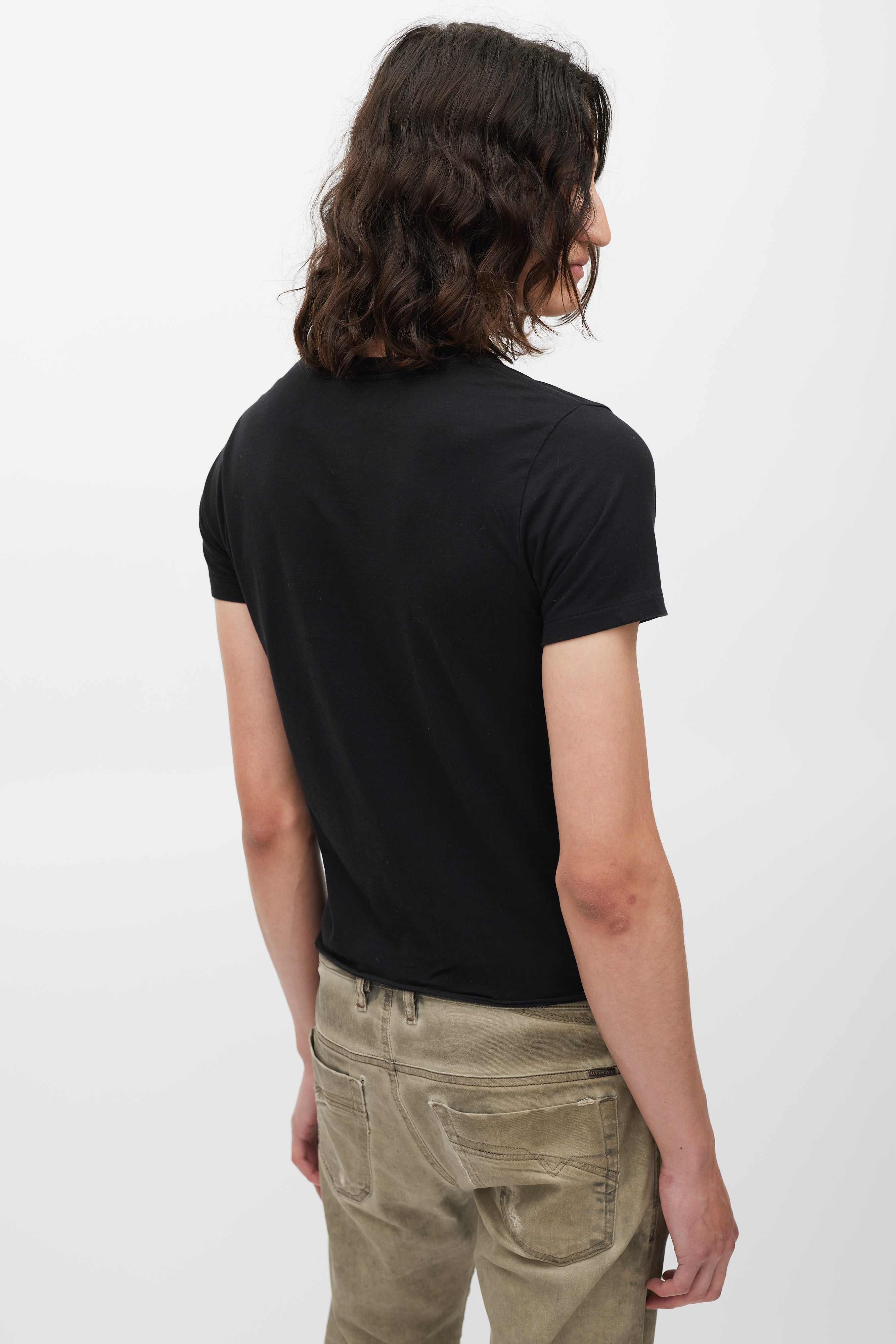 Pre-owned Saint Laurent black T-shirt featuring a white logo print at chest, round neckline, and short sleeves.