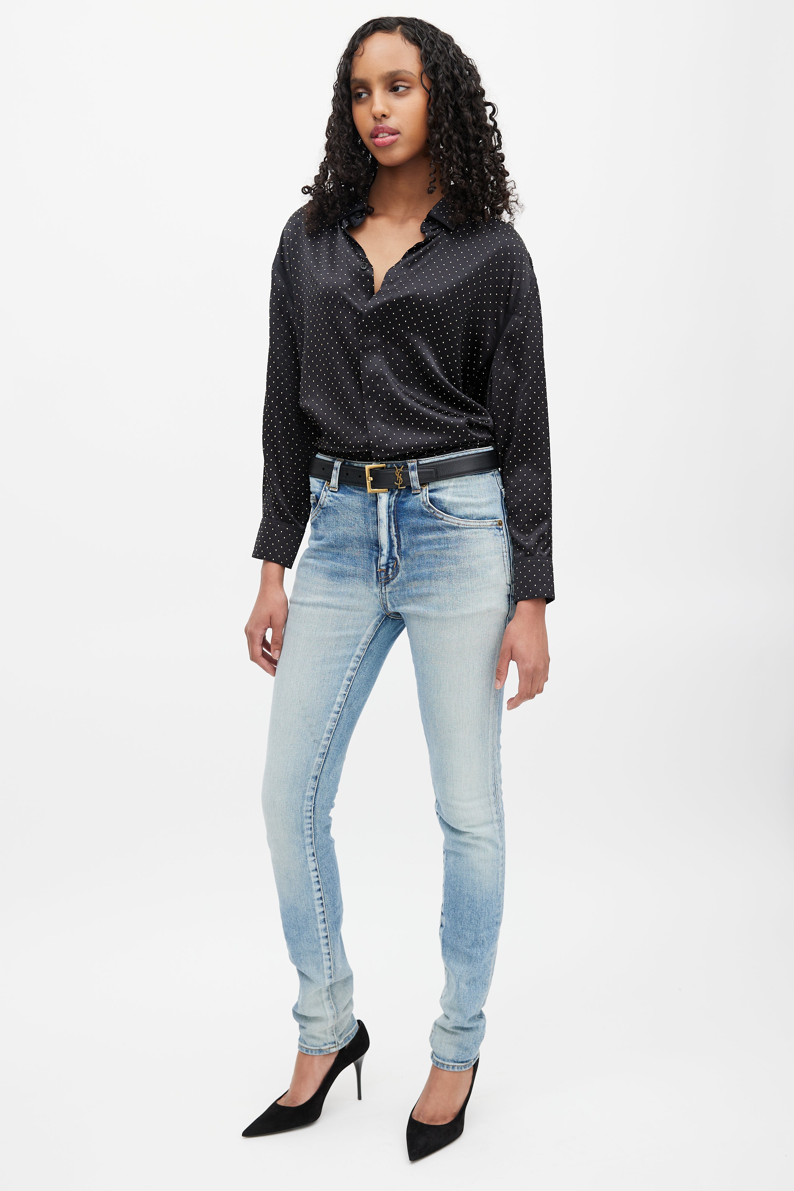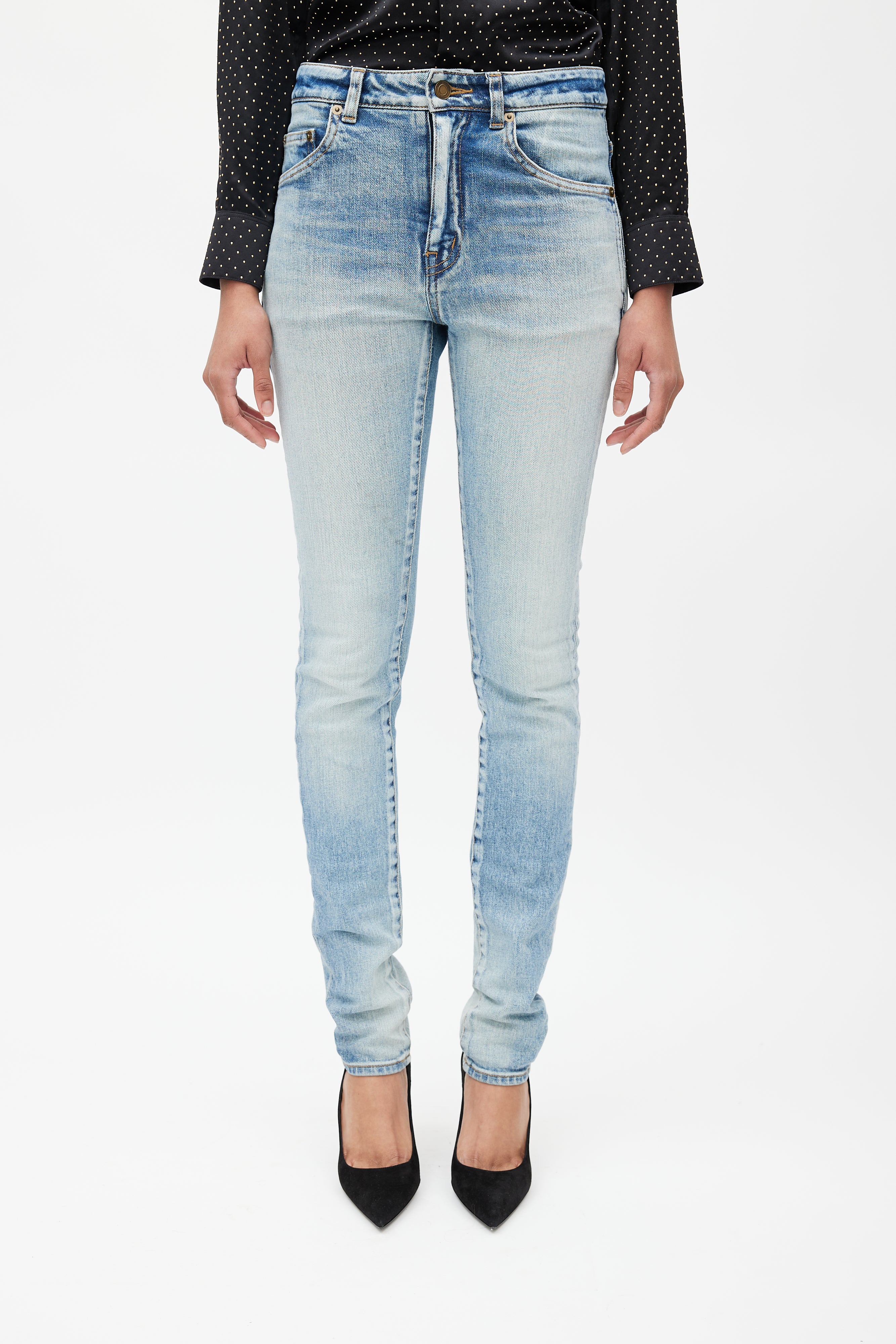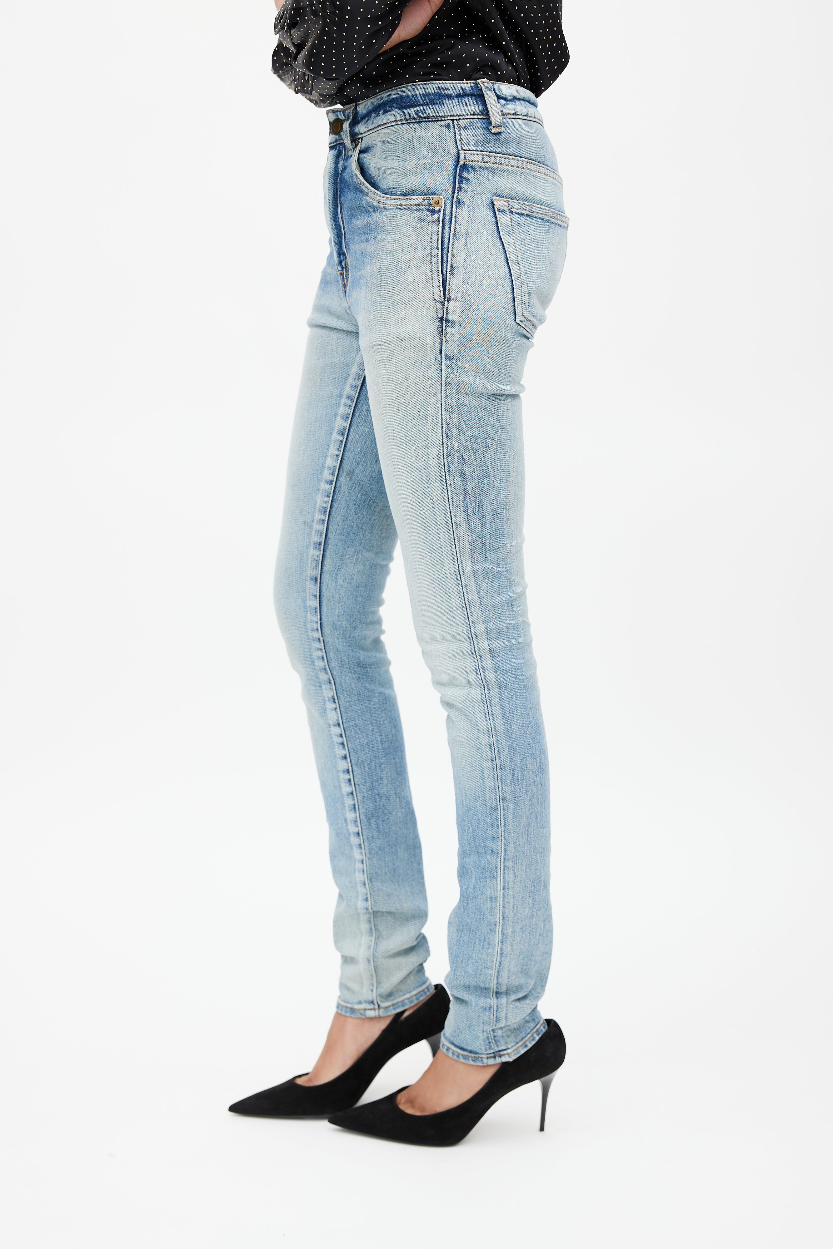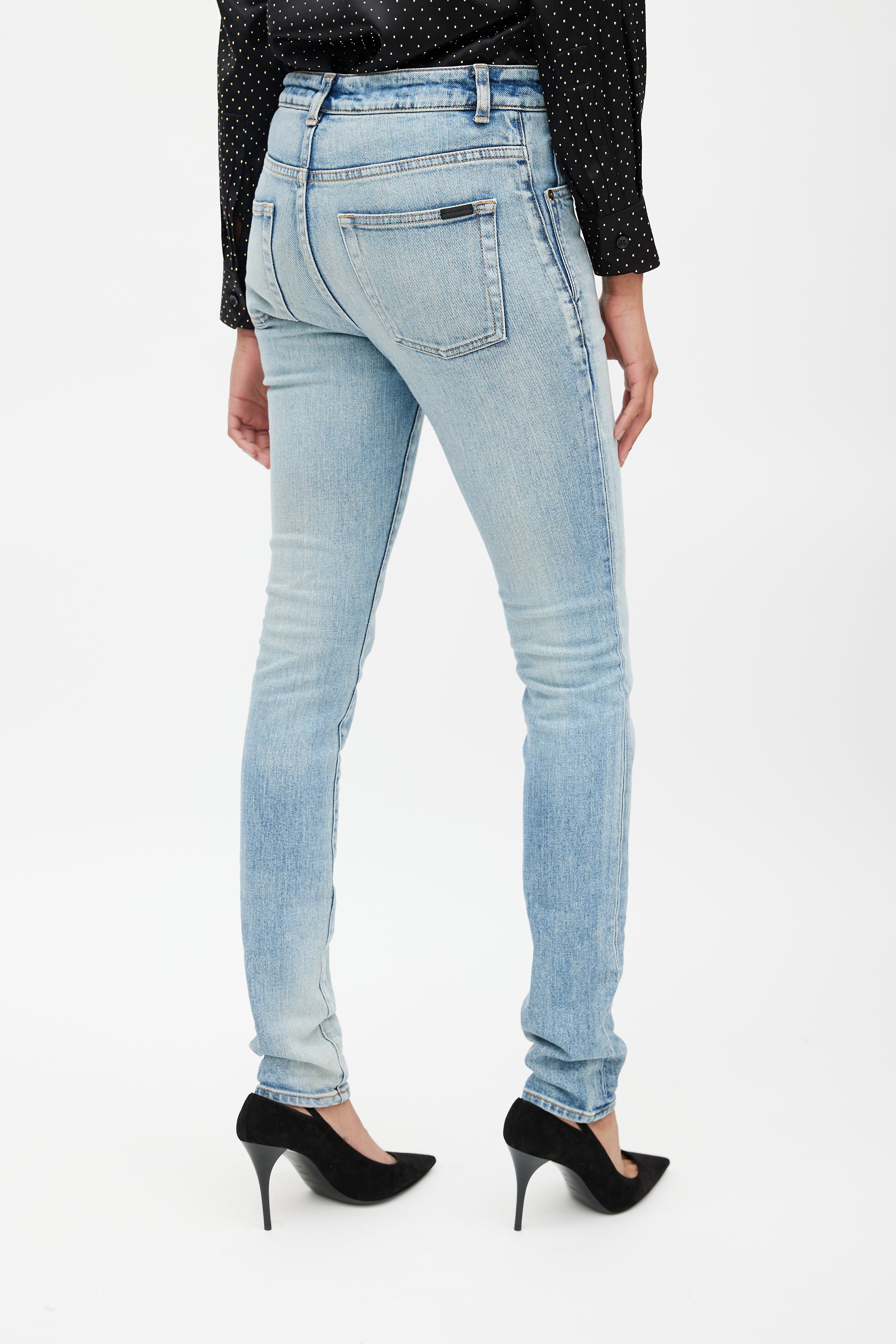 Pre-owned Saint Laurent blue D05 denim jeans featuring five pocket styling, skinny leg, and zip fly with button closure.