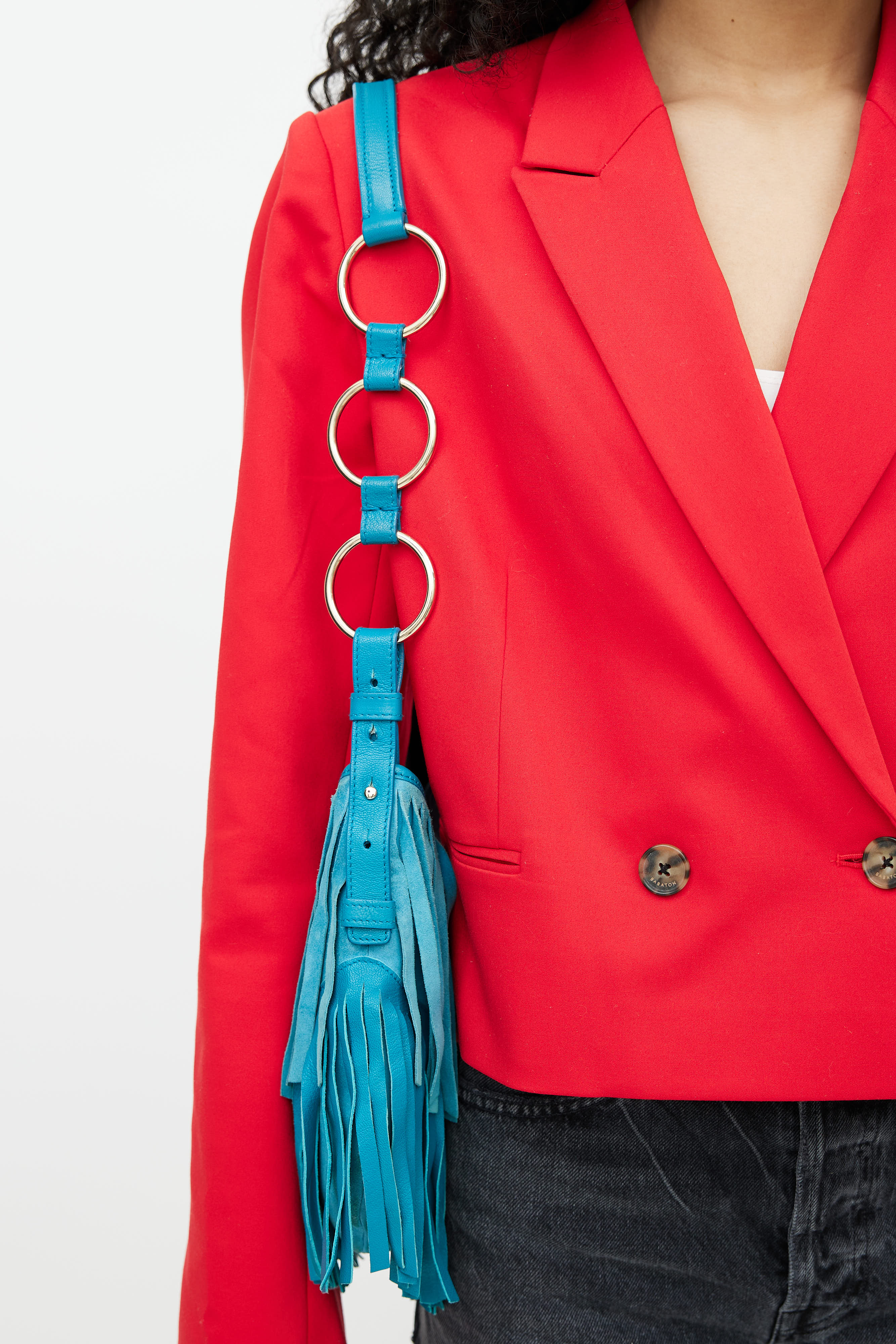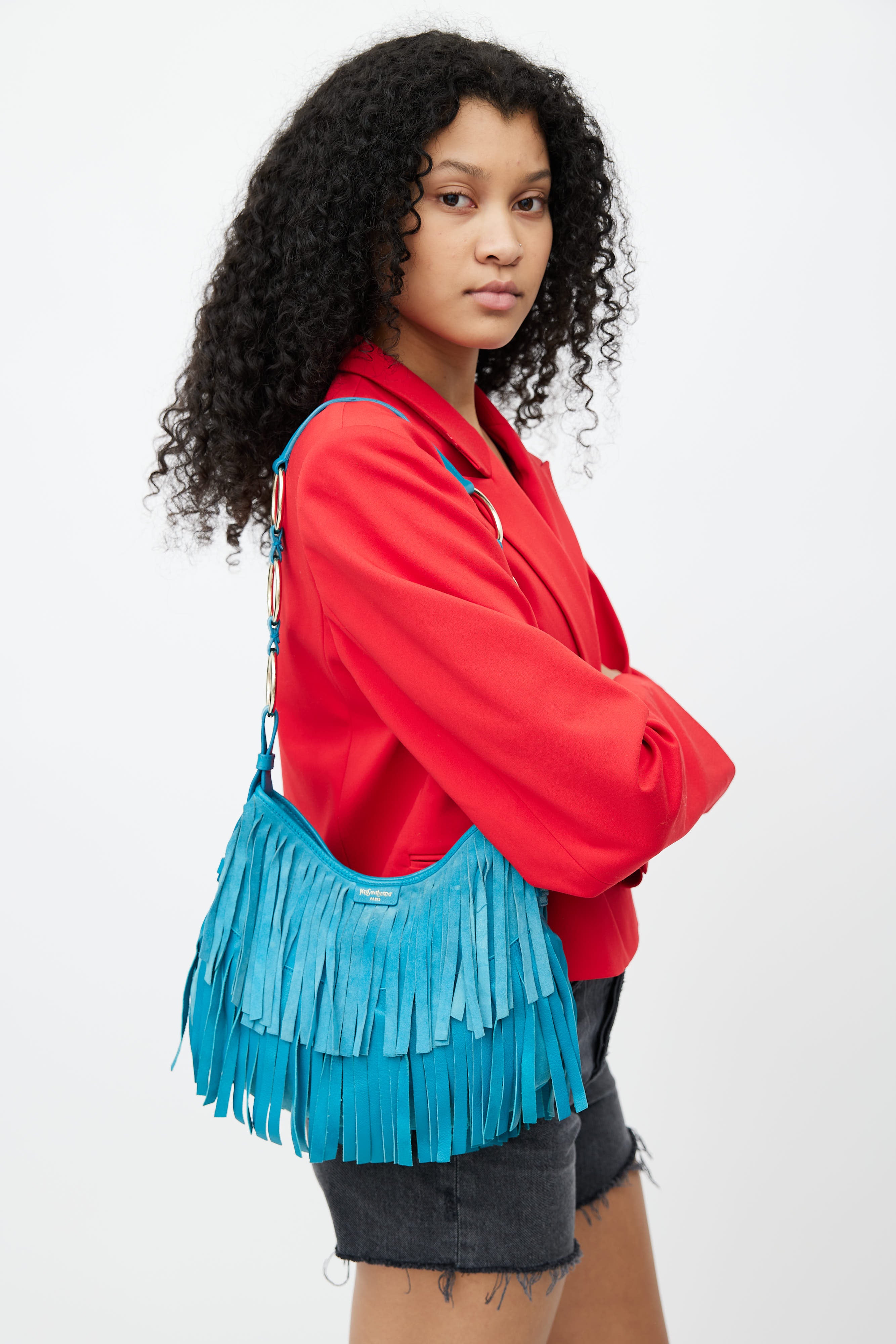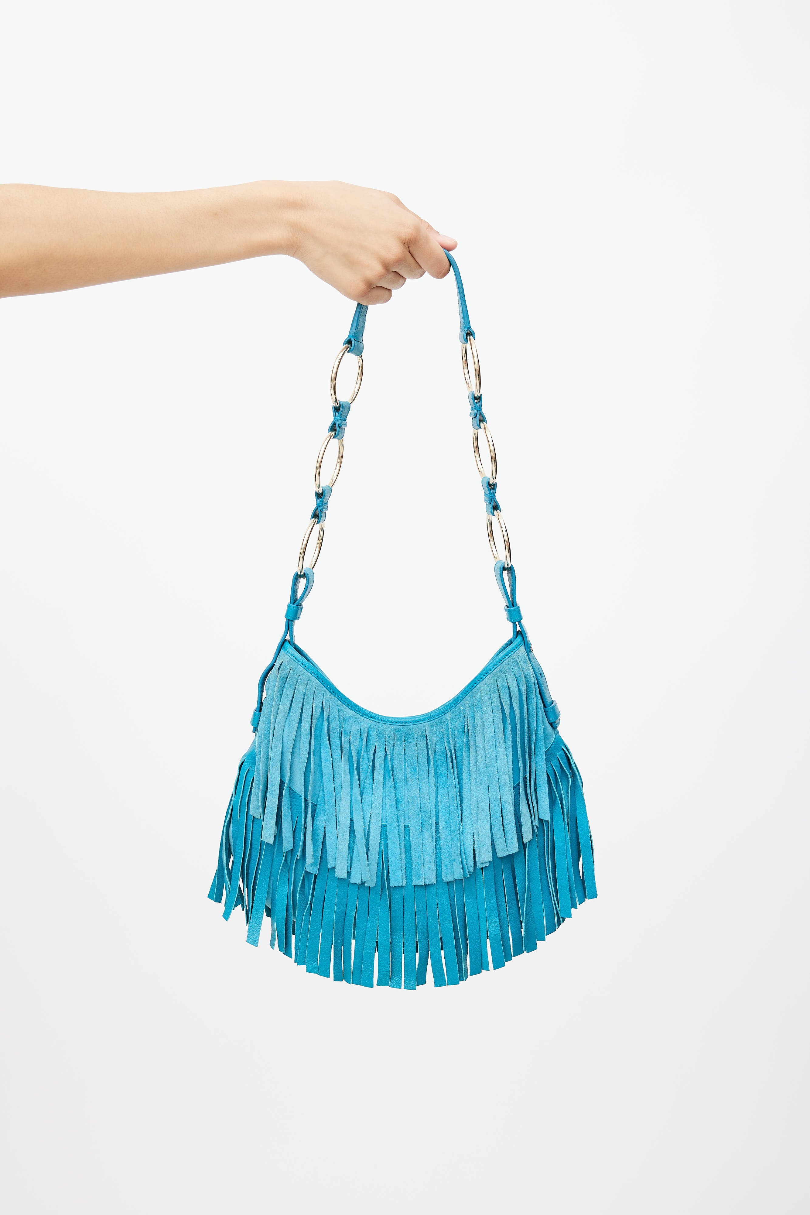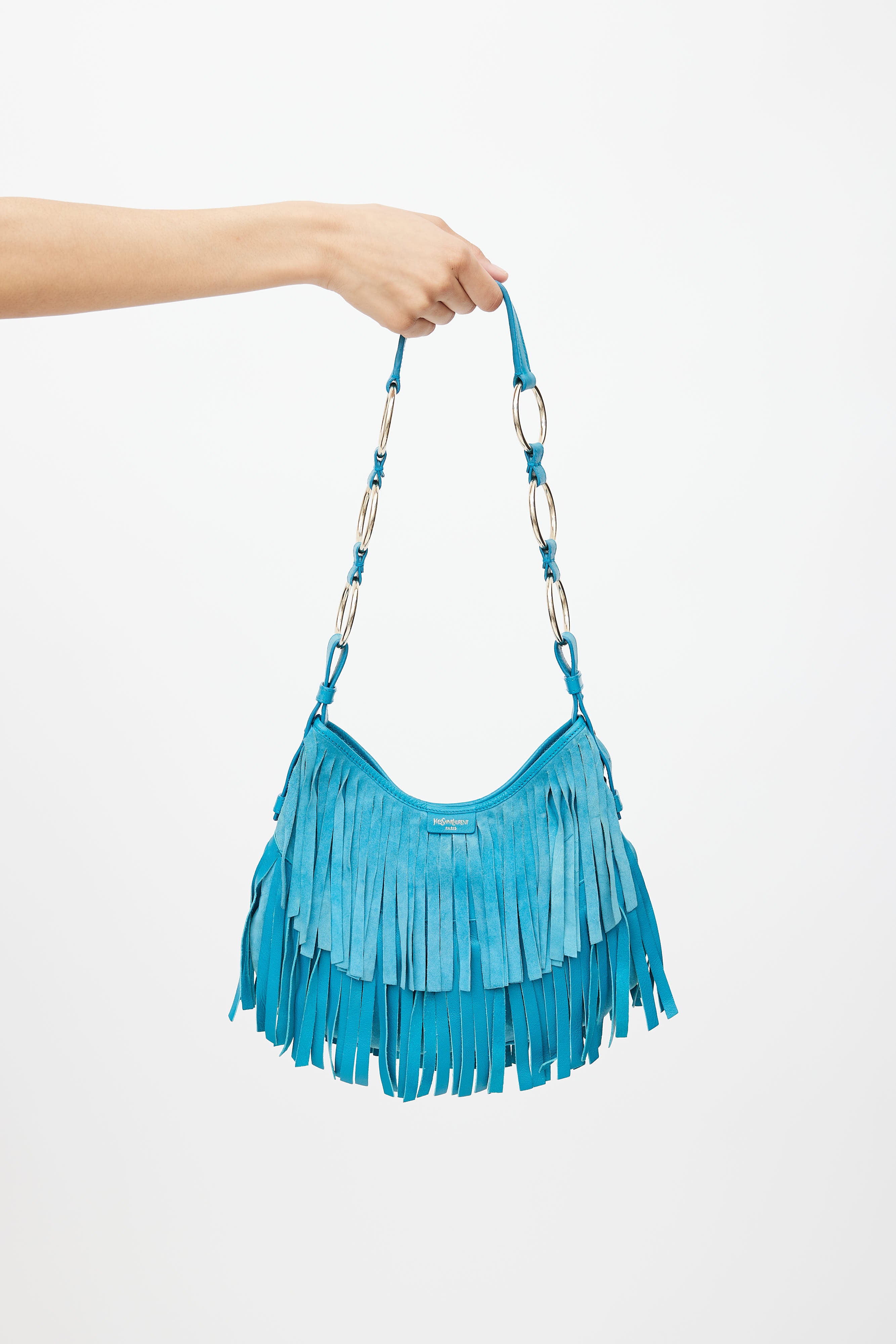 Pre-owned Yves Saint Laurent Boheme bag in blue featuring fringe throughout, snap button closure, logo tab at face, shoulder strap with oversized silver tone rings, lined main compartment, and interior zip pocket with logo tab.