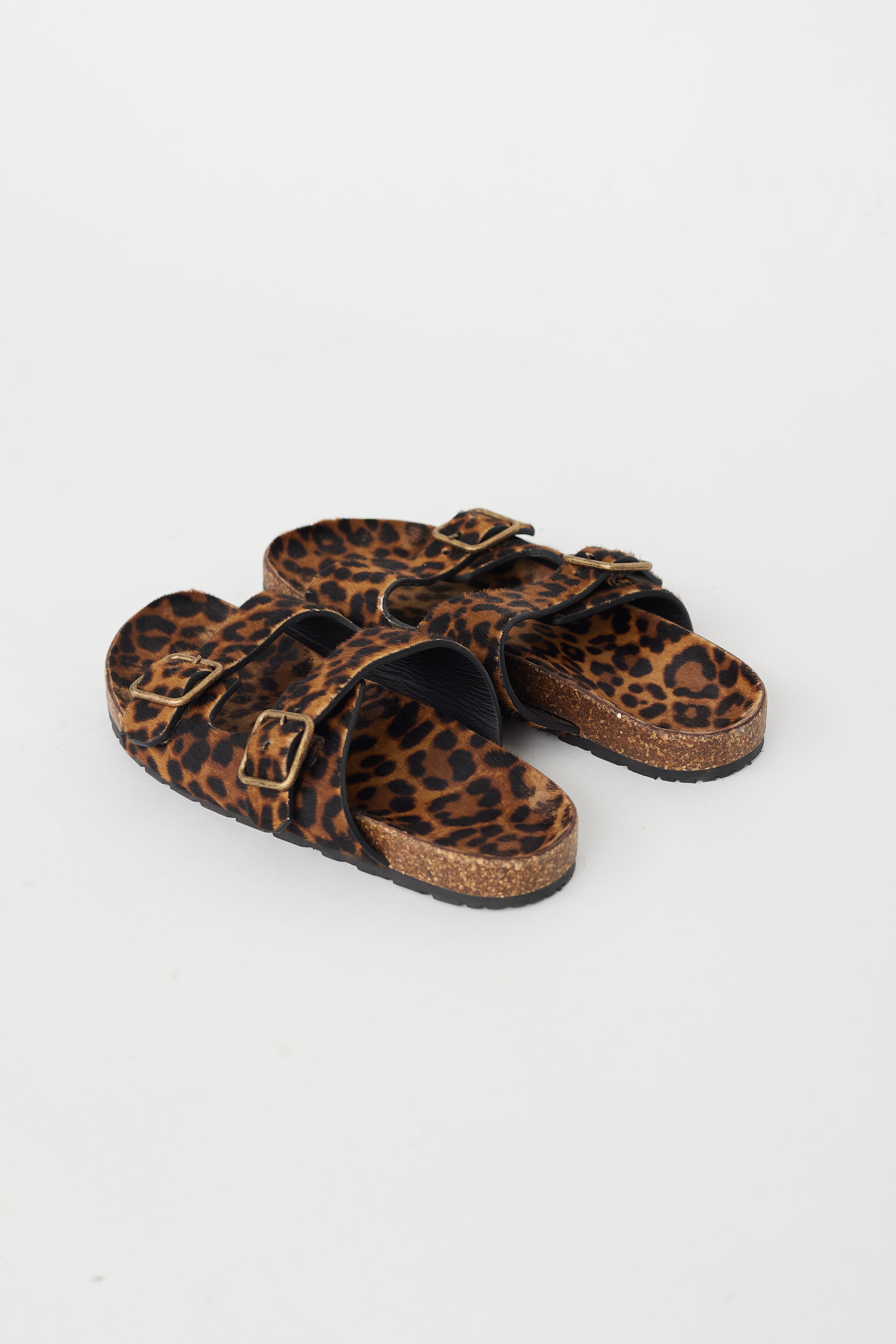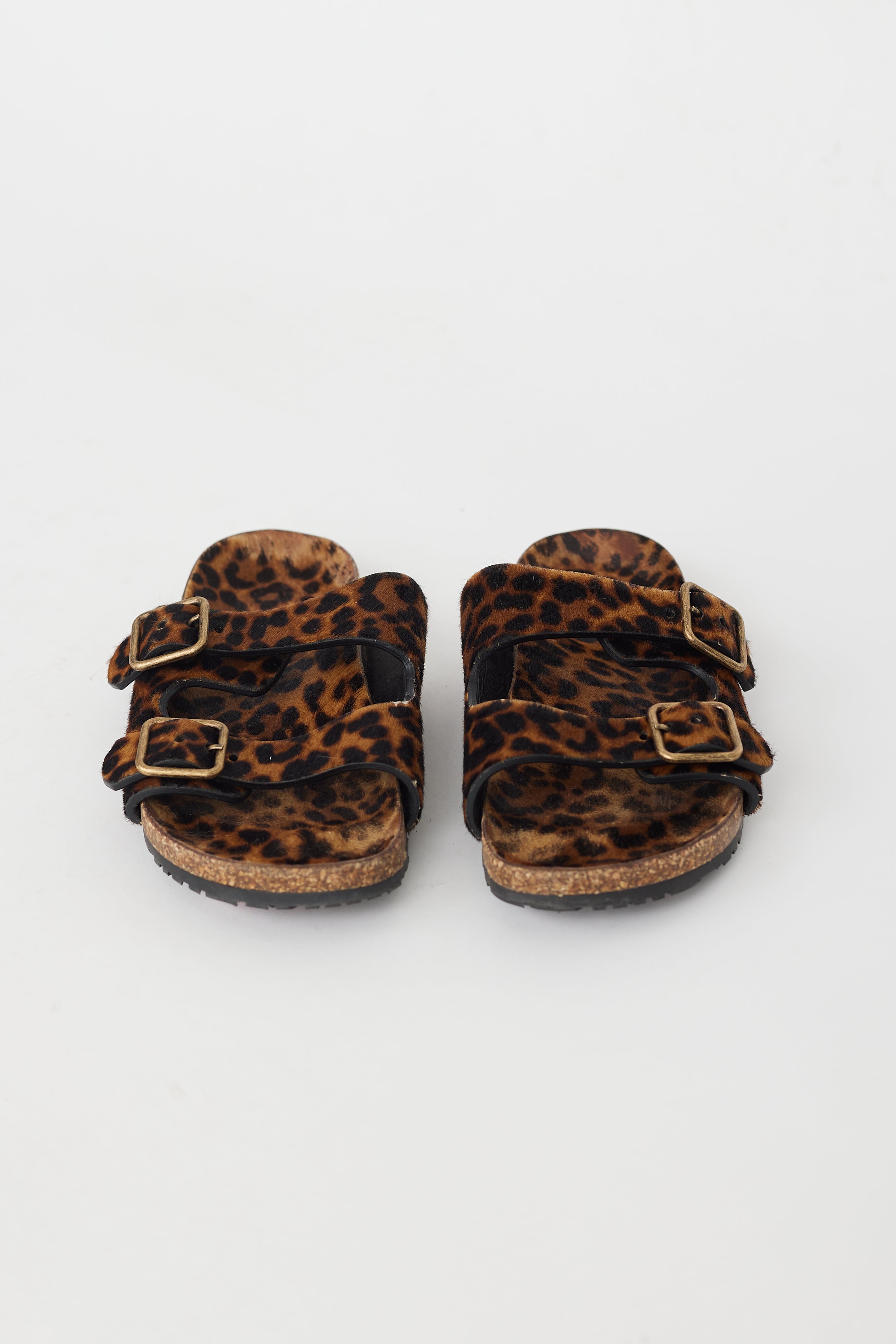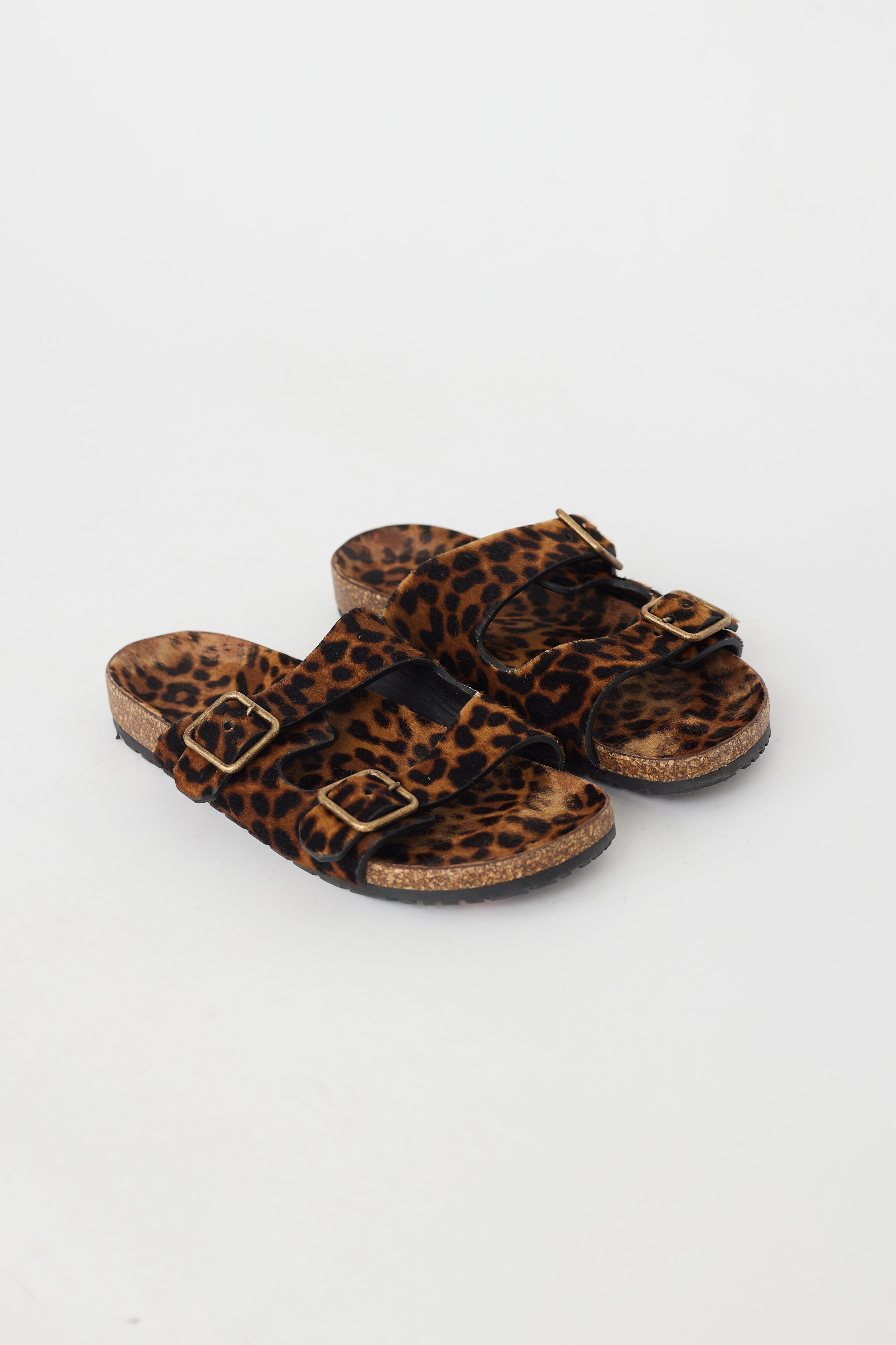 Pre-owned Saint Laurent brown and black Jimmy sandals featuring open rounded toe, buckled straps, leopard print pony hair upper, and molded suede foot bed. Comes with original dust bag.