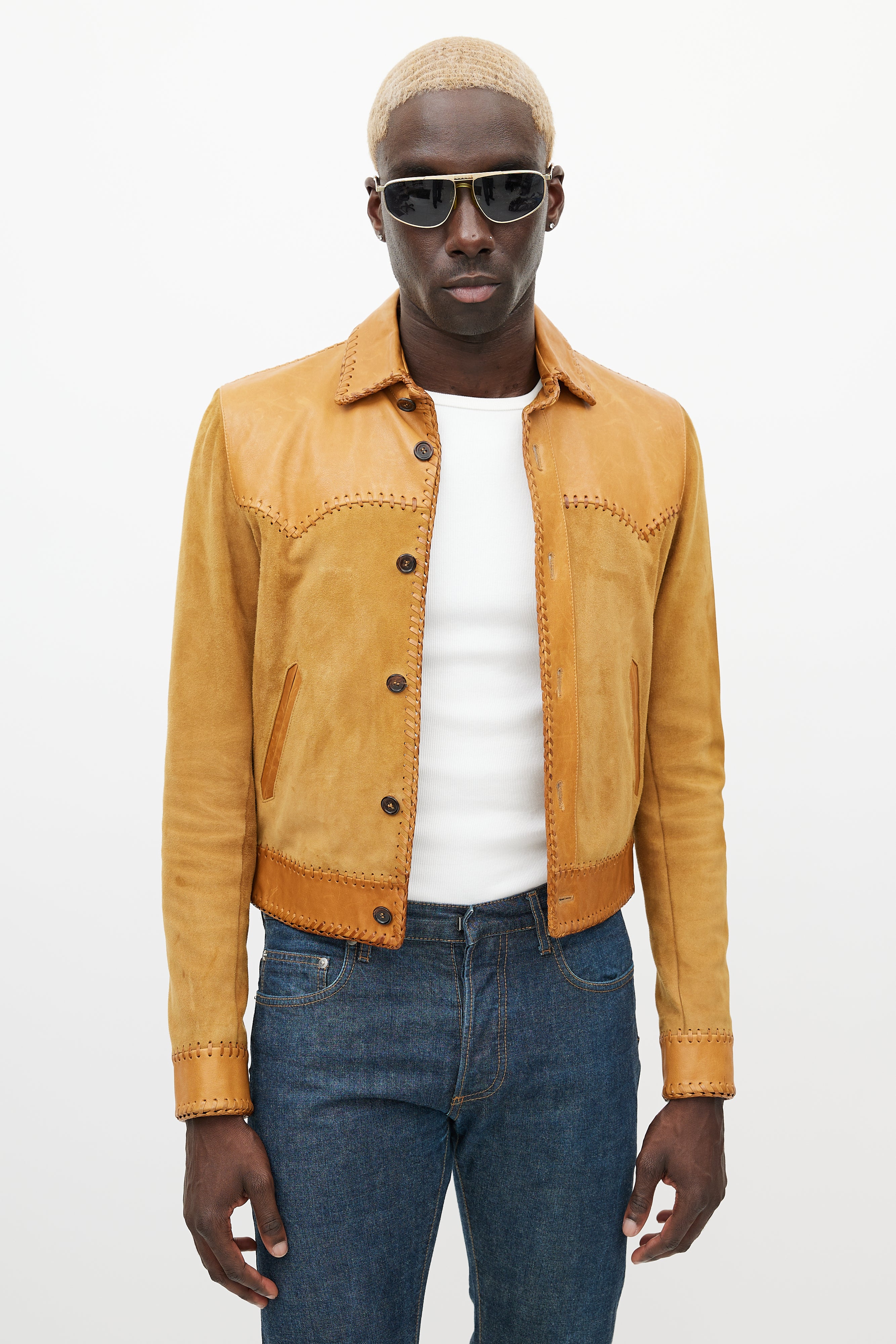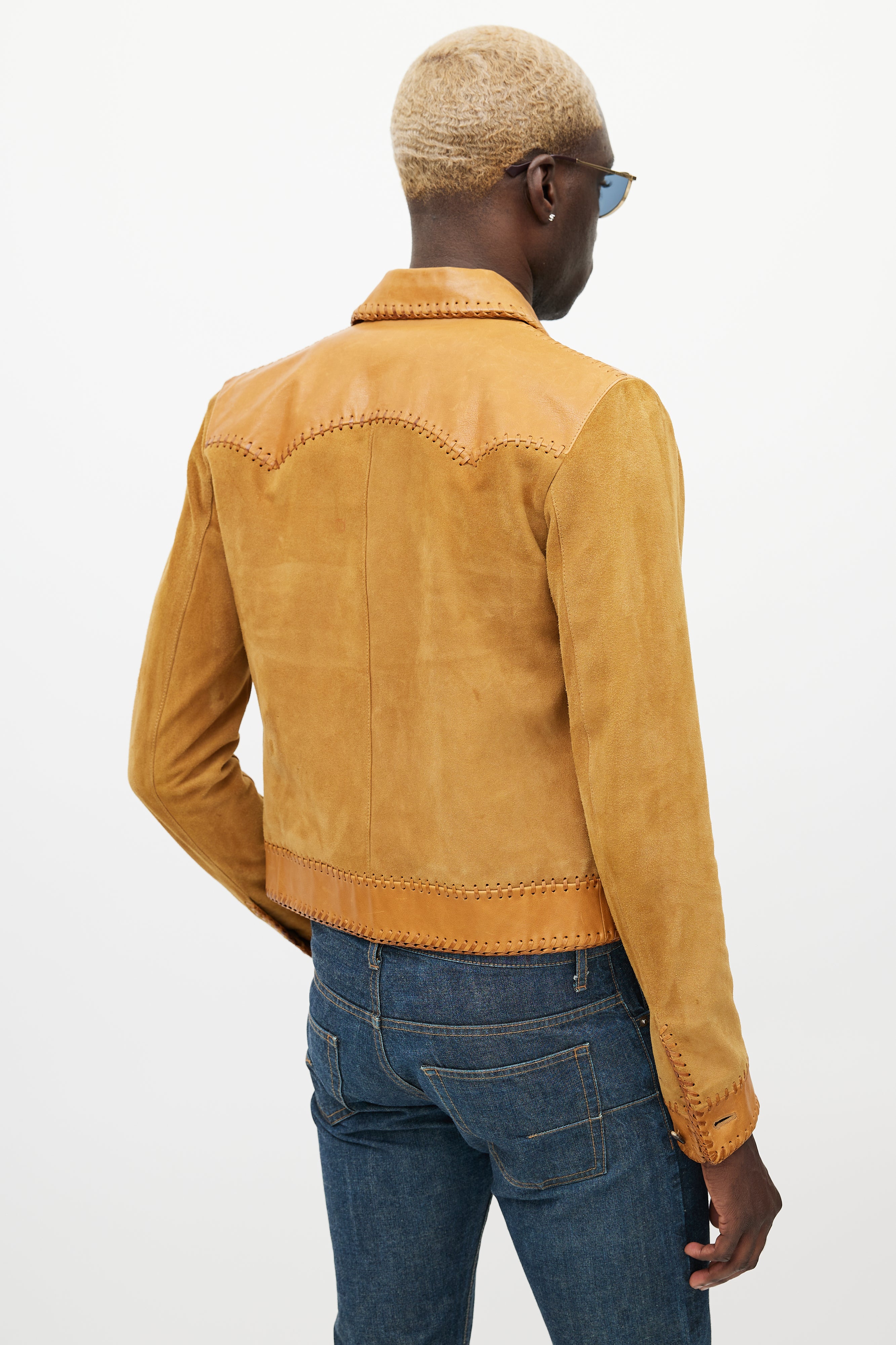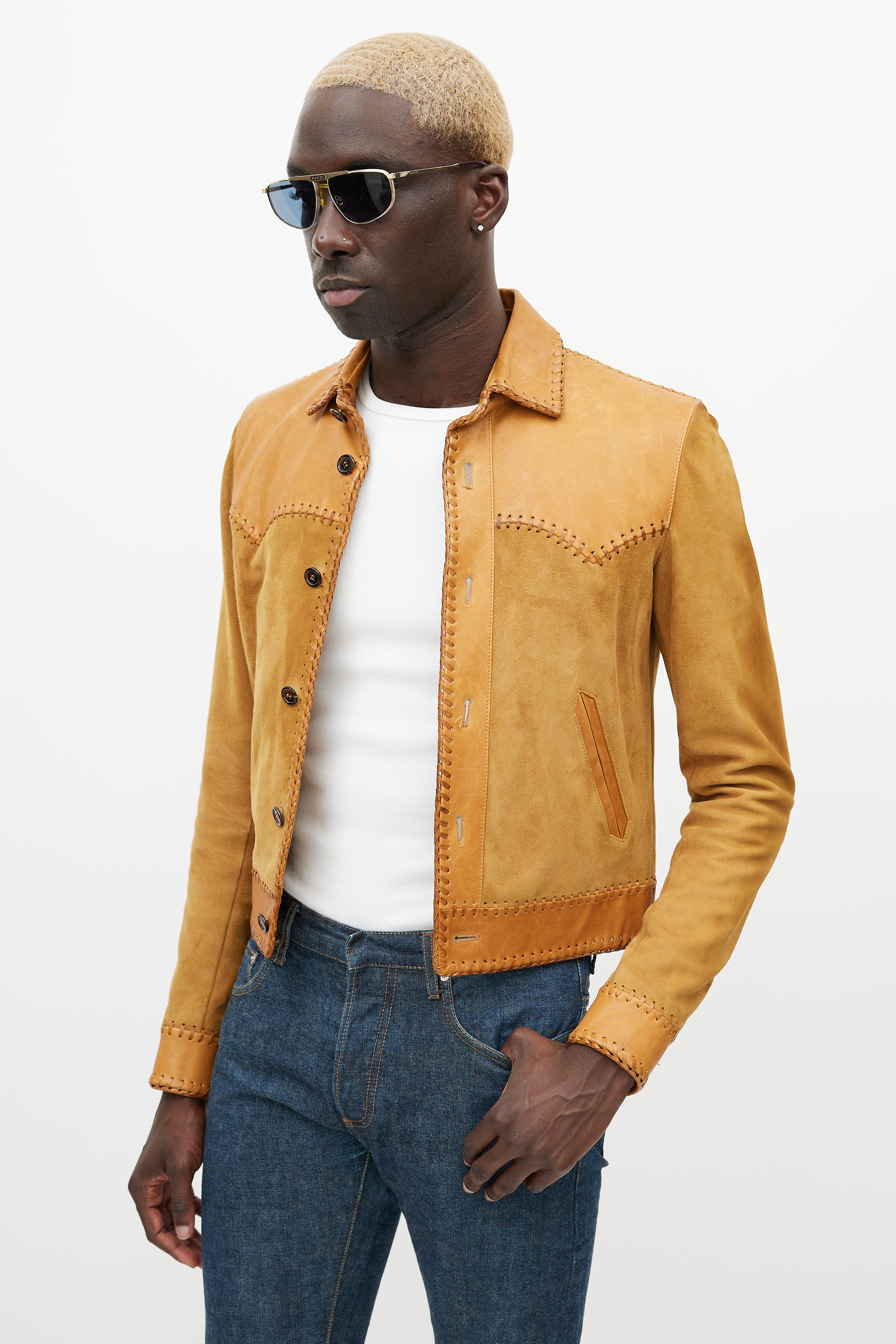 Pre-owned Saint Laurent brown leather jacket featuring tonal braided trim, pointed collar, long sleeves with buttoned cuffs, two slip pockets at hip, and button up closure. Lined.