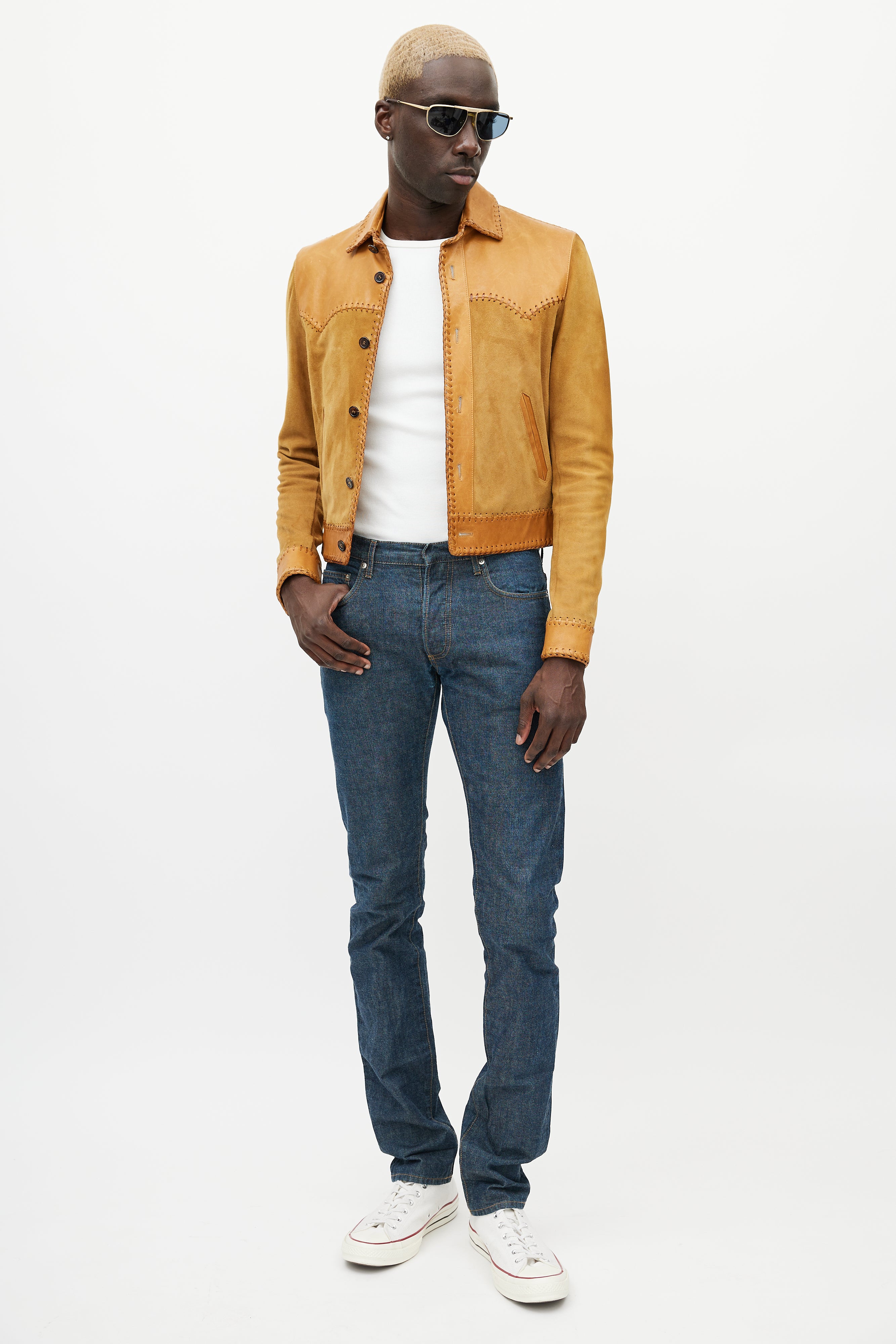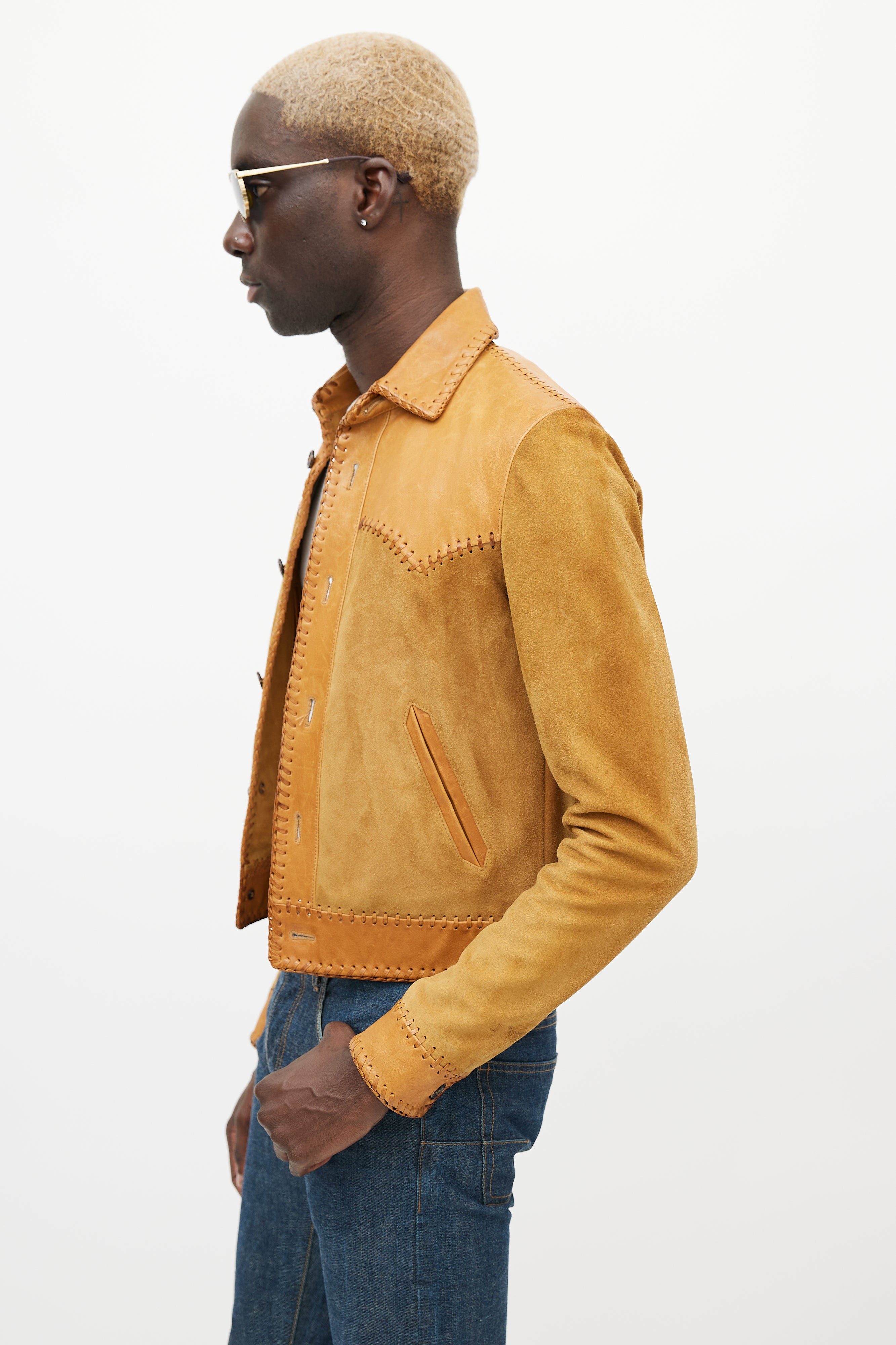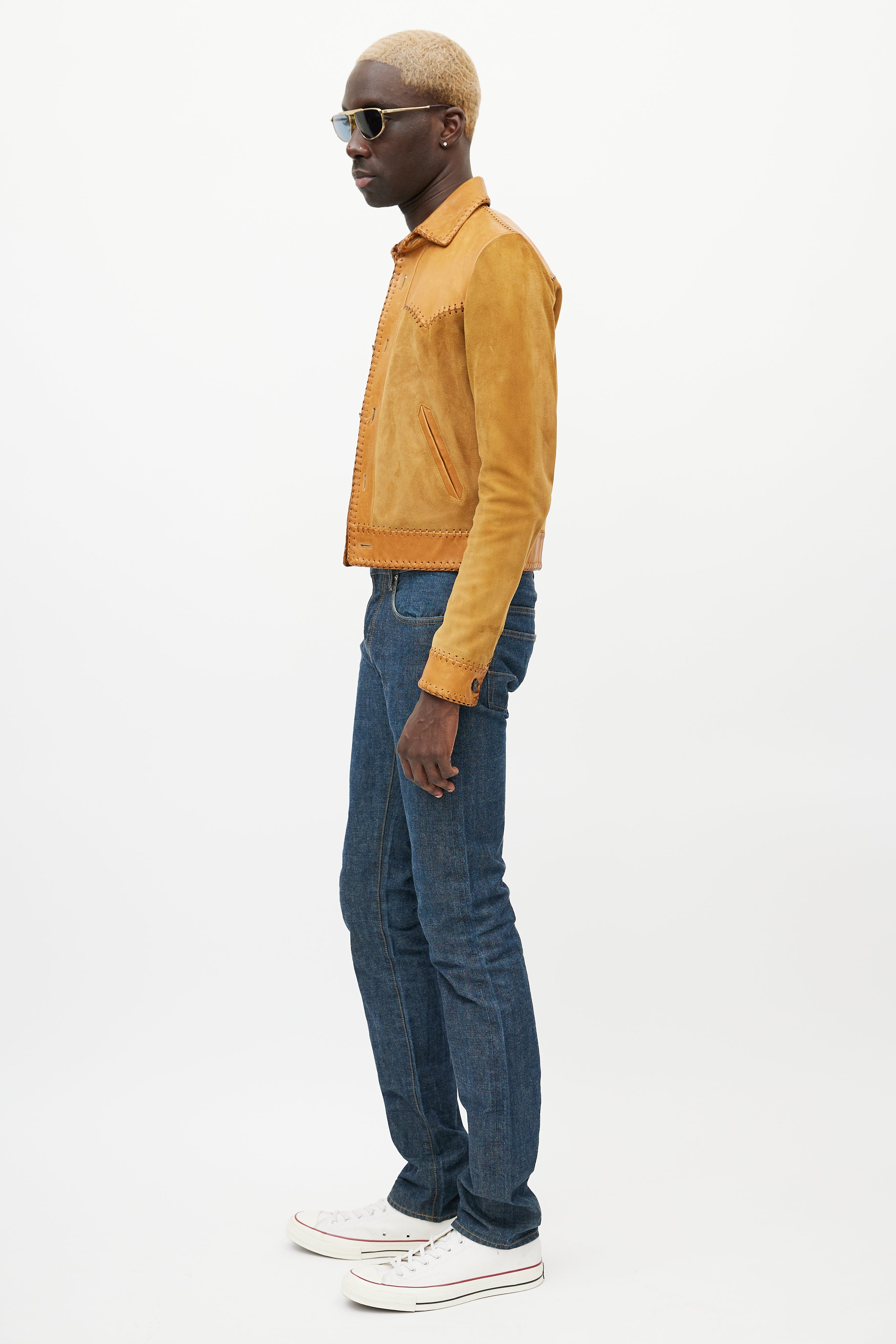 Pre-owned Saint Laurent brown leather jacket featuring tonal braided trim, pointed collar, long sleeves with buttoned cuffs, two slip pockets at hip, and button up closure. Lined.