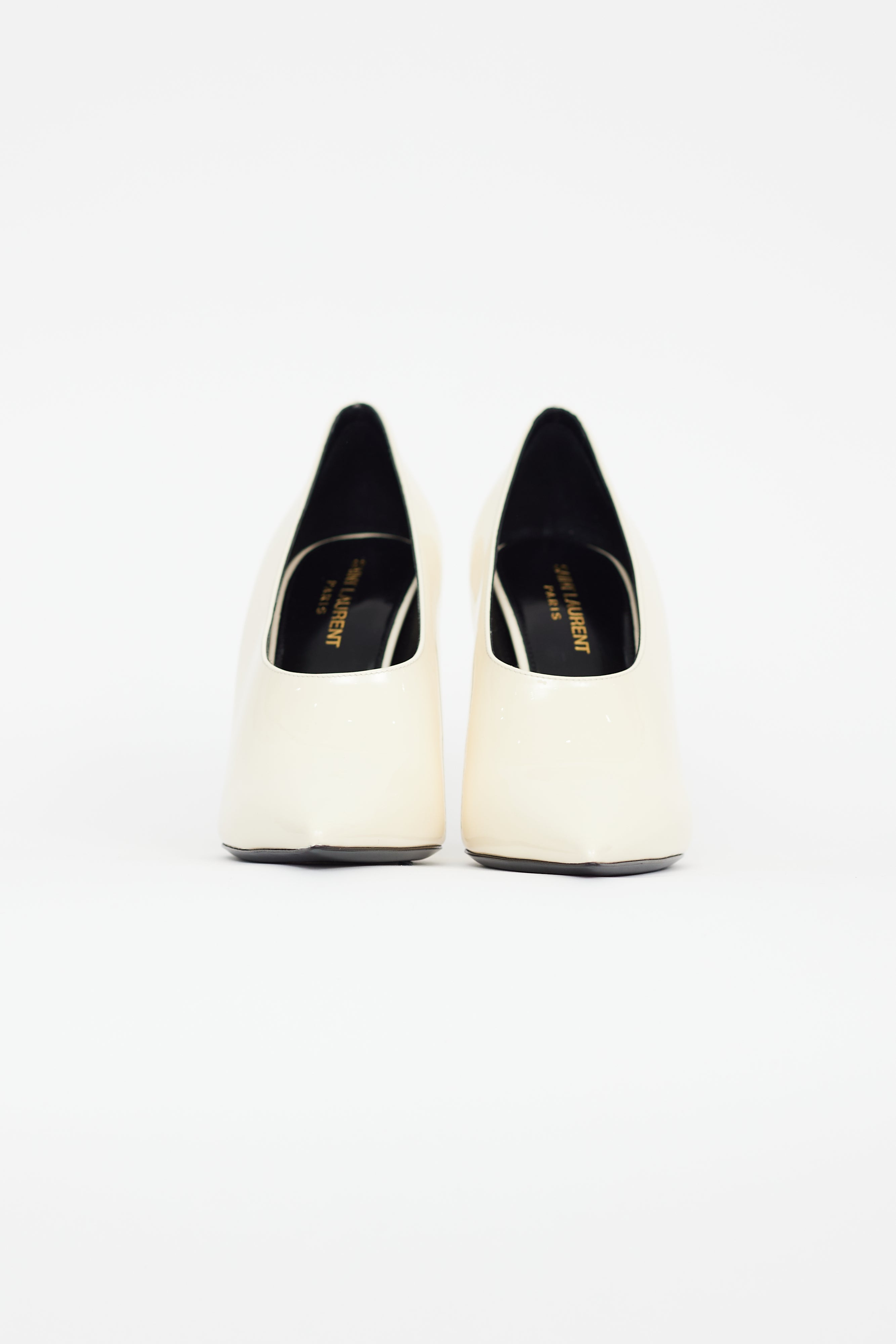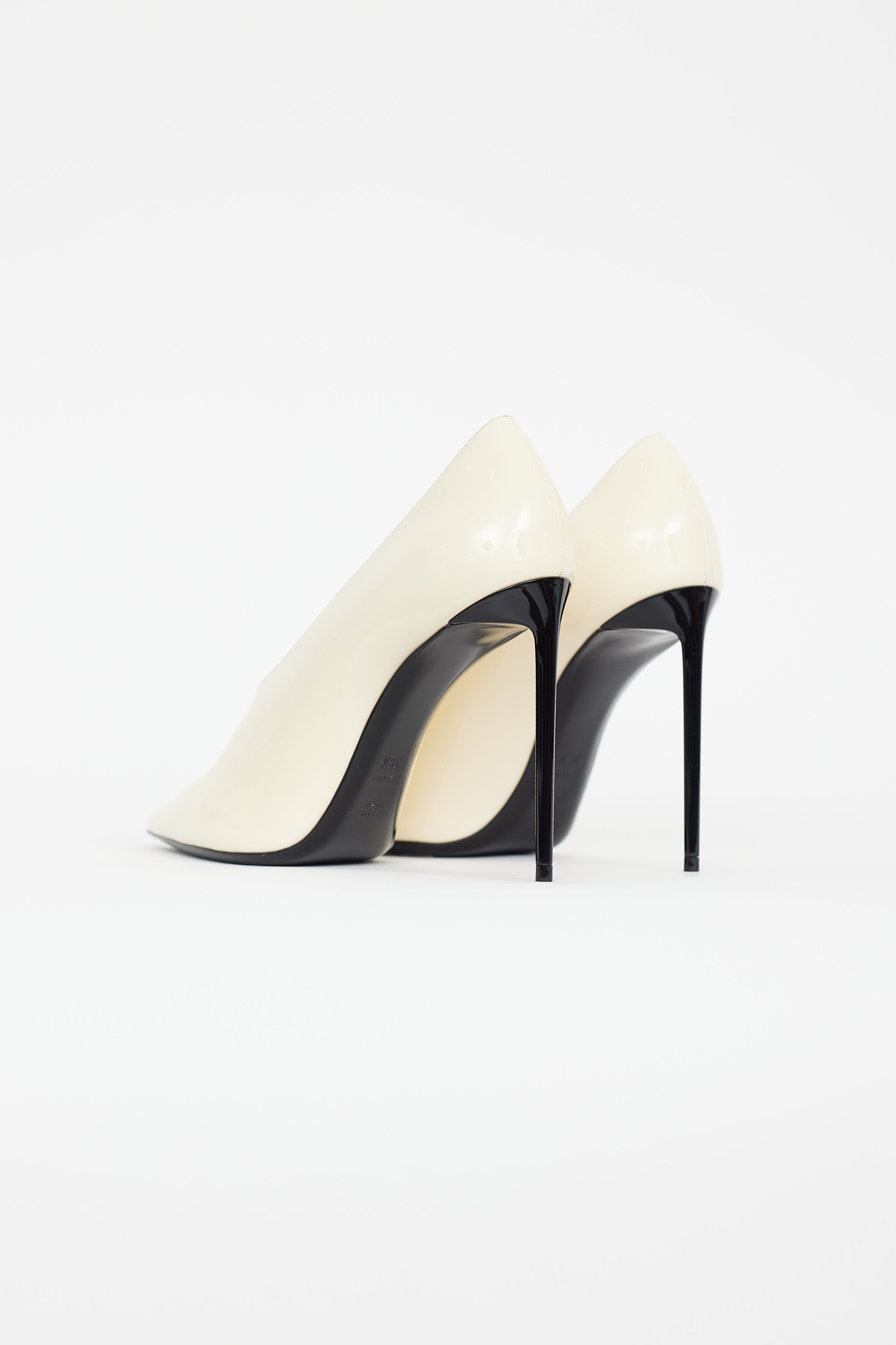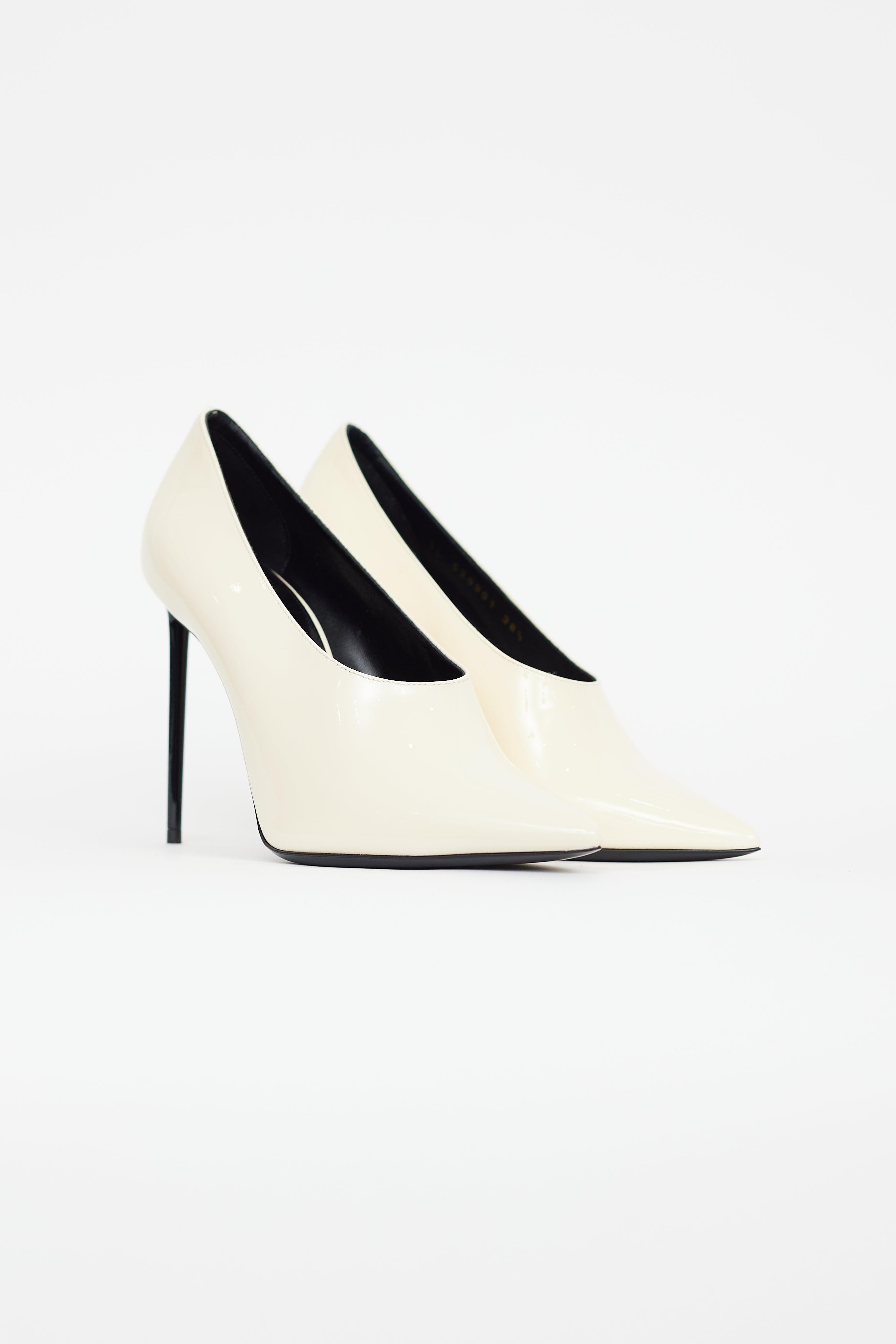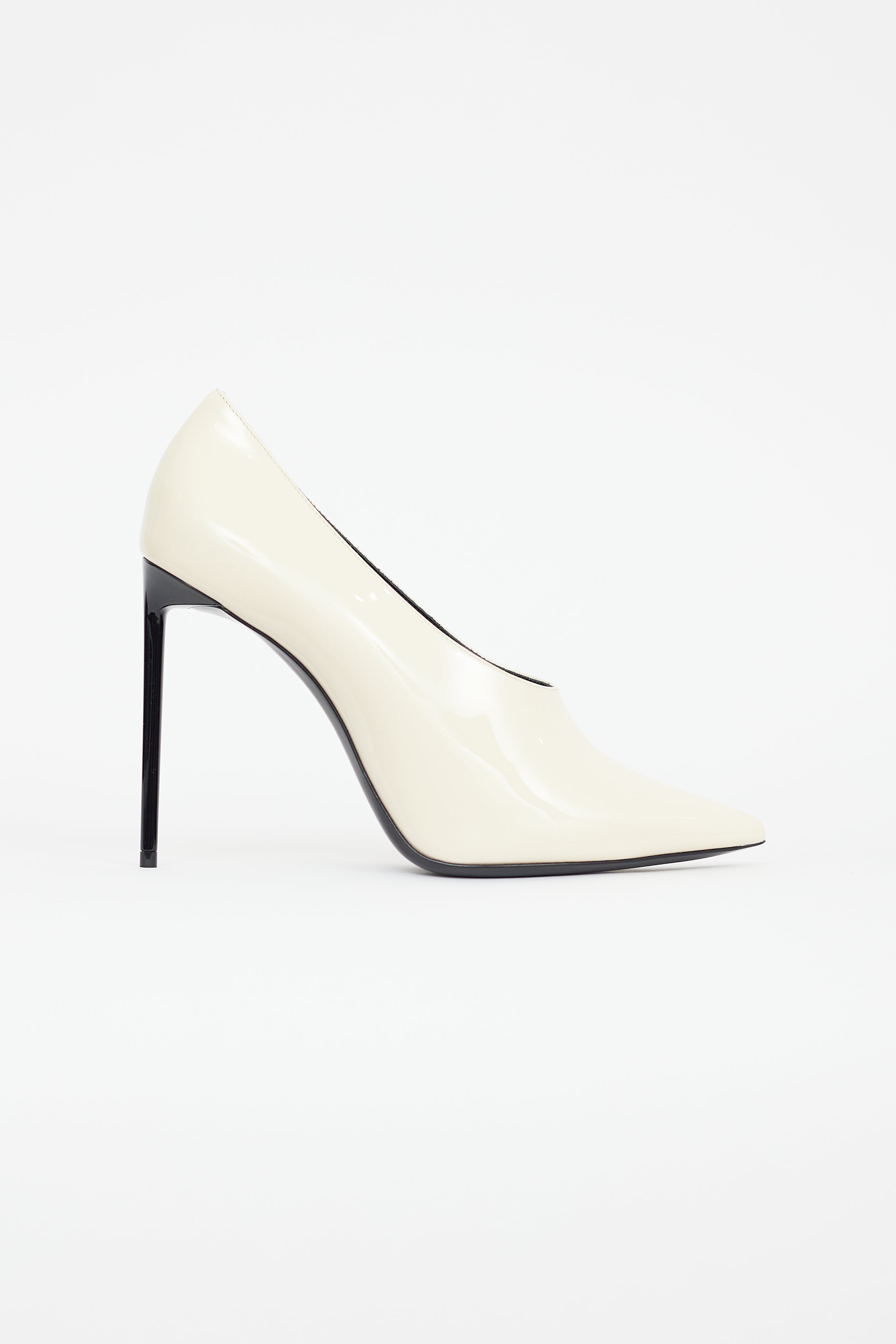 Pre-owned Saint Laurent cream patent leather pump featuring higher vamp, pointed toe, black stiletto heel, and leather insoles. Comes with original box.
