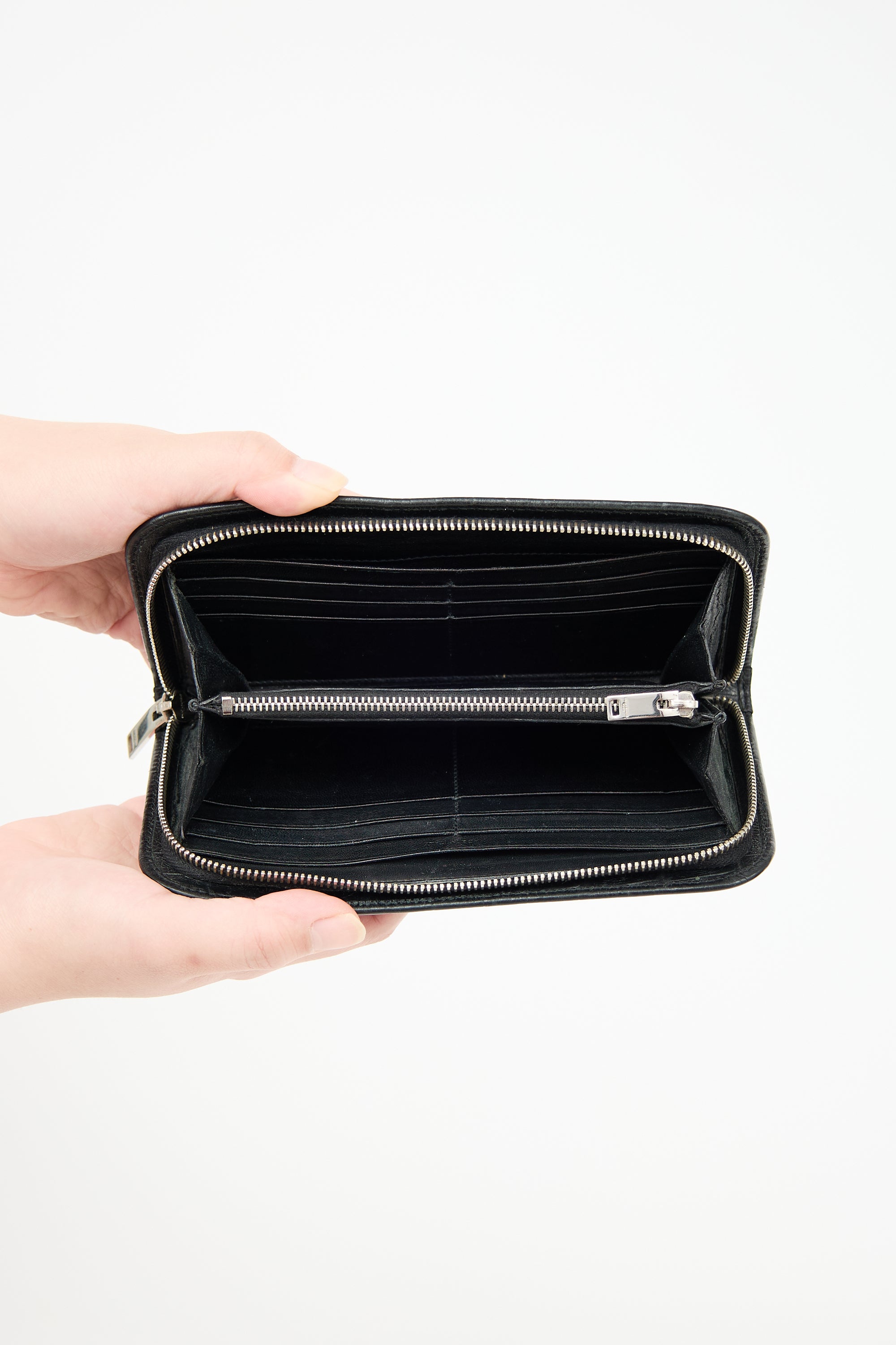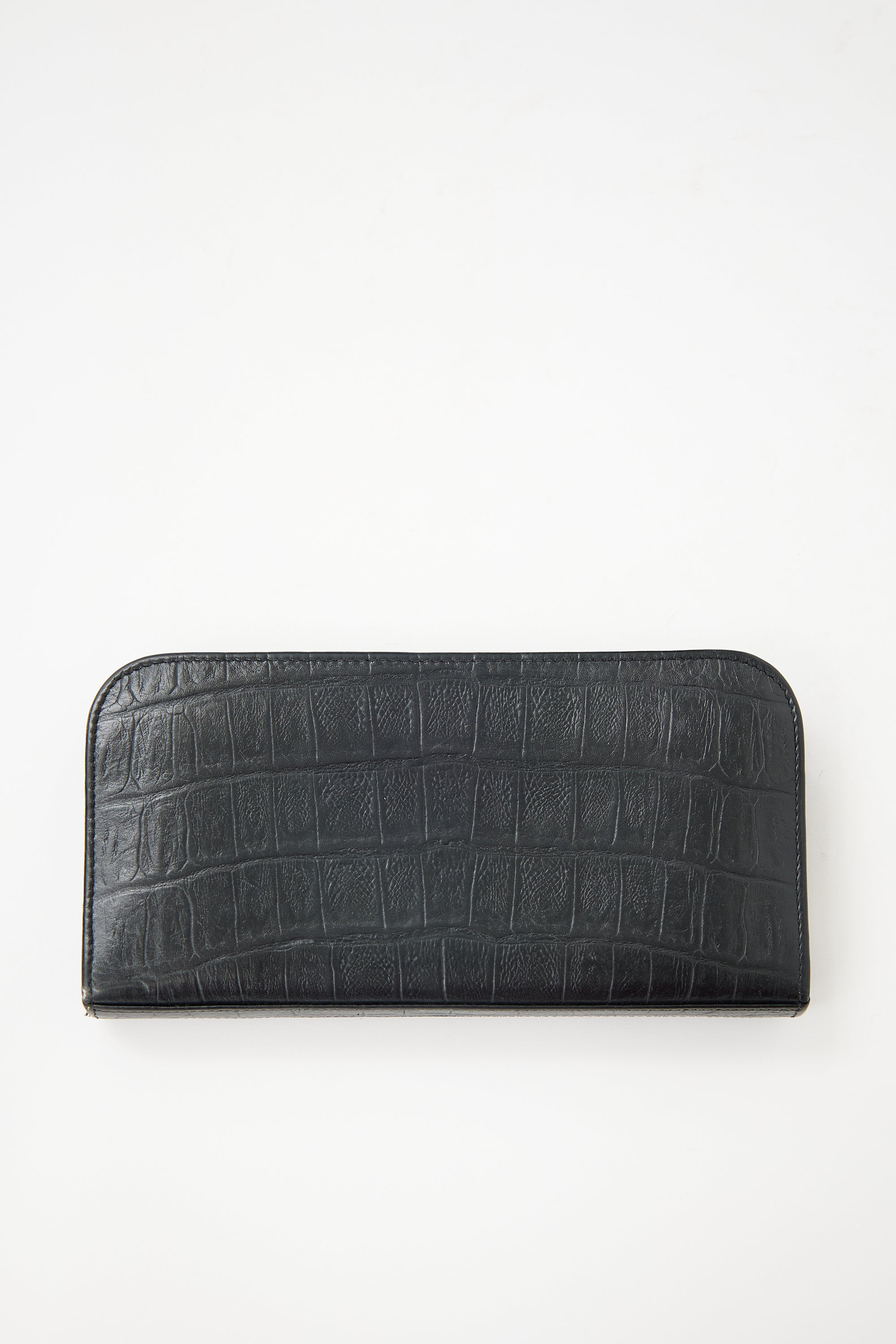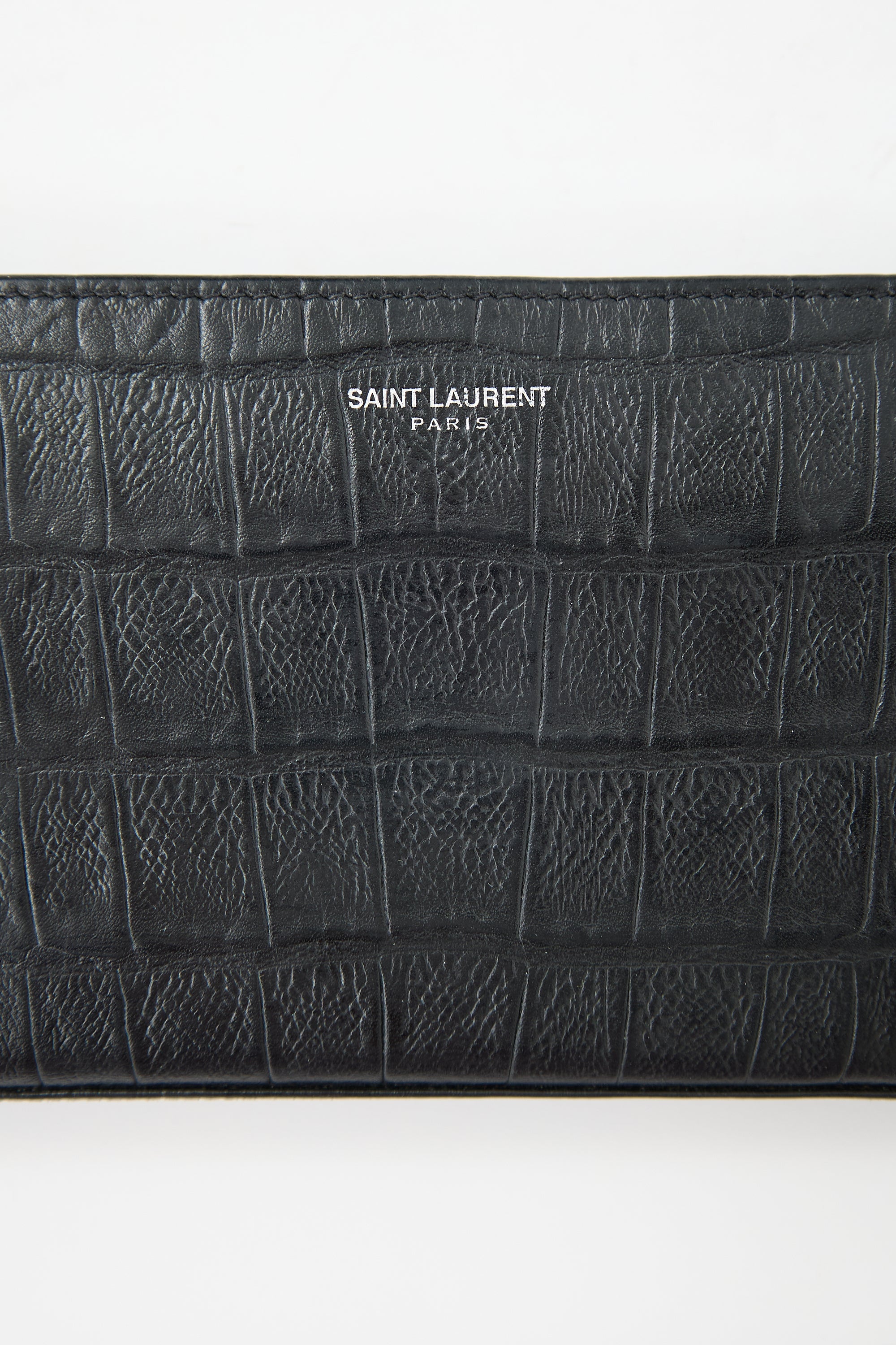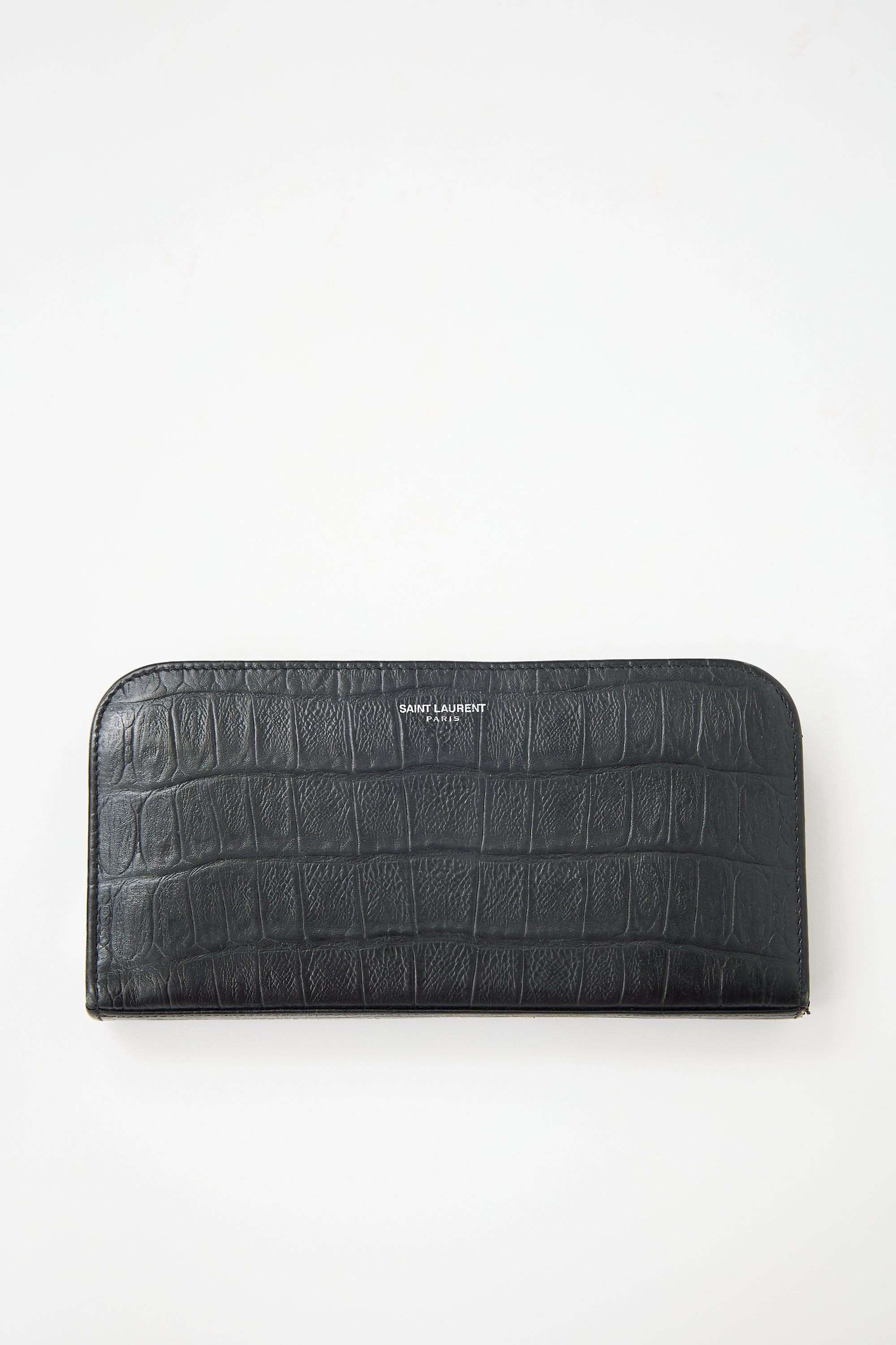 Pre-owned Saint Laurent black leather wallet featuring croc effect embossed leather, silver stamped logo at front, zip closure, and interior pockets include two main compartment, two slip pockets, one zip pocket, and 12 card slots.