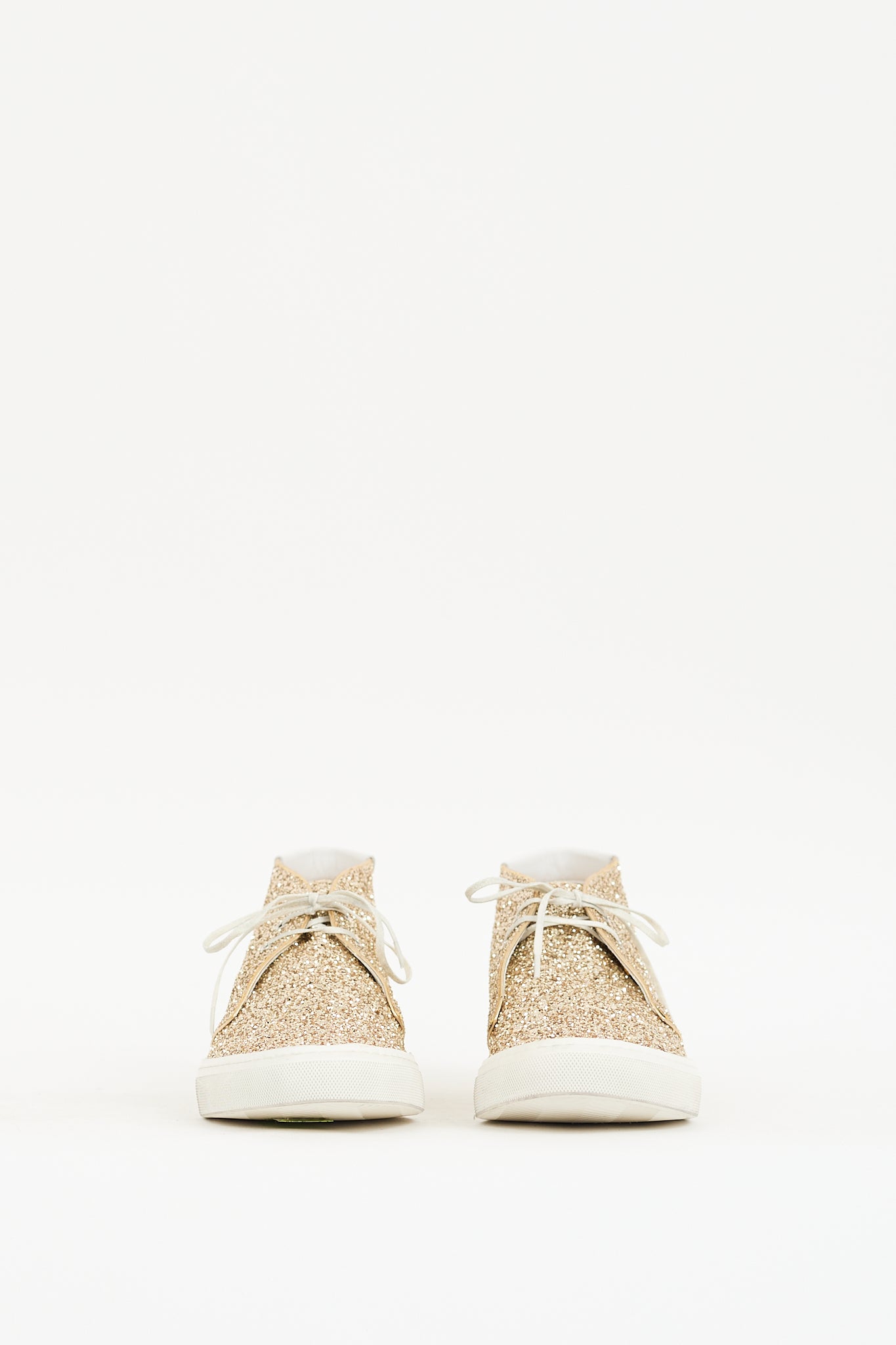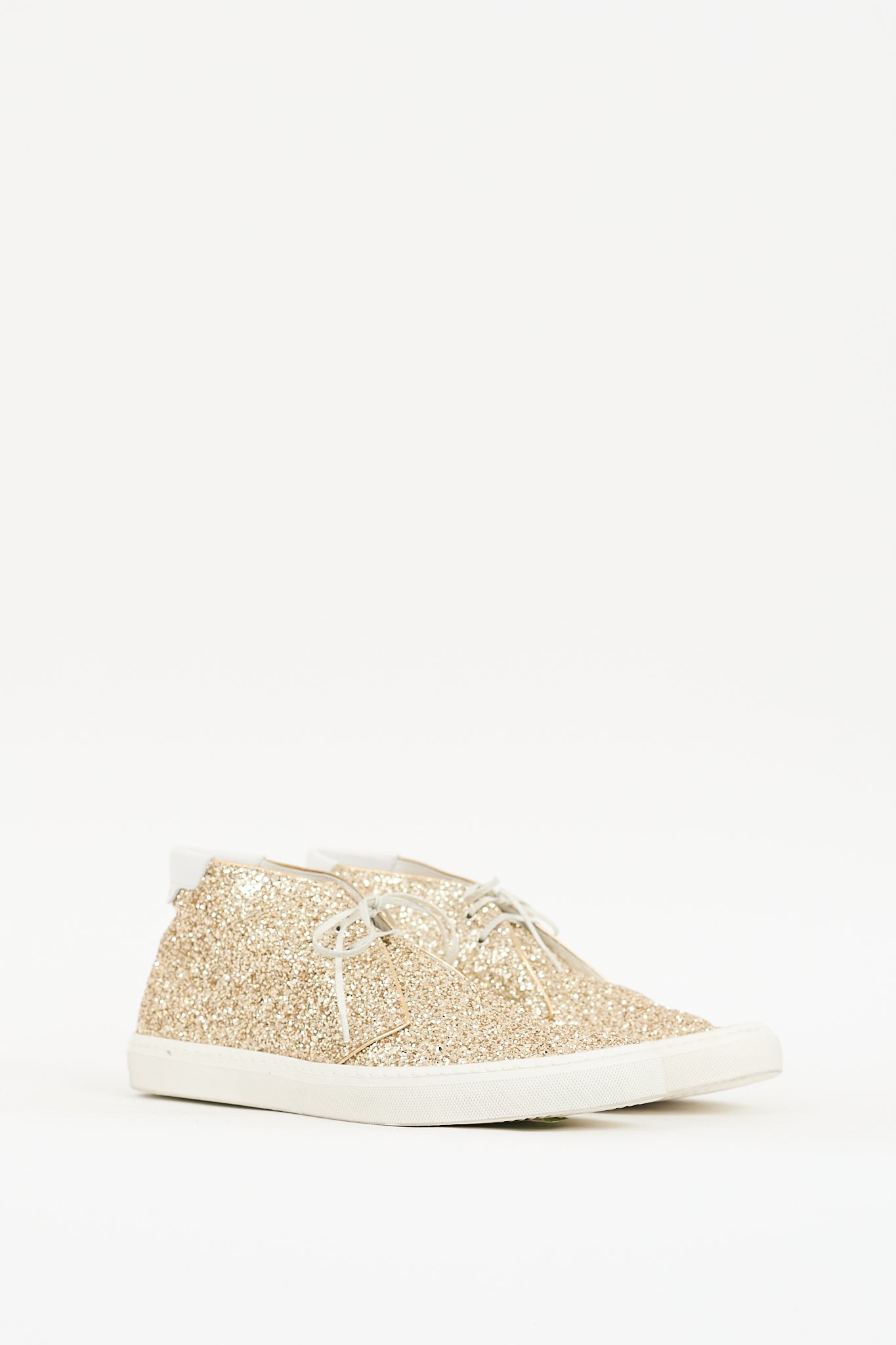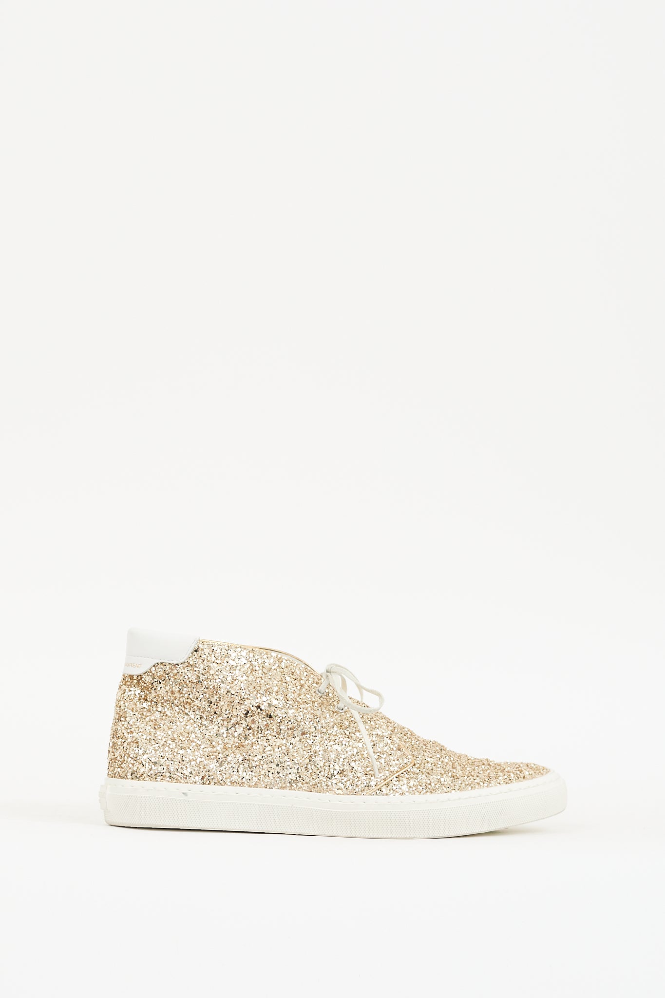 Pre-owned Saint Laurent gold Ace sneakers featuring rounded toe, lace up vamp, white leather heel tab, and glitter upper. Comes with original dust bag.