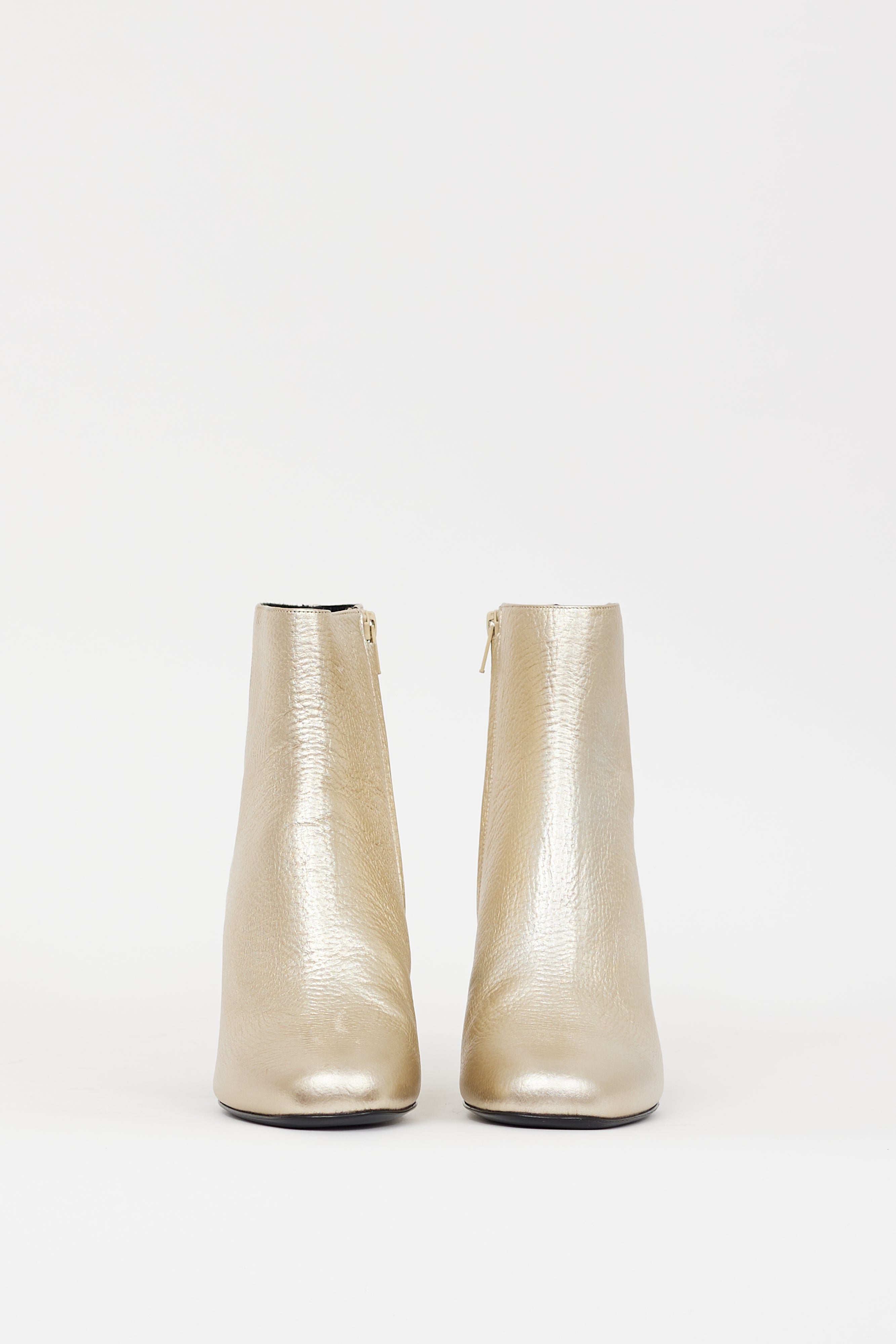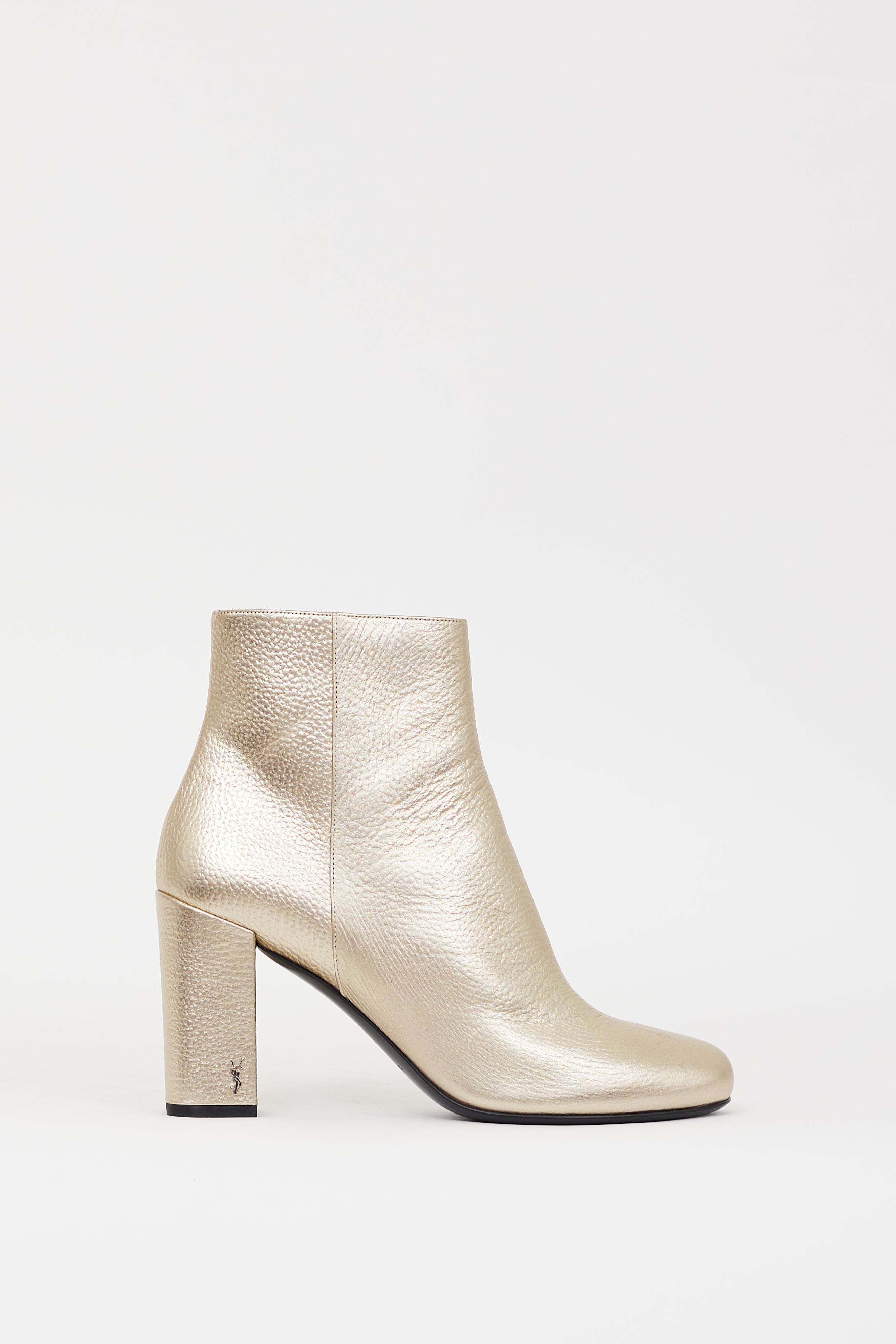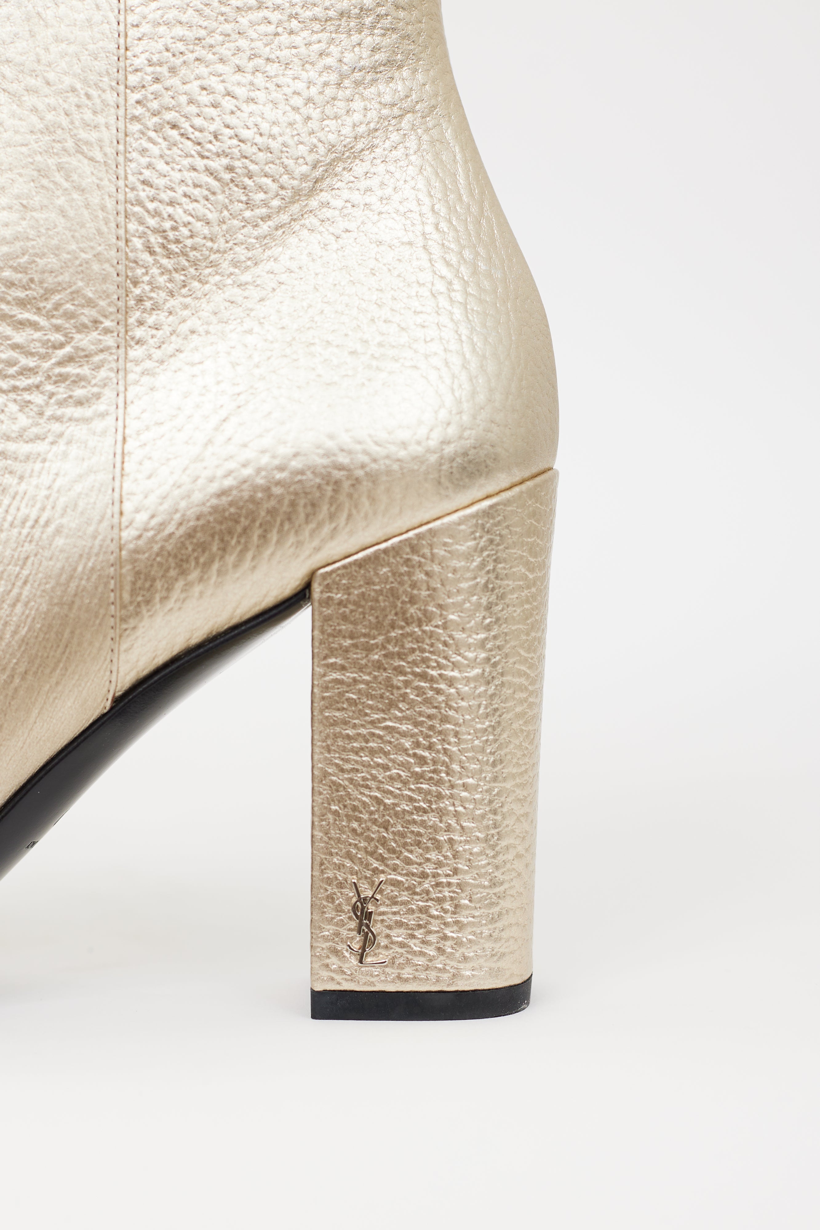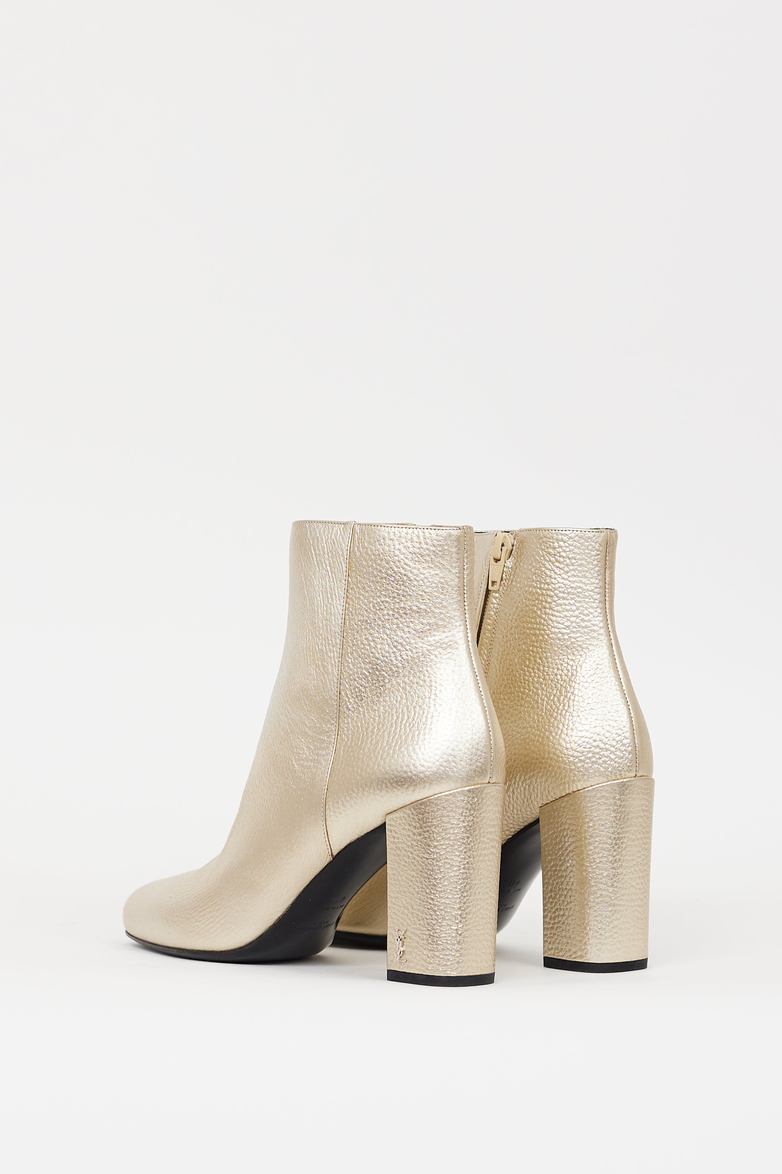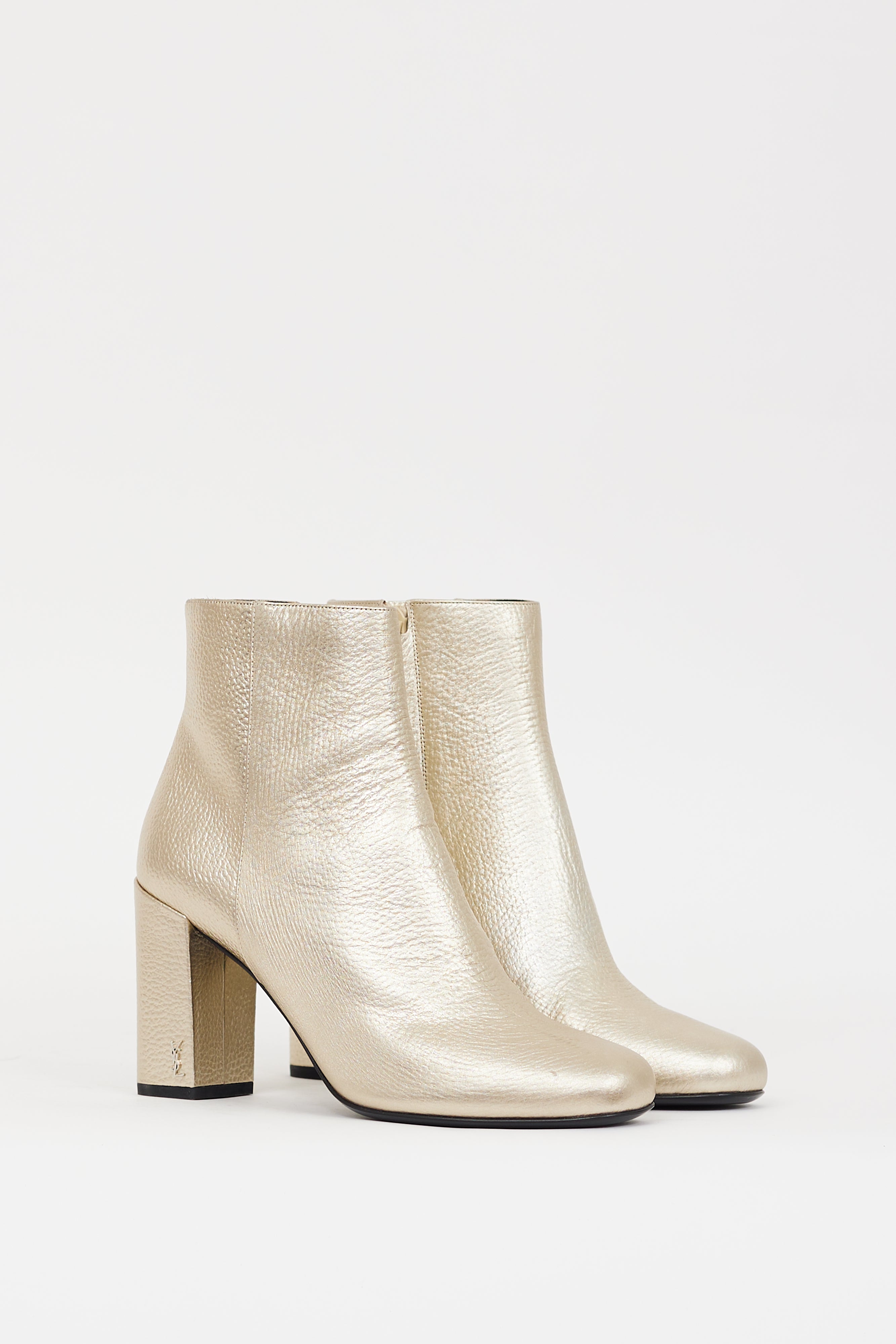 Pre-owned Saint Laurent gold metallic leather 90mm Babies boots featuring a rounded square toe, inner side zip, and covered block heel with outer silver tone hardware logo embellishment.