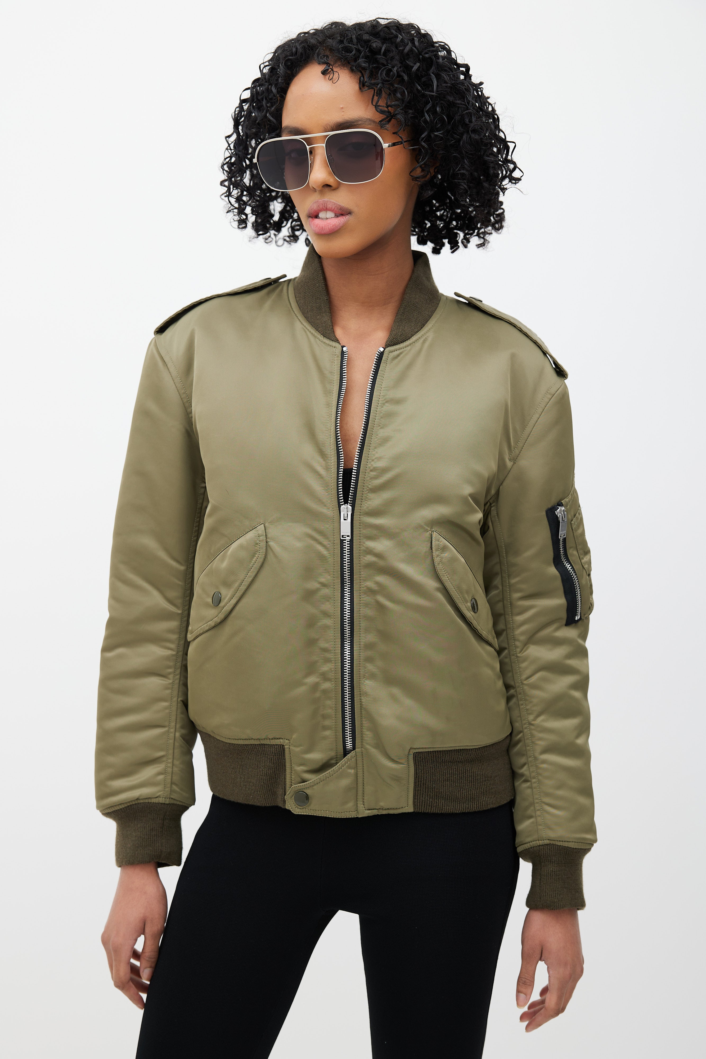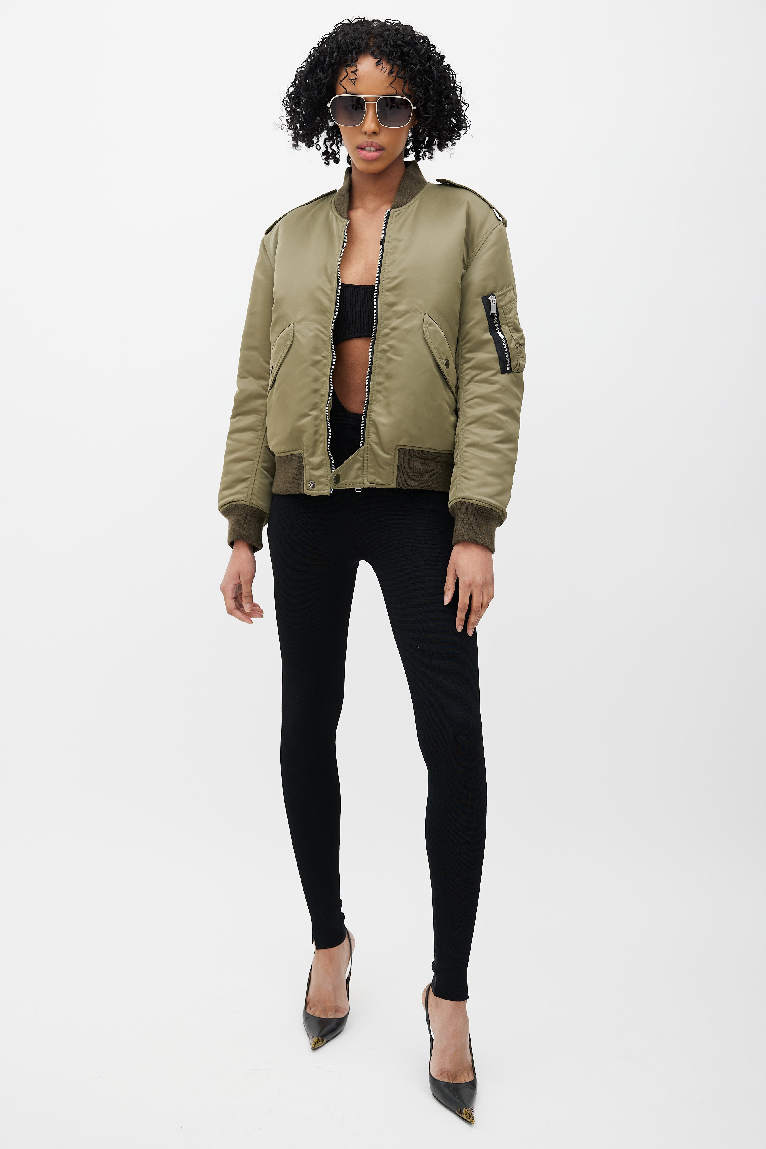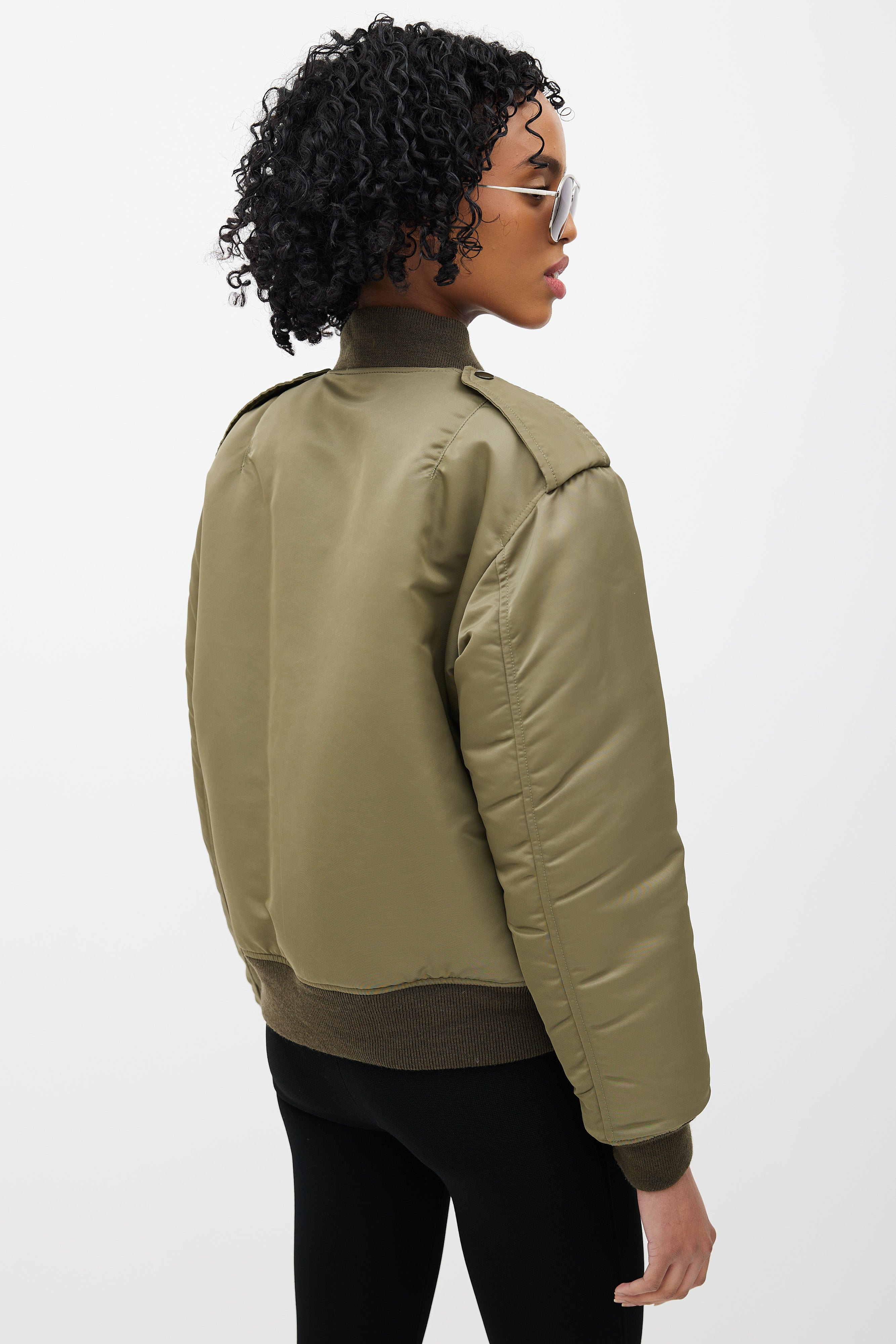 Pre-owned Saint Lauren green padded bomber jacket featuring a stand collar, epaulets at shoulder, long sleeves with ribbed cuffs, two flap pockets at hip, cargo pocket at arm, and zip closure. Lined.