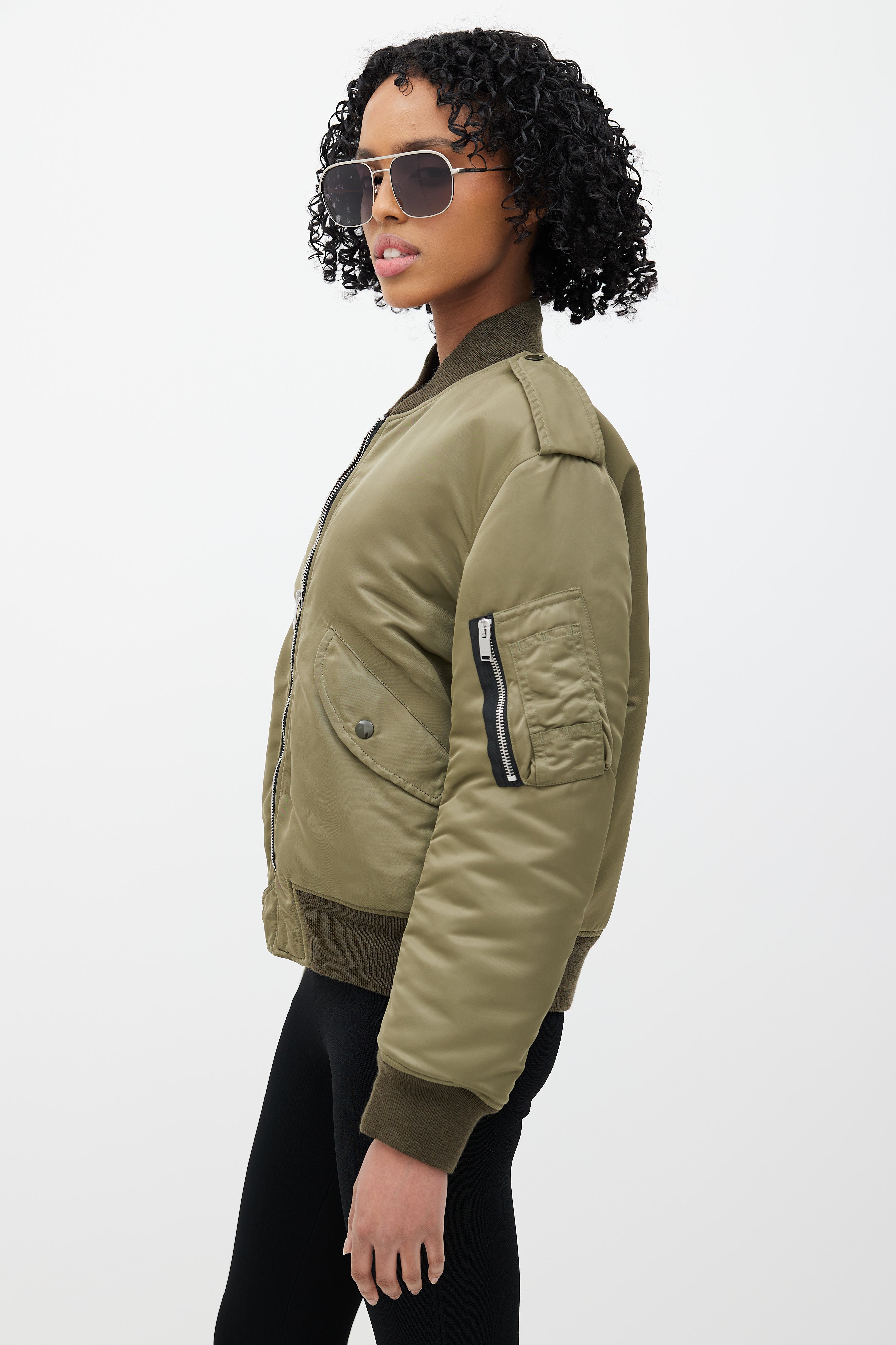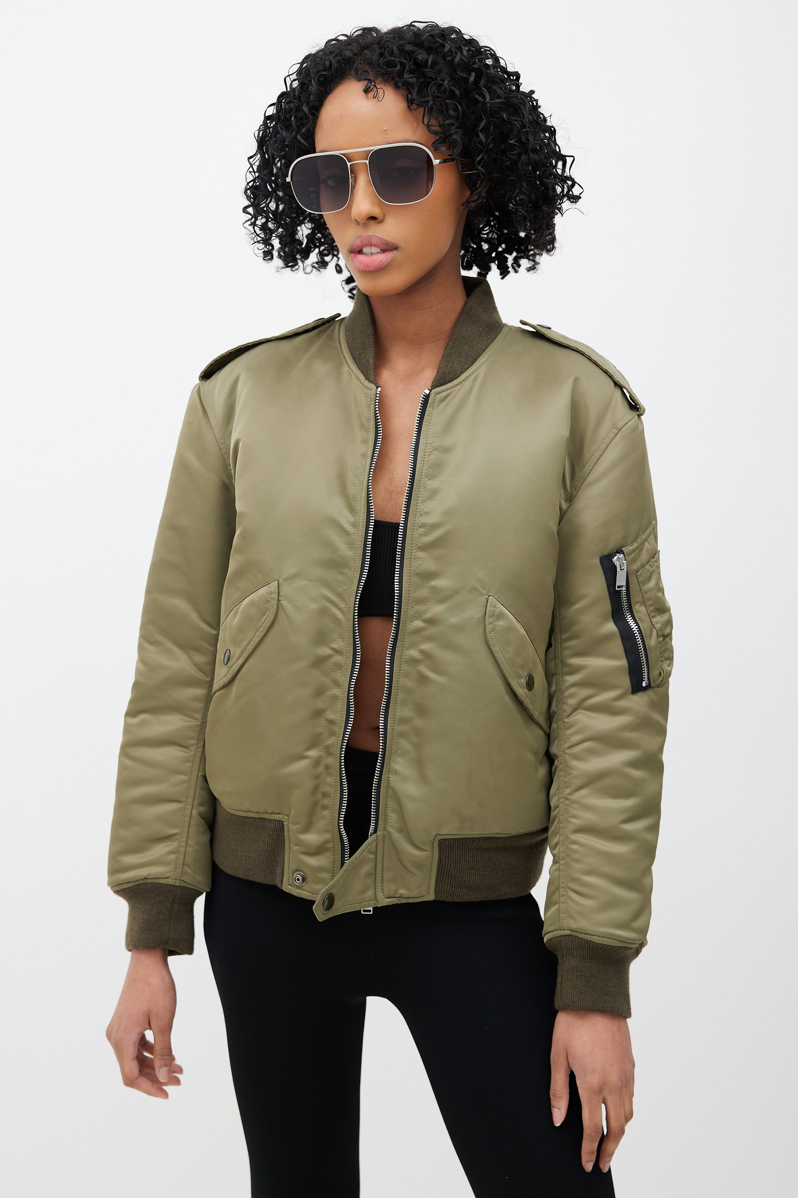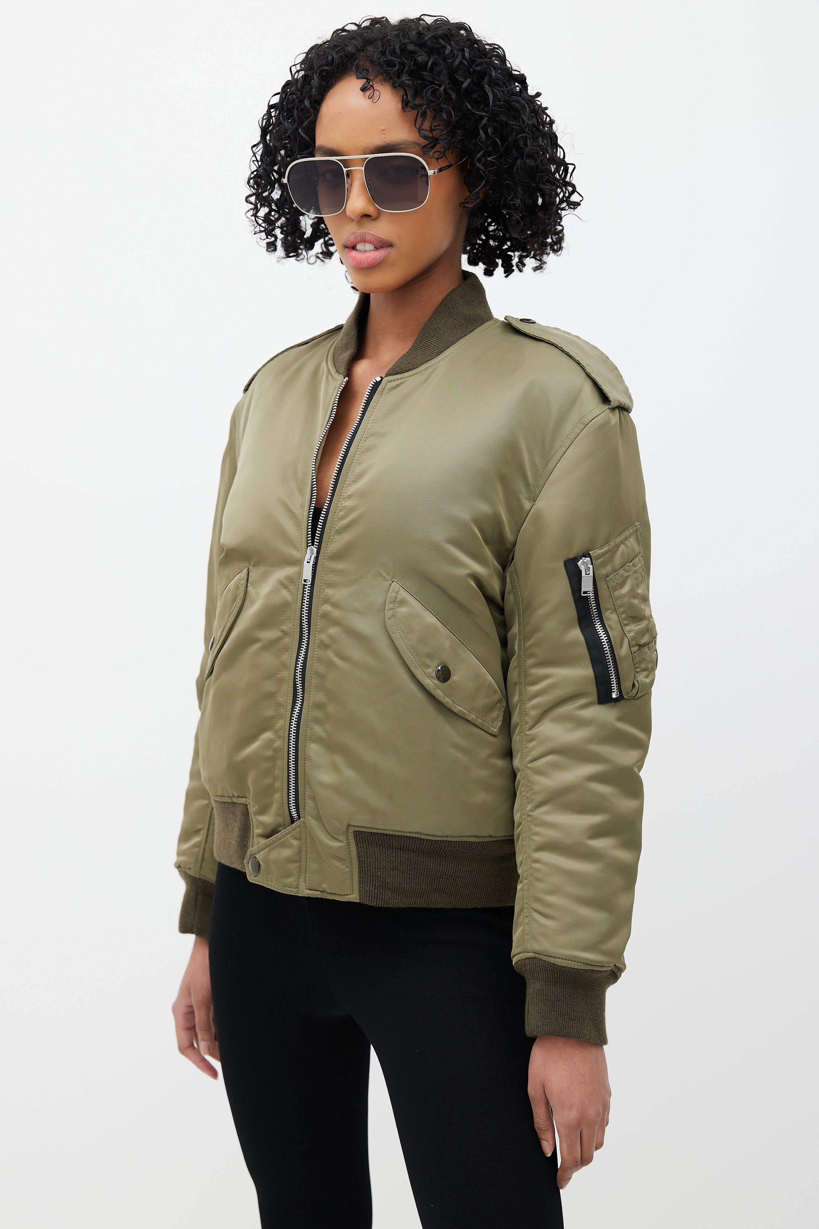 Pre-owned Saint Lauren green padded bomber jacket featuring a stand collar, epaulets at shoulder, long sleeves with ribbed cuffs, two flap pockets at hip, cargo pocket at arm, and zip closure. Lined.