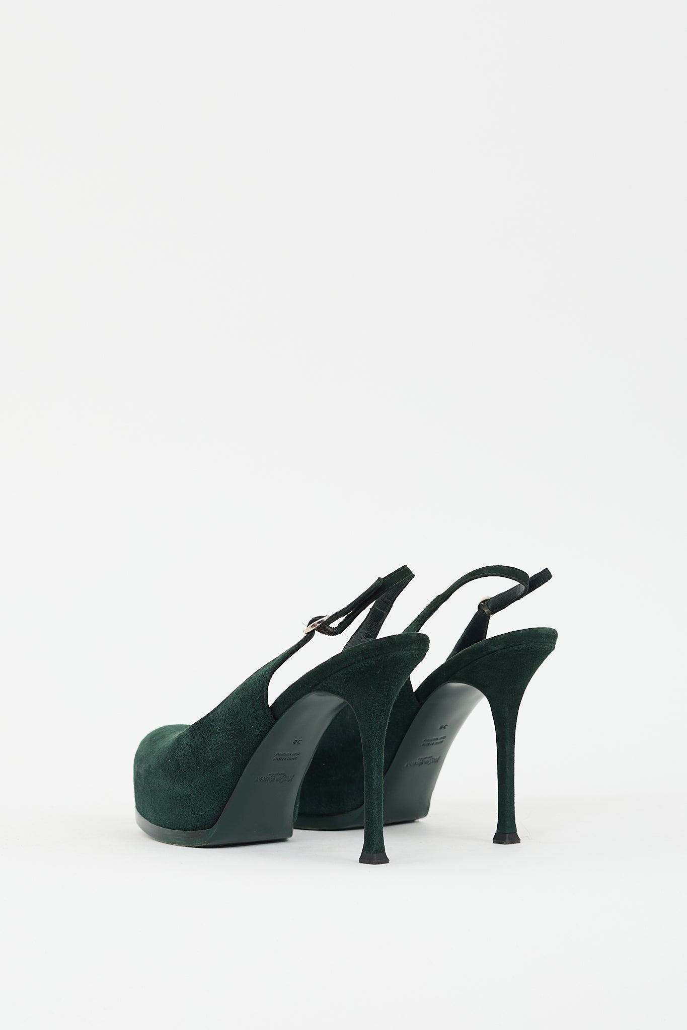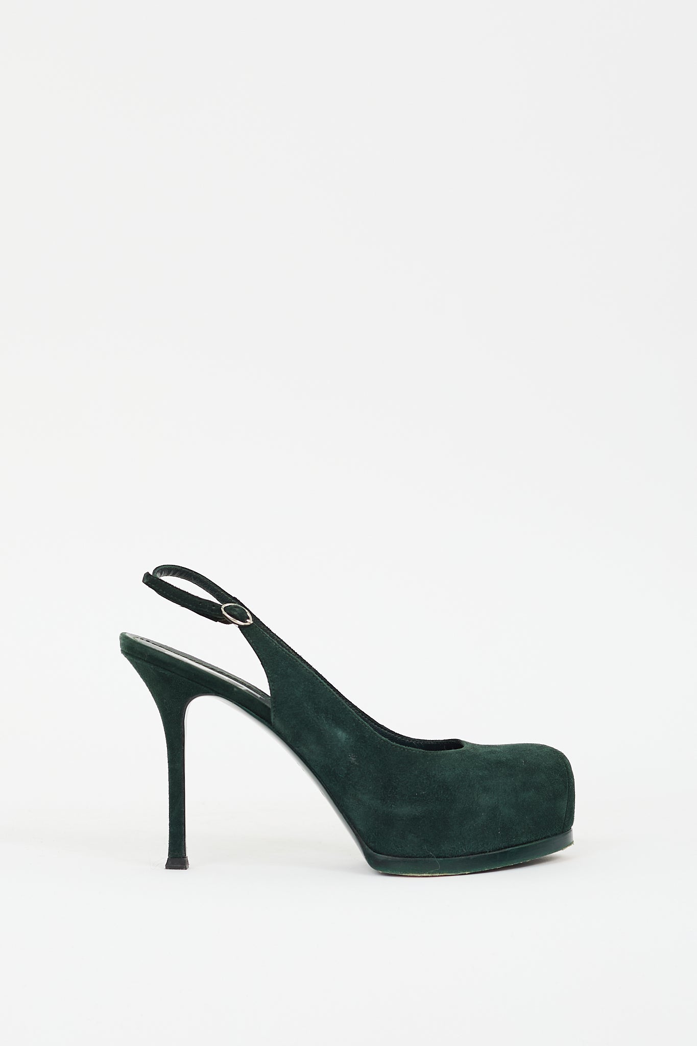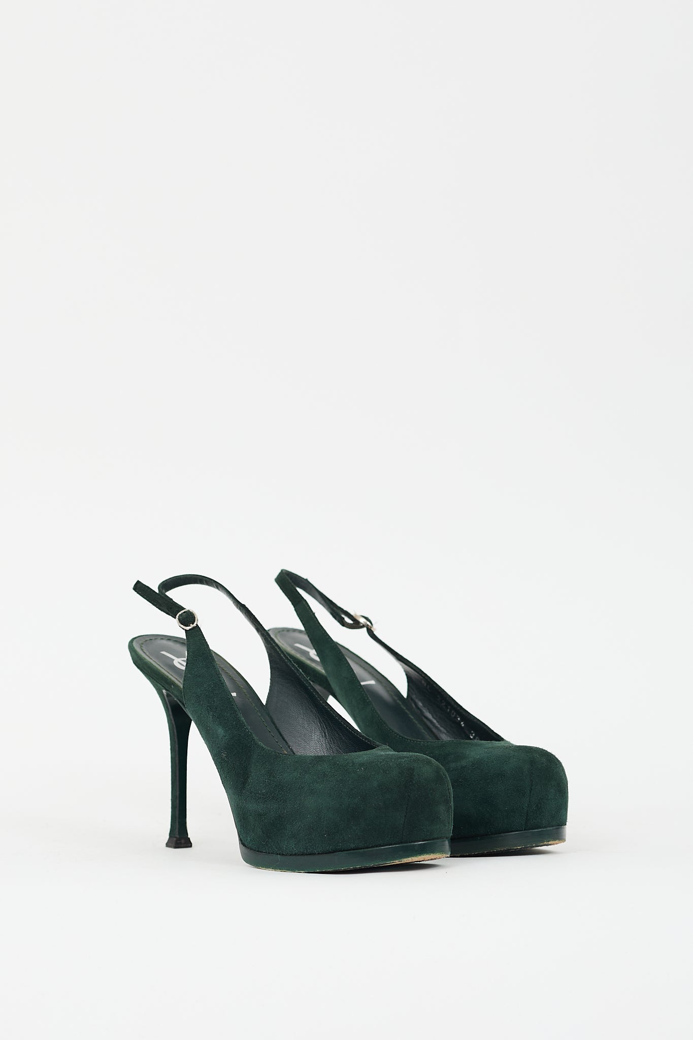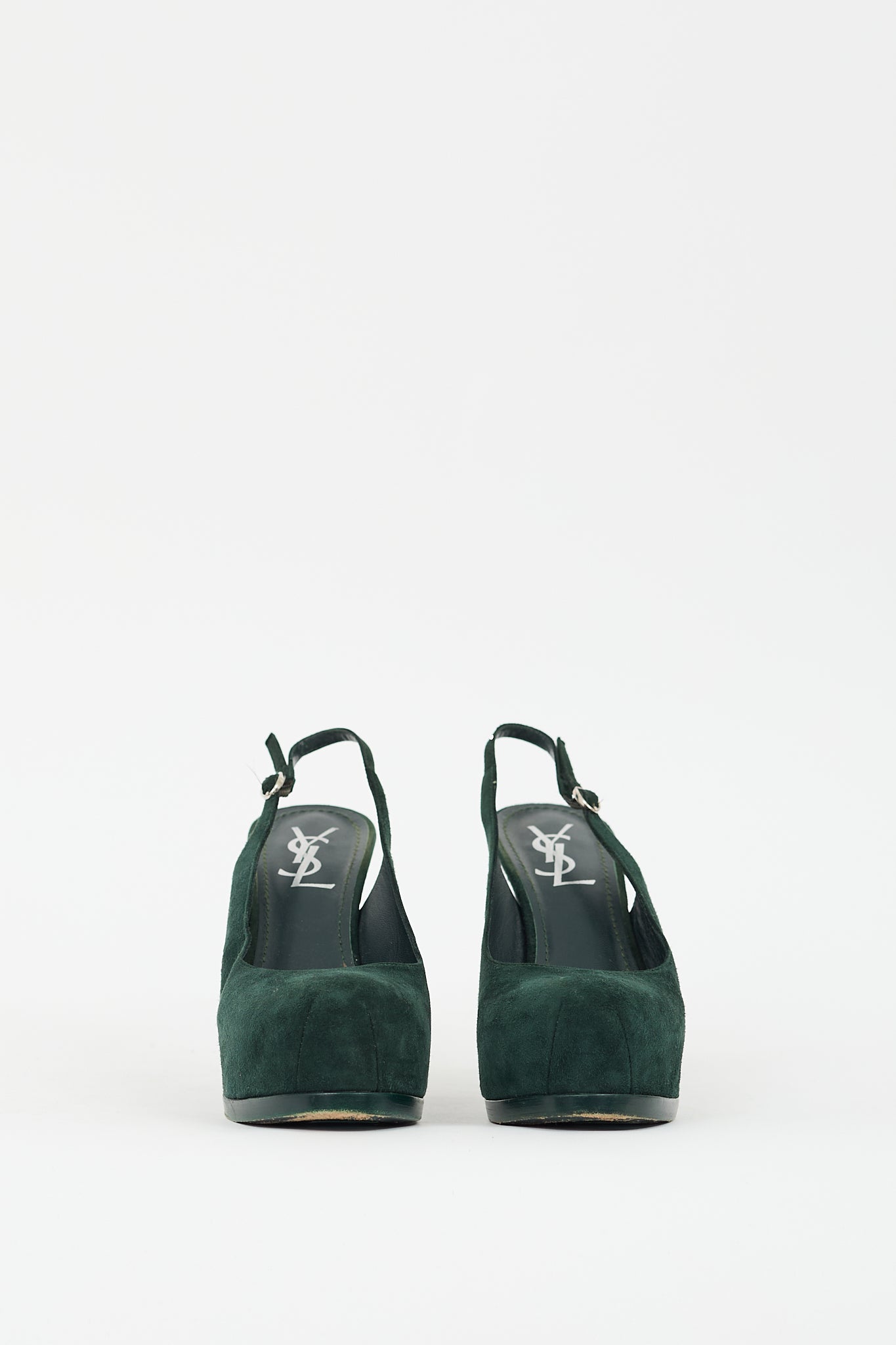 Pre-owned Yves Saint Laurent green suede pumps featuring rounded toe, adjustable ankle strap with buckle fastening, covered platform and stiletto heel, and slip on entry.