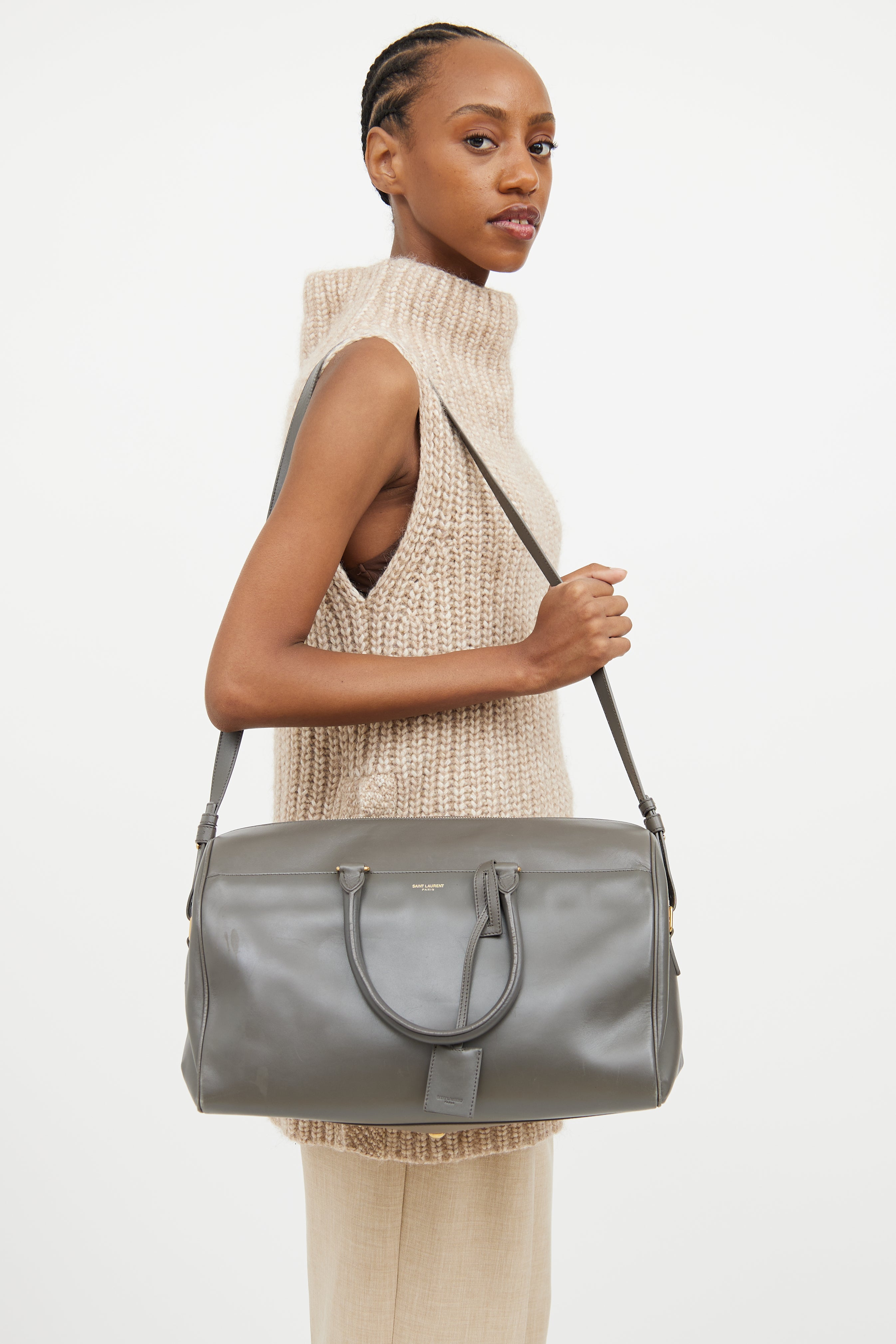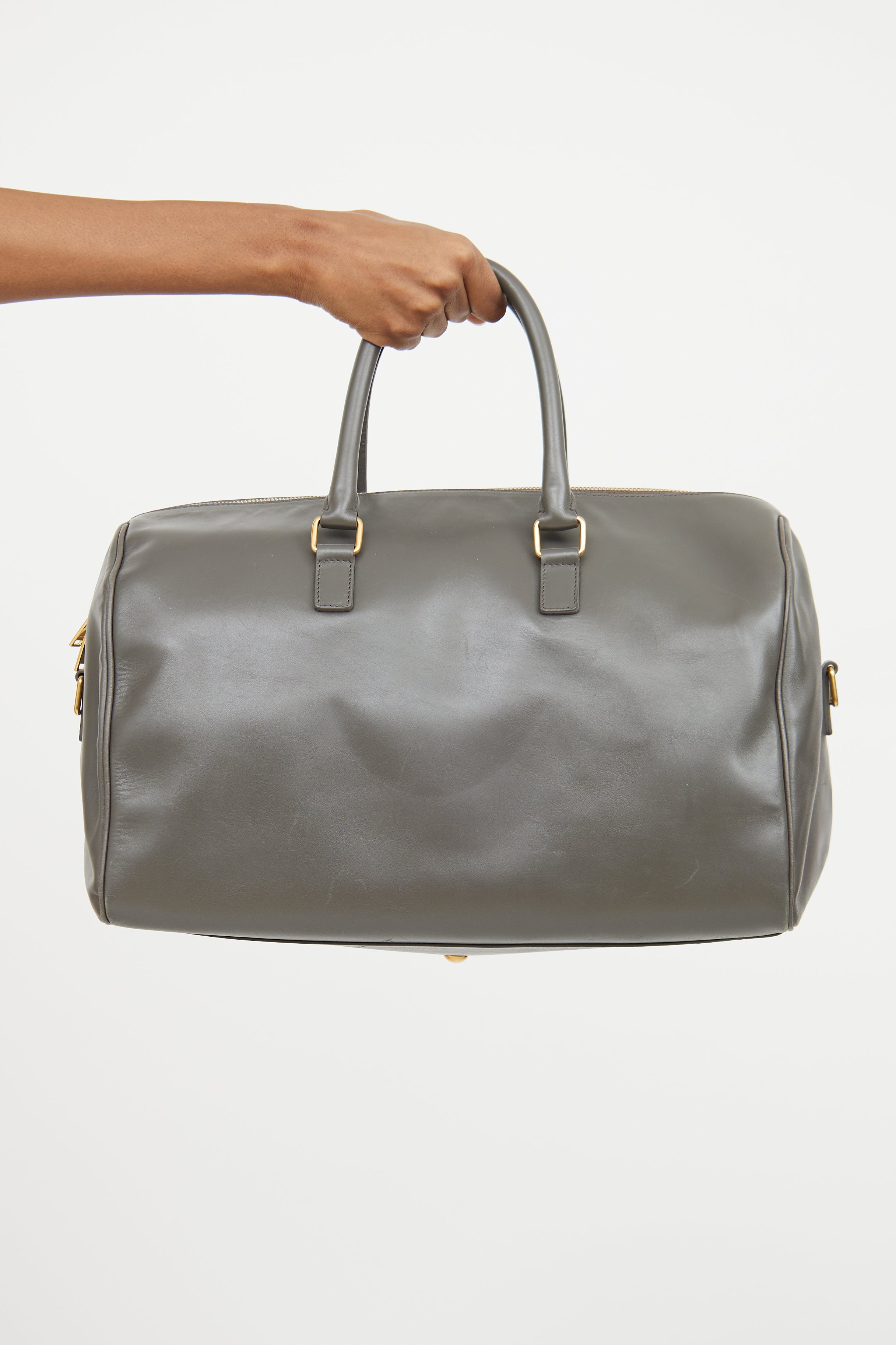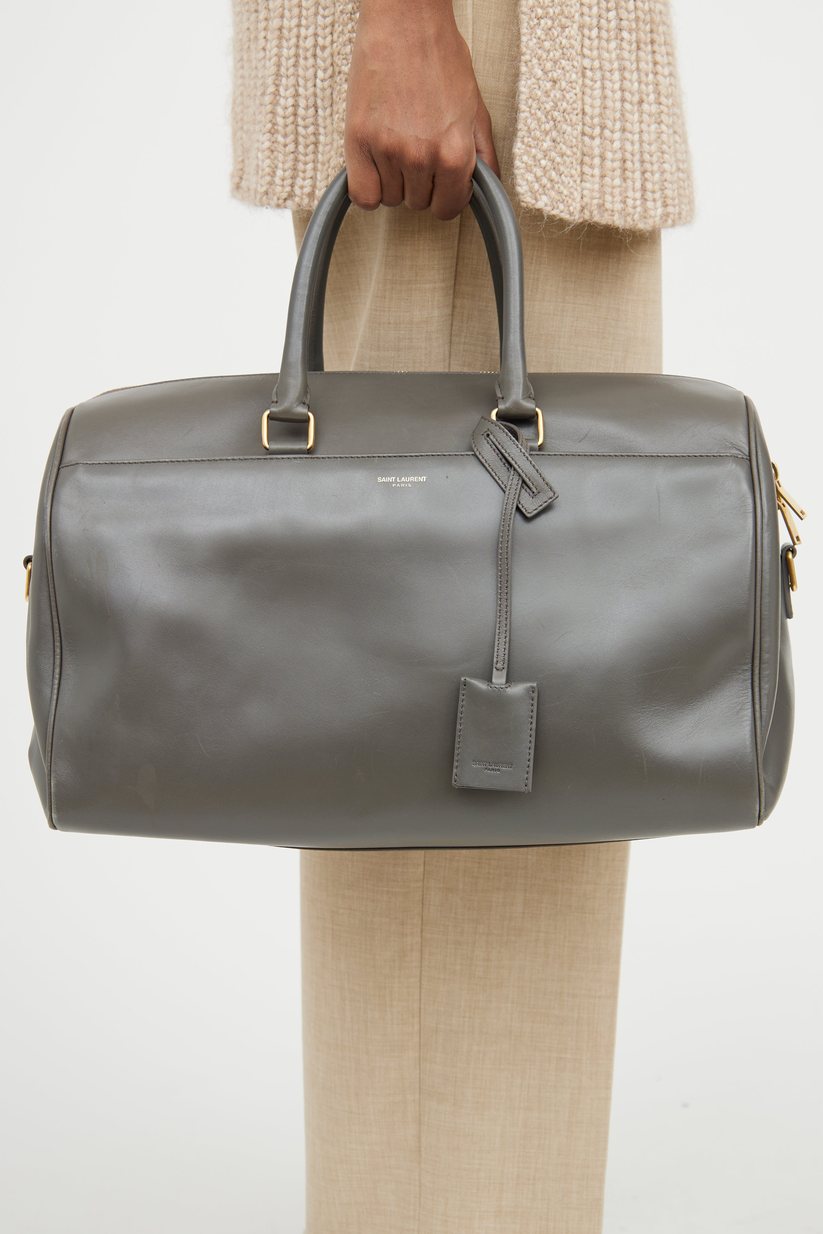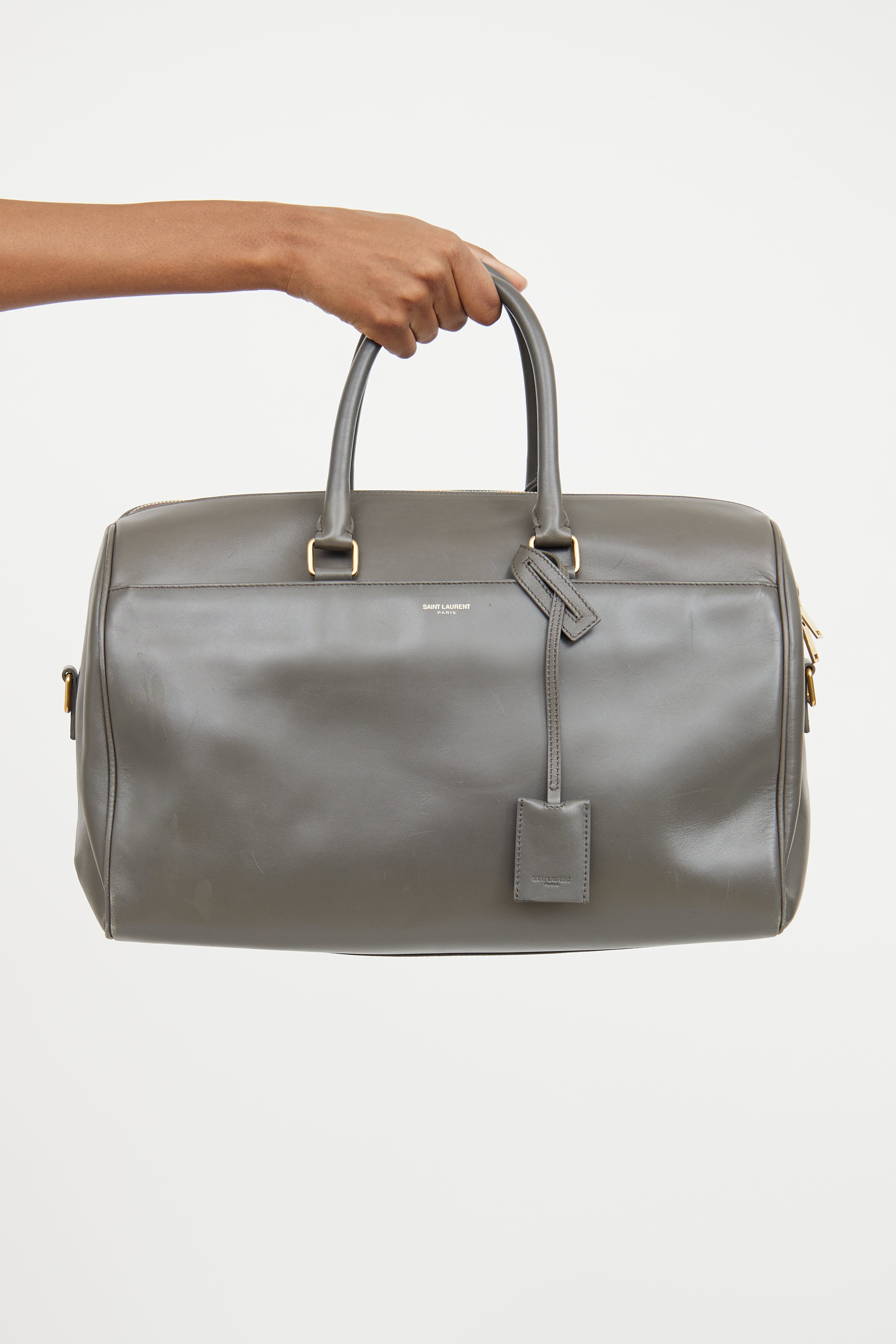 Pre-owned Saint Laurent grey Classic Duffle leather bag featuring a slip pocket with magnetic closure slip pocket at front with an embossed logo, two rolled top handles, detachable and adjustable shoulder strap, gold tone hardware, protective feet at bottom, one main compartment with one zip pocket, detachable pochette, and top zip closure.