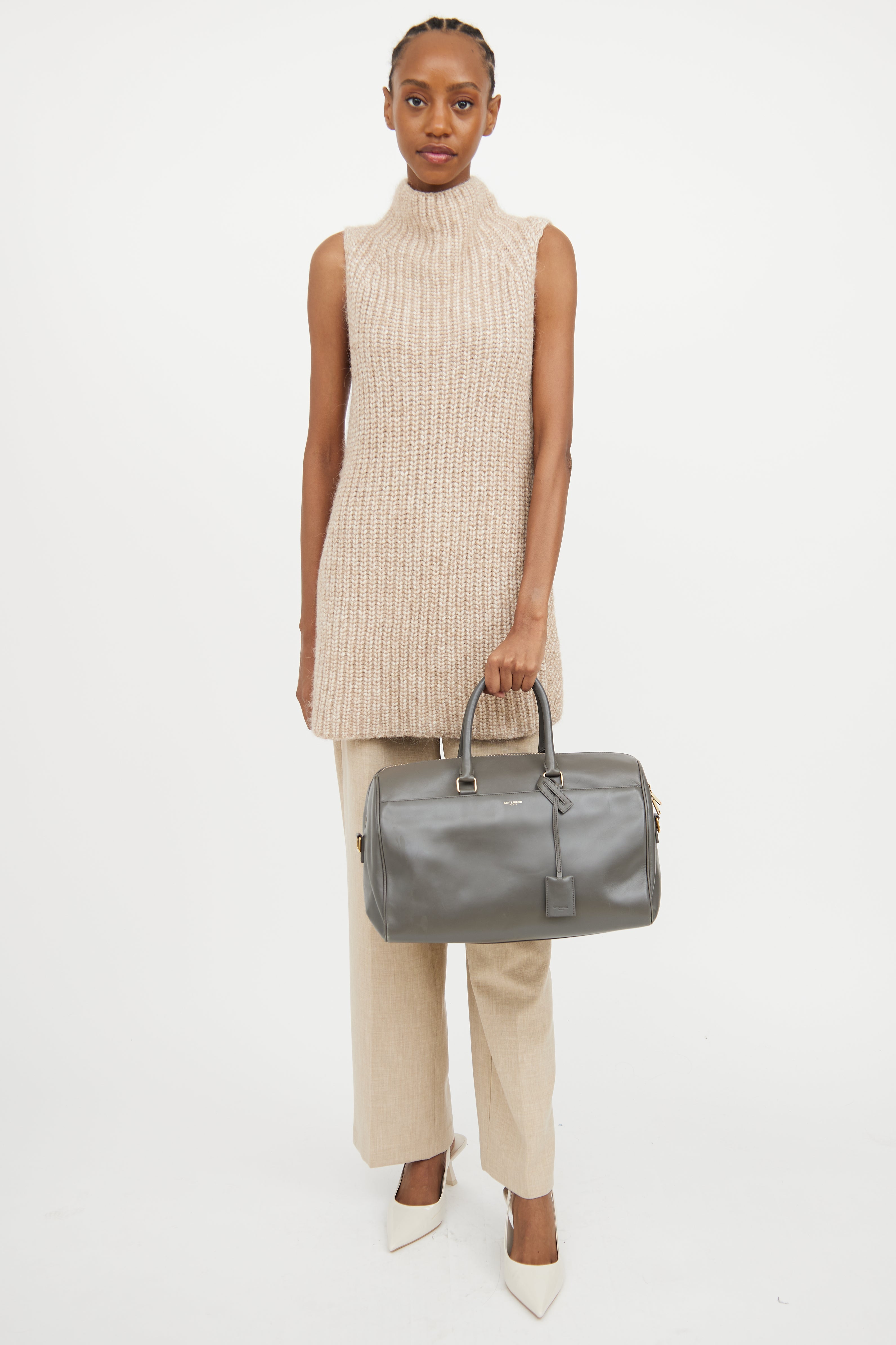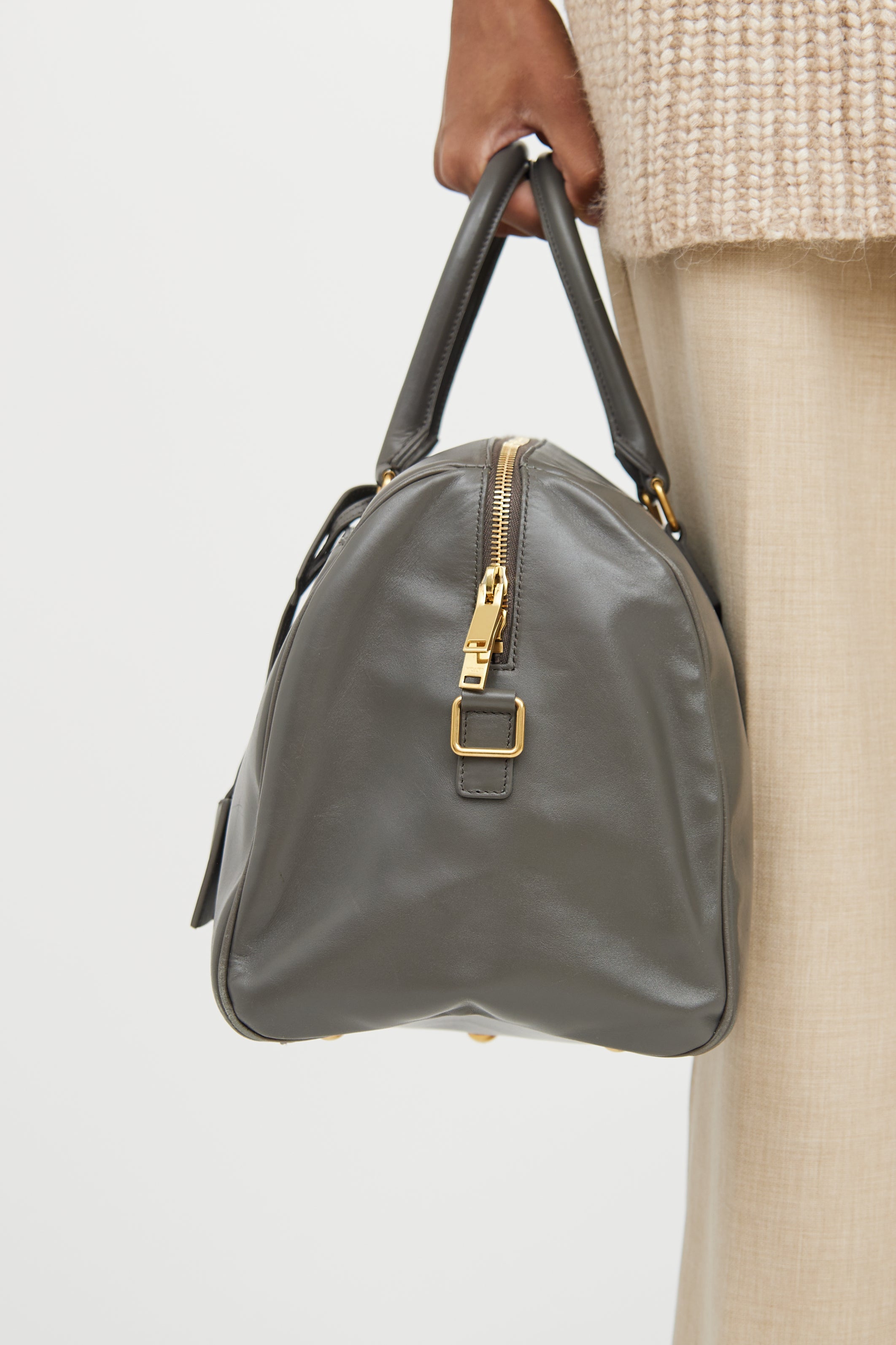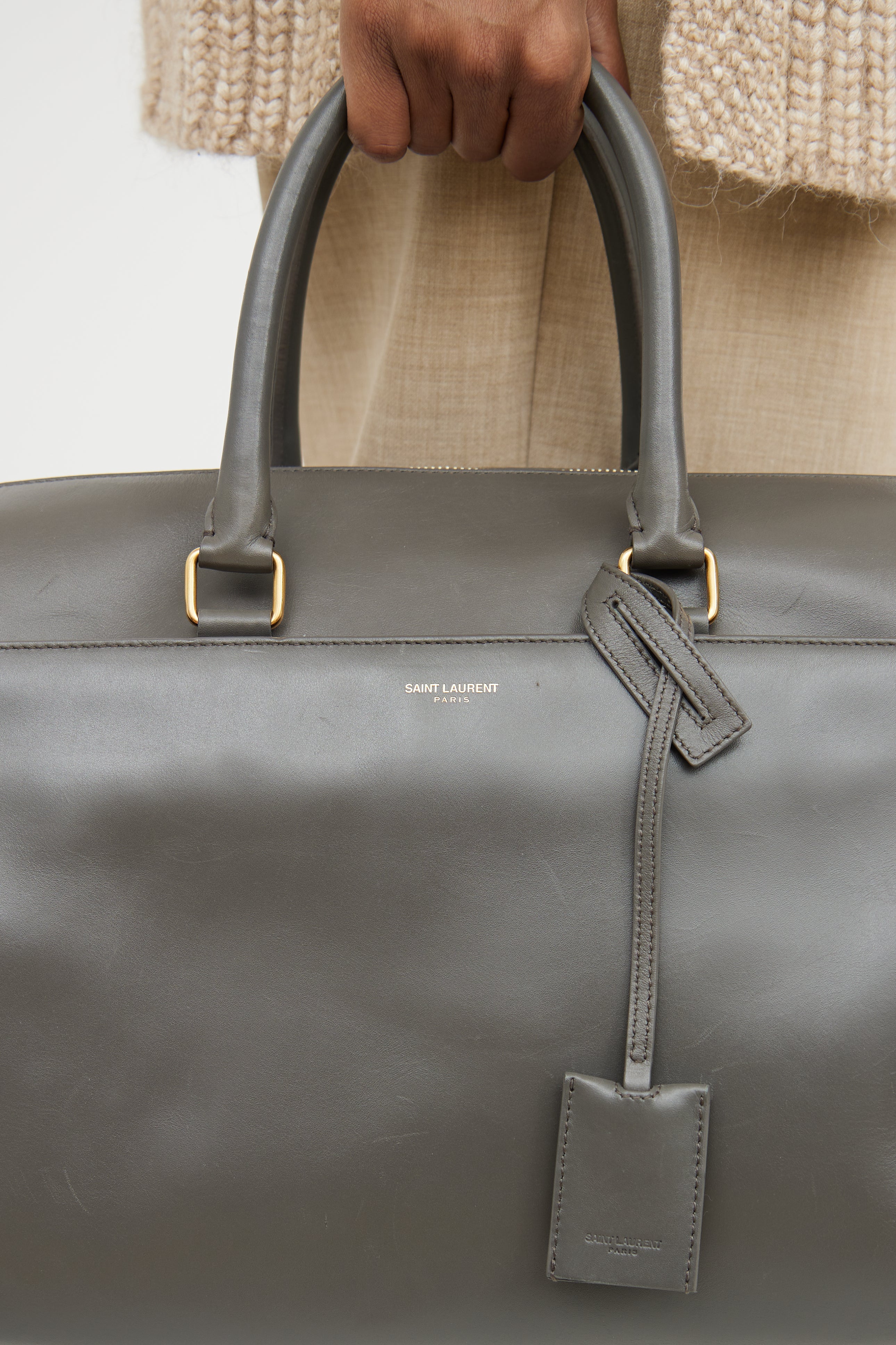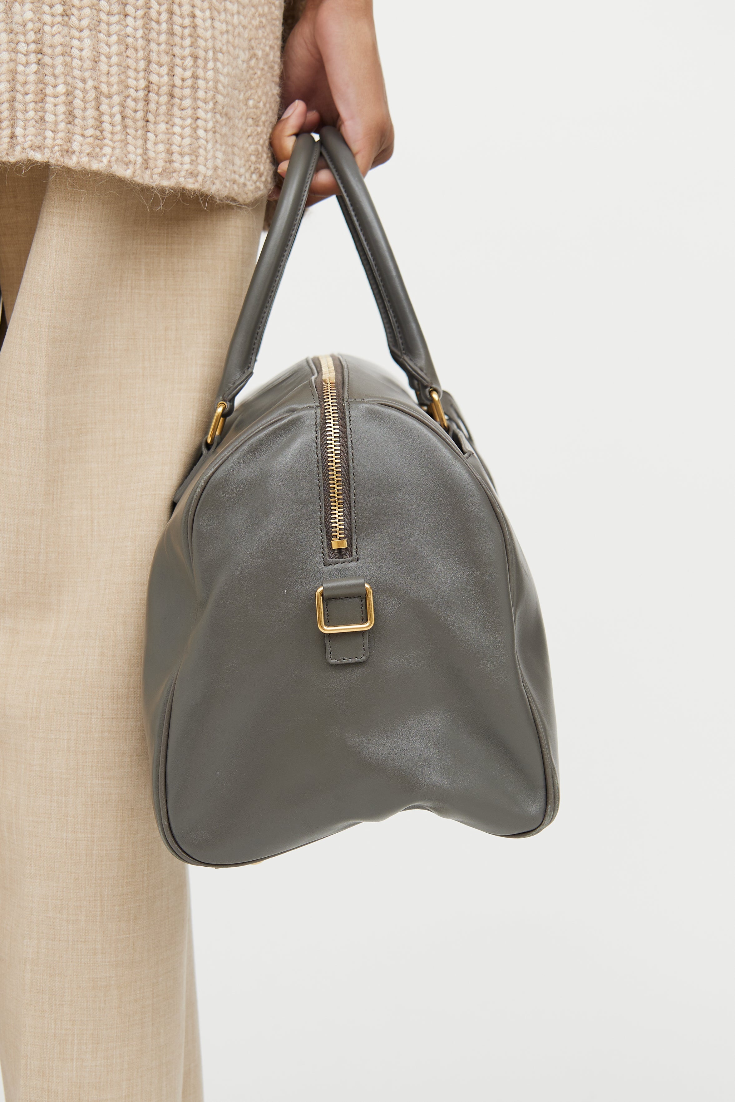 Pre-owned Saint Laurent grey Classic Duffle leather bag featuring a slip pocket with magnetic closure slip pocket at front with an embossed logo, two rolled top handles, detachable and adjustable shoulder strap, gold tone hardware, protective feet at bottom, one main compartment with one zip pocket, detachable pochette, and top zip closure.