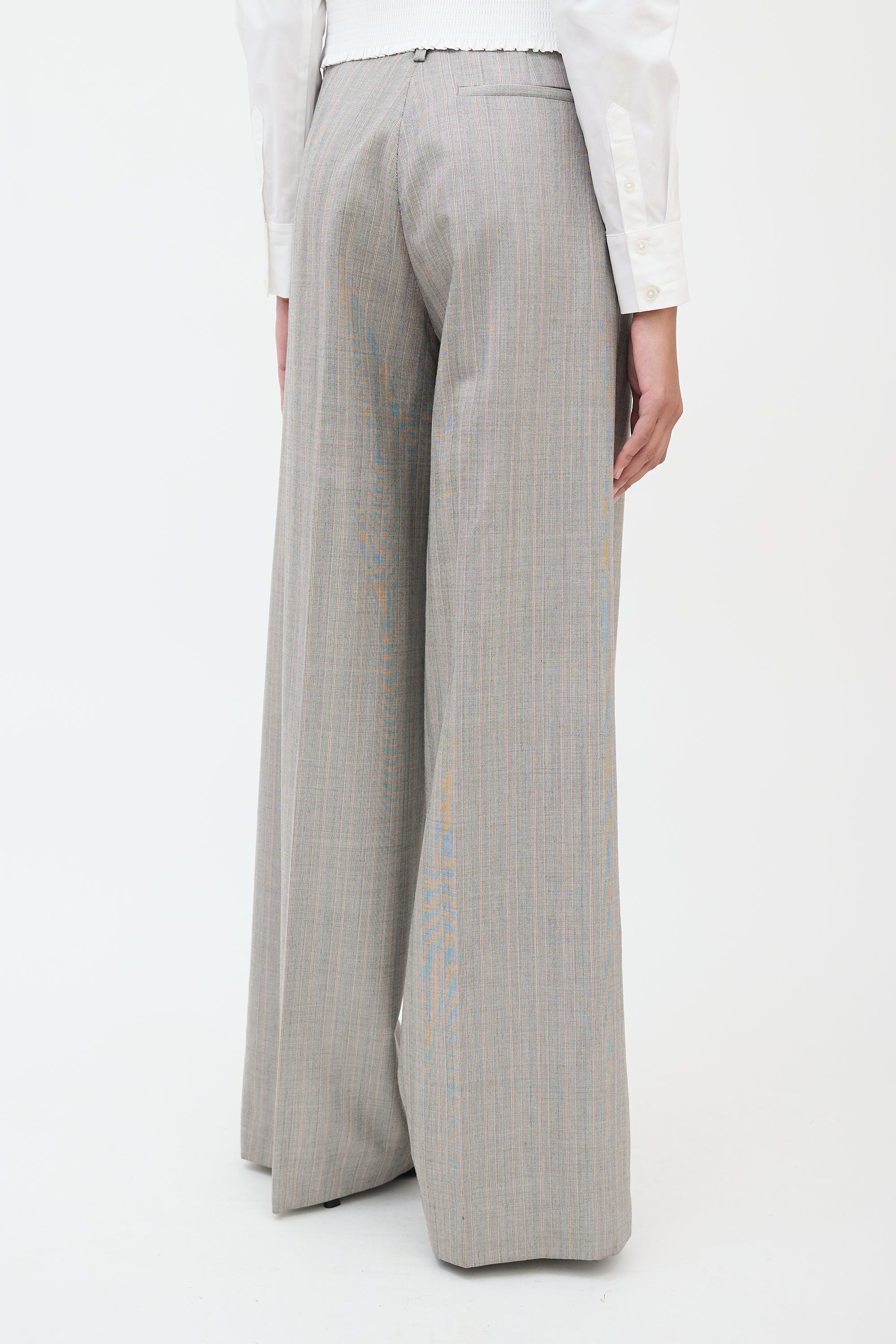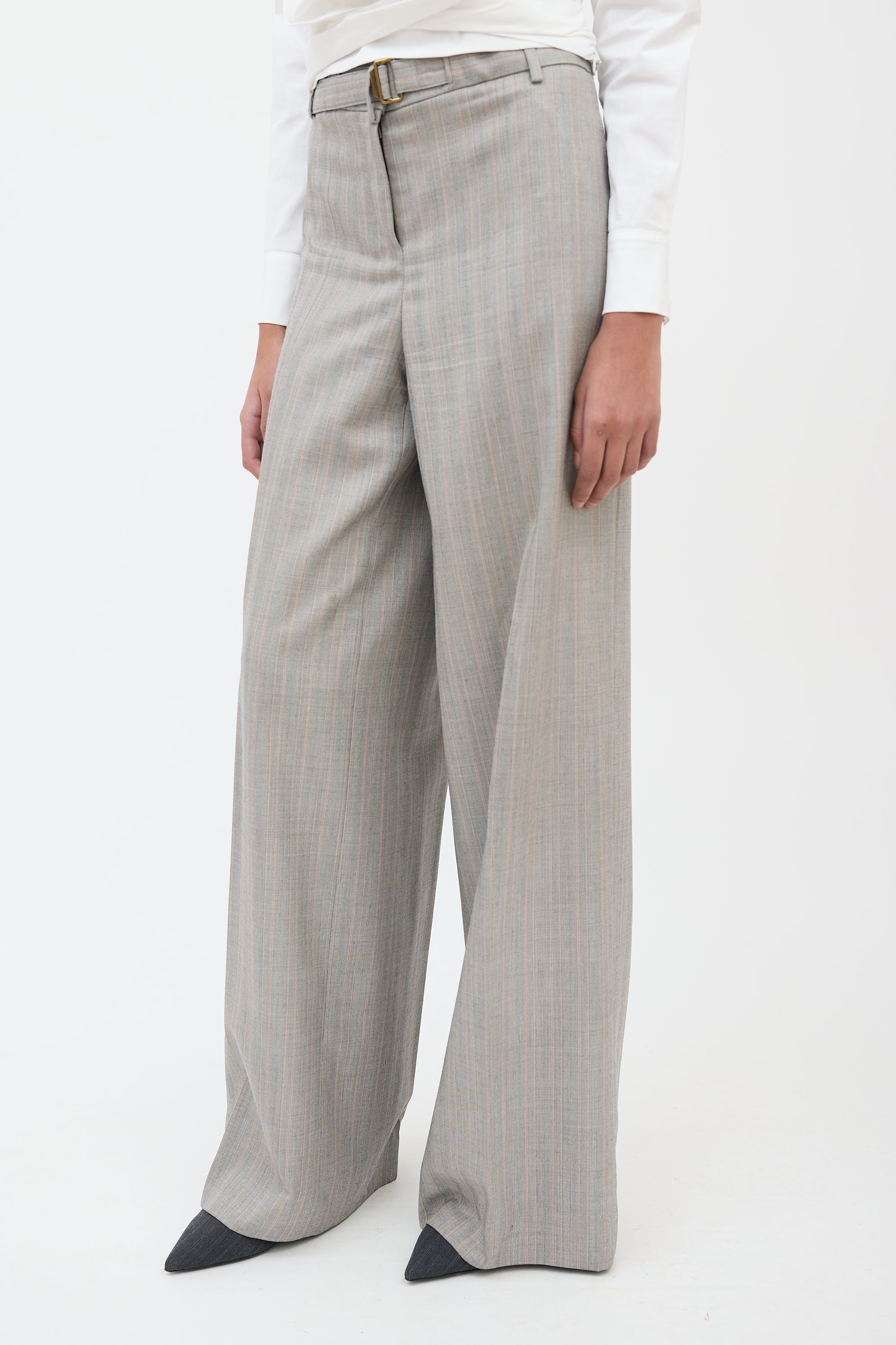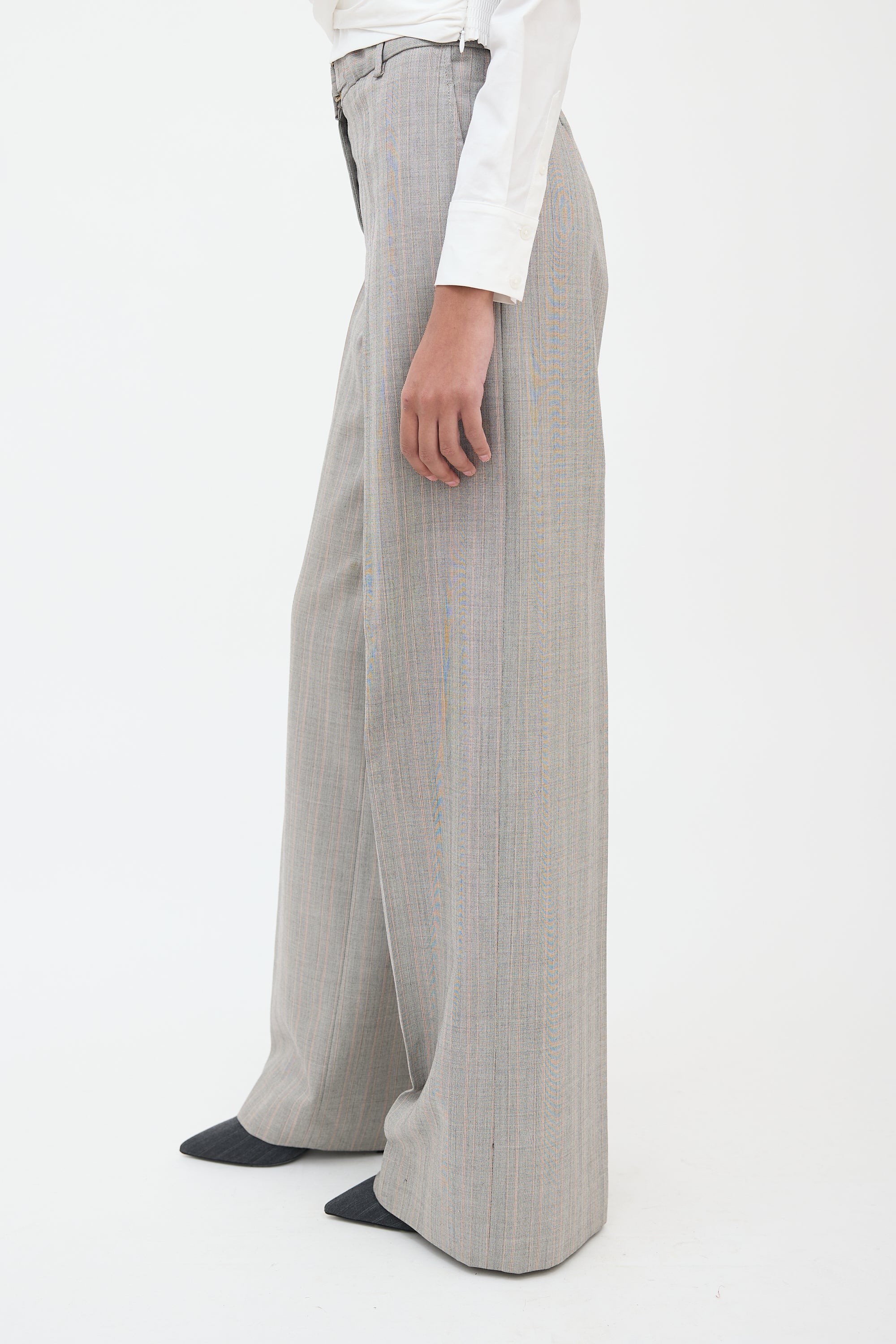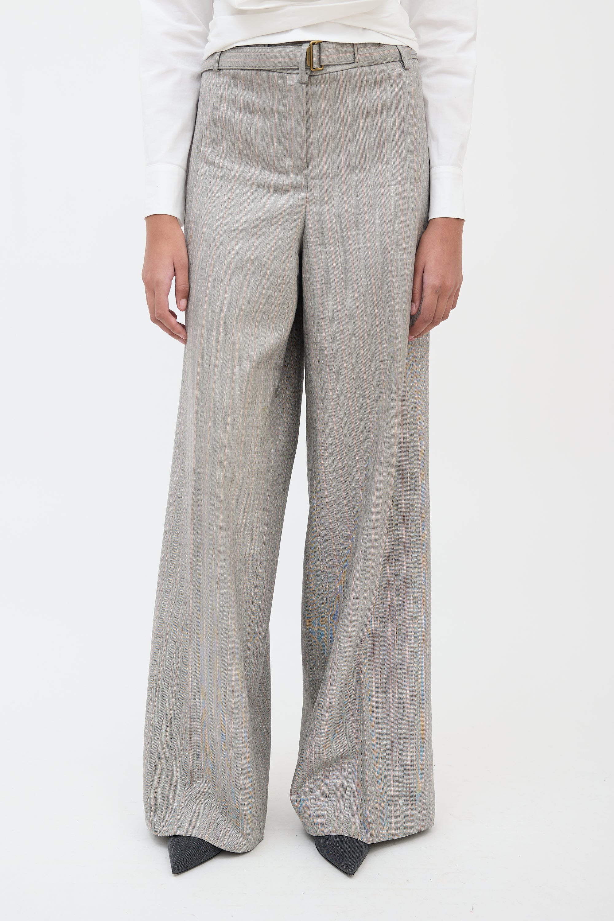 Pre-owned Yves Saint Laurent grey and red wool herringbone trouser featuring belt loops and attached adjustable belt with gold tone buckle, two slip pockets at waist, one welt pocket at back, zip fly, and pleated wide leg.