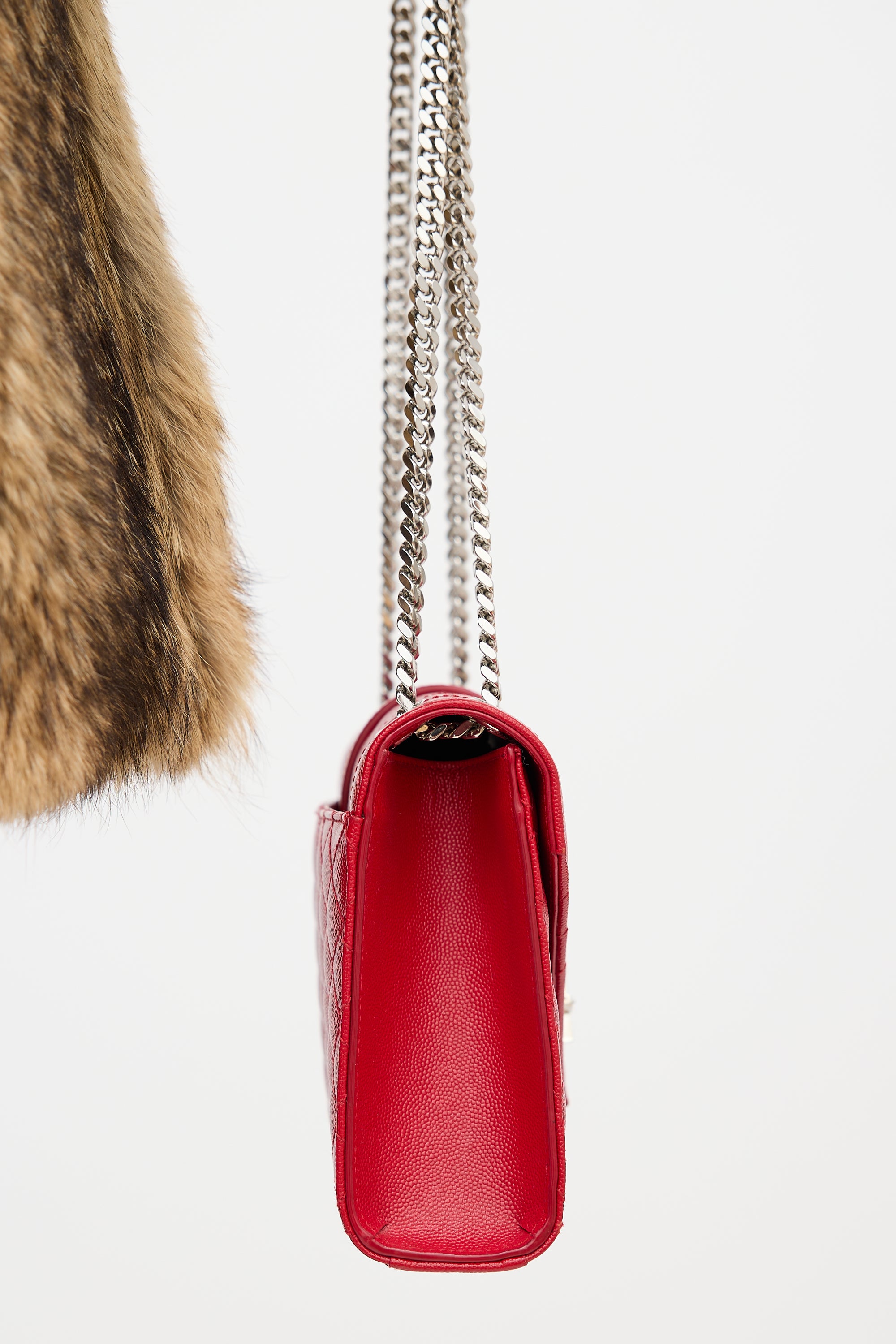 Pre-owned Saint Laurent red medium Envelope bag featuring triquilt Grain De Poudre leather body, silver tone hardware, back slip pocket, two way chain link shoulder strap with dual leather handles, front flap with Cassandre logo hardware, magnetic closure, and one lined main compartment with one slip pocket. Comes with original dust bag and care guide.