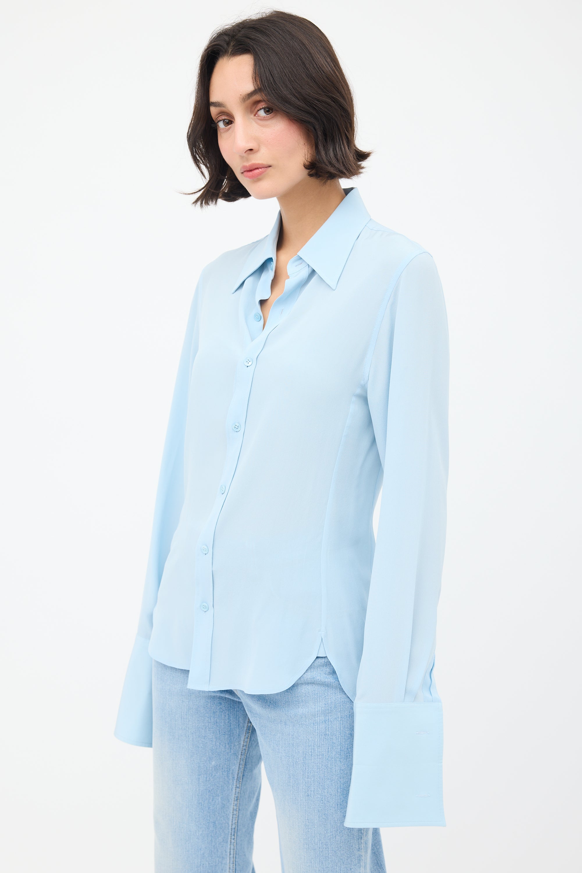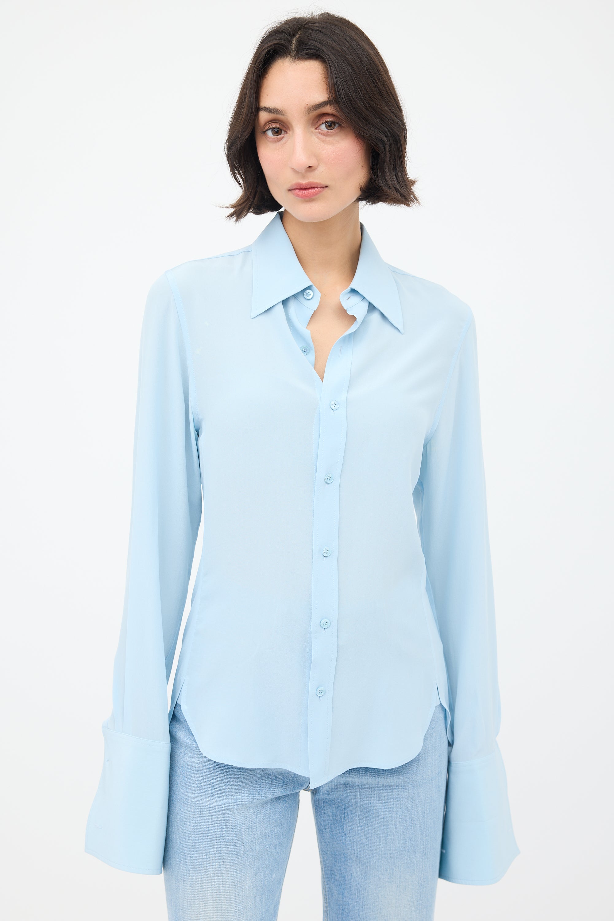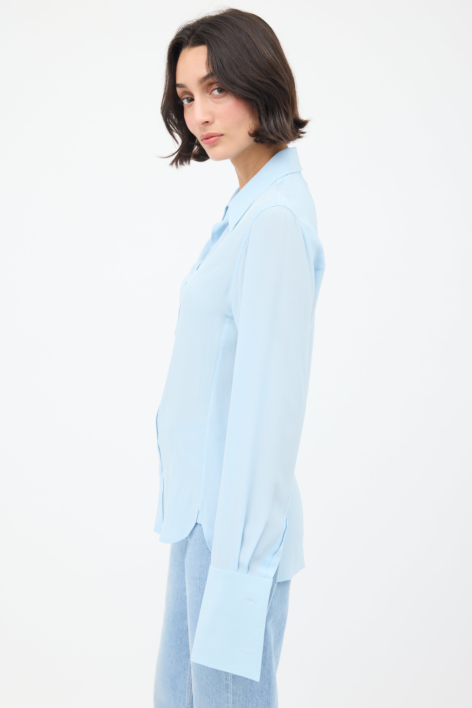Pre-owned Saint Laurent pastel blue silky shirt featuring pointed collar, button up front, and long sleeves with French cuffs.
