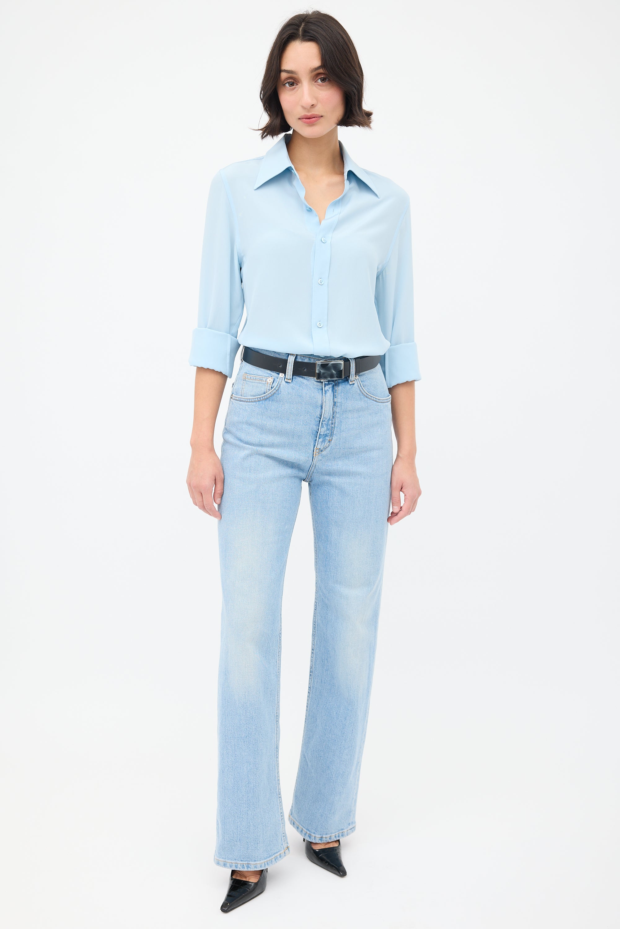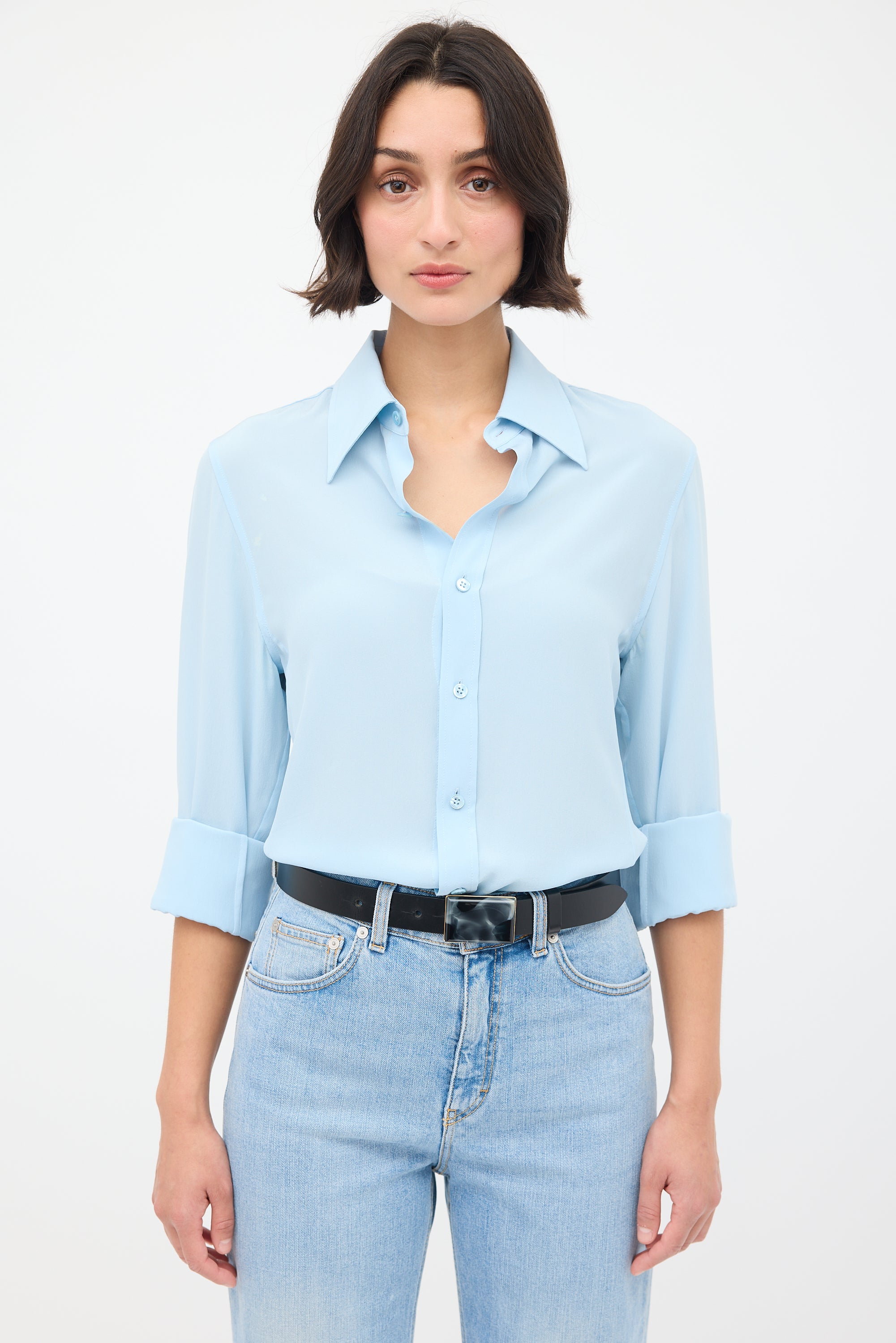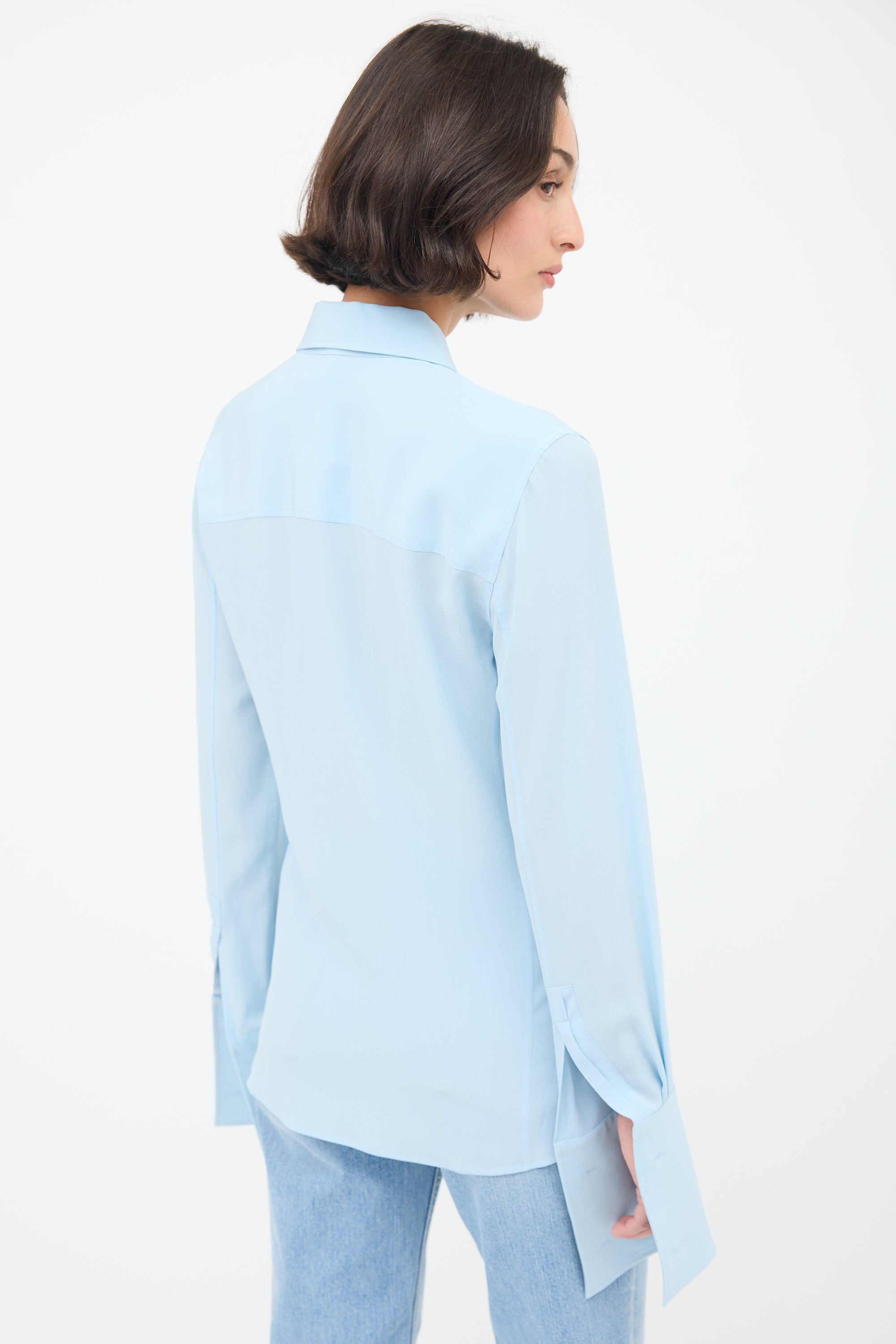 Pre-owned Saint Laurent pastel blue silky shirt featuring pointed collar, button up front, and long sleeves with French cuffs.